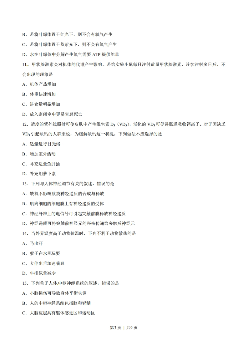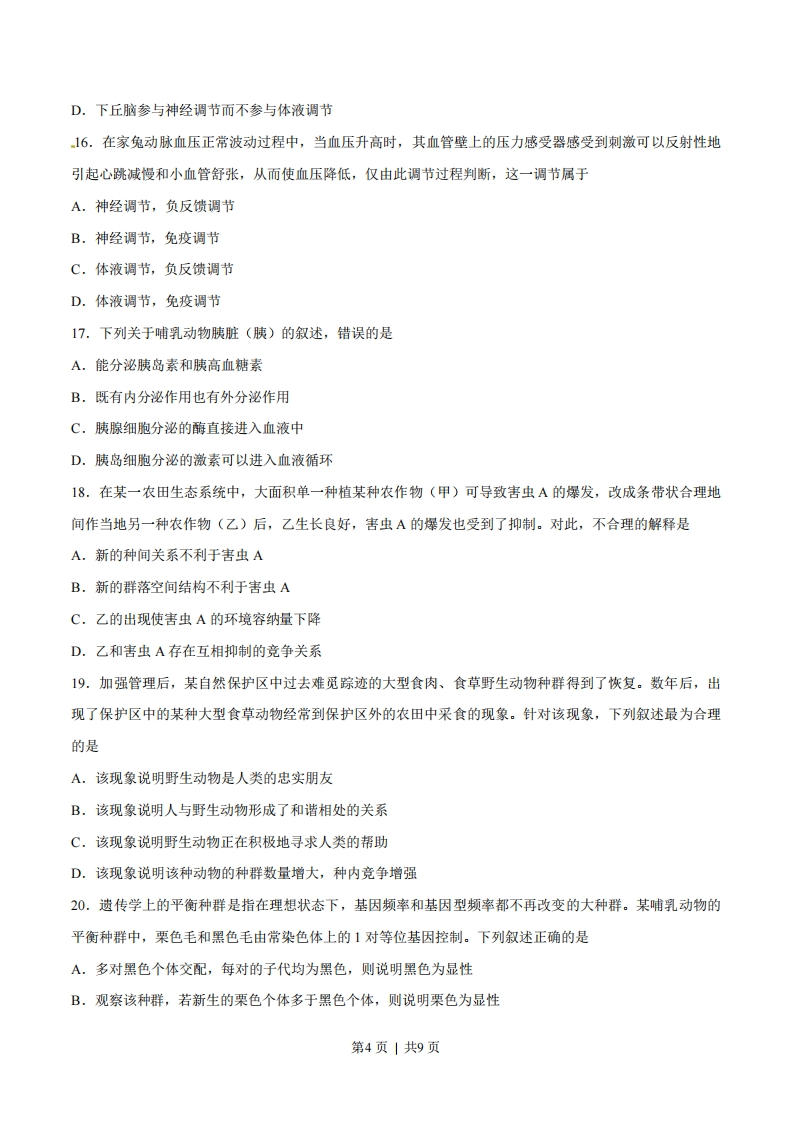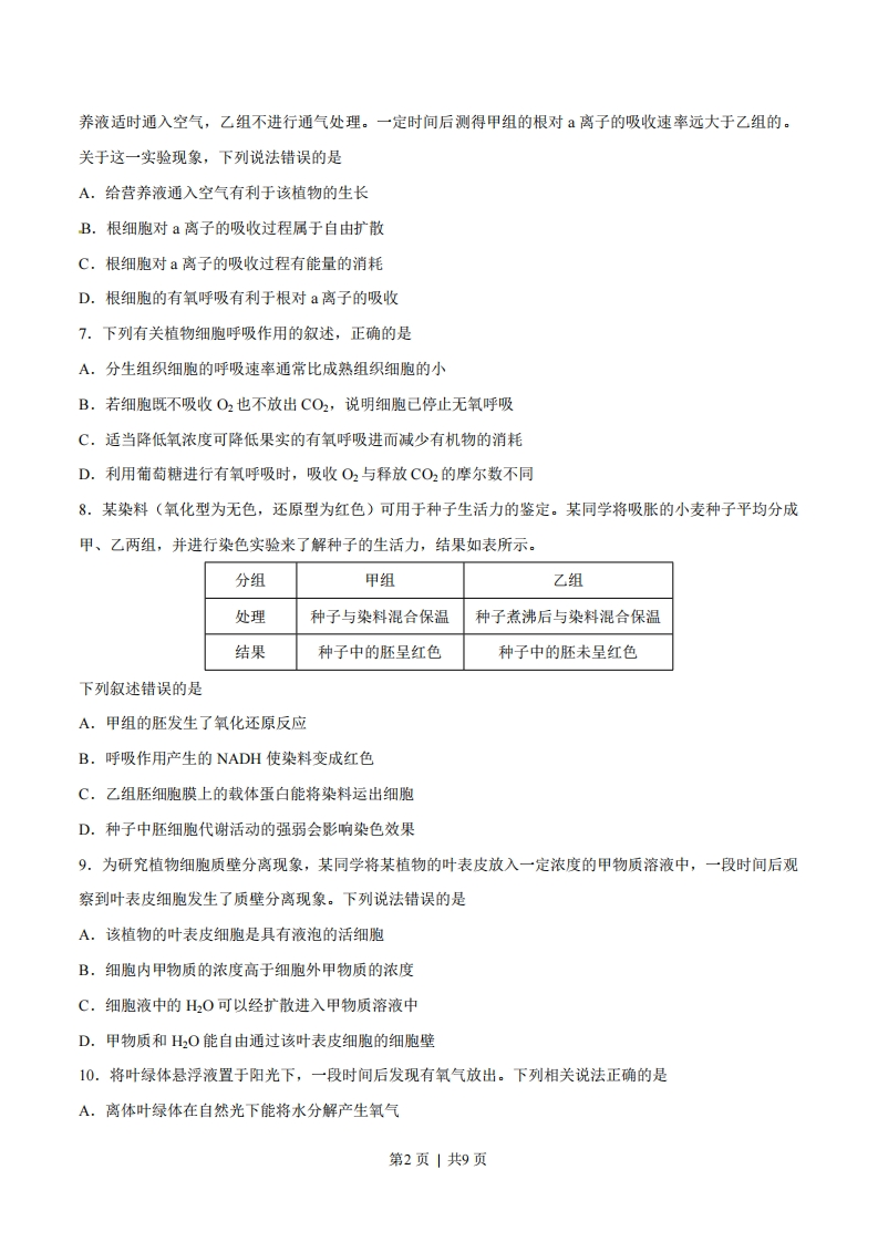 2017年高考海南卷生物试题解析一、选择题:本题共25小题,每小题2分,共50分。在每小题给出的四个选项中,只有一项是符合题目要求的。1.有关蛋白质结构与功能的叙述,错误的是A.蛋白质的生物活性与蛋白质的空间结构有关B.数量相同的5种氨基酸可以组成不同的多肽链C.将抗体溶于NaCI溶液中会造成其生物活性的丧失D.氨基酸序列相同的多肽链可折叠成不同的空间结构2.下列关于原核生物的叙述,错误的是A.大肠杆菌的细胞内有核糖体B.细跑对物质的吸收具有选择性C.拟核区中含有环状的DNA分子D.蓝藻细胞的叶绿体中含有叶绿素3.关于哺乳动物体内脂质与糖类的叙述,错误的是A.固醇在动物体内可转化成性激素B.C、H、O、P是构成脂质和糖原的元素C,脂肪与糖原都是细胞内储存能量的物质D.胆固醇是细胞膜的组分,也参与血脂运输4.无机盐对于维持生物体的生命活动具有重要作用。下列相关叙述错误的是A.蔬菜中的草酸不利于机体对食物中钙的吸收B.缺铁会导致哺乳动物血液运输O2的能力下降C.和ATP一样,KH2PO4也能为生物体提供能量D.植物秸秆燃烧产生的灰烬中含有丰富的无机盐5.关于生物体内能量代谢的叙述,正确的是A.淀粉水解成葡萄糖时伴随有ATP的生成B.人体大脑活动的能量主要来自脂肪的有氧氧化C.叶肉细胞中合成葡萄糖的过程是需要能量的过程D.硝化细菌主要从硝酸还原成氨的过程中获取能量6.将生长状态一致的某种植物幼苗分成甲、乙两组,分别移入适宜的营养液中在光下培养,并给甲组的营第1页|共9页养液适时通入空气,乙组不进行通气处理。一定时间后测得甲组的根对离子的吸收速率远大于乙组的。关于这一实验现象,下列说法错误的是A.给营养液通入空气有利于该植物的生长B.根细胞对a离子的吸收过程属于自由扩散C.根细胞对a离子的吸收过程有能量的消耗D.根细胞的有氧呼吸有利于根对a离子的吸收7.下列有关植物细胞呼吸作用的叙述,正确的是A.分生组织细胞的呼吸速率通常比成熟组织细胞的小B.若细胞既不吸收O2也不放出CO2,说明细胞己停止无氧呼吸C.适当降低氧浓度可降低果实的有氧呼吸进而减少有机物的消耗D.利用葡萄糖进行有氧呼吸时,吸收O2与释放CO2的摩尔数不同8.某染料(氧化型为无色,还原型为红色)可用于种子生活力的鉴定。某同学将吸胀的小麦种子平均分成甲、乙两组,并进行染色实验来了解种子的生活力,结果如表所示。分组甲组乙组处理种子与染料混合保温种子煮沸后与染料混合保温结果种子中的胚呈红色种子中的胚未呈红色下列叙述错误的是A.甲组的胚发生了氧化还原反应B.呼吸作用产生的NADH使染料变成红色C.乙组胚细胞膜上的载体蛋白能将染料运出细胞D.种子中胚细胞代谢活动的强弱会影响染色效果9.为研究植物细胞质壁分离现象,某同学将某植物的叶表皮放入一定浓度的甲物质溶液中,一段时间后观察到叶表皮细胞发生了质壁分离现象。下列说法错误的是A.该植物的叶表皮细胞是具有液泡的活细胞B.细胞内甲物质的浓度高于细胞外甲物质的浓度C.细胞液中的H2O可以经扩散进入甲物质溶液中D.甲物质和H2O能自由通过该叶表皮细胞的细胞壁10.将叶绿体悬浮液置于阳光下,一段时间后发现有氧气放出。下列相关说法正确的是A.离体叶绿体在自然光下能将水分解产生氧气第2页|共9页B.若将叶绿体置于红光下,则不会有氧气产生C.若将叶绿体置于蓝紫光下,则不会有氧气产生D.水在叶绿体中分解产生氧气需要ATP提供能量11.甲状腺激素会对机体的代谢产生影响。若给实验小鼠每日注射适量甲状腺激素,连续注射多日后,不会出现的现象是A.机体产热增加B.体重快速增加C.进食量明显增加D.放入密闭室中更易室息死亡12.适度的紫外线照射可使皮肤中产生维生素D3(VD3),活化的VD,可促进肠道吸收钙离子。对于因缺乏VD3引起缺钙的人群来说,为缓解缺钙这一状况,下列做法不应选择的是A.适量进行日光浴B.增加室外活动C.补充适量鱼肝油D.补充胡萝卜素13.下列与人体神经调节有关的叙述,错误的是A.缺氧不影响肽类神经递质的合成与释放B,肌肉细胞的细胞膜上有神经递质的受体C,神经纤维上的电信号可引起突触前膜释放神经递质D.神经递质可将突触前神经元的兴奋传递给突触后神经元14.当外界温度高于动物体温时,下列不利于动物散热的是A.马出汗B.猴子在水里玩耍C.犬伸出舌加速喘息D.牛排尿量减少15.下列关于人体中枢神经系统的叙述,错误的是A.小脑损伤可导致身体平衡失调B.人的中枢神经系统包括脑和脊髓C.大脑皮层具有躯体感觉区和运动☒第3页|共9页