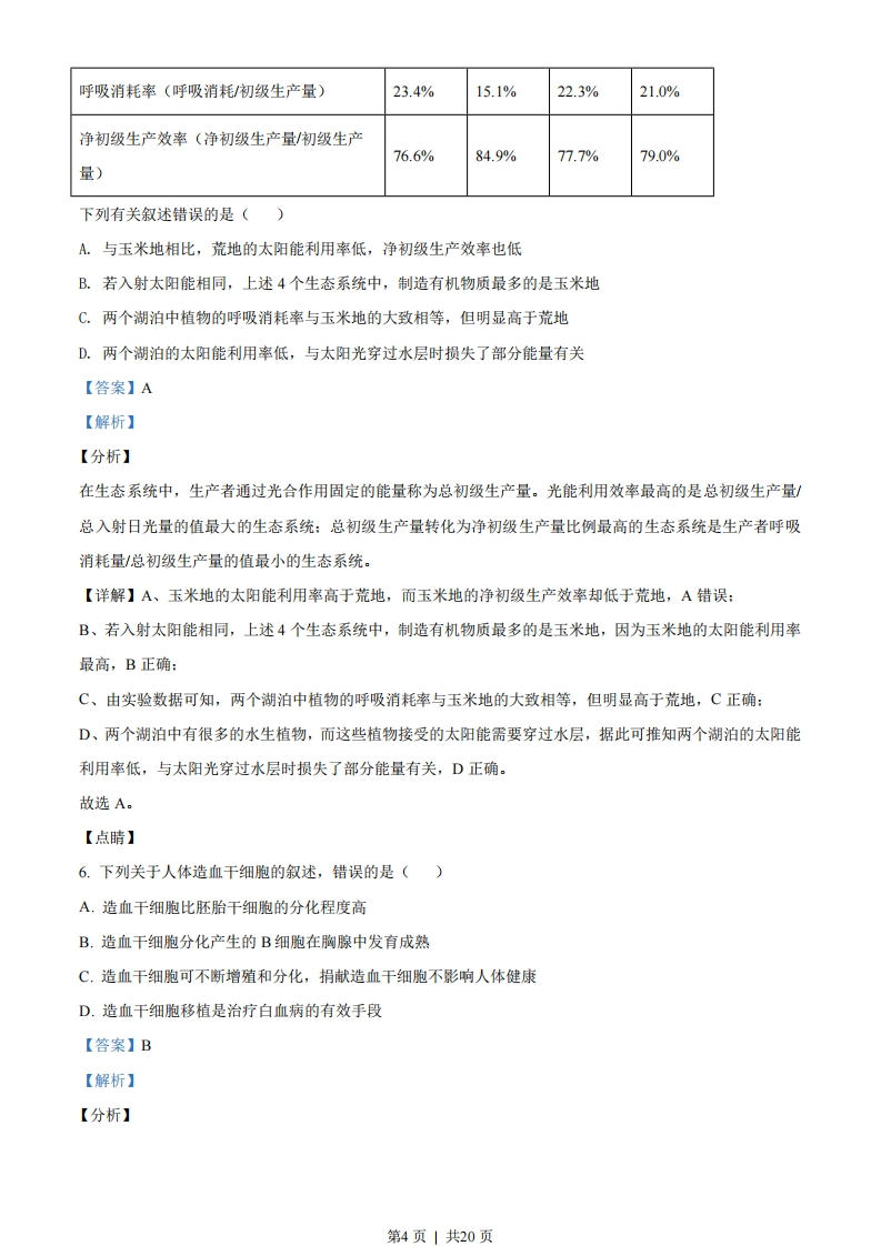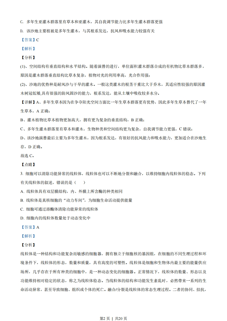 海南省2020年普通高中学业水平选择性考试生物注意事项:1答卷前,考生务必将自己的姓名、准考证号填写在答题卡上。2.回答选择题时,选出每小题答案后,用铅笔把答题卡上对应题目的答案标号涂黑。如需改动,用橡皮擦干净后,再选涂其他答案标号。回答非选择题时,将答案写在答题卡。写在本试卷上无效。3.考试结束后,将本试卷和答题卡一并交回。一、选择题:本题共20小题,在每小题给出的四个选项中,只有一项是符合题目要求的。1.下列关于人体脂质的叙述,正确的是()A.组成脂肪与糖原的元素种类不同B.磷脂水解的终产物为甘油和脂肪酸C.性激素属于固醇类物质,能维持人体第二性征D.维生素D是构成骨骼的主要成分,缺乏维生素D会影响骨骼发育【答案】C【解析】【分析】化合物的元素组成:(1)蛋白质的组成元素有C、H、O、N元素构成,有些还含有P、S:(2)核酸的组成元素为C、H、O、N、P:(3)脂质的组成元素有C、H、O,有些还含有N、P:(4)糖类的组成元素为C、H、O。【详解】A、脂肪和糖原的元素组成都是C、H、O,A错误:B、脂肪的最终水解产生是甘油和脂肪酸,B错误:C、性激素属于固醇,能激发和维持人体第二性征,C正确:D、维生素D可以促进骨骼对钙的吸收,D错误。故选C。2.研究人员在调查某沙地的植物群落演替时,发现其自然演替顺序为:一年生草本→多年生草本→多年生亚灌木→多年生灌木。下列有关叙述错误的是()A.多年生草本群落在争夺阳光和空间方面比一年生草本群落更有优势B.与草本群落相比,灌木群落的垂直结构更加复杂第1页」共20页C.多年生亚灌木群落里有草本和亚灌木,其自我调节能力比多年生灌木群落更强D.该沙地主要植被是多年生灌木,与其根系发达,抗风和吸水能力较强有关【答案】C【解析】【分析】(1)、空间结构有垂直结构和水平结构。随着演替的进行,单位面积灌木群落合成的有机物比草本群落多,原因是灌木群落垂直结构比草本复杂,植物对光的利用率高,光合作用强:(2)、沙地的优势种是耐风沙与干早的灌木。一般这类灌木的根茎干重比大于乔木,其适应性较强的原因灌木树冠低矮,具有很强的防风固沙的能力,根系发达,能从土壤中吸收较多水分。【详解】A、多年生草本因为在争夺阳光空间方面比一年生草本群落更有优势,因此多年生草本替代了一年生草本,A正确:B、灌木植物比草本植物更加高大,拥有更为复杂的垂直结构,B正确:C、多年生灌木群落里有草本和灌木,生物种类和空间结构更为复杂,自我调节能力更强,C错误:D、该沙地演替最后主要为多年生灌木,因为根系发达,有很好的抗风能力和吸水能力,更加适合在沙地生存,D正确。故选C。【点睛】3.细胞可以清除功能异常的线粒体,线粒体也可以不新地分裂和融合,以维持细胞内线粒体的稳态。下列有关线粒体的叙述,错误的是()A.线粒体具有双层膜结构,内、外膜上所含酶的种类相同B.线粒体是真核细胞的“动力车间”,为细胞生命活动提供能量C.细胞可通过溶酶体清除功能异常的线粒体D.细胞内的线粒体数量处于动态变化中【答案】A【解析】【分析】线粒体是一种结构和功能复杂而敏感的细胞器,拥有独立于细胞核的基因组,在细胞的不同生理过程和环境条件下,线粒体的形态,数量和质量,具有高度的可塑性。线粒体是细胞和生物体内最主要的能量供应场所,几乎存在于所有种类的细胞中,是一种动态变化的细胞器。正常情况下,线粒体的数量、形态以及功能维持相对稳定的状态,称之为线粒体稳态。当线粒体的结构和功能发生紊乱时,必然带来一系列的生命活动异常,甚至导致细胞、组织或个体的死亡。融合分裂是线粒体的常态生理过程。二者的协同、拮抗,第2页|共20页使得细胞内的内的线粒体维持一定的数量,保持一定的形态比例,在线粒体不断调节过程中,代谢物质通过融合分裂被选择性排除,被自噬作用清除,维护线粒体能量反应的良好环境。【详解】A、线粒体有两层膜,内膜和外膜,外膜隔绝细胞质与线粒体,使线粒体内反应有序进行,内膜则是为有氧呼吸的酶提供着位点,二者的功能不同,上面所附着的酶也不一样,A错误:B、线粒体是最主要的供能细胞器,存在于几乎所有的真核细胞中,维持细胞和生物体基础生命代谢和各项生命活动,B正确:C、在线粒体不断地分裂融合,选择性排除异常的线粒体,被细胞内的溶酶体自噬清除,C正确:D、正常情况下,线粒体的数量不是不变的,而是不断变化的,维持相对稳定的状态,D正确。故选A。4.正常人体体温的昼夜周期性波动称为体温日节律。下列有关体温日节律的叙述,错误的是()A.因年龄和性别不同而存在差异B.是机体内环境稳态的一种表现C.通过神经调节来维持D.有利于机体适应昼夜变化【答案】C【解析】【分析】人体的产热=散热,使体温维持动态平衡,这是机体内环境稳态的表现。外界温度发生变化的时候,皮肤的温觉/冷觉感受器受到刺激,延传入神经到下丘脑的体温调节中枢,下丘脑通过分泌TH,调节TSH间接调节甲状腺激素的分泌增加或者减少细胞的新陈代谢,下丘脑同时调节肾上腺素的分泌和骨骼肌的活动、毛细血管的收缩或舒张来调节体温,因此,体温是神经一一体液共同调节完成的。【详解】A、正常人的体温因年龄性别不同存在差异,同一个人的体温在一日内也有变化,A正确:B、内环境通过各器官、系统协调合作使内环境的每