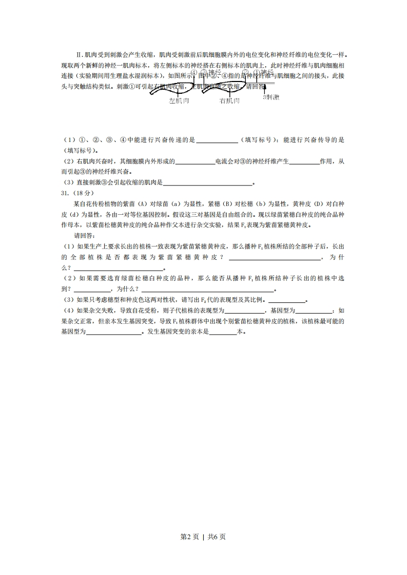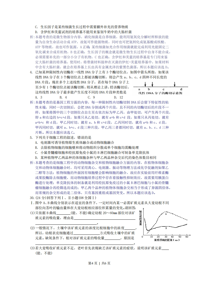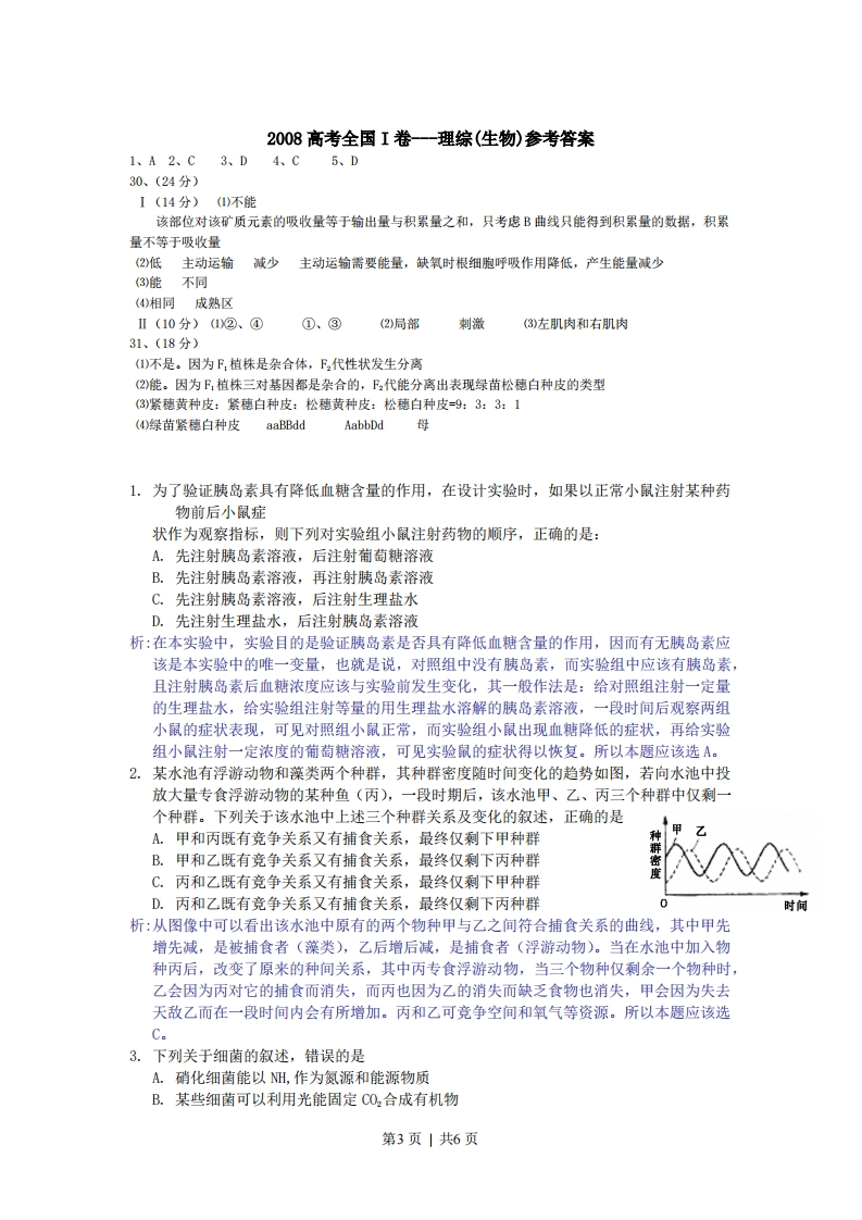 2008高考全国I卷-一理综(生物)(江西、浙江、安撒、福建、湖北、湖南、河北、河南、山西、陕西、广西、辽宁12省区)1.为了验证胰岛素具有降低血糖含量的作用,在设计实验方案时,如果以正常小鼠每次注射药物前后小鼠症状的变化为观察指标,则下列对实验组小鼠注射药物的顺序,正确的是A.先注射胰岛素溶液,后注射葡萄糖溶液B.先注射胰岛素溶液,再注射胰岛素溶液C.先注射胰岛素溶液,后注射生理盐水D.先注射生理盐水,后注射胰岛素溶液2.某水池有浮游动物和藻类两个种群,其种群密度随时间变化的趋势如图。若向水池中投放大量专食浮游动物的某种鱼(丙),一段时间后,该水池甲、乙、丙三个种群中仅刹一个种群。下列关于该水池中上述三个种群关系及变化的叙述,正确的是A.甲和丙既有竞争关系又有捕食关系,最终仅刹下甲种群B.甲和乙既有竞争关系又有捕食关系,最终仅剩下丙种群C.丙和乙既有竞争关系又有捕食关系,最终仅剩下甲种群时间D.丙和乙既有竞争关系又有捕食关系,最终仅剩下丙种群3.下列关于细菌的叙述,错误的是A.硝化细菌能以H作为氮源和能源物质B.某些细菌可以利用光能固定C0合成有机物C.生长因子是某些细菌生长过程中需要额外补充的营养物质D.含伊红和美蓝试剂的培养基不能用来鉴别牛奶中的大肠杆菌4.已知某种限制性内切酶在一线性DNA分子上有3个酶切位点,如图中箭头所指,如果该线性DA分子在3个酶切位点上都被该酶切断,则会产生a、b、c、d四种不同长度的DNA片段。现有多个上述线性DNA分子,若在每个DNA分子上至少有一个酶切位点被该酶切断,则理论上讲,经该酶酵切后,这些线性DNA分子最多能产生长度不同的DNA片段种类数是h.3B.4C.9D.125.下列关于细胞工程的叙述,错误的是DA.电剌激可诱导植物原生质体融合或动物细胞融合钱性D水A分千的刷切示道图B.去除植物细胞的细胞壁和将动物组织分散成单个细胞均需酶处理C.小鼠骨髓瘤细胞和经抗原免疫小鼠的B淋巴细胞融合可制备单克隆抗体D.某种植物甲乙两品种的体细胞杂种与甲乙两品种杂交后代的染色体数目相同30.(24分)回答下列I、Ⅱ小趣I.图中A、B曲线分别表示在适宜的条件下,一定时间内某一必需矿质元素从大麦幼根不同部位向茎叶的输出量和在大麦幼根相应部位积累量的变化。请回答:(1)只依据B曲线一(能、不能)确定幼根20~60mm部位对该矿质元素的吸收输出或积黑量量,理由是(2)一般情况下,土壤中该矿质元素的浓度比根细胞中的浓度,所以,幼根表皮细胞通过方式吸收土壤中的矿质元素。缺氧条件下,根对该矿质元素10203040500离根顶端的距离(m)的吸收量,原因是(3)若大麦吸收矿质元素不足,老叶首先表现缺乏该矿质元素的症状,说明该矿质元素(能、不能)被植物体再度利用。在不同的生长发育时期,大麦对该矿质元素的需要量(相同、不相同)。(4)该大麦根大量吸收该矿质元素的部位与大量吸收其他矿质元素的部位(相同、不相同),该部位称为第1页|共6页Ⅱ.肌肉受到刺激会产生收缩,肌肉受剌激前后肌细胞膜内外的电位变化和神经纤维的电位变化一样。现取两个新鲜的神经一肌肉标本,将左侧标本的神经搭在右侧标本的肌肉上,此时神经纤维与肌肉细胞相连接(实验期间用生理盐水湿润标本),如图所示9关④指的神绎辣肌细胞之间的接头,此接头与突触结构类似。刺激①可引起州肉收缩,上肌之哎缩请回容左肌肉右肌肉刺激(1)①、②、③、④中能进行兴奋传递的是(填写标号):能进行兴奋传导的是(填写标号)。(2)右肌肉兴奋时,其细胞膜内外形成的电流会对③的神经纤维产生作用,从而引起③的神经纤维兴奋。(3)直接刺激③会引起收缩的肌肉是31.(18分)某自花传粉植物的紫苗(A)对绿苗(a)为显性,紧穗(B)对松穗(b)为显性,黄种皮(D)对白种皮()为显性,各由一对等位基因控制。假设这三对基因是自由组合的。现以绿苗紧穗白种皮的纯合品种作母本,以紫苗松穗黄种皮的纯合品种作父本进行杂交实验,结果F,表现为紫苗紧穗黄种皮。请回答:(1)如果生产上要求长出的植株一致表现为紫苗紧穗黄种皮,那么播种F,植株所结的全部种子后,长出的全部植株是否都表现为紫苗紧穗黄种皮?,为什么?(2)如果需要选育绿苗松穗白种皮的品种,那么能否从播种F,植株所结种子长出的植株中选到?为什么?(3)如果只考虑穗型和种皮色这两对性状,请写出F2代的表现型及其比例。(4)如果杂交失败,导致自花受粉,则子代植株的表现型为」基因型为:如果杂交正常,但亲本发生基因突变,导致F,植株群体中出现个别紫苗松穗黄种皮的植株,该植株最可能的基因型为。发生基因突变的亲本是本。第2页|共6页2008高考全国I卷--理综(生物)参考答案1、A2、C3、D4、C5、D30、(24分)I(14分)()不能该部位对该矿质元素的吸收量等于输出量与积累量之和,只考虑B曲线只能得到积累量的数据,积累量不等于吸收量(2低主动运输减少主动运输需要能量,缺氧时根细胞呼吸作用降低,产生能量减少(3)能不同(4)相同成熟区Ⅱ(10分)(1②、④①、③(2)局部刺激(3)左肌肉和右肌肉31、(18分)(1)不是。因为F,植株是杂合体,F代性状发生分离(2)能。因为F,植株三对基因都是杂合的,F2代能分离出表现绿苗松穗白种皮的类型(3)紧穗黄种皮:紧穗白种皮:松穗黄种皮:松穗白种皮=9:3:3:1(4)绿苗紧穗白种皮aaBBdd AabbDd f母1.为了验证胰岛素具有降低血糖含量的作用,在设计实验