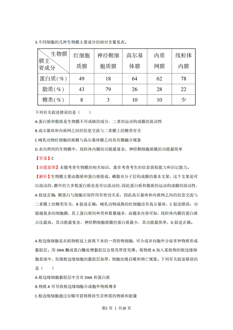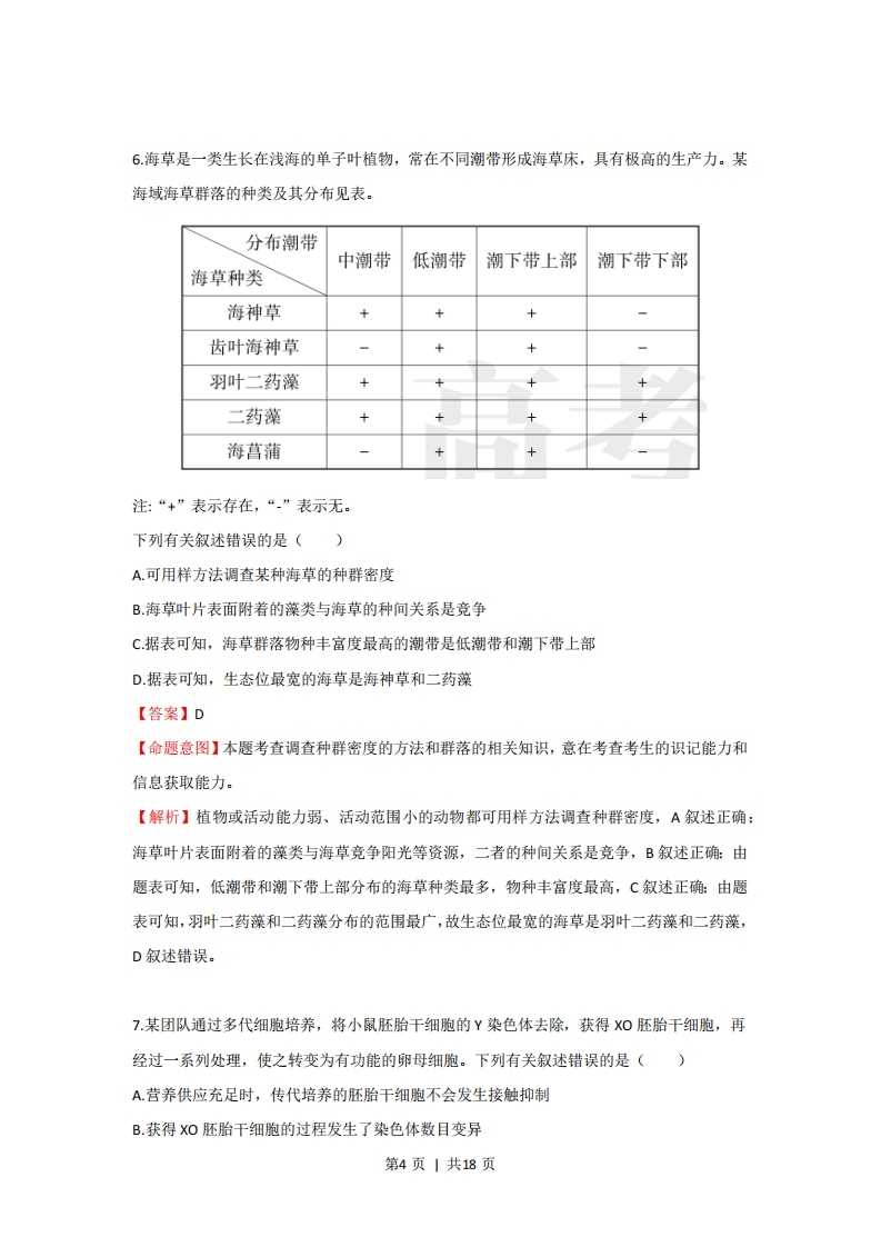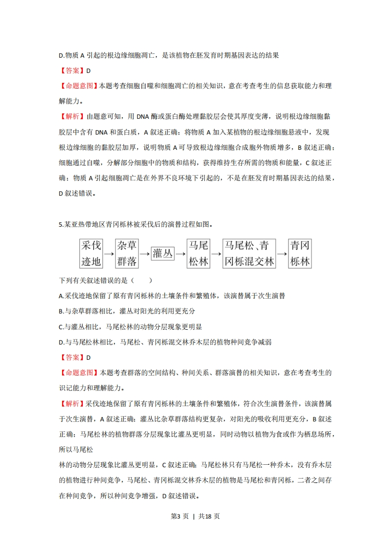 2023年普通高中学业水平等级考试(海南卷)生物本试卷分选择题和非选择题两部分,满分100分,考试时间90分钟。一、选择题:本部分共15题,每题2分,共30分。在每题列出的四个选项中,选出最符合题目要求的一项。1衣藻和大肠杆菌都是单细胞生物。下列有关二者的叙述,正确的是()A.都属于原核生物B.都以DNA作为遗传物质C都具有叶绿体,都能进行光合作用D.都具有线粒体,都能进行呼吸作用【答案】B【命题意图】本题考查单细胞生物中衣藻和大肠杆菌的相关知识,意在考查考生的识记能力。【解析】衣藻属于真核生物,A错误:衣藻和大肠杆菌的遗传物质都是DNA,B正确:大肠杆菌没有叶绿体,也不能进行光合作用,C错误大肠杆菌不含线粒体,但可以进行呼吸作用,D错误。2.科学家将编码天然蜘蛛丝蛋白的基因导入家蚕,使其表达出一种特殊的复合纤维蛋白,该复合纤维蛋白的韧性优于天然蚕丝蛋白。下列有关该复合纤维蛋白的叙述,正确的是()A.该蛋白的基本组成单位与天然蜘蛛丝蛋白的不同B.该蛋白的肽链由氨基酸通过肽键连接而成C该蛋白彻底水解的产物可与双缩脲试剂发生紫色反应D.高温可改变该蛋白的化学组成,从而改变其韧性【答案】B【命题意图】本题考查蛋白质的相关知识,意在考查考生的识记能力。【解析】该蛋白的基本组成单位是氨基酸,与天然蜘蛛丝蛋白的基本组成单位相同,A错误氨基酸是组成蛋白质的基本单位,氨基酸发生脱水缩合反应形成由肽键连接而成的多肽链,进而形成蛋白质,B正确:该蛋白彻底水解的产物为氨基酸,不能与双缩脲试剂发生紫色反应,C错误:高温可通过改变该蛋白的空间结构从而改变其韧性,但不会改变该蛋白的化学组成,D错误。第1页|共18页3.不同细胞的几种生物膜主要成分的相对含量见表。生物膜红细胞神经鞘细高尔基内质线粒体膜主要成分质膜胞质膜体膜网膜内膜蛋白质(%)》4918646278脂质(%)》4379262822糖类(%)831010少下列有关叙述错误的是(A蛋白质和脂质是生物膜不可或缺的成分,二者的运动构成膜的流动性B.高尔基体和内质网之间的信息交流与二者膜上的糖类有关C哺乳动物红细胞的质膜与高尔基体膜之间具有膜融合现象D表内所列的生物膜中,线粒体内膜的功能最复杂,神经鞘细胞质膜的功能最简单【答案】C【命题意图】本题考查生物膜的相关知识,意在考查考生的信息获取能力和识记能力。【解析】生物膜主要由脂质和蛋白质组成,磷脂双分子层构成膜的基本支架,这个支架是可以流动的,膜中的大多数蛋白质也是可以流动的,因此蛋白质和脂质的运动构成膜的流动性,A叙述正确:糖蛋白与细胞识别作用有密切关系,因此高尔基体和内质网之间的信息交流与二者膜上的糖类有关,B叙述正确:哺乳动物成熟的红细胞没有高尔基体,C叙述错误:功能越复杂的细胞膜,其上蛋白质的种类和数量越多,由题表内容可知,线粒体内膜的蛋白质占比最高,其功能最复杂,神经鞘细胞质膜的蛋白质最少,其功能最简单,D叙述正确。4.根边缘细胞是从植物根冠上游离下来的一类特殊细胞,可合成并向胞外分泌多种物质形成黏胶层。用DNA酶或蛋白酶处理黏胶层会使其厚度变薄。将物质A加入某植物的根边缘细胞悬液中,发现根边缘细胞的黏胶层加厚,细胞出现自噬和调亡现象。下列有关叙述错误的是()A.根边缘细胞黏胶层中含有DNA和蛋白质B.物质A可导致根边缘细胞合成胞外物质增多C根边缘细胞通过自噬可获得维持生存所需的物质和能量第2页|共18页D.物质A引起的根边缘细胞调亡,是该植物在胚发育时期基因表达的结果【答案】D【命题意图】本题考查细胞自噬和细胞调亡的相关知识,意在考查考生的信息获取能力和理解能力。【解析】由题意可知,用DNA酶或蛋白酶处理黏胶层会使其厚度变薄,说明根边缘细胞黏胶层中含有DNA和蛋白质,A叙述正确:将物质A加入某植物的根边缘细胞悬液中,发现根边缘细胞的黏胶层加厚,说明物质A可导致根边缘细胞合成胞外物质增多,B叙述正确:细胞通过自噬,分解部分细胞中的物质和结构,获得维持生存所需的物质和能量,C叙述正确:物质A引起细胞调亡是在外界不良环境下引起的,不是在胚发育时期基因表达的结果,D叙述错误。5.某亚热带地区青冈栎林被采伐后的演替过程如图。采伐杂草马尾马尾松、青青冈灌丛迹地群落松林冈栎混交林栎林下列有关叙述错误的是(A.采伐迹地保留了原有青冈栎林的土壤条件和繁殖体,该演替属于次生演替B.与杂草群落相比,灌丛对阳光的利用更充分C.与灌丛相比,马尾松林的动物分层现象更明显D.与马尾松林相比,马尾松、青冈栎混交林乔木层的植物种间竞争减弱【答案】D【命题意图】本题考查群落的空间结构、种间关系、群落演替的相关知识,意在考查考生的识记能力和理解能力。【解析】采伐迹地保留了原有青冈栎林的土壤条件和繁殖体,符合次生演替条件,该演替属于次生演替,A叙述正确:灌丛比杂草群落结构更复杂,对阳光的吸收利用更充分,B叙述正确:马尾松林的植物群落分层现象比灌丛更明显,同时动物以植物为食或作为栖息场所,所以马尾松林的动物分层现象比灌丛更明显,C叙述正确:马尾松林只有马尾松一种乔木,没有乔木层的植物进行种间竞争,马尾松、青冈栎混交林乔木层的植物是马尾松和青冈栎,二者之间存在种间竞争,所以种间竞争增强,D叙述错误。第3页|共18页