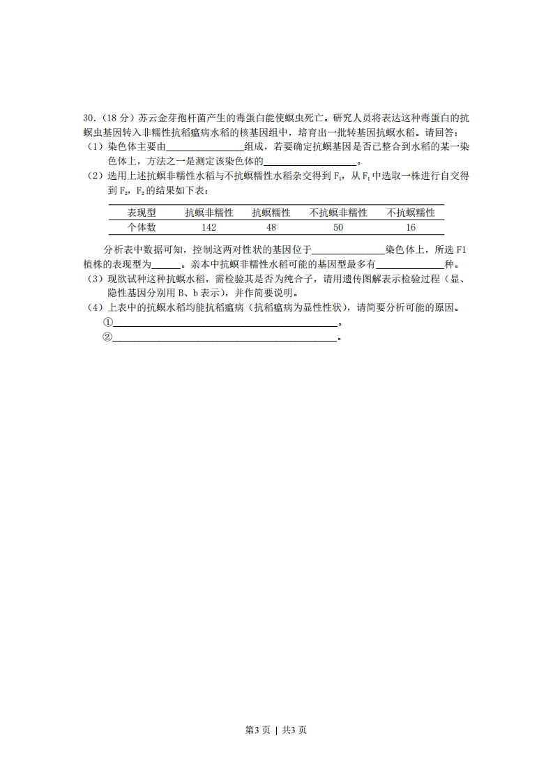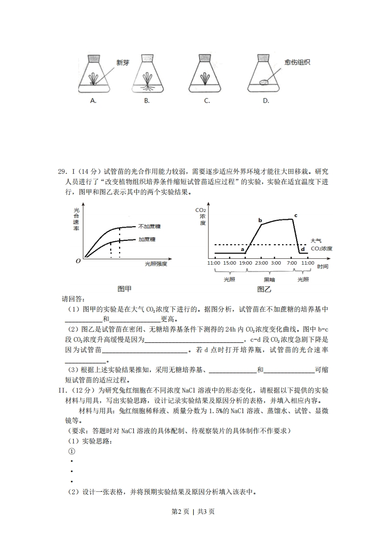 2010年浙江省高考理综生物试题1.乙肝疫苗的接种需在一定时期内间隔注射三次,其目的是A.使机体积累更多数量的疫苗B.使机体产生更多种类的淋巴细胞C.使机体产生更多数量的抗体和淋巴细胞D.使机体产生更强的非特异性免疫2.在用基因工程技术构建抗除草剂的转基因烟草过程中,下列操作错误的是A.用限制性核酸内切酶切割烟草花叶病毒的核酸B.用DNA连接酶连接经切割的抗除草剂基因和载体C.将重组DNA分子导入烟草原生质体D.用含除草剂的培养基筛选转基因烟草细胞3.若生态系统中生活着多种植食性动物,其中某一植食性动物种群个体数量的变化如图所示。若不考虑该系统内生物个体的迁入与迁出,下列关于该种群个体数量变化的叙述,错误的是A.若a点时环境因素发生变化,但食物量不变,则a点以后个体数量变化不符合逻辑斯缔增长个B.若该种群出生率提高,个体数量的增加也不会大体幅超过b点C.天敌的大量捕食会导致该种群个体数量下降,下量降趋势与b-c段相似D.年龄结构变动会导致该种群个体数量发生波动,波动趋势与c-d段相似季节4.下列关于动物细胞培养的叙述,正确的是A.培养保留接触抑制的细胞在培养瓶壁上可形成多层细胞B.克隆培养法培养过程中多数细胞的基因型会发生改变C.二倍体细胞的传代培养次数通常是无限的D.恶性细胞系的细胞可进行传代培养5.下图①⑤依次表示蛙坐骨神经受到刺激后的电位变化过程。下列分析正确的是⊙⊙④⑤A.图①表示甲乙两个电极处的膜外电位的大小与极性不同B.图②表示甲电极处的膜处于去极化过程,乙电极处的膜处于极化状态C.图④表示甲电极处的膜处于复极化过程,乙电极处的膜处于反极化状态D.图⑤表示甲乙两个电极处的膜均处于极化状态6.将无根的非洲菊幼苗转入无植物激素的培养基中,在适宜的温度和光照等条件下培养一段时间后,应出现的现象是第1页|共3页新芽愈伤组织29.I(14分)试管苗的光合作用能力较弱,需要逐步适应外界环境才能往大田移栽。研究人员进行了“改变植物组织培养条件缩短试管苗适应过程”的实验,实验在适宜温度下进行,图甲和图乙表示其中的两个实验结果。C合浓不加赋糖加蔗糖大气■■■■””adC02浓度光照强度110015:0019:0023:003:007:0011:00时间光照黑暗光照图甲图乙请回答:(1)图甲的实验是在大气C0z浓度下进行的。据图分析,试管苗在不加蔗糖的培养基中和更高。(2)图乙是试管苗在密闭、无糖培养基条件下测得的24h内C0z浓度变化曲线。图中b-℃段C02浓度升高缓慢是因为一,c-d段C02浓度急剧下降是因为试管苗」。若d点时打开培养瓶,试管苗的光合速率(3)根据上述实验结果推知,采用无糖培养基、和可缩短试管苗的适应过程。II.(12分)为研究兔红细胞在不同浓度NC1溶液中的形态变化,请根据以下提供的实验材料与用具,写出实验思路,设计记录实验结果及原因分析的表格,并填入相应内容。材料与用具:兔红细胞稀释液、质量分数为1.5%的NaC1溶液、蒸馏水、试管、显微镜等。(要求:答题时对NCl溶液的具体配制、待观察装片的具体制作不作要求)(1)实验思路:①(2)设计一张表格,并将预期实验结果及原因分析填入该表中。第2页|共3页30.(18分)苏云金芽孢杆菌产生的毒蛋白能使螟虫死亡。研究人员将表达这种毒蛋白的抗螟虫基因转入非糯性抗稻瘟病水稻的核基因组中,培育出一批转基因抗螟水稻。请回答:(1)染色体主要由」组成,若要确定抗螟基因是否己整合到水稻的某一染色体上,方法之一是测定该染色体的(2)选用上述抗螟非糯性水稻与不抗螟糯性水稻杂交得到F,从,中选取一株进行自交得到F2,F2的结果如下表:表现型抗螟非糯性抗螟糯性不抗螟非糯性不抗螟糯性个体数142485016分析表中数据可知,控制这两对性状的基因位于染色体上,所选F1植株的表现型为一。亲本中抗螟非糯性水稻可能的基因型最多有种(3)现欲试种这种抗螟水稻,需检验其是否为纯合子,请用遗传图解表示检验过程(显、隐性基因分别用B、b表示),并作简要说明。(4)上表中的抗螟水稻均能抗稻瘟病(抗稻瘟病为显性性状),请简要分析可能的原因。①②第3页|共3页