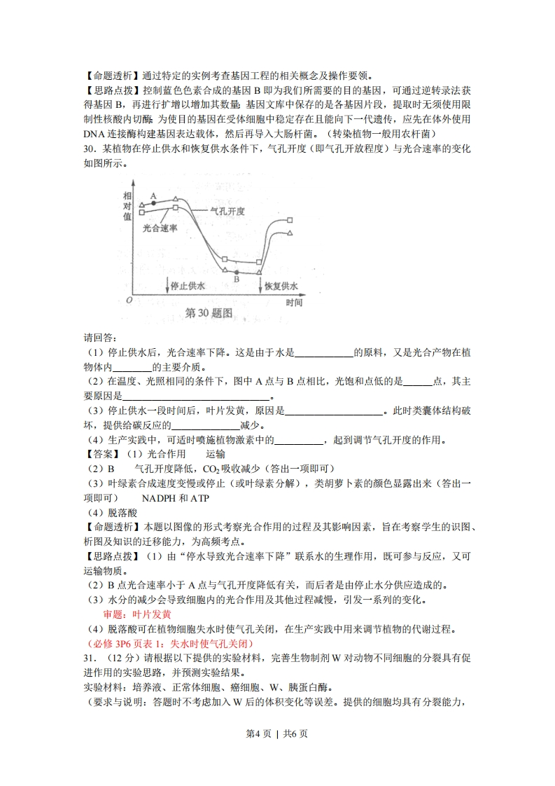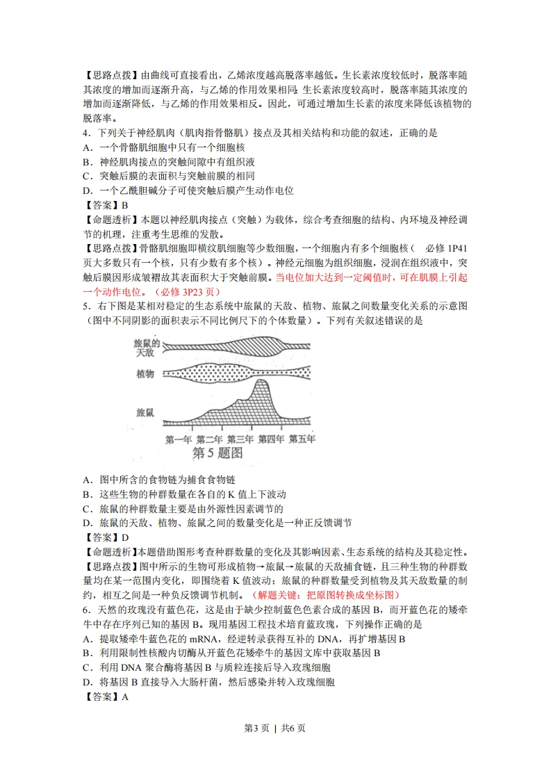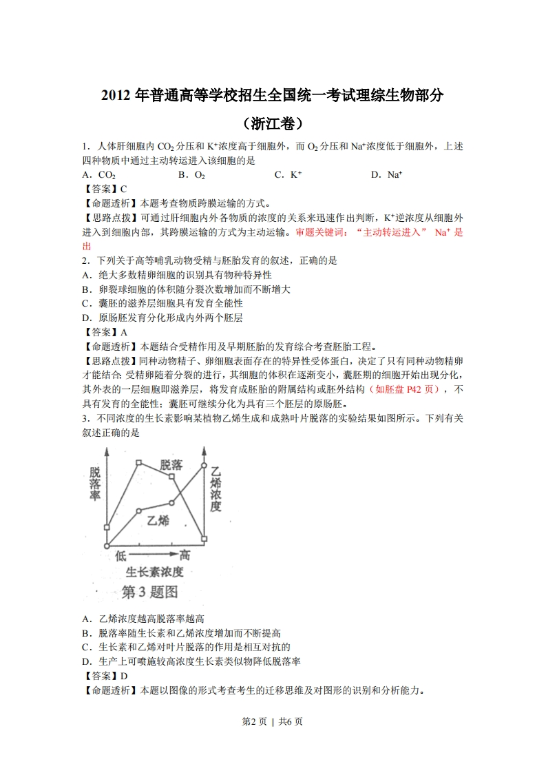 浙江卷参考答案:1.C2.A3.D4.B5.D6.A30.(14分)(1)光合作用运输(2)B气孔开度降低,CO2吸收减少(答出一项即可)(3)叶绿素合成速度变慢或停止(或叶绿素分解),类胡萝卜素的颜色显露出来(答出一项即可)NADPH和ATP(4)脱落酸31.(12分)(1)①A组:培养液中加入体细胞。B组:培养液中加入体细胞,加入W。C组:培养液中加入癌细胞。D组:培养液中加入癌细胞,加入W。②胰蛋白酶④统计并分析所得数据。(其它合理答案均可)(2)D组C组胞数B组A组时间(其它合理答案均可)32.(18分)(1)表达有害性基因突变(2)诱变育种基因重组胚状体(3)4(4)抗病矮秆不抗病高秆AabbaaBb配子AbabaBabFAaBbAabbaaBbaabb抗病高秆抗病矮秆不抗病高秆不抗病矮轩比例1:111第1页|共6页2012年普通高等学校招生全国统一考试理综生物部分(浙江卷)1.人体肝细胞内CO2分压和K+浓度高于细胞外,而O2分压和Na浓度低于细胞外,上述四种物质中通过主动转运进入该细胞的是A.C02B.02C.KD.Nat【答案】C【命题透析】本题考查物质跨膜运输的方式。【思路点拨】可通过肝细胞内外各物质的浓度的关系来迅速作出判断,K+逆浓度从细胞外进入到细胞内部,其跨膜运输的方式为主动运输。审题关键词:“主动转运进入”Na*是出2.下列关于高等哺乳动物受精与胚胎发育的叙述,正确的是A.绝大多数精卵细胞的识别具有物种特异性B.卵裂球细胞的体积随分裂次数增加而不断增大C.囊胚的滋养层细胞具有发育全能性D.原肠胚发育分化形成内外两个胚层【答案】A【命题透析】本题结合受精作用及早期胚胎的发育综合考查胚胎工程。【思路点拨】同种动物精子、卵细胞表面存在的特异性受体蛋白,决定了只有同种动物精卵才能结合受精卵随着分裂的进行,其细胞的体积在逐渐变小,囊胚期的细胞开始出现分化,其外表的一层细胞即滋养层,将发育成胚胎的附属结构或胚外结构(如胚盘P42页),不具有发育的全能性:囊胚可继续分化为具有三个胚层的原肠胚。3.不同浓度的生长素影响某植物乙烯生成和成熟叶片脱落的实验结果如图所示。下列有关叙述正确的是脱落率烯浓度乙烯低◆高生长素浓度第3题图A.乙烯浓度越高脱落率越高B.脱落率随生长素和乙烯浓度增加而不断提高C.生长素和乙烯对叶片脱落的作用是相互对抗的D.生产上可喷施较高浓度生长素类似物降低脱落率【答案】D【命题透析】本题以图像的形式考查考生的迁移思维及对图形的识别和分析能力。第2页|共6页【思路点拨】由曲线可直接看出,乙烯浓度越高脱落率越低。生长素浓度较低时,脱落率随其浓度的增加而逐渐升高,与乙烯的作用效果相同生长素浓度较高时,脱落率随其浓度的增加而逐渐降低,与乙烯的作用效果相反。因此,可通过增加生长素的浓度来降低该植物的脱落率。4.下列关于神经肌肉(肌肉指骨骼肌)接点及其相关结构和功能的叙述,正确的是A.一个骨骼肌细胞中只有一个细胞核B.神经肌肉接点的突触间隙中有组织液C,突触后膜的表面积与突触前膜的相同D.一个乙酰胆碱分子可使突触后膜产生动作电位【答案】B【命题透析】本题以神经肌肉接点(突触)为载体,综合考查细胞的结构、内环境及神经调节的机理,注重考生思维的发散。【思路点拨】骨骼肌细胞即横纹肌细胞等少数细胞,一个细胞内有多个细胞核(必修1P41页大多数只有一个核,只有少数有多个核)。神经元细胞为组织细胞,浸润在组织液中,突触后膜因形成皱褶故其表面积大于突触前膜。当电位加大达到一定阈值时,可在肌膜上引起一个动作电位。(必修3P23页)5.右下图是某相对稳定的生态系统中旅鼠的天敌、植物、旅鼠之间数量变化关系的示意图(图中不同阴影的面积表示不同比例尺下的个体数量)。下列有关叙述错误的是旅鼠的天敌植物000旅鼠第一年第二年第三年第四年第五年第5题图A.图中所含的食物链为捕食食物链B.这些生物的种群数量在各自的K值上下波动C.旅鼠的种群数量主要是由外源性因素调节的D.旅鼠的天敌、植物、旅鼠之间的数量变化是一种正反馈调节【答案】D【命题透析】本题借助图形考查种群数量的变化及其影响因素、生态系统的结构及其稳定性。【思路点拨】图中所示的生物可形成植物→旅鼠→旅鼠的天敌捕食链,且三种生物的种群数量均在某一范围内变化,即围绕着K值波动:旅鼠的种群数量受到植物及其天敌数量的制约,相互之间是一种负反馈调节机制。(解题关键:把原图转换成坐标图)6.天然的玫瑰没有蓝色花,这是由于缺少控制蓝色色素合成的基因B,而开蓝色花的矮牵牛中存在序列已知的基因B。现用基因工程技术培育蓝玫瑰,下列操作正确的是A.提取矮牵牛蓝色花的mRNA,经逆转录获得互补的DNA,再扩增基因BB.利用限制性核酸内切酶从开蓝色花矮牵牛的基因文库中获取基因BC.利用DNA聚合酶将基因B与质粒连接后导入玫瑰细胞D.将基因B直接导入大肠杆菌,然后感染并转入玫瑰细胞【答案】A第3页|共6页
