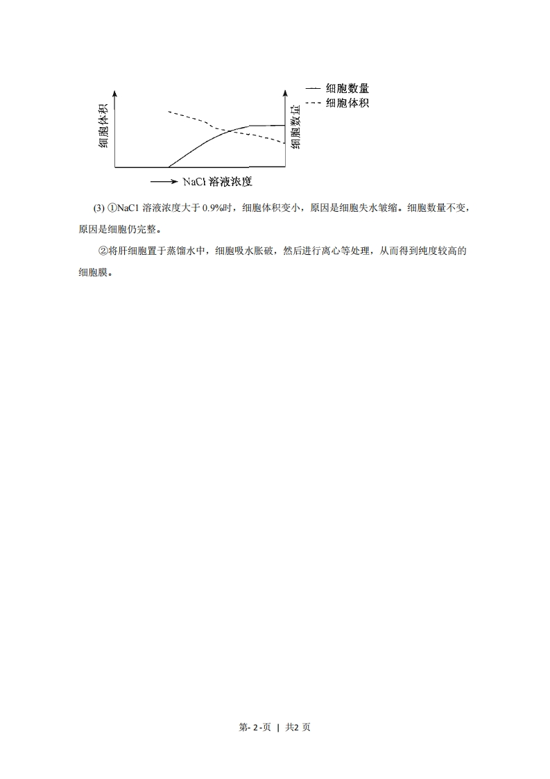 生物试题参考答案一、选择题(本大题共28小题,每小题2分,共56分)1.A2.D3.B4,A5.B6.B7.c8,B9.C10.A11.A12.C13.A14.D15.B16.D17.D18.A19.B20.B21.D22.C23.C24B25.C26.B27.C28.D二、非选择题(本大题共5小题,共44分)29.(6分)(1)水稻水稻→黑线姬鼠→黑鸢(2)五传递效率约10%(逐级递减)(3)标志重捕(4)生物放大30.(7分)(1)氧气释放量(2)强度波长(3)卡尔文RuBP3蔗糖31.(7分)(1)宽叶两(2)性状分离(3)AAXBY或AaXBY2/3(4)aaXbY白花宽叶♀,白花窄叶♀,白花宽叶♂,白花窄叶d=1:1:1:132.(14分)(1)A灭菌涂布菌落(2)限制性核酸内切酶(3)酒精无菌水(4)愈伤组织B(⑤)湿度扩增(6)花色33.(10分)(1)①取试管若干支,将质量分数为1.3%NaCl溶液由高到低进行浓度梯度稀释。②向各支试管中分别加入肝细胞悬液,放置一定时间。③取各试管中的肝细胞悬液,分别滴加到血细胞计数板上,在显微镜下计数并测量细胞直径,记录实验结果。④对实验数据进行统计分析。第1-页1共2页细胞数量细胞体积毅→NaCl溶液浓度(3)①NC1溶液浓度大于0.9%时,细胞体积变小,原因是细胞失水皱缩。细胞数量不变,原因是细胞仍完整。②将肝细胞置于蒸馏水中,细胞吸水胀破,然后进行离心等处理,从而得到纯度较高的细胞膜。第2-页1共2页