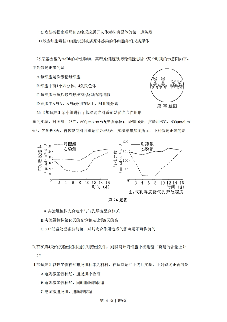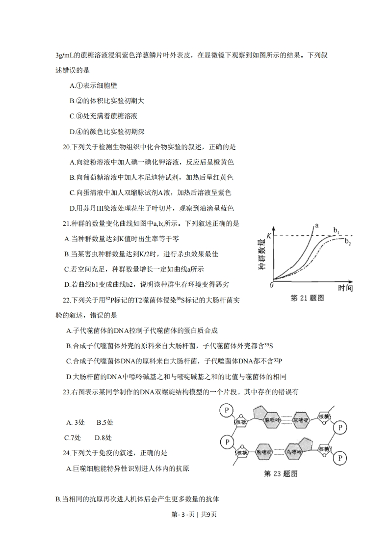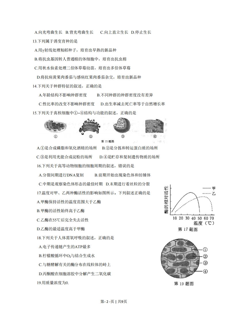 2015年10月浙江省普通高校招生选考科目考试生物试题一、选择题(本大题共28小题,每小题2分,共56分。每小题列出的四个备选项中只有一个是符合题目要求的,不选、多选、错选均不得分)1.下列属于原核生物的是A乳酸细菌B.小麦C家兔D.蜜蜂2造成温室效应的主要因素是A.泥石流频发B.臭氧减少C.酸雨普降D.大气中CO2浓度增加3.经大量家系调查发现,外耳道多毛症只发生于男性,女性无此症。该症属于A.X连锁遗传B.Y连锁遗传C,多基因遗传D.常染色体遗传4.某生物种群由基因型为AA,Aa,s的个体组成,基因A的频率为70%,则基因a的频率二A.30%B.60%C.35%D.70%5.人类的特纳氏综合征是由于缺少一条性染色体引起的变异。该变异的类型是A基因突变B.染色体数目变异C基因重组D.染色体结构变异6地球上最大的生态系统是A一片草地B.生物圈C一个池塘D一片森林7.下列关于艾滋病的叙述,错误的是A.艾滋病的病原体是HVB.艾滋病病毒可通过血液传播C.艾滋病患者晚期免疫功能增强D.艾滋病病毒主要攻击辅助性T细胞8.下列不属于人体细胞外液成分的是A.水B.红细胞C.钠离子D.氧气9.下列激素中含碘的是A生长激素B.雄激素C.甲状腺激素D.雌激素10.受精卵经多次分裂产生形态、结构和功能不同的后代细胞,发生这种差异的过程称为A细胞分化B细胞癌变C.细胞衰老D.细胞调亡.所有生物都用一套基本相同的遗传密码,这一事实说明生物具有A统一性B.多样性C.变异性D.特异性12用不透光罩子罩住玉米幼苗尖端,然后给予单侧光照,如图所示。一段时间后,幼苗将第12题图第-1-页1共9页A向光弯曲生长B.背光弯曲生长C.向上直立生长D.停止生长13.下列属于诱变育种的是A.用γ射线处理籼稻种子,培育出早熟的新品种B.将抗虫基因转人普通棉的体细胞中,培育出抗虫棉C.用秋水仙素处理二倍体草莓幼苗,培育出多倍体草莓D.将抗病黄果肉番茄与感病红果肉番茄杂交,培育出新品种14.下列关于种群特征的叙述,正确的是A.年龄结构不影响种群密度B.不同种群的种群密度没有差异C.性比率的改变不影响种群密度D.出生率减去死亡率等于自然增长率15.下列关于真核细胞中①④结构与功能的叙述,正确的是第15题图A.①是合成磷脂和氧化酒精的场所B.②是分拣和转运蛋白质的场所C.③是利用光能合成淀粉的场所D.④是贮存和复制遗传物质的场所16.下列关于高等动物细胞的细胞周期的叙述,错误的是A.分裂间期进行DNA复制B.前期开始出现染色体和纺锤体C.中期是观察染色体形态的最佳时期D,末期进行着丝粒的分裂對甲17温度对甲、乙两种酶活性的影响如图所示。下列叙述正确的是…乙A.甲酶保持活性的温度范围大于乙酶B.甲酶的活性始终高于乙酶避C.乙酶在55℃后完全失去活性10203040506070温度(℃)D.乙酶的最适温度高于甲酶第17题图18.下列关于人体需氧呼吸的叙述,正确的是A.电子传递链产生的ATP最多①B.柠檬酸循环中O2与结合生成水C.与糖酵解有关的酶分布在线粒体的峙上③D.丙酮酸在细胞溶胶中分解产生二氧化碳④19.用质量浓度为0.第19题图第-2-页1共9页3gmL的蔗糖溶液浸润紫色洋葱鳞片叶外表皮,在显微镜下观察到如图所示的结果。下列叙述错误的是A.①表示细胞壁B.②的体积比实验初期大C.③处充满着蔗糖溶液D.④的颜色比实验初期深20.下列关于检测生物组织中化合物实验的叙述,正确的是A向淀粉溶液中加人碘一碘化钾溶液,反应后呈橙黄色B.向葡萄糖溶液中加人本尼迪特试剂,加热后呈红黄色C.向蛋清液中加人双缩脉试剂A液,加热后溶液呈紫色D.用苏丹Ⅲ染液处理花生子叶切片,观察到油滴呈蓝色21种群的数量变化曲线如图中a,b:所示。下列叙述正确的是A.当种群数量达到K值时出生率等于零B.当某害虫种群数量达到K2时,进行杀虫效果最佳C若空间充足,种群数量增长一定如曲线a所示D.若曲线b1变成曲线b2,说明该种群生存环境变得恶劣时间22.下列关于用32P标记的T2噬菌体侵染5S标记的大肠杆菌实第21题图验的叙述,错误的是A.子代噬菌体的DNA控制子代噬菌体的蛋白质合成B.合成子代噬菌体外壳的原料来自大肠杆菌,子代噬菌体外壳都含35SC.合成子代噬菌体DNA的原料来自大肠杆菌,子代噬菌体DNA都不含PD.大肠杆菌的DNA中嘌呤碱基之和与嘧啶碱基之和的比值与噬菌体的相同23.右图表示某同学制作的DNA双螺旋结构模型的一个片段。其中存在的错误有A.3处B.5处C.7处D.8处24.下列关于免疫的叙述,正确的是A.巨噬细胞能特异性识别进人体内的抗原第23题图B.当相同的抗原再次进人机体后会产生更多数量的抗体第-3-页1共9页