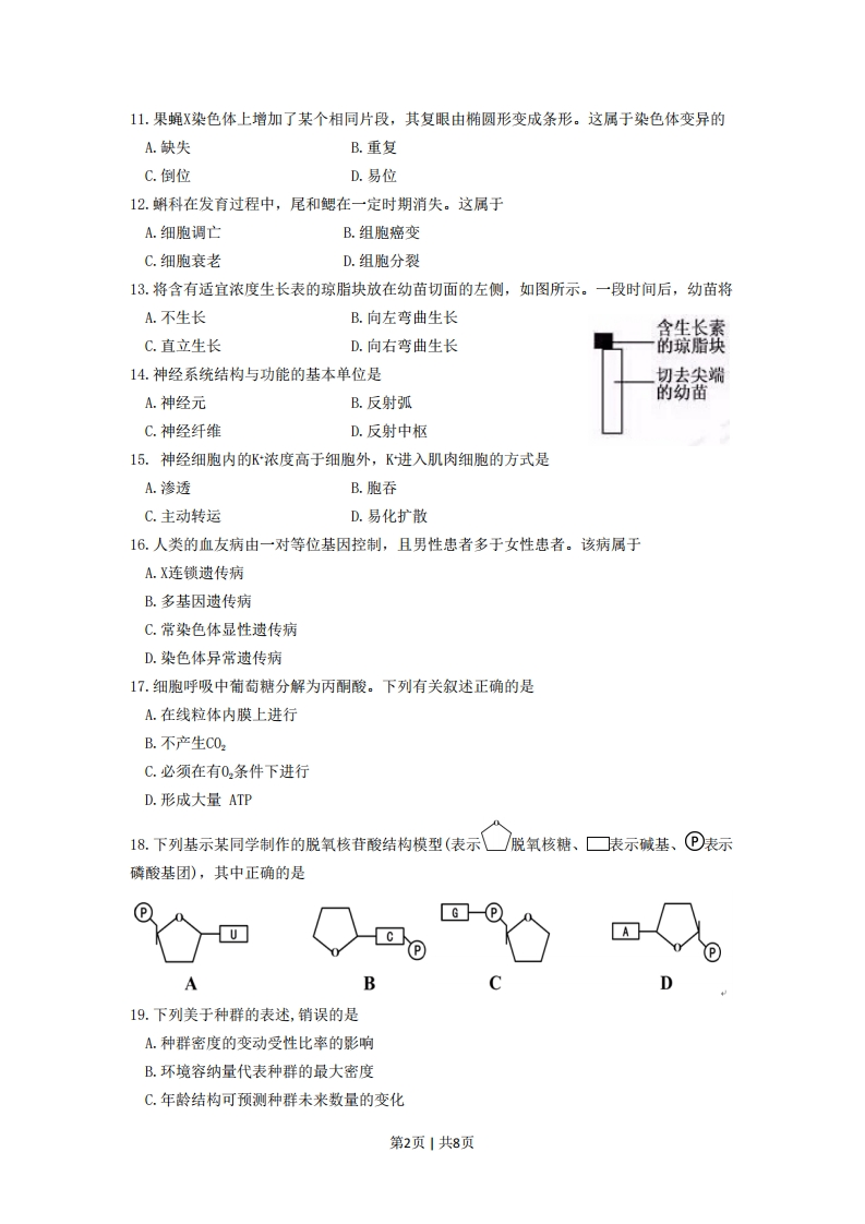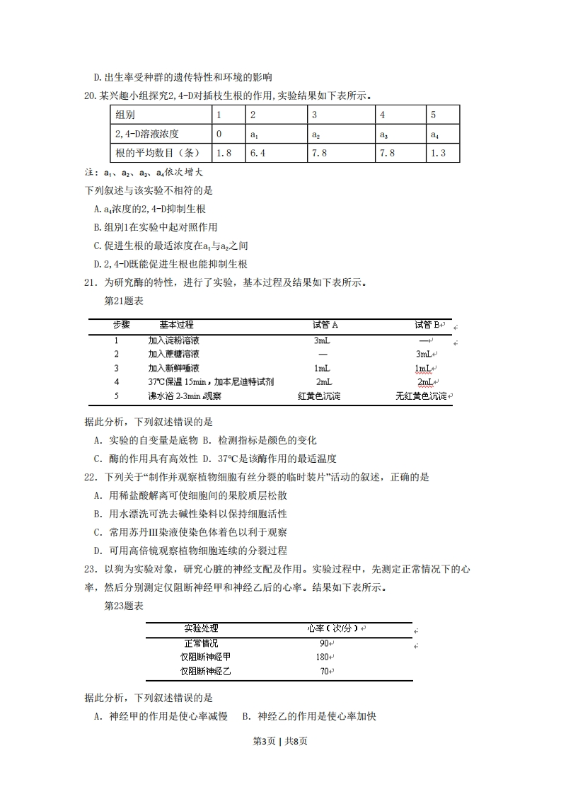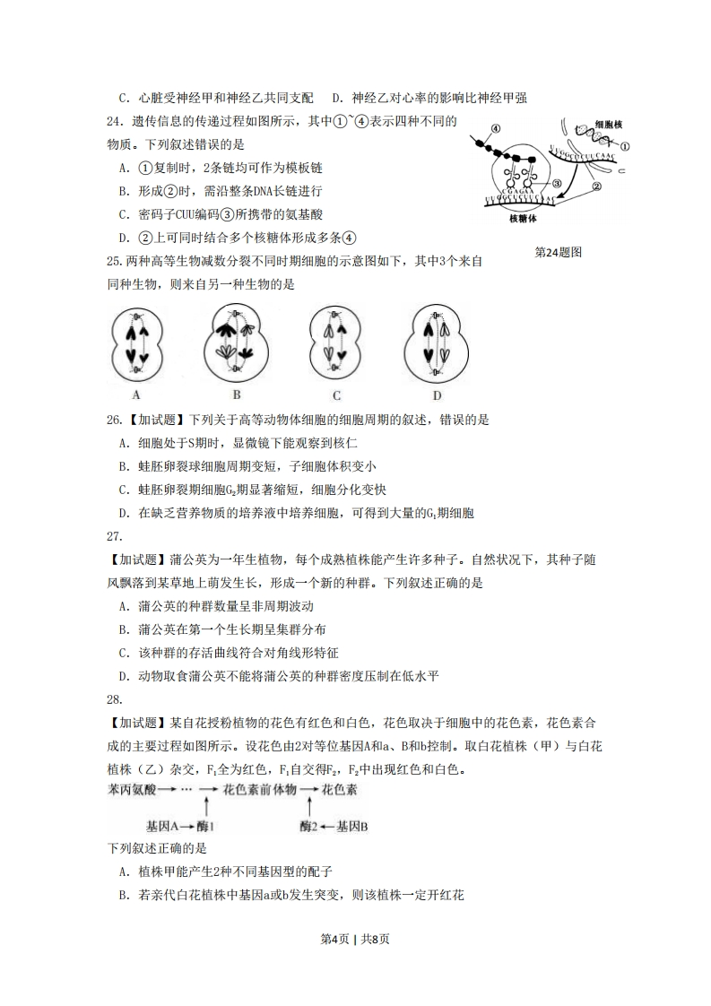 2016年4月浙江省普通高校招生选考、选考科目考试生物试题考生注意:1.答题前,请务必将自己的姓名、准考证号用黑色字迹的签字笔或钢笔分别填写在试题卷和答题纸规定的位置上。2.答题时,请按照答题纸上“注意事项”的要求,在答题纸相应位置上规范作答,在本试题卷上的作答一律无效。3.非选择题的答案必须使用黑色字迹的签字笔或钢笔写在答题纸上相应区域内,作图时可先使用2B铅笔,确定后必须使用黑色字迹的签字笔或钢笔描黑,答案写在本试题卷上无效选择题部分一、选择题(本大题共28小题,每小题2分,共56分。每小题列出的四个备选项中只有一个是符合题目要求的,不选、多选、错选均不得分)1.下列细胞中具有细胞壁的是A.红细胞B.叶肉细胞C.皮肤细胞D.淋巴细胞2.下列人类活动不会加剧温室效应的是A.多开汽车B.火力发电C.植树造林D.燃煤取暖3.下列属于优生措施的是A.产前诊断B.近亲结婚C.高龄生育D.早婚早育4.皮肤中腺体的分泌物能抑制某些细菌和真菌。这属于人体防御病原体的A.第一道防线B.第二道防线C.体液免疫D.细胞免疫5.鸟的翅膀和人的手臂在骨骼结构上非常相似。这说明它们之间存在A.稀有性B.适应性C.统一性D.竞争性6.地球上具有最丰富生物基因库的是A.水稻田B.草原C.荒漠D.热带雨林7.激发并维持人体第二性征的激素是A.甲状腺激素B.生长激素C.性激素D.生长素8.存在于动物体内的单糖是A.纤维素B.淀粉C.葡萄糖D.核酸9.胰岛素是由51个氨基酸组成的蛋白质。细胞内合成胰岛素的场所是A.核糖体B.中心体C.线粒体D.溶酶体10.用六倍体小麦和二倍体黑麦培育出异源八倍体小黑麦。这种育种方法属于A.转基因育种B.辐射诱变育种C.化学诱变育种D.多倍体育种第1页1共8页11.果蝇X染色体上增加了某个相同片段,其复眼由椭圆形变成条形。这属于染色体变异的A.缺失B.重复C.倒位D.易位12.蝌科在发育过程中,尾和鳃在一定时期消失。这属于A.细胞调亡B.组胞癌变C.细胞衰老D.组胞分裂13.将含有适宜浓度生长表的琼脂块放在幼苗切面的左侧,如图所示。一段时间后,幼苗将A.不生长B.向左弯曲生长含生长素C.直立生长D.向右弯曲生长的琼脂块14.神经系统结构与功能的基本单位是切去尖端A.神经元的幼苗B.反射弧C.神经纤维D.反射中枢15.神经细胞内的K浓度高于细胞外,K进入肌肉细胞的方式是A.渗透B.胞吞C.主动转运D.易化扩散16.人类的血友病由一对等位基因控制,且男性患者多于女性患者。该病属于A.X连锁遗传病B.多基因遗传病C.常染色体显性遗传病D.染色体异常遗传病17.细胞呼吸中葡萄糖分解为丙酮酸。下列有关叙述正确的是A.在线粒体内膜上进行B.不产生C02C.必须在有02条件下进行D.形成大量ATP18.下列基示某同学制作的脱氧核苷酸结构模型(表示/脱氧核糖、☐表示碱基、®表示磷酸基团),其中正确的是GB19.下列美于种群的表述,销误的是A.种群密度的变动受性比率的影响B.环境容纳量代表种群的最大密度C.年龄结构可预测种群未来数量的变化第2页1共8页D.出生率受种群的遗传特性和环境的影响20.某兴趣小组探究2,4-D对插枝生根的作用,实验结果如下表所示。组别123452,4-D溶液浓度0a0>根的平均数目(条)1.86.47.87.81.3注:a、a2、a、au依次增大下列叙述与该实验不相符的是A.a浓度的2,4-D抑制生根B.组别1在实验中起对照作用C.促进生根的最适浓度在a,与a2之间D.2,4-D既能促进生根也能抑制生根21.为研究酶的特性,进行了实验,基本过程及结果如下表所示。第21题表步骤基本过程试管A试管BP1加入淀粉溶液3mL2加入蔗糖溶液一3mLe3加入新鲜唾液1mL1以437℃保温15mim,加本尼迪特试剂2mL2mL5沸水浴2-3nim观察红黄色沉淀无红黄色沉淀据此分析,下列叙述错误的是A.实验的自变量是底物B.检测指标是颜色的变化C.酶的作用具有高效性D.37℃是该酶作用的最适温度22.下列关于“制作并观察植物细胞有丝分裂的临时装片”活动的叙述,正确的是A.用稀盐酸解离可使细胞间的果胶质层松散B.用水漂洗可洗去碱性染料以保持细胞活性C.常用苏丹Ⅲ染液使染色体着色以利于观察D.可用高倍镜观察植物细胞连续的分裂过程23.以狗为实验对象,研究心脏的神经支配及作用。实验过程中,先测定正常情况下的心率,然后分别测定仅阻断神经甲和神经乙后的心率。结果如下表所示。第23题表实验处理心率〔次分)中正常情况90中仅阻断神经甲180仅阻断神经乙70据此分析,下列叙述错误的是A.神经甲的作用是使心率减慢B.神经乙的作用是使心率加快第3页1共8页