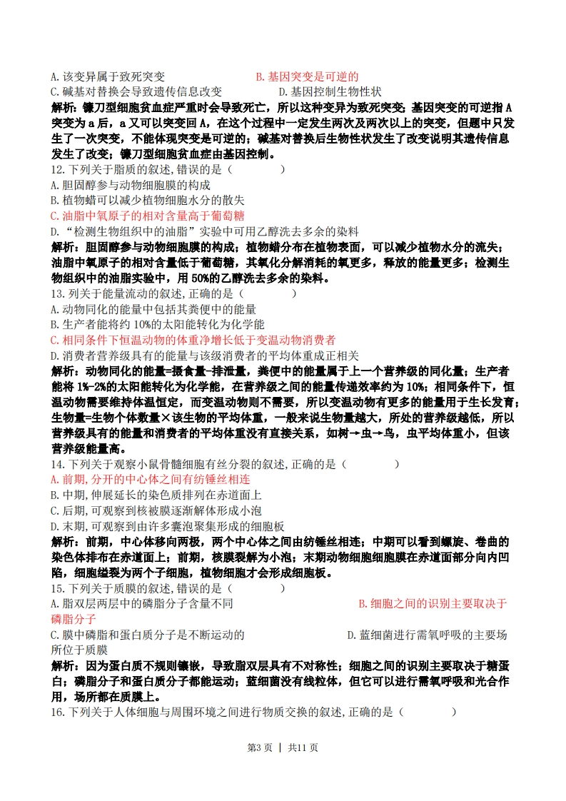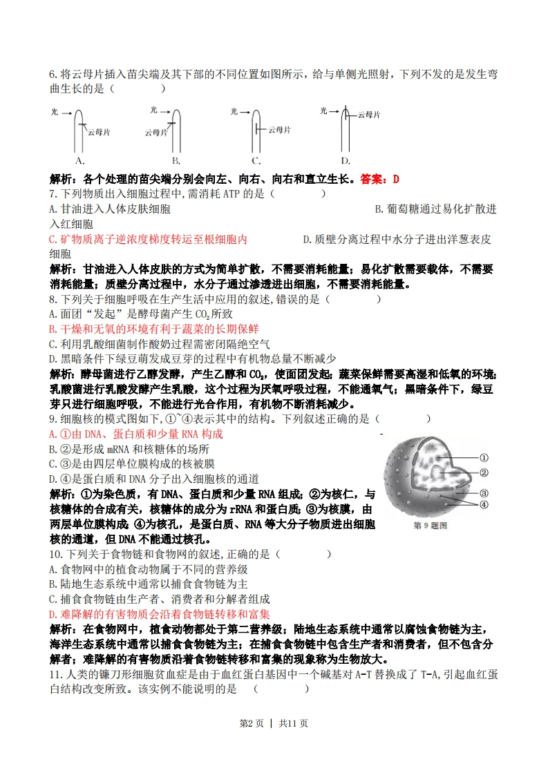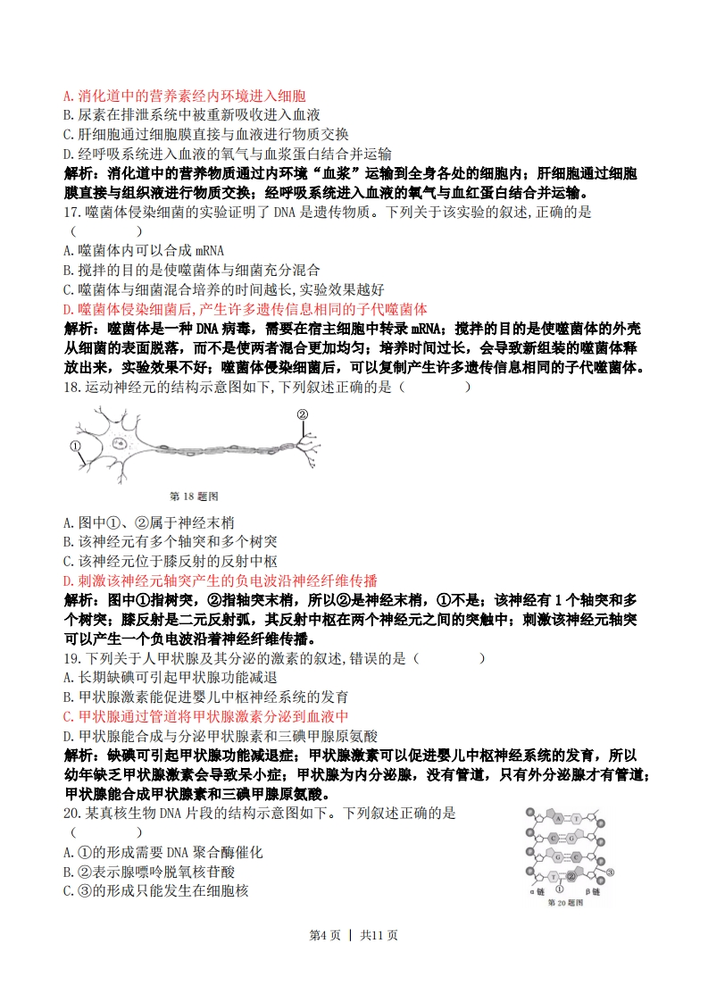 绝密↓考试结束前2017年11月浙江省普通高校招生选考科目考试生物试题本试卷分选择题和非选择题两部分,共8页,满分100分,考试时间90分钟。其中加试题部分为30分,有【加试题】标出。考生注意:1.答题前,请务必将自己的姓名、准考证号用黑色字迹的签字笔或钢笔分别赶写在和答题纸规定的位置上。2.答题时,请按照答题纸上“注意事项”的要求,在答题纸相应的位置上规范作答,在本试卷上的作答一律无效。3.非选择题的答案必须使用黑色字迹的签字笔或钢笔写在答题纸上相应区域内,作图时可先用2B铅笔,确定后必须使用黑色字迹的签字笔或钢笔描黑。选择题部分一、选择题(本大题共28小题,每小题2分,共56分。每小题列出的四个备选项中只有一个是符合题目要求的,不选、多逃、错选均不得分1.下列生态系统中最稳定的是(A.沙漠B.苔原C.草原D.热带雨林解析:食物网越复杂,生态系统抵抗外力干扰的能力越强。热带雨林是地球上最丰富的生物基因库,所以热带雨林是地球上最稳定的生态系统,而苔原则是最脆弱的生态系统。2.胚胎干细胞可形成神经细胞、骨骼肌细胞等多种类型的细胞,该过程属于(A.细胞分化B.细胞癌变C.细胞衰老D.细胞凋亡解析:细胞的后代在形态、结构和功能上发生差异的过程称为细胞分化。细胞癌变指细胞异常分化;细胞凋亡指细胞编程性死亡。3.动物和植物都由真核细胞组成,他们的细胞结构十分相似。这说明生物具有()A.适应性B.统一性C.遗传性D.特异性解析:不同的生物在细胞结构上的相似,体现了生物的统一性。4.下列不属于水体污染防治措施的是(A.对河道开展清淤保洁工作B.建立污水处理厂C.禁止工业废水超标排放D.给汽车安装排气净化装置解析:对河道开展清淤保洁工作:建立污水处理厂;禁止工业废水超标排放都是水体污染的防治措施。给汽车安装排气净化装置是大气污染的防治措施。5.下列关于人类遗传病的叙述,正确的是(A.白化病属于多基因遗传病B.遗传病在青春期的发病率最高C.高龄生育会提高遗传病的发病风险D.缺铁引起的贫血是可以遗传的解析:白化病是常染色体隐性疾病,是单基因控制的遗传病;40岁以上的孕妇所生的子女,先天愚型病的发病率比25-34岁生育者高10倍;各种遗传病在青春期的患病率很低;缺铁引起的贫血不会遗传给下一代。第1页|共11页6.将云母片插入苗尖端及其下部的不同位置如图所示,给与单侧光照射,下列不发的是发生弯曲生长的是(云母片云得片D解析:各个处理的苗尖端分别会向左、向右、向右和直立生长。答案:D7.下列物质出入细胞过程中,需消耗ATP的是(A.甘油进入人体皮肤细胞B.葡萄糖通过易化扩散进入红细胞C.矿物质离子逆浓度梯度转运至根细胞内D.质壁分离过程中水分子进出洋葱表皮细胞解析:甘油进入人体皮肤的方式为简单扩散,不需要消耗能量;易化扩散需要载体,不需要消耗能量;质壁分离过程中,水分子通过渗透进出细胞,不需要消耗能量。8.下列关于细胞呼吸在生产生活中应用的叙述,错误的是()A.面团“发起”是酵母菌产生C02所致B.干燥和无氧的环境有利于蔬菜的长期保鲜C.利用乳酸细菌制作酸奶过程需密闭隔绝空气D.黑暗条件下绿豆萌发成豆芽的过程中有机物总量不断减少解析:酵母菌进行乙醇发酵,产生乙醇和CO2,使面团发起;蔬菜保鲜需要高湿和低氧的环境:乳酸菌进行乳酸发酵产生乳酸,这个过程为厌氧呼吸过程,不能通氧气;黑暗条件下,绿豆芽只进行细胞呼吸,不能进行光合作用,有机物不断消耗减少。9.细胞核的模式图如下,①④表示其中的结构。下列叙述正确的是(A.①由DNA、蛋白质和少量RNA构成B.②是形成mRNA和核糖体的场所①C.③是由四层单位膜构成的核被膜D.④是蛋白质和DNA分子出入细胞核的通道解析:①为染色质,有DNA、蛋白质和少量RNA组成,②为核仁,与③核糖体的合成有关,核糖体的成分为NA和蛋白质③为核膜,由④两层单位膜构成④为核孔,是蛋白质、NA等大分子物质进出细胞第9题图核的通道,但DNA不能通过核孔。10.下列关于食物链和食物网的叙述,正确的是(A.食物网中的植食动物属于不同的营养级B.陆地生态系统中通常以捕食食物链为主C.捕食食物链由生产者、消费者和分解者组成D.难降解的有害物质会沿着食物链转移和富集解析:在食物网中,植食动物都处于第二营养级;陆地生态系统中通常以腐蚀食物链为主,海洋生态系统中通常以捕食食物链为主;在捕食食物链中包含生产者和消费者,但不包含分解者;难降解的有害物质沿着食物链转移和富集的现象称为生物放大。11.人类的镰刀形细胞贫血症是由于血红蛋白基因中一个碱基对A-T替换成了T-A,引起血红蛋白结构改变所致。该实例不能说明的是(第2页|共11页A.该变异属于致死突变B.基因突变是可逆的C.碱基对替换会导致遗传信息改变D.基因控制生物性状解析:镰刀型细胞贫血症严重时会导致死亡,所以这种变异为致死突变基因突变的可逆指A突变为a后,a又可以突变回A,在这个过程中一定发生两次及两次以上的突变,但题中只发生了一次突变,不能体现突变是可逆的:碱基对替换后生物性状发生了改变说明其遗传信息发生了改变:镰刀型细胞贫血症由基因控制。12.下列关于脂质的叙述,错误的是(A.胆固醇参与动物细胞膜的构成B.植物蜡可以减少植物细胞水分的散失C.油脂中氧原子的相对含量高于葡萄糖D.“检测生物组织中