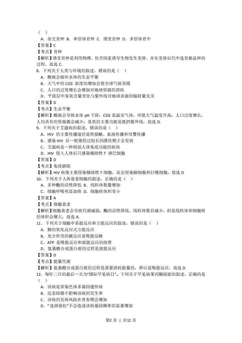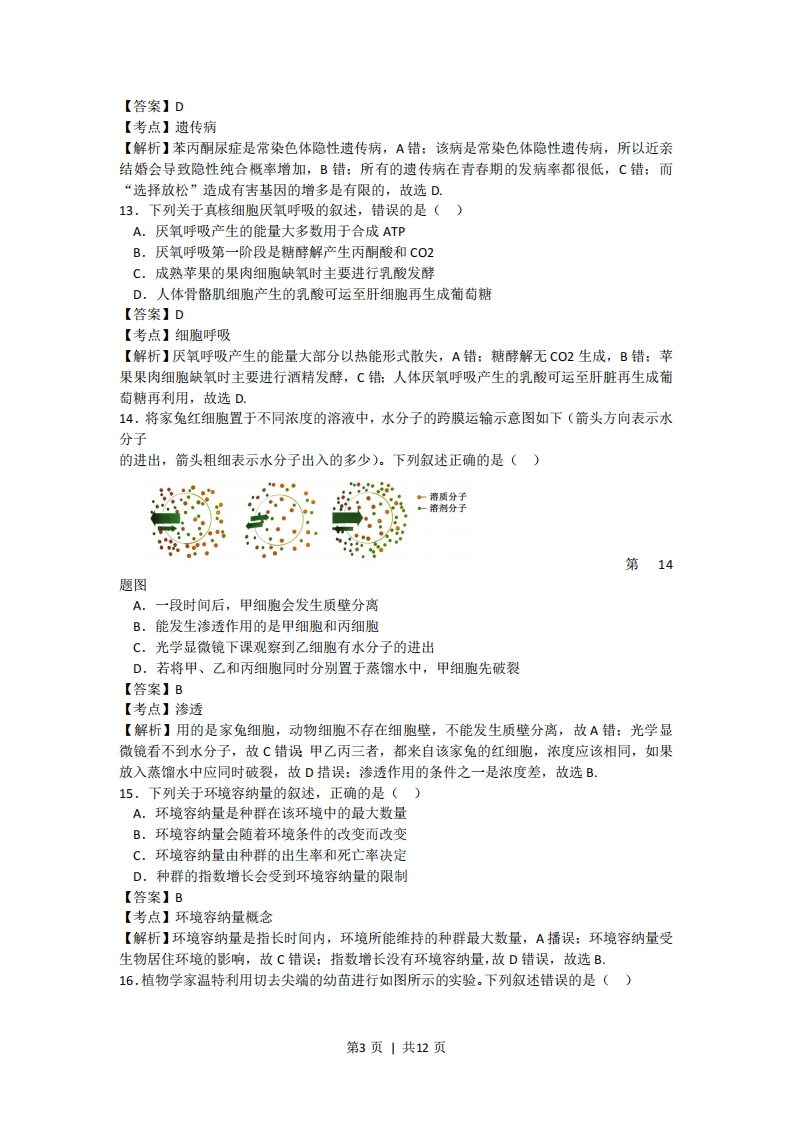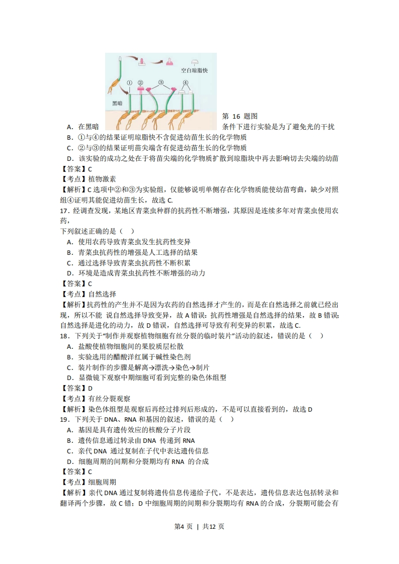 2017年4月浙江省普通高校招生选考科目考试生物试题选择题部分一、选择题(本大题共28小题,每小题2分,共56分。每小题列出的四个备选项中只有一个是符合题目要求的,不选、多选、错选均不得分)1.下列生物中含有叶绿体的是()A.菠菜B.大肠杆菌C.酵母菌D.蝴蝶【答案】A【考点】细胞器【解析】叶绿体只有绿色植物才有,故选A」2.冬候鸟秋天飞到南方越冬,使群落的组成发生了变化。这体现了群落的()A.时间结构B.水平结构C.向光弯曲生长D.分层现象【答案】A【考点】群落结构【解析】时间结构主要有日周期性变化和季节变化两种,候鸟南飞而导致不同时间段群落中物种种类差异,属于时间结构,故选A.3.豌豆种子的黄色(Y)和绿色(y)、圆粒(R)和皱粒()是两对相对性状。下列基因型中属于纯合子的是()A.YyRr B.YYRr C.YYRR D.YyRR【答案】C【考点】基因型【解析】纯合子一定要所有的等位基因全部纯合才可以称为为纯合子,故选C4.哺乳动物血液中某种离子含量过低会导致肌肉发生抽搐。该离子是()A.Fe2+B.Ca2+C.Cl-D.I-【答案】B【考点】无机盐【解析】C+过少会起抽搐,过多肌无力,故选B.5.在婴幼儿时期分泌不足引起侏儒症的激素是()A.雌激素B.生长激素C.雄激素D.甲状腺激素【答案】B【考点】动物激素的作用【解析】雌激素与雄激素均厲于性激素,幼年缺生长激素会得侏儒症,幼年缺少甲状腺激素会得呆小症,故选B.6.与DNA分子相比,RNA分子特有的碱基是()A.鸟嘌呤(G)B.跑嘧啶(C)C.尿嘧啶(U)D.腺嘌呤(A)【答案】C【考点】核酸碱基【解析】DNA有A、T、C、G四种碱基,RNA有A、U、C、G四种碱基故选C7.研究人员用X射线处理野生型青霉菌,选育出了高产青霉菌新菌株。这种育种方法属于第1页|共12页()A.杂交育种B.单倍体育种C.诱变育种D.多倍体育中【答案】C【考点】育种【解析】诱变育种是利用物理、化学因素诱导生物发生变异,并从变异后代中选育新品种的过程,故选C8.下列关于人类与环境的叙述,错误的是()A.酸雨会破坏水体的生态平衡B.大气中的C02浓度的增加会使全球气候变暖C.人口的过度增长会增加对地球资源的消耗D.平流层中臭氧含量变化与紫外线对地球表面的辐射量无关【答案】D【考点】生态平衡【解析】酸雨会导致水体pH下降:CO2是温室气体,可使大气温度升高:人口过度增长,人均具有的资源就会减少:臭氧的主要功能是抵挡紫外线,故选D.9.下列关于艾滋病的叙述,错误的是()A.HIⅣ的主要传播途径是性接触、血液传播和母婴传播B.感染HV后一般要经过较长的潜伏期才会发病C.艾滋病是一种削弱人体免疫功能的疾病D.HW侵入人体后只感染辅助性T林巴细胞【答案】D【考点】免疫缺陷【解析】HV病毒主要侵染辅助性T细胞,还会侵染脑细胞和巨噬细胞,故选D10.下列关于人体衰老细胞的叙述,正确的是()A.多种酶的活性降低B.线粒体数量增加C.细胞呼吸明显加快D.细胞核体积变小【答案】A【考点】细胞衰老【解析】细胞衰老会导致代谢减弱,酶的活性降低,线粒体数目减少,但是线粒体和细胞核的体积会增大,故选A11.下列关于细胞中系能反应和方能反应的叙述,错误的是()A.糖的氧化反应式方能反应B。光合作用的碳反应是吸能反映C.ATP是吸能反应和放能反应的纽带D.氨基酸合成蛋白质的过程是放能反应【答案】D【考点】能量代谢【解析】氨基酸合成蛋白质的过程是需要消耗能量的,所以是吸能反应,故选D12.每年二月的最后一天为“国际军见病日”。下列关于罕见病苯丙酮尿症的叙述,正确的是()A.该病是常染色体多基因遗传病B。近亲结婚不影响该病的发生率C.该病的发病风险在青春期会增加D.“选择放松”不会造成该病基因频率的显著增加第2页|共12页【答案】D【考点】遗传病【解析】苯丙酮尿症是常染色体隐性遗传病,A错:该病是常染色体隐性遗传病,所以近亲结婚会导致隐性纯合概率增加,B错:所有的遗传病在青春期的发病率都很低,C错:而“选择放松”造成有害基因的增多是有限的,故选D.13.下列关于真核细胞厌氧呼吸的叙述,错误的是()A.厌氧呼吸产生的能量大多数用于合成ATPB.厌氧呼吸第一阶段是糖酵解产生丙酮酸和CO2C.成熟苹果的果肉细胞缺氧时主要进行乳酸发酵D.人体骨骼肌细胞产生的乳酸可运至肝细胞再生成葡萄糖【答案】D【考点】细胞呼吸【解析】厌氧呼吸产生的能量大部分以热能形式散失,A错:糖酵解无CO2生成,B错:苹果果肉细胞缺氧时主要进行酒精发酵,C错:人体厌氧呼吸产生的乳酸可运至肝脏再生成葡萄糖再利用,故选D14.将家兔红细胞置于不同浓度的溶液中,水分子的跨膜运输示意图如下(箭头方向表示水分子的进出,箭头粗细表示水分子出入的多少)。下列叙述正确的是()。。溶质分子一溶剂分子第14题图A.一段时间后,甲细胞会发生质壁分离B.能发生渗透作用的是甲细胞和丙细胞C.光学显微镜下课观察到乙细胞有水分子的进出D.若将甲、乙和丙细胞同时分别置于蒸馏水中,甲细胞先破裂【答案】B【考点】渗透【解析】用的是家兔细胞,动物细胞不存在细胞壁,不能发生质壁分离,故A错:光学显微镜看不到水分子,故C错误甲乙丙三者,都来自该家兔的红细胞,浓度应该相同,如果放入蒸馏水中应同时破裂,故D措误:渗透作用的条件之一是浓度差,故选B.15.下列关于环境容纳量的叙述,正确的是()A.环境容纳量是种群在该环境中的最大数量B。环境容纳量会随着环境条件的改变而
