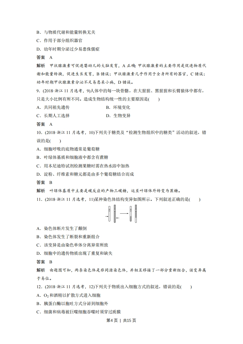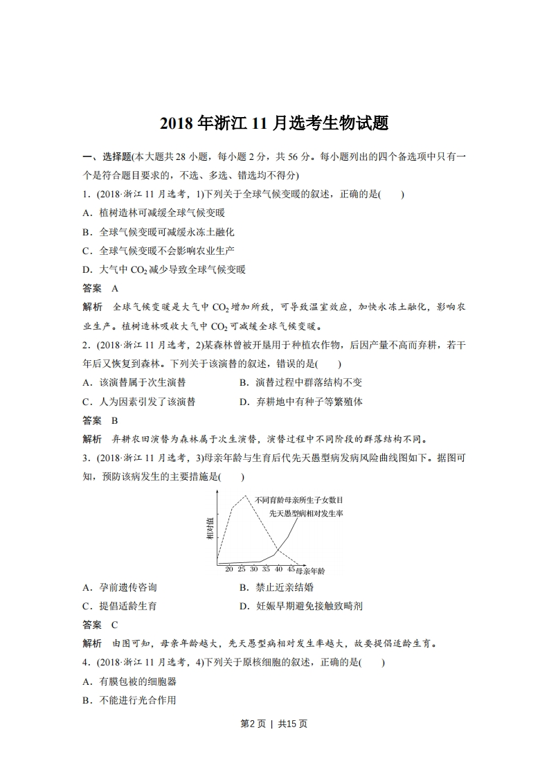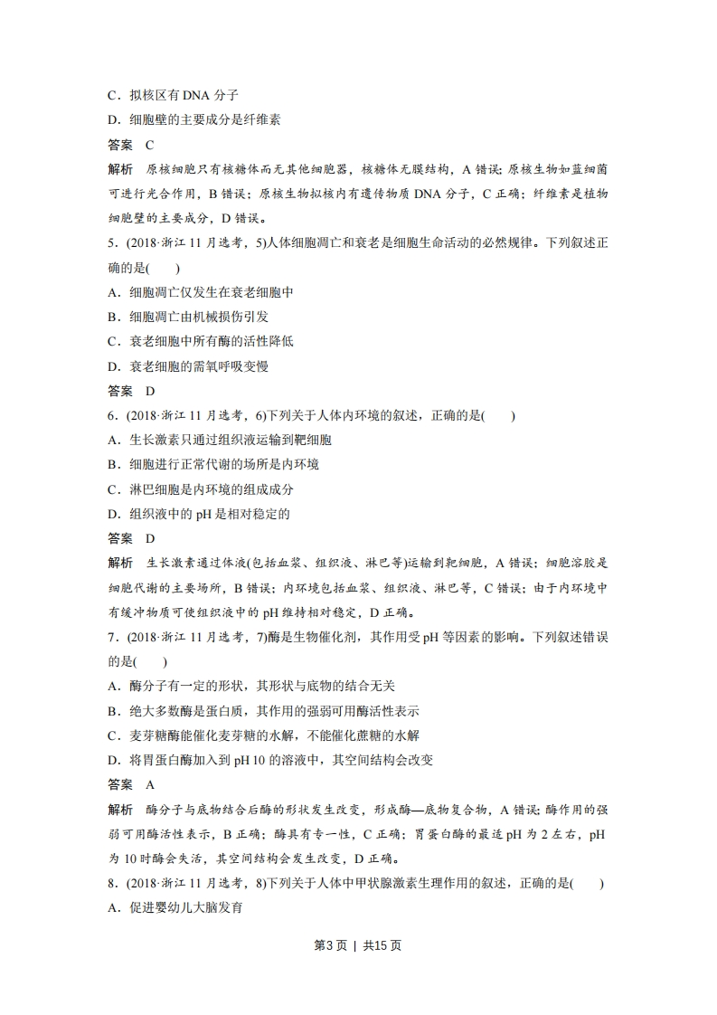 一、选择题ABCCDDAAABBCDCDBDCDBCBABCBCB二、非选择题29.(1)取食与被取食种类数自我调节(2)不同营养级未利用需消耗更多的能量用于维持体温恒定30.(1)同位素14C标记提取分离突然降低CO2浓度(2)NC!处理导致光合作用速率及气孔导度下降,且随处理时间的延长,抑制作用越明显不加NaCl的完全营养液单位时间单位叶面积的O,释放量、单位时间单位叶面积的干物质积累量31.)红眼紫红眼与紫红眼交配,F出现了红眼BbDd(2)4减数分裂过程中,非同源染色体上非等位基因自由组合(3)5/632.(一))达到设定的温度或压力值抽滤(2)将淀粉分解成糖作为碳源(3)C水解圈直径与菌落直径上清液(二)()物质循环系统的实际消费(2)间种种植业和畜牧业合理优化(3)重组DNA的质量和浓度、受体细胞的生长状态与密度携带目的基因的T质粒转移到受体细胞稳定和高效地表达33.(1)用1%H2S0,溶液刺激该蛙一侧后肢的趾尖,测定刺激感受器开始到出现屈腿的时间,有时间差,说明不是同时发生的兴奋通过突触的传递需要时间、兴奋在神经元上的传导需要时间组成该反射弧的神经元级数比屈腿反射的多感受器受损(2)神经和肌肉是两种不同的组织,存在电位差无法产生(3)K浓度膜电位与溶液钾离子浓度的关系示意图第1页|共15页2018年浙江11月选考生物试题一、选择题(本大题共28小题,每小题2分,共56分。每小题列出的四个备选项中只有一个是符合题目要求的,不选、多选、错选均不得分)1.(2018浙江11月选考,1)下列关于全球气候变暖的叙述,正确的是()A.植树造林可减缓全球气候变暖B.全球气候变暖可减缓永冻土融化C.全球气候变暖不会影响农业生产D.大气中CO2减少导致全球气候变暖答案A解析全球气候变暖是大气中CO2增加所致,可导致温室效应,加快永冻土融化,影响农业生产。植树造林吸收大气中CO2可减缓全球气候变暖。2.(2018·浙江11月选考,2)某森林曾被开垦用于种植农作物,后因产量不高而弃耕,若干年后又恢复到森林。下列关于该演替的叙述,错误的是()A.该演替属于次生演替B.演替过程中群落结构不变C.人为因素引发了该演替D.弃耕地中有种子等繁殖体答案B解析弃耕农田演替为森林属于次生演替,演替过程中不同阶段的群落结枸不同。3.(2018·浙江11月选考,3)母亲年龄与生育后代先天愚型病发病风险曲线图如下。据图可知,预防该病发生的主要措施是()不同育龄母亲所生子女数目先天愚型病相对发生率202巧303新4045母亲年龄A.孕前遗传咨询B.禁止近亲结婚C.提倡适龄生育D.妊娠早期避免接触致畸剂答案C解析由图可知,母亲年龄越大,先天愚型病相对发生率越大,故要提侣适龄生育。4.(2018·浙江11月选考,4)下列关于原核细胞的叙述,正确的是()A.有膜包被的细胞器B.不能进行光合作用第2页1共15页C.拟核区有DNA分子D.细胞壁的主要成分是纤维素答案C解析原核细胞只有核糖体而无其他细胞器,核糖体无膜结构,A错误:原核生物如蓝细菌可进行光合作用,B错误:原核生物拟核内有遗传物质DNA分子,C正确:纤维素是植物细胞壁的主要成分,D错误。5.(2018·浙江11月选考,5)人体细胞调亡和衰老是细胞生命活动的必然规律。下列叙述正确的是()A.细胞调亡仅发生在衰老细胞中B.细胞调亡由机械损伤引发C.衰老细胞中所有酶的活性降低D.衰老细胞的需氧呼吸变慢答案D6.(2018·浙江11月选考,6)下列关于人体内环境的叙述,正确的是(A,生长激素只通过组织液运输到靶细胞B.细胞进行正常代谢的场所是内环境C.淋巴细胞是内环境的组成成分D.组织液中的pH是相对稳定的答案D解析生长激素通过体液(包括血浆、组织液、淋巴等)运输到靶细胞,A错误:细胞溶胶是细胞代谢的主要场所,B错误:内环境包括血浆、组织液、淋巴等,C错误:由于内环境中有缓冲物质可使组织液中的pH维持相对稳定,D正确。7.(2018·浙江11月选考,7)酶是生物催化剂,其作用受pH等因素的影响。下列叙述错误的是()A.酶分子有一定的形状,其形状与底物的结合无关B.绝大多数酶是蛋白质,其作用的强弱可用酶活性表示C.麦芽糖酶能催化麦芽糖的水解,不能催化蔗糖的水解D.将胃蛋白酶加入到pH10的溶液中,其空间结构会改变答案A解析酶分子与底物结合后酶的形状发生改变,形成酶一底物复合物,A错误酶作用的强弱可用酶活性表示,B正确:酶具有专一性,C正确:胃蛋白酶的最适pH为2左右,pH为10时酶会失活,其空间结构会发生改变,D正确。8.(2018·浙江11月选考,8)下列关于人体中甲状腺激素生理作用的叙述,正确的是()A.促进婴幼儿大脑发育第3页|共15页