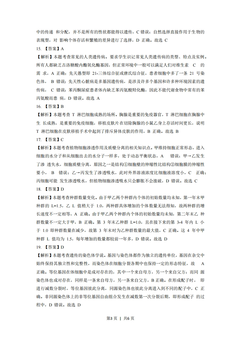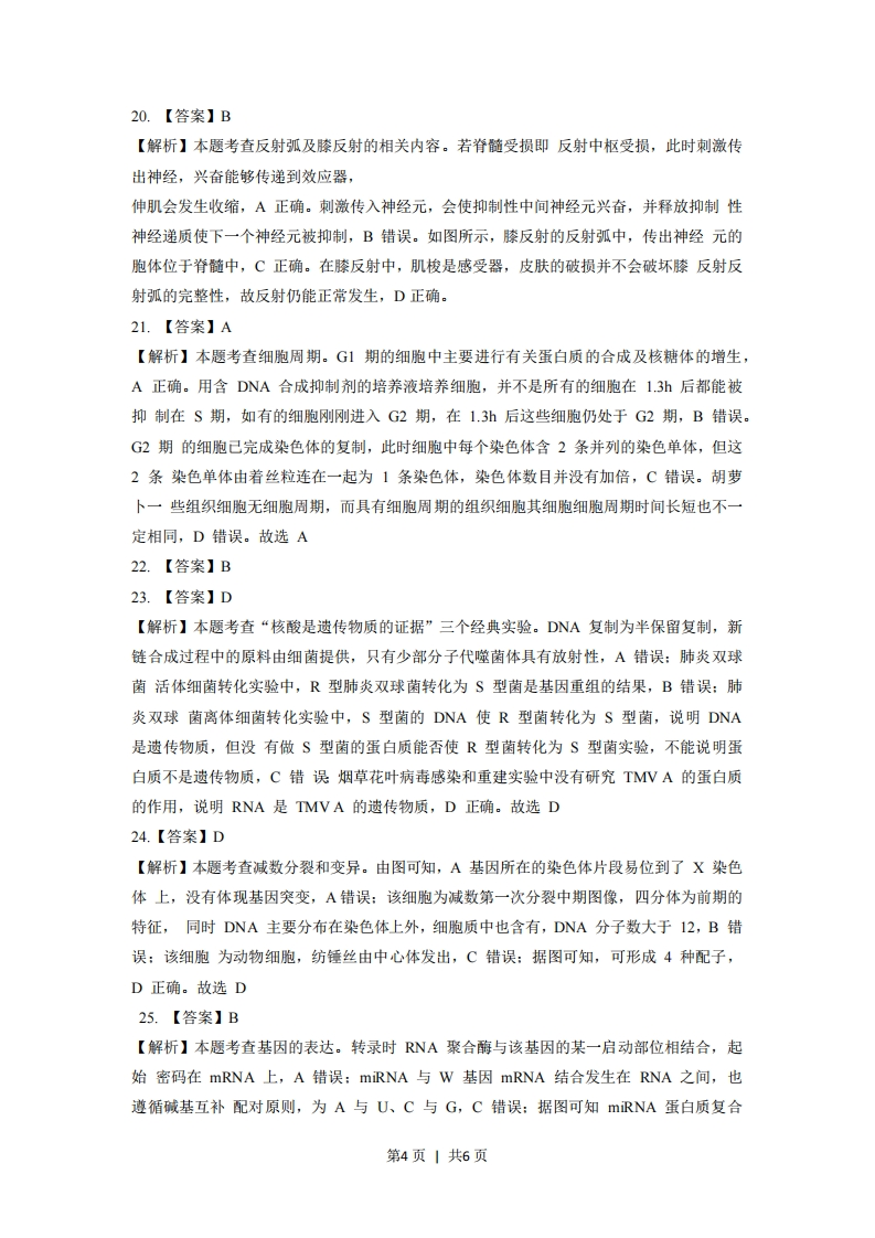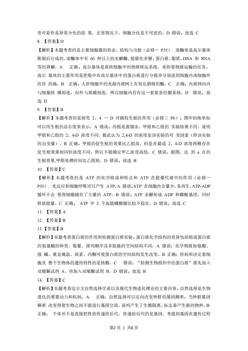 【答案与解析】一、选择题(本大题共28小题,每小题2分,共56分。每小题列出的四个备选项中只有一个是符合题目要求的,不选、多选、错选均不得分)1.【答案】D【解析】本题考查的是动植物细胞结构的差异(必修一P42)。家兔是动物,动物细胞有中心体,无细胞壁,无叶绿体,无大液泡。菠菜为高等植物,高等植物细胞中没有中心体(必修一P38),菠菜叶肉细胞具有细胞壁、叶绿体、液泡等细胞结构。故选D2.【答案】A【解析】本题考查的是全球性生态环境问题及其影响(必修三P126)。氟利昂通过化学反应使臭氧量减少,减少氟利昂的使用,可防止大气圈臭氧减少,A正确。B、C、D不能防止大气圈臭氧减少。故选A3.【答案】B【解析】本题考查的生物变异在生产上的应用中的转基因技术育种(必修二P86)。转基因技术是指利用分子生物学和基因工程的手段,将某生物的基因(海鱼)转移到其他生物物种(西红柿)中,使出现原物种不具有的新性状的技术,B正确。杂交育种是利用基因重组原理,有目的地将两个或多个品种的优良性状组合在一起,培育出更优良的新品种,利用单倍体作为中间环节产生具有优良性状的可育纯合子的育种方法称为单倍体育种,利用物理、化学因素来诱导多倍体的产生叫多倍体育种,A、C、D不符合题意。故选B4.【答案】D【解析】本题考查的水生是群落的垂直结构(必修三P86)。水生群落也有分层现象,其层次性主要是由光的穿透性、温度、氧气的垂直分布决定的,所以A、B、C正确,D错误。故选D5.【答案】C6.【答案】A【解析】本题考查的是雄激素和雌激素的作用(必修三P45).雌激素促进卵细胞成熟,睾酮促进精子发生,A错误。故选A7.【答案】C【解析】本题考查的是癌细胞的主要特征和引起细胞癌变的因素(必修一P113).癌细胞是由正常细胞转化而来,最重要的特点是无限增殖,A错误。癌细胞表面的粘连蛋白很少或缺失,所以癌细胞容易在组织间转移,B错误。引起癌变的致癌因素有物理因素(各种射线)、化学因素(许多种无机或有机化合物一如吸烟时烟雾中的物质)、生物因素(许多病毒),C正确。正常细胞发生突变而成为癌细胞的过程称为癌变,细胞的癌第1页1共6页变可看作是异常分化的结果,正常情况下,细胞分化是不可逆的,D错误。故选C8.【答案】D【解析】本题考查的是主要细胞器的形态、结构与功能(必修一P35),溶酶体是高尔基体断裂后行成的,溶酶体中有60种以上的水解酶,能催化多糖、蛋白质、脂质、DNA和RNA等的降解,A正确。高尔基体是真核细胞中的物质转运系统,承担着物质运输的任务,高尔基体的主要作用是把集中在高尔基体中的蛋白质进行分拣并分别送到细胞内或细胞外的目的地,B正确。人肝细胞中的光面内质网上有氧化酒精的酶,C正确。内质网向内与细胞核膜相连,向外与质膜相连,所以细胞内存在这一套复杂的膜系统,D错误。故选D9.【答案】B【解析】本题考查的是探究2,4一D对插枝生根的作用(必修三P6)。图中的纵坐标可以用生根的总长度来表示,A错误。丙组是蒸馏水,甲组和乙组的实验结果不同,说明甲组和乙组的2,4-D浓度不同,据此认为2,4D的浓度是该实验的可变因素(即该实验的自变量),B正确。甲组的促生根的效果比乙组高,但是在最适2,4-D浓度两侧存在促生根效果相同但浓度不同,所以不能确定甲乙浓度高低,C错误。据图,达到点的生根效果,甲组处理时间比乙组短,D错误。故选B10.【答案】C【解析】本题考查的是ATP的化学组成和特点和ATP在能量代谢中的作用(必修一P50),光反应和细胞呼吸可以产生ATP,A错误.ATP在细胞内含量少,易再生,ATP-ADP循环不会使得细胞储存了大量的ATP,B错误。ATP水解形成ADP和磷酸基团,同时释放能量,C正确。ATP中2个高能磷酸键比较不稳定,D错误。故选C11.【答案】A12.【答案】B13.【答案】B【解析】本题考查蛋白质的作用和检测蛋白质实验。蛋白质化学结构的差异包括组成蛋白质的氨基酸的种类、数量、排列顺序及多肽链的空间结构不同,A错误:化学物质如强酸、强碱、重金属盐、尿素、丙酮可使蛋白质的空间结构发生改变,B正确:控制和决定着细胞及整个生物体的遗传特性的是核酸,C错误:“检测生物组织中的蛋白质”需先加入双缩脲试剂A、再加入双缩脲试剂B,D错误。故选B14.【答案】C【解析】本题考查达尔文自然选择学说以及现代生物进化理论的主要内容。自然选择是生物进化的重要动力和机制,A正确:自然选择可以定向改变种群的基因频率。当种群基因频率改变得使生物之间不能进行基因交流,说明产生了生殖隔离,标志着产生新的物种,B正确:个体并不是直接把性状传递给后代,传递给后代的是基因,考虑到基因在遗传过程第2页1共6页中的传递和分配,并不是所有的性状都能得以遗传,C错误:自然选择直接作用于生物的表现型,对影响个体存活和繁殖的差异进行了选择,D正确。故选C15.【答案】A【解析】本题考查常见的人类遗传病。要求学生识记常见人类遗传病的类型、特点及实例。所有人都缺乏古洛糖酸内酯氧化酶基因,但正常环境中一般可以满足人们对维生素C的需求,A正确:先天愚型即21三体综合征或唐氏综合征,患者细胞中多了一条21号染色体,B错误:先天性心脏病是多基因遗传病,是涉及许多个基因和许多种环境因素的遗传病,C错误:苯丙酮尿症患者体内缺乏苯丙氨酸羟化酶,因此不能代谢食物中常有的苯丙氨酸