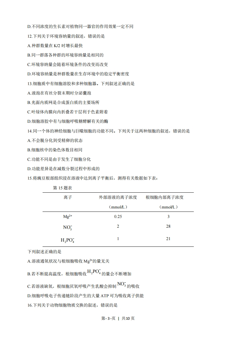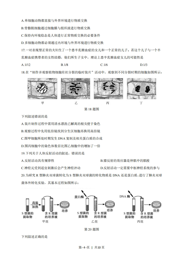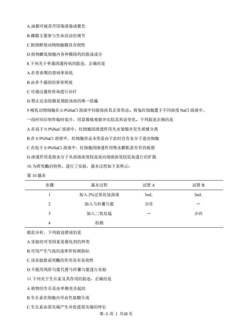 浙江省2019年4月选考科目生物试题一、选择题(本大题共28小题,每小题2分,共56分。每小题列出的四个备选项中只有一个是符合题目要求的,不选、多选、错选均不得分)1.下列关于全球性生态环境问题的叙述,错误的是A.臭氧层能降低太空紫外线对生物的伤害B.人类活动对大量野生生物的灭绝没有影响C.限制二氧化硫和一氧化氮的排放量是防治酸雨的有效措施D.化石燃料的大量燃烧使二氧化碳的全球平衡受到严重干扰2.人类某遗传病的染色体核型如图所示。该变异类型属于女r年iigi超¥¥H9101112h94;8出1314151617184192021A.基因突变B.基因重组C染色体结构变异D.染色体数目变异3细胞学说认为:所有的生物都是由一个或多个细胞组成的:细胞是所有生物的结构和功能的单位:所有的细胞必定是由己存在的细胞产生的。据此分析,下列叙述错误的是A.生物具有多样性B.生物具有遗传性C.生物能定向变异D.生物具有统一性4.下列关于艾滋病的叙述,正确的是A.HV只含有一种蛋白质B.患者的血液和精液中均含有HVC.HV不会感染脑细胞和巨噬细胞D.艾滋病是一种先天性免疫缺陷病5.细胞核中与核糖体形成有关的主要结构是A.核仁B.核基质C.核被膜D核孔复合体6.下列群落中,其植物能通过植株间隔和根系分布以最大限度减少竞争和充分利用水分的是A.荒漠B.苔原C.草原D.森林7.脂质在细胞中具有独特的生物学功能。下列叙述正确的是第-1-页1共10页A.油脂可被苏丹Ⅲ染液染成紫色B.磷脂主要参与生命活动的调节C.胆固醇使动物细胞膜具有刚性D.植物蜡是细胞内各种膜结构的组成成分8.下列关于单基因遗传病的叙述,正确的是A.在青春期的患病率很低B.由多个基因的异常所致C.可通过遗传咨询进行治疗D.禁止近亲结婚是预防该病的唯一措施9.哺乳动物细胞在0.9%NaCI溶液中仍能保持其正常形态。将兔红细胞置于不同浓度NaCI溶液中,一段时间后制作临时装片,用显微镜观察并比较其形态变化。下列叙述正确的是A.在高于0.9%NaC溶液中,红细胞因渗透作用失水皱缩并发生质壁分离B.在0.9%NaCI溶液中,红细胞形态未变是由于此时没有水分子进出细胞C.在低于0.9%NaCl溶液中,红细胞因渗透作用吸水膨胀甚至有的破裂D.渗透作用是指水分子从溶液浓度较高处向溶液浓度较低处进行的扩散10.为研究酶的特性,进行了实验,基本过程如下表所示:第10题表步骤基本过程试管A试管B1加入2%过氧化氢溶液3mL3mL2加入马铃薯匀浆少许-3加入二氧化锰少许4检测据此分析,下列叙述错误的是A.实验的可变因素是催化剂的种类B.可用产生气泡的速率作检测指标C.该实验能说明酶的作用具有高效性D.不能用鸡肝匀浆代替马铃薯匀浆进行实验11.下列关于生长素及其作用的叙述,正确的是A.植物的生长是由单侧光引起的B.生长素在细胞内可由色氨酸合成C.生长素由苗尖端产生并促进苗尖端的伸长第-2-页1共10页D.不同浓度的生长素对植物同一器官的作用效果一定不同12.下列关于环境容纳量的叙述,错误的是A.种群数量在K2时增长最快B.同一群落各种群的环境容纳量是相同的C.环境容纳量会随着环境条件的改变而改变D.环境容纳量是种群数量在生存环境中的稳定平衡密度13.细胞质中有细胞溶胶和多种细胞器。下列叙述正确的是A.液泡在有丝分裂末期时分泌囊泡B.光面内质网是合成蛋白质的主要场所C.叶绿体内膜向内折叠若干层利于色素附着D.细胞溶胶中有与细胞呼吸糖酵解有关的酶14.同一个体的神经细胞与巨噬细胞的功能不同。下列关于这两种细胞的叙述,错误的是A.不会脱分化到受精卵的状态B.细胞核中的染色体数目相同C.功能不同是由于发生了细胞分化D.功能差异是在减数分裂过程中形成的15.将豌豆根部组织浸在溶液中达到离子平衡后,测得有关数据如下表:第15题表离子外部溶液的离子浓度根细胞内部离子浓度(mmol/L)(mmol/LMg2+0.25NOy28H,PO121下列叙述正确的是A.溶液通氧状况与根细胞吸收Mg2+的量无关B,若不断提高温度,根细胞吸收H,PO:的量会不断增加C,若溶液缺氧,根细胞厌氧呼吸产生乳酸会抑制NO的吸收D.细胞呼吸电子传递链阶段产生的大量ATP可为吸收离子供能16.下列关于动物细胞物质交换的叙述,错误的是第-3-页1共10页