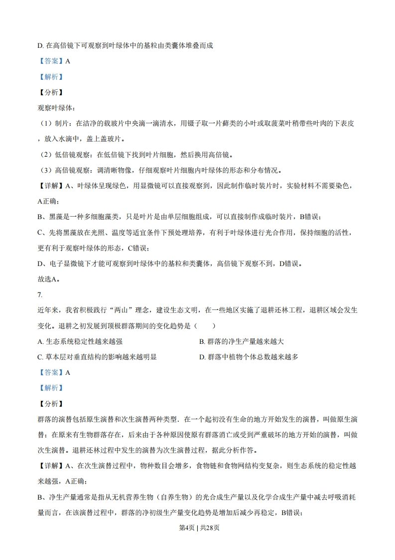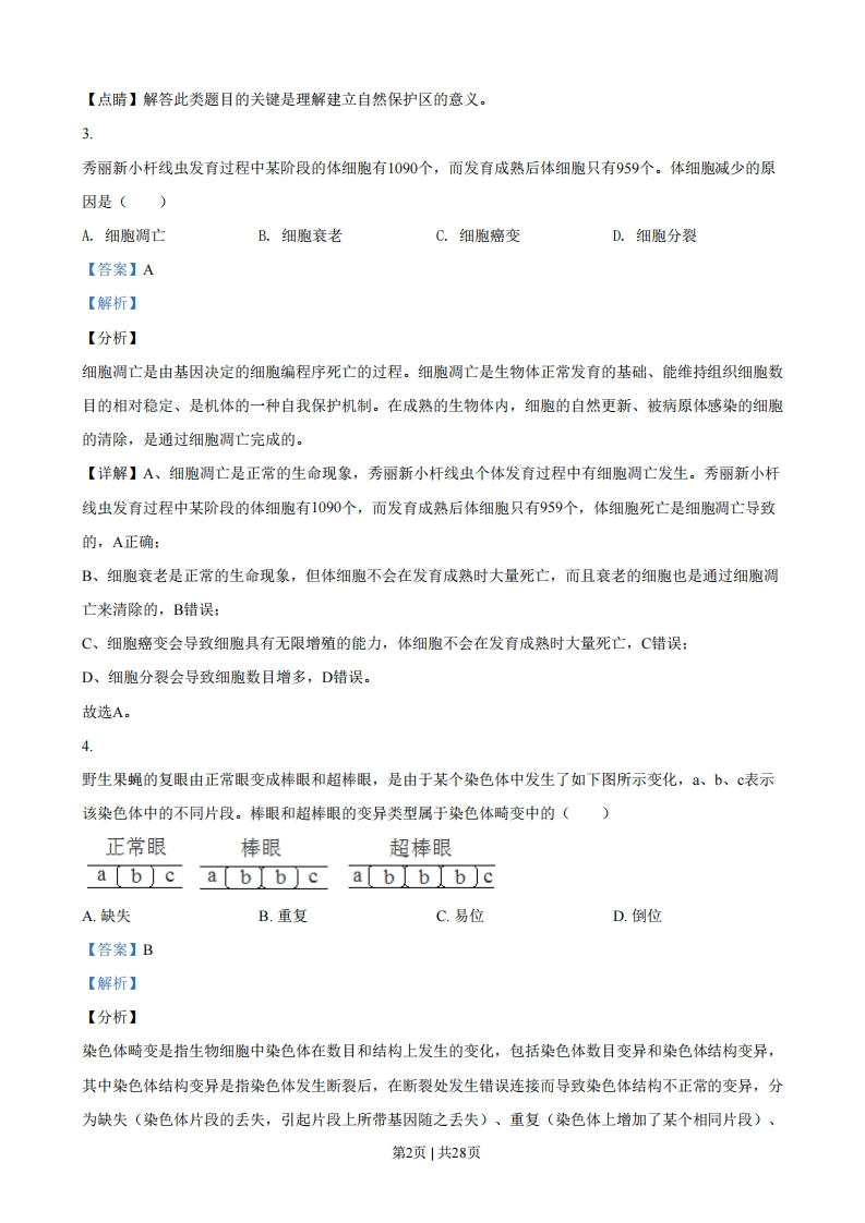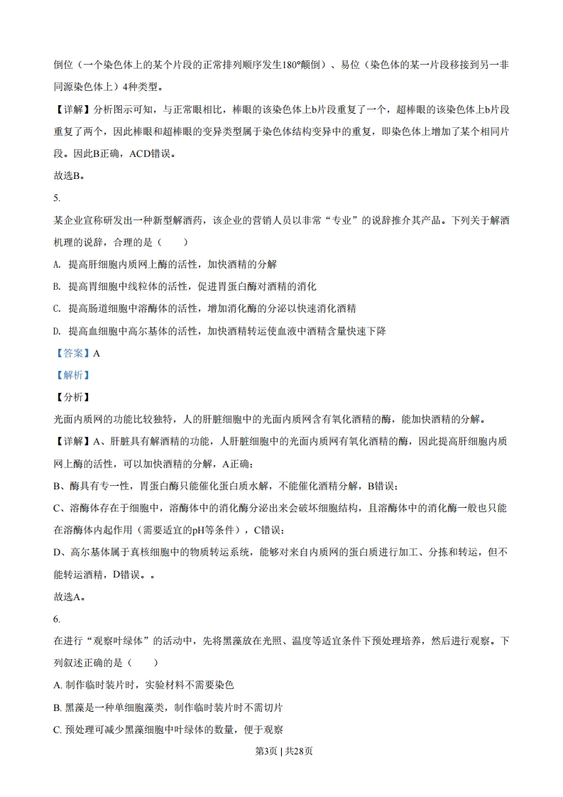 浙江省2021年1月选考生物试题一、选择题(本大题共25小题,每小题2分,共50分。每小题列出的四个备选项中只有一个是符合题目要求的,不选、多选、错选均不得分)1.人类免疫缺陷病毒(HV)引发的疾病是(A.艾滋病B.狂犬病C.禽流感D.非典型肺炎【答案】A【解析】【分析】艾滋病是一种病毒性传染病,是人类感染人类免疫缺陷病毒(HV)后导致免疫缺陷,使人体免疫功能缺损的疾病。【详解】艾滋病是获得性免疫缺陷综合症的简称,按其英文字音(ADS)译为“艾滋病”:艾滋病是一种病毒性疾病,它的致病因素是结构上很相近似的一组病毒,这组病毒被统称为“人类免疫缺陷病毒(HV)”。A正确,BCD错误。故选A。2.我省某国家级自然保护区林木繁茂,自然资源丰富,是高校的野外实习基地。设立该保护区的主要目的是()A.防治酸雨B.保护臭氧层C.治理水体污染D.保护生物多样性【答案】D【解析】【分析】(1)生物多样性通常有三个层次,即遗传多样性、物种多样性和生态系统多样性。(2)保护生物多样性的措施有:一是就地保护,二是迁地保护,三是开展生物多样性保护的科学研究,制定生物多样性保护的法律和政策,开展生物多样性保护方面的宣传和教育,其中就地保护是最有效的保护措施。(3)威胁生物生存的原因有栖息地被破坏、偷猎(滥捕乱杀)、外来物种入侵、环境污染、其他原因等【详解】自然保护区是在原始的自然状态系统中,选择具有代表性的地段,人为地划定一个区域,并采取有效的保护措施,对那里的生态系统加以严格的保护。设立自然保护区是就地保护的具体措施之一,其目的是为了保护生物多样性,D正确。故选D。第1页1共28页【点睛】解答此类题目的关键是理解建立自然保护区的意义。3秀丽新小杆线虫发育过程中某阶段的体细胞有1090个,而发育成熟后体细胞只有959个。体细胞减少的原因是()A.细胞调亡B.细胞衰老C.细胞癌变D.细胞分裂【答案】A【解析】【分析】细胞调亡是由基因决定的细胞编程序死亡的过程。细胞调亡是生物体正常发育的基础、能维持组织细胞数目的相对稳定、是机体的一种自我保护机制。在成熟的生物体内,细胞的自然更新、被病原体感染的细胞的清除,是通过细胞调亡完成的。【详解】A、细胞调亡是正常的生命现象,秀丽新小杆线虫个体发育过程中有细胞调亡发生。秀丽新小杆线虫发育过程中某阶段的体细胞有1090个,而发育成熟后体细胞只有959个,体细胞死亡是细胞调亡导致的,A正确:B、细胞衰老是正常的生命现象,但体细胞不会在发育成熟时大量死亡,而且衰老的细胞也是通过细胞调亡来清除的,B错误:C、细胞癌变会导致细胞具有无限增殖的能力,体细胞不会在发育成熟时大量死亡,C错误:D、细胞分裂会导致细胞数目增多,D错误。故选A。4.野生果蝇的复眼由正常眼变成棒眼和超棒眼,是由于某个染色体中发生了如下图所示变化,、b、c表示该染色体中的不同片段。棒眼和超棒眼的变异类型属于染色体畸变中的()正常眼棒眼超棒眼a b]ca bb]ca[b]b]b]cA.缺失B.重复C.易位D.倒位【答案】B【解析】【分析】染色体畸变是指生物细胞中染色体在数目和结构上发生的变化,包括染色体数目变异和染色体结构变异,其中染色体结构变异是指染色体发生断裂后,在断裂处发生错误连接而导致染色体结构不正常的变异,分为缺失(染色体片段的丢失,引起片段上所带基因随之丢失)、重复(染色体上增加了某个相同片段)、第2页|共28页倒位(一个染色体上的某个片段的正常排列顺序发生180°颠倒)、易位(染色体的某一片段移接到另一非同源染色体上)4种类型。【详解】分析图示可知,与正常眼相比,棒眼的该染色体上片段重复了一个,超棒眼的该染色体上b片段重复了两个,因此棒眼和超棒眼的变异类型属于染色体结构变异中的重复,即染色体上增加了某个相同片段。因此B正确,ACD错误。故选B。5.某企业宣称研发出一种新型解酒药,该企业的营销人员以非常“专业”的说辞推介其产品。下列关于解酒机理的说辞,合理的是()A.提高肝细胞内质网上酶的活性,加快酒精的分解B.提高胃细胞中线粒体的活性,促进胃蛋白酶对酒精的消化C.提高肠道细胞中溶酶体的活性,增加消化酶的分泌以快速消化酒精D.提高血细胞中高尔基体的活性,加快酒精转运使血液中酒精含量快速下降【答案】A【解析】【分析】光面内质网的功能比较独特,人的肝脏细胞中的光面内质网含有氧化酒精的酶,能加快酒精的分解。【详解】A、肝脏具有解酒精的功能,人肝脏细胞中的光面内质网有氧化酒精的酶,因此提高肝细胞内质网上酶的活性,可以加快酒精的分解,A正确:B、酶具有专一性,胃蛋白酶只能催化蛋白质水解,不能催化酒精分解,B错误:C、溶酶体存在于细胞中,溶酶体中的消化酶分泌出来会破坏细胞结构,且溶酶体中的消化酶一般也只能在溶酶体内起作用(需要适宜的H等条件),C错误:D、高尔基体属于真核细胞中的物质转运系统,能够对来自内质网的蛋白质进行加工、分拣和转运,但不能转运酒精,D错误。。故选A。6.在进行“观察叶绿体”的活动中,先将黑藻放在光照、温度等适宜条件下预处理培养,然后进行观察。下列叙述正确的是()A.制作临时装片时,实验材料不需要染色B.黑藻是一种单细胞藻类,制作临时装片时不需切片C.预处理可减少黑藻细胞中叶绿体的数量,便于观察第3页1共28页