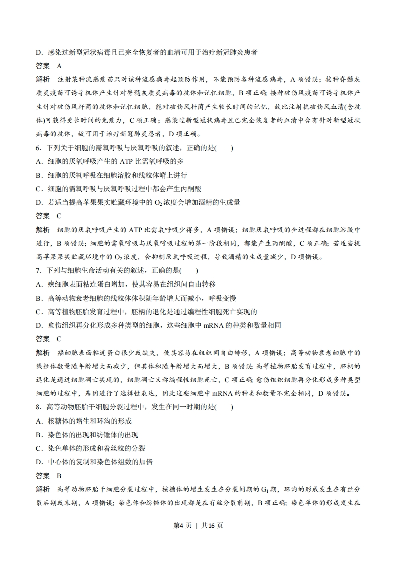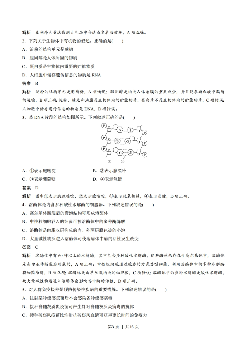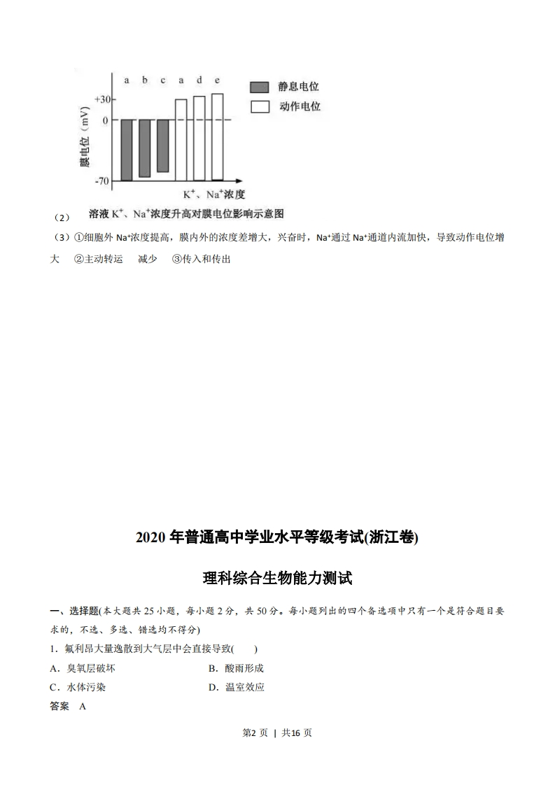 生物试题参考答案一、选择题(本大题共25小题,每小题2分,共50分)1.A2.B3.D4.C5A6.C7.C8.B9.D10.C11.B12.D13.D14.A15.C16.A17.D18.B19.A20.B21.B22.D23.A24.D25.A二、非选择题(本大题共5小题,共50分)26.(1)环境容纳量外源性(2)草本未发生因为生物群落类型没有发生改变(3)施用除草剂生物防治27.(1)质壁分离(2)黄移动速率吸收光谱(3)轻压盖玻片中中期的染色体缩短到最小的程度,最便于观察和研究28.(1)红眼雌性个体中B基因纯合致死X(2)aaXX616/27(3)P灰体红眼雄性个体黑体白眼雌性个体AaxBy十aaxxb配子aaxF1基因型表现型比例灰体红眼灰体白眼黑体红眼黑体白眼雌性个体雄性个体雌性个体雄性个体1:1:1:129.(一)(1)澄清度95%乙醇较小抽滤(2)细菌悬液灭菌较小粘性(二)(1)抗性基因(2)全能性表达充分显微注射(3)短脱分化(4)生长素根的分生组织B30.(1)将神经纤维分别置于K浓度依次提高的生理溶液b、c中,测定其静息电位,并记录。第1页1共16页a b cad e静息电位+30动作电位0-70K、Na浓度(2)溶液Kt、Nat浓度升高对膜电位影响示意图(3)①细胞外Na浓度提高,膜内外的浓度差增大,兴奋时,Na+通过Na+通道内流加快,导致动作电位增大②主动转运减少③传入和传出2020年普通高中学业水平等级考试(浙江卷)理科综合生物能力测试一、选择题(本大题共25小题,每小题2分,共50分。每小题列出的四个备选项中只有一个是符合题日要求的,不选、多选、错选均不得分)1.氟利昂大量逸散到大气层中会直接导致()A.臭氧层破坏B.酸雨形成C.水体污染D.温室效应答案A第2页|共16页解析氣利昂大量逸散到大气层中会造成臭氧层破坏,A项正确。2.下列关于生物体中有机物的叙述,正确的是()A.淀粉的结构单元是蔗糖B.胆固醇是人体所需的物质C.蛋白质是生物体内重要的贮能物质D.人细胞中储存遗传信息的物质是RNA答案B解析淀粉的结构单元是葡萄糖,A项错误:胆固醇是构成人体质膜的重要成分,并且能参与血液中脂质的运输,B项正确:淀粉、糖元和油脂是生物体内的贮能物质,蛋白质不是生物体内的贮能物质,C项错误人细胞中储存遗传信息的物质是DNA,D项错误。3.某DNA片段的结构如图所示。下列叙述正确的是(PoRnOTpDyaro④A.①表示胞嘧啶B.②表示腺嘌呤C.③表示葡萄糖D.④表示氢键答案D解析图中①表示胸腺密啶,②表示胞密啶,③表示脱氧核糖,④表示氢键,D项正确。4.溶酶体是内含多种酸性水解酶的细胞器。下列叙述错误的是()A.高尔基体断裂后的囊泡结构可形成溶酶体B.中性粒细胞吞入的细菌可被溶酶体中的多种酶降解C.溶酶体是由脂双层构成的内、外两层膜包被的小泡D.大量碱性物质进入溶酶体可使溶酶体中酶的活性发生改变答案C解析溶酶体中有60种以上的水解酶,其中包含多种酸性水解酶,这些酶原来存在于高尔基体中,溶酶体是高尔基体断裂后形成的,A项正确:中性粒细胞通过胞吞的方式吞噬细菌,利用溶酶体中的多种水解酶将细菌降解,B项正确:溶酶体是由单层膜构成的细胞器,C项错误溶酶体中的多种水解酶是酸性水解酶,故大量碱性物质进入溶酶体会影响其中酶的活性,D项正确。5.对人群免疫接种是预防传染性疾病的重要措施。下列叙述错误的是()A,注射某种流感疫苗后不会感染各种流感病毒B.接种脊髓灰质炎疫苗可产生针对脊髓灰质炎病毒的抗体C.接种破伤风疫苗比注射抗破伤风血清可获得更长时间的免疫力第3页|共16页