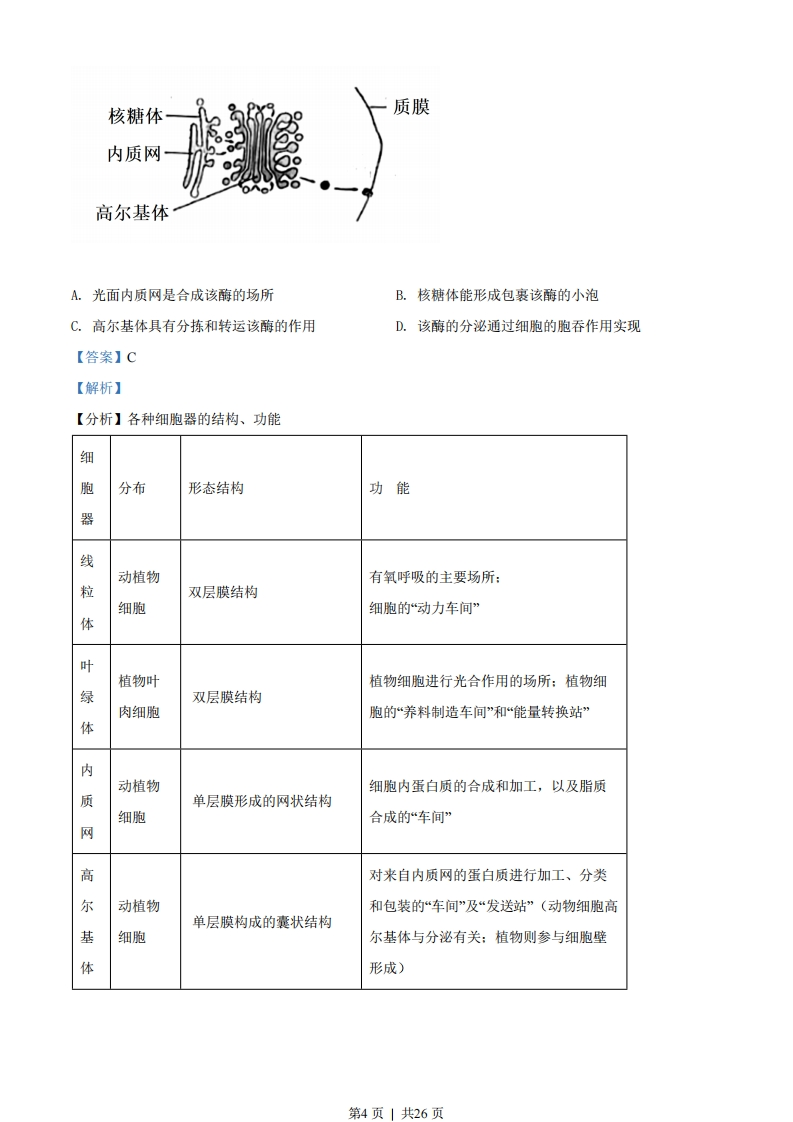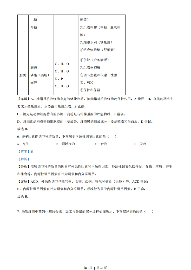 生物试题一、选择题(本大题共25小题,海小题列出的四个备选项中织有一个是符合题目要求的,不选、多选、错选均不得分)1.保护生物多样性是人类关注的问题。下列不属于生物多样性的是()A.物种多样性B.遗传多样性C.行为多样性D.生态系统多样性【答案】C【解析】【分析】生物多样性包括3个层次:遗传多样性(所有生物拥有的全部基因)、物种多样性(指生物圈内所有的动物、植物、微生物)、生态系统多样性。【详解】生物多样性的内容有:遗传多样性、物种多样性和生态系统多样性,ABD正确,C错误。故选C。2.新采摘的柿子常常又硬又涩。若将柿子与成熟的苹果一起放入封闭的容器中,可使其快速变得软而甜。这主要是利用苹果产生的()A.乙烯B.生长素C.脱落酸D.细胞分裂素【答案】A【解析】【分析】植物激素的是指由植物体内产生,能从产生部位运输到作用部位,对植物的生长发育有显著影响的微量有机物。细胞分裂素促进细胞分裂。脱落酸抑制细胞分裂,促进衰老脱落。乙烯促进果实成熟。各种植物激素并不是孤立地起作用,而是多种激素相互作用共同调节。【详解】A、乙烯起催熟作用,成熟的苹果产生乙烯,使柿子“变得软而甜”,A正确:B、生长素类具有促进植物生长的作用,不能催熟,B错误:C、脱落酸有抑制细胞的分裂和种子的萌发,还有促进叶和果实的衰老和脱落,促进休眠和提高抗逆能力等作用,不能催熟,C错误:D、细胞分裂素的作用是促进细跑分裂,不能催熟,D错误。故选A。3.猫叫综合征的病因是人类第五号染色体短臂上的部分片段丢失所致。这种变异属于()A.倒位B.缺失C.重复D.易位【答案】B【解析】【分析】染色体变异是指染色体结构和数目的改变。染色体结构的变异主要有缺失、重复、倒位、易位四种类型。染色体数目变异可以分为两类:一类是细胞内个别染色体的增加或减少,另一类是细胞内染色体数第1页共26页目以染色体组的形式成倍地增加或减少。【详解】由题干描述可知,猫叫综合征是因为染色体缺失了部分片段导致,属于染色体结构变异中的缺失,B正确。故选B。4.下列关于细胞衰老和调亡的叙述,正确的是()A.细胞调亡是受基因调控的B.细胞调亡仅发生于胚胎发育过程中C.人体各组织细胞的衰老总是同步的D.细胞的呼吸速率随细胞衰老而不断增大【答案】A【解析】【分析】1、衰老细胞的特征:(1)细胞内水分减少,细胞萎缩,体积变小,但细胞核体积增大,染色质固缩,染色加深:(2)细胞膜通透性功能改变,物质运输功能降低:(3)细胞色素随着细胞衰老逐渐累积:(4)有些酶的活性降低:(5)呼吸速度减慢,新陈代谢减慢。2、细胞调亡是由基因决定的细胞编程性死亡的过程。细胞调亡是生物体正常的生命历程,对生物体是有利的,而且细胞调亡贯穿于整个生命历程。细胞调亡是生物体正常发育的基础、能维持组织细胞数目的相对稳定、是机体的一种自我保护机制。在成熟的生物体内,细胞的自然更新、被病原体感染的细胞的清除,是通过细胞调亡完成的。【详解】A、细胞调亡是由基因决定的细胞编程性死亡的过程,A正确:B、细胞调亡贯穿于整个生命历程,B错误:C、人体生长发育的不同时期均有细胞的衰老,C错误:D、细胞衰老时呼吸速度减慢,新陈代谢减慢,D错误。故选A。5.生物体中的有机物具有重要作用。下列叙述正确的是()A.油脂对植物细胞起保护作用B.鸟类的羽毛主要由角蛋白组成C.糖元是马铃薯重要的贮能物质D.纤维素是细胞膜的重要组成成分【答案】B【解析】【分析】组成细胞的糖类和脂质:化合分类元素组成主要生理功能物糖类单糖C、H、O①供能(淀粉、糖原、葡萄第2页|共26页二糖糖等)多糖②组成核酸(核糖、脱氧核糖)③细胞识别(糖蛋白)④组成细胞壁(纤维素)①供能(贮备能源)C、H、O脂肪②组成生物膜C、H、O、脂质磷脂(类脂)③调节生殖和代谢(性激N、P固醇素、VD)C、H、O④保护和保温【详解】A、油脂是植物细胞良好的储能物质,植物蜡对植物细胞起保护作用,A错误:B、鸟类的羽毛主要成分是蛋白质,主要由角蛋白组成,B正确:C、糖元是动物细胞特有的多糖,淀粉是马铃薯重要的贮能物质,C错误:D、纤维素是构成植物细胞壁的主要成分,细胞膜的组成成分主要是磷脂和蛋白质,D错误。故选B。6.许多因素能调节种群数量。下列属于内源性调节因素的是()A.寄生B.领域行为C.食物D.天敌【答案】B【解析】【分析】能够调节种群数量的因素有外源性因素和内源性因素,外源性调节包括气候、食物、疾病、寄生和捕食等,内源性调节因素有行为调节和内分泌调节。【详解】ACD、外源性调节包括气候、食物、疾病、寄生和捕食(天地)等,ACD错误:B、内源性调节因素有行为调节和内分泌调节,领域行为属于内源性调节因素,B正确。故选B。7.动物细胞中某消化酶的合成、加工与分泌的部分过程如图所示。下列叙述正确的是()第3页」共26页