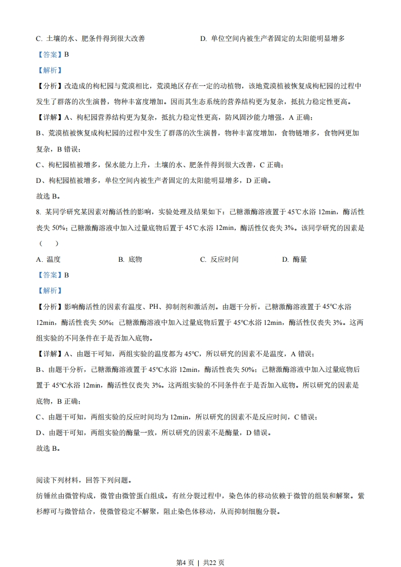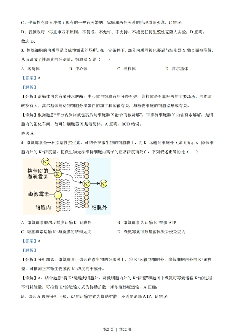 2023年1月浙江省普通高校招生选考科目考试生物学一、选择题(本大题共20小题,每小题2分,共40分。每小题列出的四个备选项中只有一个是符合题目要求的,不选、多选、错选均不得分)1.近百年来,随着大气CO2浓度不断增加,全球变暖加剧。为减缓全球变暖,我国政府提出了“碳达峰”和“碳中和”的CO2排放目标,彰显了大国责任。下列措施不利于达成此目标的是()A.大量燃烧化石燃料B.积极推进植树造林C.大力发展风能发电D.广泛应用节能技术【答案】A【解析】【分析】“碳中和”是指一定时间内C02的排放量与吸收量基本相当,CO2的捕集、利用是实现“碳中和”的重要途径。【详解】A、大量燃烧化石燃料会导致大气中的二氧化碳含量增多,不利于实现碳中和,A符合题意:BCD、积极推进植树造林、大力发展风能发电和广泛应用节能技术都可以减少二氧化碳的排放或增加二氧化碳的吸收利用,利于实现碳中和,BCD不符合题意。故选A。2.以哺乳动物为研究对象的生物技术己获得了长足的进步。对生物技术应用于人类,在安全与伦理方面有不同的观点,下列叙述正确的是()A.试管婴儿技术应全面禁止B.治疗性克隆不需要监控和审查C.生殖性克隆不存在伦理道德方面的风险D.我国不赞成、不允许、不支持、不接受任何生殖性克隆人实验【答案】D【解析】【分析】生殖性克隆是指通过克隆技术产生独立生存的新个体。治疗性克隆是指利用克隆技术产生特定的细胞、组织和器官,用它们来修复或替代受损的细胞、组织和器官,从而达到治疗疾病的目的。两者有着本质的区别。【详解】A、我国政府一再重申四不原则:不赞成、不允许、不支持、不接受任何生殖性克隆人实验,但治疗性克隆可在有效监控和严格审查下实施,A错误:B、我国政府同样重视治疗性克隆所涉及的伦理问题,主张对治疗性克隆进行有效监控和严格审查,B错误:第1页」共22页C、生殖性克隆人冲击了现有的一些有关婚姻、家庭和两性关系的伦理道德观念,C错误:D、我国政府一再重申四不原则:不赞成、不允许、不支持、不接受任何生殖性克隆人实验,D正确。故选D。3.性腺细胞的内质网是合成性激素的场所。在一定条件下,部分内质网被包裹后与细胞器X融合而被降解,从而调节了性激素的分泌量。细胞器X是()A.溶酶体B.中心体C.线粒体D.高尔基体【答案】A【解析】【分析】溶酶体内含有多种水解酶:中心体与细胞有丝分裂有关:线粒体是有氧呼吸的主要场所,与能量转换有关:高尔基体与动物细胞分泌蛋白的加工和运输有关,与植物细胞的细胞壁形成有关。【详解】根据题意“部分内质网被包裹后与细胞器X融合而被降解”,可推测细胞器X内含有水解酶,是细胞内的消化车间,故可知细胞器X是溶酶体,A正确,BCD错误。故选A。4.缬氨霉素是一种脂溶性抗生素,可结合在微生物的细胞膜上,将K+运输到细胞外(如图所示),降低细胞内外的K+浓度差,使微生物无法维持细胞内离子的正常浓度而死亡。下列叙述正确的是()K携带K的缬氨霉素K缬氨霉素细胞内细胞外A.缬氨霉素顺浓度梯度运输K+到膜外B.缬氨霉素为运输K+提供ATPC.缬氨霉素运输K+与质膜的结构无关D.缬氨霉素可致噬菌体失去侵染能力【答案】A【解析】【分析】分析题意:缬氨霉素可结合在微生物的细胞膜上,将K+运输到细胞外,降低细胞内外的K+浓度差,可推测正常微生物膜内K+浓度高于膜外。【详解】A、结合题意“将K+运输到细胞外,降低细胞内外的K+浓差”和题图中缬氨可霉素运输K+的过程不消耗能量,可推测K+的运输方式为协助扩散,顺浓度梯度运输,A正确:B、结合A选项分析可知,K+的运输方式为协助扩散,不需要消耗ATP,B错误:第2页1共22页C、缬氨霉素是一种脂溶性抗生素,能结合在细胞膜上,能在磷脂双子层间移动,该过程与质膜具有一定的流动性这一结构特点有关,C错误:D、噬菌体为DNA病毒,病毒没有细胞结构,故缬氨霉素不会影响噬菌体的侵染能力,D错误。故选A。阅读下列材料,回答下列问题。基因启动子区发生DNA甲基化可导致基因转录沉默。研究表明,某植物需经春化作用才能开花,该植物的DNA甲基化水平降低是开花的前提。用5一zaC处理后,该植株开花提前,检测基因组DNA,发现5胞嘧啶的甲基化水平明显降低,但DNA序列未发生改变,这种低DNA甲基化水平引起的表型改变能传递给后代。5这种DNA甲基化水平改变引起表型改变,属于()A.基因突变B.基因重组C.染色体变异D.表观遗传6.该植物经5一azaC去甲基化处理后,下列各项中会发生显著改变的是()A.基因的碱基数量B.基因的碱基排列顺序C.基因的复制D.基因的转录【答案】5.D6.D【解析】【分析】DNA甲基化是指在DNA甲基化转移酶的作用下,在DNA某些区域结合一个甲基基团。DNA甲基化能引起染色质结构、DNA稳定性及DNA与蛋白质相互作用方式的改变,从而控制基因表达。这种DNA甲基化修饰可以遗传给后代。【5题详解】表观遗传是指DNA序列不发生变化,但基因的表达却发生了可遗传的改变,即基因型未发生变化而表现型却发生了改变,如DNA的甲基化。故选D。【6题详解】甲基化的Lyc基因不能与RNA聚合酶结合,故无法进行转录产生mRNA,也就无法进行翻译最终合成L©yc蛋白,从而抑制了基因的表达。植物经5一azaC去甲基化处理后,基因启动子正常解除基因转录沉默,基因能正常转录产生mRNA。故选D。7.在我国西北某地区,有将荒漠成功改造