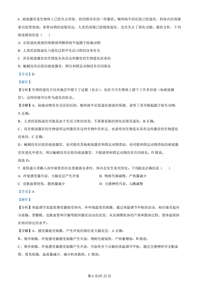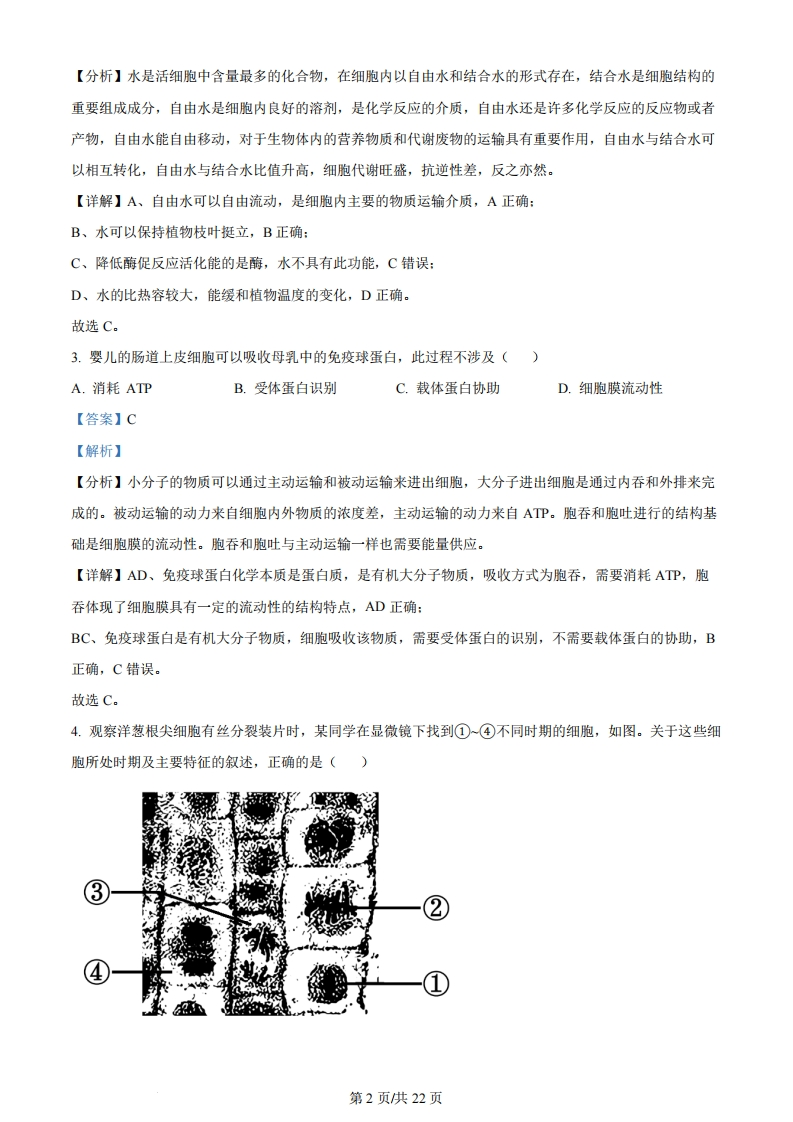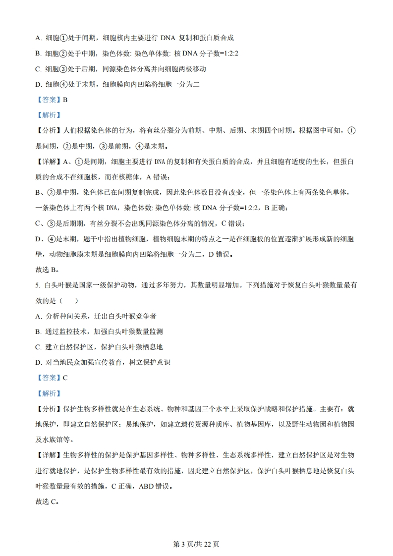 2024年1月浙江省普通高校招生选考科目考试生物学试题考生须知:1.考生答题前,务必将自已的姓名、准考证号用黑色字迹的签字笔或钢笔填写在答题纸上。2.选择题的答案须用2B铅笔将答题纸上对应题目的答案标号涂黑,如要改动,须将原填涂处用橡皮擦净。3.非选择题的答案须用黑色字迹的签字笔或钢笔写在答题纸上相应区域内,作图时可先使用2B铅笔,确定后须用黑色字迹的签字笔或钢笔描黑,答案写在本试题卷上无效。选择题部分一、选择题(本大题共19小题,每小题2分,共38分。每小题列出的四个备选项中只有一个是符合题目要求的,不选、多选、错选均不得分)1.关于生物技术的安全与伦理问题在我国相关法规明令禁止的是()A.试管动物的培育B.转基因食品的生产C.治疗性克隆的研究D.生物武器的发展和生产【答案】D【解析】【分析】1、我国政府一再重申四不原则:不赞成、不允许、不支持、不接受任何生殖性克隆人实验。2、2010年,在第65届联合国大会上,我国政府重申支持《禁止生物武器公约》的宗旨和目标,全面、严格履行公约义务,支持不断加强公约的约束力,并主张全面禁止和彻底销毁生物武器等各类大规模杀伤性武器。【详解】A、试管动物的培育属于胚胎工程,没有禁止,A正确:B、我过目前不反对转基因的食品的生产,B正确:C、中国政府禁止生殖性克隆,支持治疗性克隆,C正确:D、生物武器致病能力强、攻击范围广,世界范围内应全面禁止生物武器,D错误。故选D。2.下列不属于水在植物生命活动中作用的是()A.物质运输的良好介质B.保持植物枝叶挺立C.降低酶促反应活化能D.缓和植物温度变化【答案】C【解析】第1页供22页【分析】水是活细胞中含量最多的化合物,在细胞内以自由水和结合水的形式存在,结合水是细胞结构的重要组成成分,自由水是细胞内良好的溶剂,是化学反应的介质,自由水还是许多化学反应的反应物或者产物,自由水能自由移动,对于生物体内的营养物质和代谢废物的运输具有重要作用,自由水与结合水可以相互转化,自由水与结合水比值升高,细胞代谢旺盛,抗逆性差,反之亦然。【详解】A、自由水可以自由流动,是细胞内主要的物质运输介质,A正确:B、水可以保持植物枝叶挺立,B正确:C、降低酶促反应活化能的是酶,水不具有此功能,C错误:D、水的比热容较大,能缓和植物温度的变化,D正确。故选C。3.婴儿的肠道上皮细胞可以吸收母乳中的免疫球蛋白,此过程不涉及()A.消耗ATPB.受体蛋白识别C.载体蛋白协助D.细胞膜流动性【答案】C【解析】【分析】小分子的物质可以通过主动运输和被动运输来进出细胞,大分子进出细胞是通过内吞和外排来完成的。被动运输的动力来自细胞内外物质的浓度差,主动运输的动力来自ATP。胞吞和胞吐进行的结构基础是细胞膜的流动性。胞吞和胞吐与主动运输一样也需要能量供应。【详解】AD、免疫球蛋白化学本质是蛋白质,是有机大分子物质,吸收方式为胞吞,需要消耗ATP,胞吞体现了细胞膜具有一定的流动性的结构特点,AD正确:BC、免疫球蛋白是有机大分子物质,细胞吸收该物质,需要受体蛋白的识别,不需要载体蛋白的协助,B正确,C错误。故选C。4.观察洋葱根尖细胞有丝分裂装片时,某同学在显微镜下找到①~④不同时期的细胞,如图。关于这些细胞所处时期及主要特征的叙述,正确的是()第2页供22页A.细胞①处于间期,细胞核内主要进行DNA复制和蛋白质合成B.细胞②处于中期,染色体数:染色单体数:核DNA分子数=1:2:2C.细胞③处于后期,同源染色体分离并向细胞两极移动D.细胞④处于末期,细胞膜向内凹陷将细胞一分为二【答案】B【解析】【分析】人们根据染色体的行为,将有丝分裂分为前期、中期、后期、末期四个时期。根据图中可知,①是间期,②是中期,③是前期,④是末期。【详解】A、①是间期,细胞主要进行DNA的复制和有关蛋白质的合成,并且细胞有适度的生长,但蛋白质的合成不在细胞核,而在核糖体,A错误:B、②是中期,染色体己在间期复制完成,因此染色体数目没有改变,但一条染色体上有两条染色单体,一条染色体上有两个核DNA,染色体数:染色单体数:核DNA分子数=122,B正确:C、③是后期期,有丝分裂不会出现同源染色体分离的情况,C错误:D、④是末期,题干中指出植物细胞,植物细胞末期的特点之一是在细胞板的位置逐渐扩展形成新的细胞壁,动物细胞膜末期是细胞膜向内凹陷将细胞一分为二,D错误。故选B。5.白头叶猴是国家一级保护动物,通过多年努力,其数量明显增加。下列措施对于恢复白头叶猴数量最有效的是()A.分析种间关系,迁出白头叶猴竞争者B.通过监控技术,加强白头叶猴数量监测C.建立自然保护区,保护白头叶猴栖息地D.对当地民众加强宣传教育,树立保护意识【答案】C【解析】【分析】保护生物多样性就是在生态系统、物种和基因三个水平上采取保护战略和保护措施。主要有:就地保护,即建立自然保护区:易地保护,如建立遗传资源种质库、植物基因库,以及野生动物园和植物园及水族馆等。【详解】生物多样性的保护是保护基因多样性、物种多样性、生态系统多样性,建立自然保护区是对生物进行就地保护,是保护生物多样性最有效的措施,因此建立自然保护区,保护白头叶猴栖息地是恢复白头叶猴数量最有效的措施,C正确,ABD错误。故选C。第3页供22页