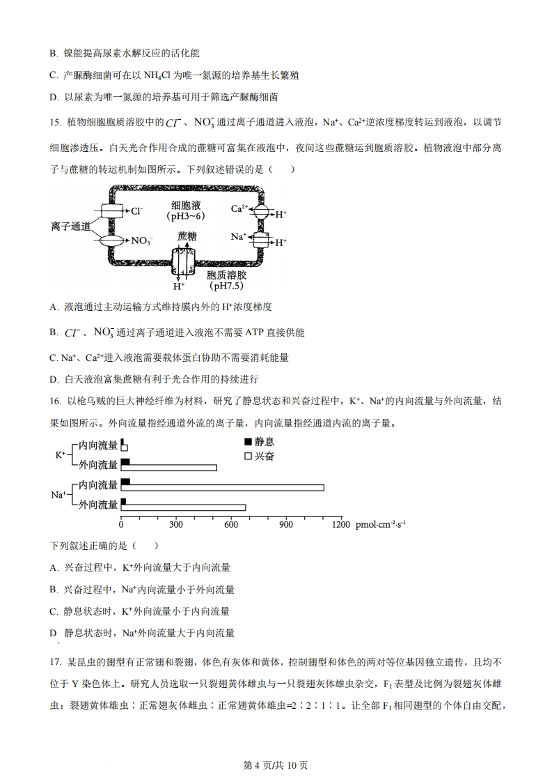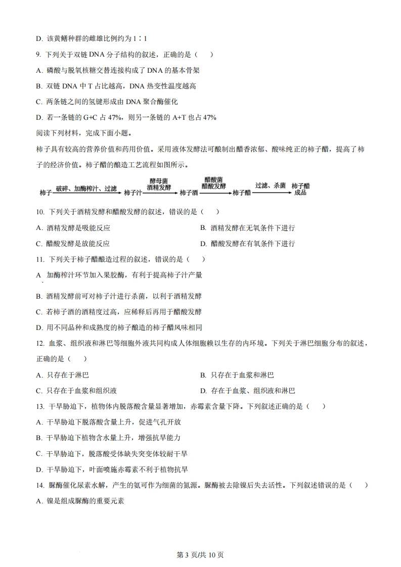 2024年6月浙江省普通高校招生选考科目考试生物学本试题卷分选择题和非选择题两部分,共8页,满分100分,考试时间90分钟考生注意:1,答题前,请务必将自己的姓名、准考证号用黑色字迹的签字笔或钢笔分别填写在试题卷和答题纸规定的位置上。2.答题时,请按照答题纸上“注意事项”的要求,在答题纸相应的位置上规范作答,在本试题卷上的作答一律无效。3。非选择题的答案必须使用黑色字迹的签字笔或钢笔写在答题纸上相应区域内,作图时可先使用2B铅笔,确定后必须使用黑色字迹的签字笔或钢笔描黑。选择题部分一、选择题(本大题共20小题,每小题2分,共40分。每小题列出的四个备选项中只有一个是符合题目要求的,不选,多选、错选均不得分)1.生物多样性是人类赖以生存和发展的基础。下列叙述错误的是()A,在城市动物园饲养濒危动物属于生物多样性的就地保护B.在培育转基因生物时需考虑对生物多样性的影响C.酸雨、全球变暖等生态环境问题会威肋生物多样性D.通过立法、宣传教育,让人们树立起保护生物多样性的意识2.野生型果蝇的复眼为椭圆形,当果蝇X染色体上的16A片段发生重复时,形成棒状的复眼(棒眼),如图所示。T6AT6AT6A野生型棒眼棒眼果蝇X染色体的这种变化属于()A.基因突变B.基因重组C.染色体结构变异D.染色体数目变异3.在酵母菌、植物、昆虫等不同生物类群中,DNA(编码核糖体RNA的基因)的碱基序列大部分是相同的。这一事实为“这些不同生物类群具有共同祖先”的观点提供了()A.化石证据B.比较解剖学证据C.胚胎学证据D.分子水平证据4.同一个体的肝细胞和上皮细胞都会表达一些组织特异性的蛋白质。下列叙述错误的是()A.肝细胞和上皮细胞没有相同的蛋白质B.肝细胞和上皮细胞所含遗传信息相同第1页供10页C.肝细胞的形成是细胞分裂、分化的结果D.上皮细胞的形成与基因选择性表达有关5.在自然界中,群落演替是普遍现象。下列现象不属于群落演替的是()A.裸岩上出现了地衣B.草本群落中出现成片灌木C.灌木群落中长出大量乔木D.常绿阔叶林中樟树明显长高6.细胞是生物体结构和生命活动的基本单位,也是一个开放的系统。下列叙述正确的是()A.细胞可与周围环境交换物质,但不交换能量B.细胞可与周围环境交换能量,但不交换物质C.细胞可与周围环境交换物质,也可交换能量D.细胞不与周围环境交换能量,也不交换物质7.溶酶体内含有多种水解酶,是细胞内大分子物质水解的场所。机体休克时,相关细胞内的溶酶体膜稳定性下降,通透性增高,引发水解酶渗漏到胞质溶胶,造成细胞自溶与机体损伤。下列叙述错误的是()A.溶酶体内的水解酶由核糖体合成B.溶酶体水解产生的物质可被再利用C.水解酶释放到胞质溶胶会全部失活D.休克时可用药物稳定溶酶体膜8.黄鳝从胚胎期到产卵期都是雌性,产卵过后变为雄性。研究人员对洞庭湖周边某水域捕获的1178尾野生黄鳝进行年龄及性别的鉴定,结果如下表。雌性雄性生长期体长(cm)尾数尾数比例(%)尾数比例(%)I龄≤30.065663396.51.2Ⅱ龄30.1-50.051232763.911622.7Ⅲ龄50.155.06233.366.7V龄≥55.100.0100.0下列叙述正确的是()A.该黄鳝种群的年龄结构为衰退型B.种群中雄黄鳝的平均年龄大于雌性C.随年龄增长雄黄鳝数量逐渐增加第2页供10页D.该黄鳝种群的雌雄比例约为1:19.下列关于双链DNA分子结构的叙述,正确的是()A.磷酸与脱氧核糖交替连接构成了DNA的基本骨架B.双链DNA中T占比越高,DNA热变性温度越高C.两条链之间的氢键形成由DNA聚合酶催化D.若一条链的G+C占47%,则另一条链的A+T也占47%阅读下列材料,完成下面小题。柿子具有较高的营养价值和药用价值。采用液体发酵法可酿制出醋香浓郁、酸味纯正的柿子醋,提高了柿子的经济价值。柿子醋的酿造工艺流程如图所示。酵母南醋酸菌柿子破碎、加酶汁、过滤柿子汁酒精发酵醋酸发酵过滤、杀菌柿子醋+柿子酒+柿子醋+成品10.下列关于酒精发酵和醋酸发酵的叙述,错误的是()A.酒精发酵是吸能反应B.酒精发酵在无氧条件下进行C.醋酸发酵是放能反应D.醋酸发酵在有氧条件下进行11.下列关于柿子醋酿造过程的叙述,错误的是()A加酶榨汁环节加入果胶酶,有利于提高柿子汁产量B.酒精发酵前可对柿子汁进行杀菌,以利于酒精发酵C.若柿子酒的酒精度过高,应稀释后再用于醋酸发酵D.用不同品种和成熟度的柿子酿造的柿子醋风味相同12.血浆、组织液和淋巴等细胞外液共同构成人体细胞赖以生存的内环境。下列关于淋巴细胞分布的叙述,正确的是()A.只存在于淋巴B.只存在于血浆和淋巴C.只存在于血浆和组织液D.存在于血浆、组织液和淋巴13.干旱胁迫下,植物体内脱落酸含量显著增加,赤霉素含量下降。下列叙述正确的是()A.干旱胁迫下脱落酸含量上升,促进气孔开放B.干旱胁迫下植物含水量上升,增强抗旱能力C.干旱胁迫下,脱落酸受体缺失突变体较耐干旱D.干旱胁迫下,叶面喷施赤霉素不利于植物抗旱14.脲酶催化尿素水解,产生的氨可作为细菌的氮源。脲酶被去除镍后失去活性。下列叙述错误的是()A.镍是组成脲酶的重要元素第3页供10页