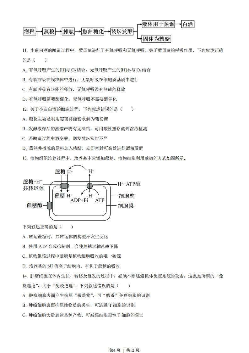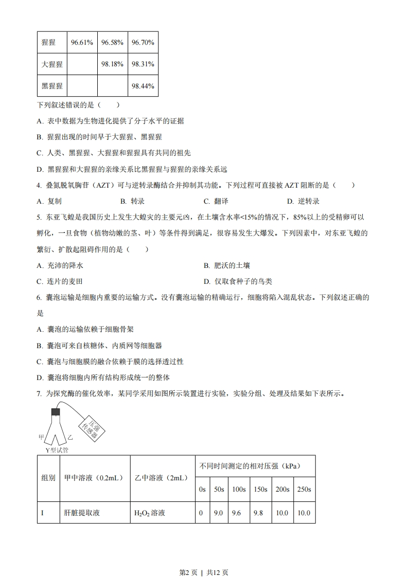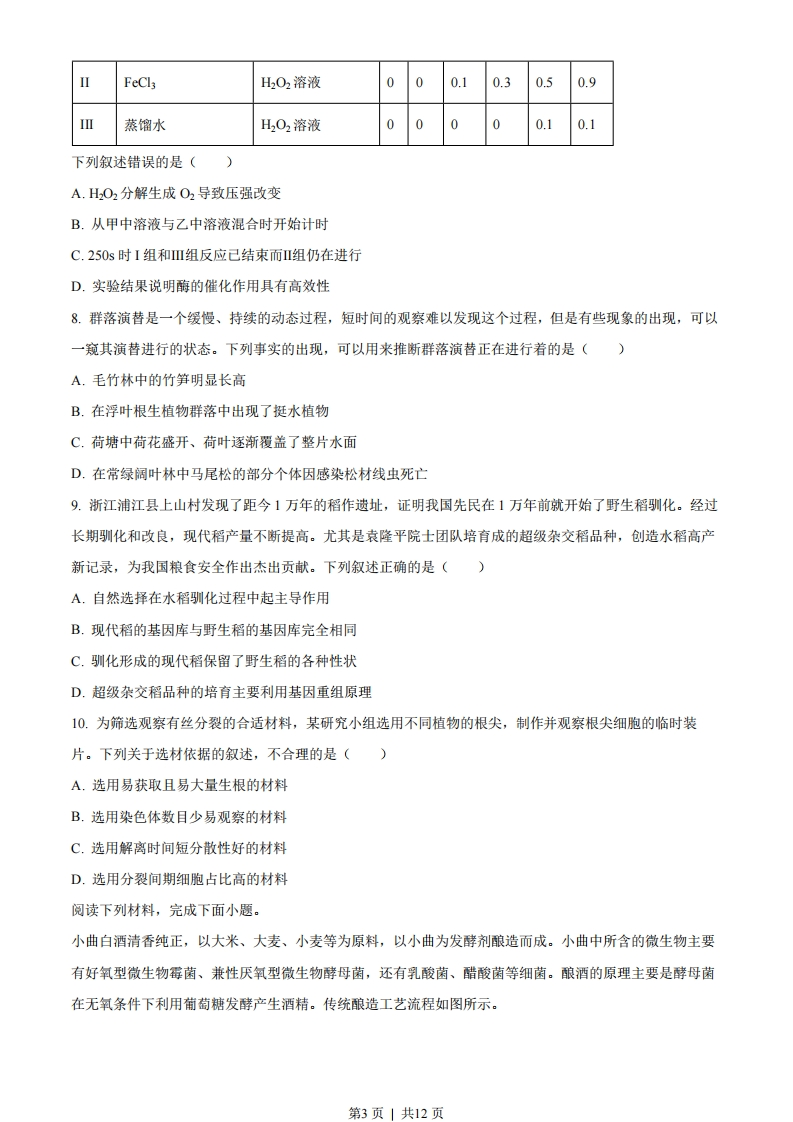 绝密★启用前2023年6月浙江省普通高校招生选考科目考试生物学姓名准考证号本试题卷分选择题和非选择题两部分,共8页,满分100分,考试时间90分钟。考生注意:1.答题前,请务必将自已的姓名、准考证号用黑色字迹的签字笔或钢笔分别填写在试题卷和答题纸规定的位置上。2.答题时,请按照答题纸上“注意事项”的要求,在答题纸相应的位置上规范作答,在本试题卷上的作答一律无效。3.非选择题的答案必须使用黑色字迹的签字笔或钢笔写在答题纸上相应区域内,作图时可先使用2B铅笔,确定后必须使用黑色字迹的签字笔或钢笔描黑。选择题部分一、选择题(本大题共20小题,每小题2分,共40分。每小题列出的四个备选项中只有一个是符合题目要求的,不选、多选、错选均不得分)1.我国科学家在世界上首次人工合成的结晶牛胰岛素,其化学结构和生物活性与天然胰岛素完全相同。结晶牛胰岛素的化学本质是()A.糖类B.脂质C.蛋白质D.核酸2.自从践行生态文明建设以来,“酸雨”在我国发生的频率及强度都有明显下降。下列措施中,对减少“酸雨”发生效果最明显的是()A大力推广风能、光能等绿色能源替代化石燃料B.通过技术升级使化石燃料的燃烧率提高C.将化石燃料燃烧产生的废气集中排放D.将用煤量大的企业搬离城市中心3.不同物种体内会存在相同功能的蛋白质,编码该类蛋白质的DNA序列以大致恒定的速率发生变异。猩猩、大猩猩、黑猩猩和人体内编码某种蛋白质的同源DNA序列比对结果如下表,表中数据表示DNA序列比对碱基相同的百分率。(大猩猩黑猩猩第1页」共12页猩猩96.61%96.58%96.70%大猩猩98.18%98.31%黑猩猩98.44%下列叙述错误的是()A.表中数据为生物进化提供了分子水平的证据B.猩猩出现的时间早于大猩猩、黑猩猩C.人类、黑猩猩、大猩猩和猩猩具有共同的祖先D.黑猩猩和大猩猩的亲缘关系比黑猩猩与猩猩的亲缘关系远4.叠氮脱氧胸苷(AZT)可与逆转录酶结合并抑制其功能。下列过程可直接被AZT阻断的是()A.复制B.转录C.翻译D.逆转录5.东亚飞蝗是我国历史上发生大蝗灾的主要元凶,在土壤含水率<15%的情况下,85%以上的受精卵可以孵化,一旦食物(植物幼嫩的茎、叶)等条件得到满足,很容易发生大爆发。下列因素中,对东亚飞蝗的繁衍、扩散起阻碍作用的是()A.充沛的降水B.肥沃的土壤C.连片的麦田D.仅取食种子的鸟类6.囊泡运输是细胞内重要的运输方式。没有囊泡运输的精确运行,细胞将陷入混乱状态。下列叙述正确的是A.囊泡的运输依赖于细胞骨架B.囊泡可来自核糖体、内质网等细胞器C.囊泡与细胞膜的融合依赖于膜的选择透过性D.囊泡将细胞内所有结构形成统一的整体7.为探究酶的催化效率,某同学采用如图所示装置进行实验,实验分组、处理及结果如下表所示。Y型试管不同时间测定的相对压强(kPa)组别甲中溶液(0.2mL)乙中溶液(2mL)Os50s100s150s200s250s肝脏提取液H202溶液09.09.69.810.010.0第2页」共12页FeCl3H2O2溶液000.10.30.50.9蒸馏水H2O2溶液00000.10.1下列叙述错误的是()A.H202分解生成O2导致压强改变B.从甲中溶液与乙中溶液混合时开始计时C.250s时I组和Ⅲ组反应己结束而Ⅱ组仍在进行D.实验结果说明酶的催化作用具有高效性8.群落演替是一个缓慢、持续的动态过程,短时间的观察难以发现这个过程,但是有些现象的出现,可以一窥其演替进行的状态。下列事实的出现,可以用来推断群落演替正在进行着的是()A.毛竹林中的竹笋明显长高B.在浮叶根生植物群落中出现了挺水植物C.荷塘中荷花盛开、荷叶逐渐覆盖了整片水面D.在常绿阔叶林中马尾松的部分个体因感染松材线虫死亡9.浙江浦江县上山村发现了距今1万年的稻作遗址,证明我国先民在1万年前就开始了野生稻驯化。经过长期驯化和改良,现代稻产量不断提高。尤其是袁隆平院士团队培育成的超级杂交稻品种,创造水稻高产新记录,为我国粮食安全作出杰出贡献。下列叙述正确的是()A.自然选择在水稻驯化过程中起主导作用B.现代稻的基因库与野生稻的基因库完全相同C.驯化形成的现代稻保留了野生稻的各种性状D.超级杂交稻品种的培育主要利用基因重组原理10.为筛选观察有丝分裂的合适材料,某研究小组选用不同植物的根尖,制作并观察根尖细胞的临时装片。下列关于选材依据的叙述,不合理的是()A.选用易获取且易大量生根的材料B.选用染色体数目少易观察的材料C.选用解离时间短分散性好的材料D.选用分裂间期细胞占比高的材料阅读下列材料,完成下面小题。小曲白酒清香纯正,以大米、大麦、小麦等为原料,以小曲为发酵剂酿造而成。小曲中所含的微生物主要有好氧型微生物霉菌、兼性厌氧型微生物酵母菌,还有乳酸菌、醋酸菌等细菌。酿酒的原理主要是酵母菌在无氧条件下利用葡萄糖发酵产生酒精。传统酿造工艺流程如图所示。第3页」共12页