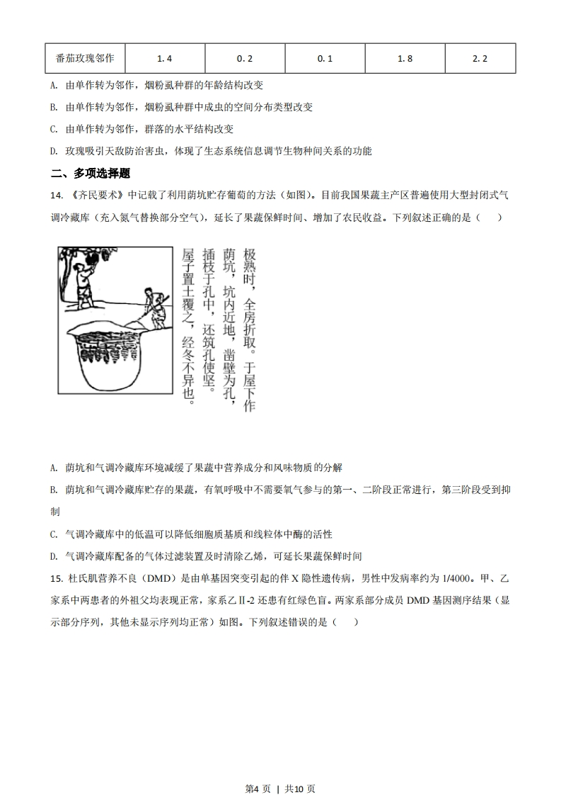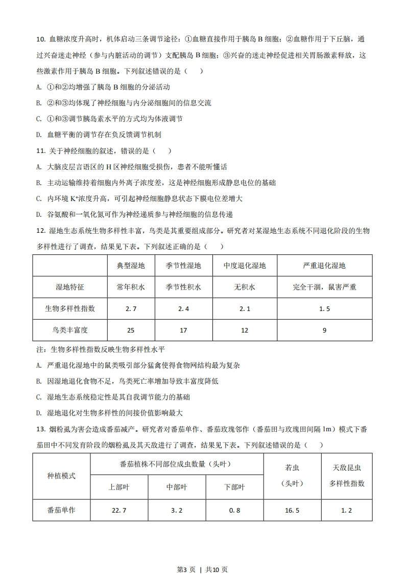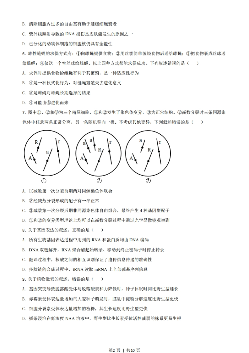2021年河北省普通高中学业水平选择性考试生物一、单项选择题1.下列叙述正确的是()A.酵母菌和白细胞都有细胞骨架B.发菜和水绵都有叶绿体C.颤藻、伞藻和小球藻都有细胞核D.黑藻、根瘤菌和草履虫都有细胞壁2.关于细胞核的叙述,错误的是()A.有丝分裂过程中,核膜和核仁周期性地消失和重现B.蛋白质合成活跃的细胞,核仁代谢活动旺盛C.许多对基因表达有调控作用的蛋白质在细胞质合成,经核孔进入细胞核D.细胞质中的RNA均在细胞核合成,经核孔输出3.关于生物学实验的叙述,错误的是()A.NaOH与CuSO4配合使用在还原糖和蛋白质检测实验中作用不同B.染色质中的DNA比裸露的DNA更容易被甲基绿着色C.纸层析法分离叶绿体色素时,以多种有机溶剂的混合物作为层析液D.利用取样器取样法调查土壤小动物的种类和数量,推测土壤动物的丰富度4.人体成熟红细胞能够运输O2和CO2,其部分结构和功能如图,①⑤表示相关过程。下列叙述错误的是()H205气体A(①葡萄糖Na●●●气体BATP+ADP+Pi(G②糖蛋白A.血液流经肌肉组织时,气体A和B分别是CO2和O2B.①和②是自由扩散,④和⑤是协助扩散C.成熟红细胞通过无氧呼吸分解葡萄糖产生ATP,为③提供能量D.成熟红细胞表面的糖蛋白处于不断流动和更新中5.关于细胞生命历程的叙述,错误的是()A.细胞凋亡过程中不需要新合成蛋白质第1页|共10页B.清除细胞内过多的自由基有助于延缓细胞衰老C.紫外线照射导致的DNA损伤是皮肤癌发生的原因之一D.己分化的动物体细跑的细胞核仍具有全能性6.雄性缝蝇的求偶方式有:①向雌蝇提供食物:②用丝缕简单缠绕食物后送给雌蝇:③把食物裹成丝球送给雌蝇:④仅送一个空丝球给雌蝇。以上四种方式都能求偶成功。下列叙述错误的是()A.求偶时提供食物给雌蝇有利于其繁殖,是一种适应性行为B.④是一种仪式化行为,对缝蝇繁殖失去进化意义C.③是雌蝇对雄蝇长期选择的结果D.④可能由③进化而来7.图中①、②和③为三个精原细跑,①和②发生了染色体变异,③为正常细胞。②减数分裂时三条同源染色体中任意两条正常分离,另一条随机移向一极。不考虑其他变异,下列叙述错误的是()①②③A.①减数第一次分裂前期两对同源染色体联会B.②经减数分裂形成的配子有一半正常C.③减数第一次分裂后期非同源染色体自由组合,最终产生4种基因型配子D.①和②的变异类型理论上均可以在减数分裂过程中通过光学显微镜观察到8.关于基因表达的叙述,正确的是()A.所有生物基因表达过程中用到的RNA和蛋白质均由DNA编码B.DNA双链解开,RNA聚合酶起始转录、移动到终止密码子时停止转录C.翻译过程中,核酸之间的相互识别保证了遗传信息传递的准确性D.多肽链的合成过程中,tRNA读取mRNA上全部碱基序列信息9.关于植物激素的叙述,错误的是()A.基因突变导致脱落酸受体与脱落酸亲和力降低时,种子休眠时间比野生型延长B.赤霉素受体表达量增加的大麦种子萌发时,胚乳中淀粉分解速度比野生型更快C.细胞分裂素受体表达量增加的植株,其生长速度比野生型更快D.插条浸泡在低浓度NAA溶液中,野生型比生长素受体活性减弱的株系更易生根第2页|共10页10.血糖浓度升高时,机体启动三条调节途径:①血糖直接作用于胰岛B细胞:②血糖作用于下丘脑,通过兴奋迷走神经(参与内脏活动的调节)支配胰岛B细胞:③兴奋的迷走神经促进相关胃肠激素释放,这些激素作用于胰岛B细胞。下列叙述错误的是()A.①和②均增强了胰岛B细胞的分泌活动B.②和③均体现了神经细胞与内分泌细胞间的信息交流C.①和③调节胰岛素水平的方式均为体液调节D.血糖平衡的调节存在负反馈调节机制11.关于神经细胞的叙述,错误的是()A.大脑皮层言语区的H区神经细胞受损伤,患者不能听懂话B.主动运输维持着细胞内外离子浓度差,这是神经细胞形成静息电位的基础C.内环境K+浓度升高,可引起神经细胞静息状态下膜电位差增大D.谷氨酸和一氧化氮可作为神经递质参与神经细胞的信息传递12.湿地生态系统生物多样性丰富,鸟类是其重要组成部分。研究者对某湿地生态系统不同退化阶段的生物多样性进行了调查,结果见下表。下列叙述正确的是(典型湿地季节性湿地中度退化湿地严重退化湿地湿地特征常年积水季节性积水无积水完全干涸,鼠害严重生物多样性指数2.72.42.11.5鸟类丰富度2517129注:生物多样性指数反映生物多样性水平A.严重退化湿地中的鼠类吸引部分猛禽使得食物网结构最为复杂B.因湿地退化食物不足,鸟类死亡率增加导致丰富度降低C.湿地生态系统稳定性是其自我调节能力的基础D.湿地退化对生物多样性的间接价值影响最大13.烟粉虱为害会造成番茄减产。研究者对番茄单作、番茄玫瑰邻作(番茄田与玫瑰田间隔1m)模式下番茄田中不同发育阶段的烟粉虱及其天敌进行了调查,结果见下表。下列叙述错误的是()番茄植株不同部位成虫数量(头叶)若虫天敌昆虫种植模式上部叶中部叶下部叶(头叶)多样性指数番茄单作22.73.20.816.51.2第3页|共10页