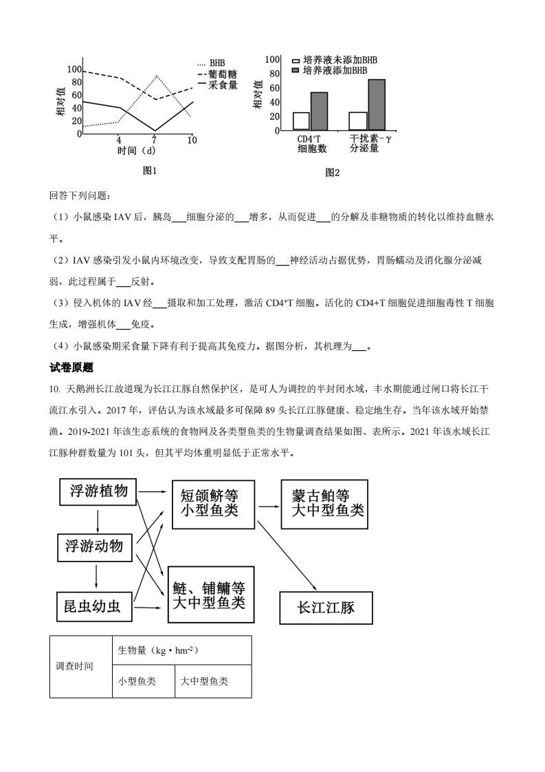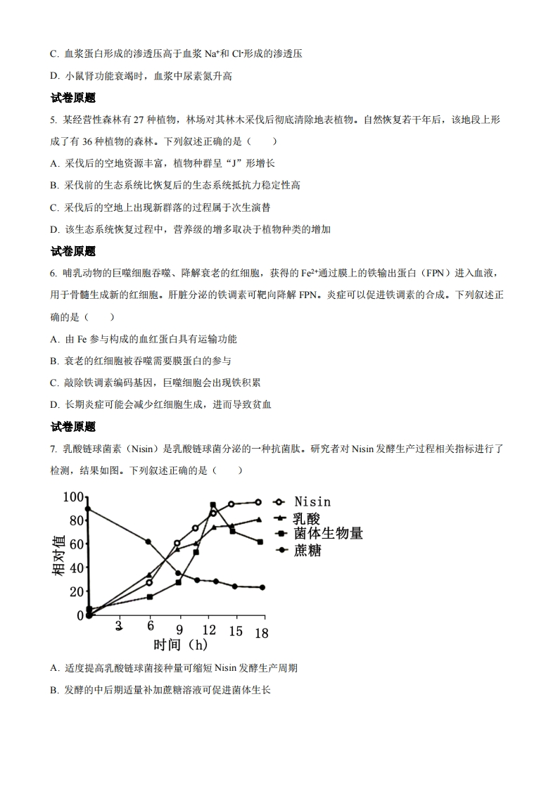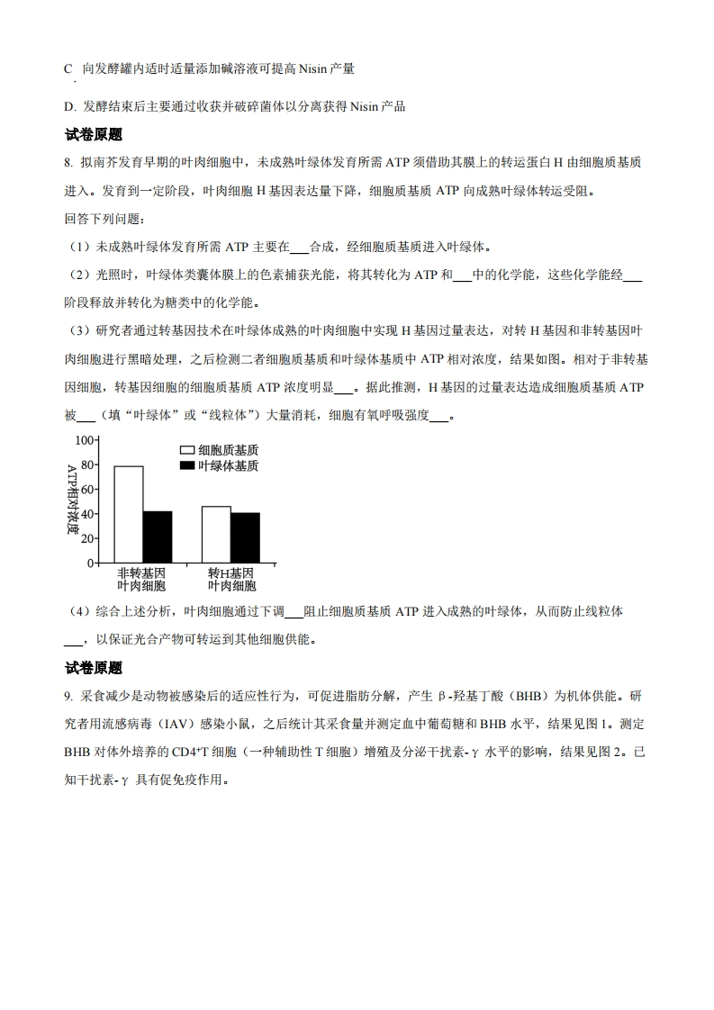 解题精选试卷原题1.大量证据表明,地球上所有细胞生命具有共同祖先。下列可推断出此观点的证据是()A.蝙蝠和蜻蜓都有适应飞翔的器官B.猫的前肢和鲸的鳍都有相似的骨骼结构C.人和鱼的胚胎发育早期都有鳃裂D.真核生物和原核生物的遗传物质都是DNA试卷原题2.某单基因遗传病的系谱图如下,其中Ⅱ3不携带该致病基因。不考虑基因突变和染色体变异。下列分析错误的是(正常男性正常女性男性患者女性患者A.若该致病基因位于常染色体,Ⅲ1与正常女性婚配,子女患病概率相同B.若该致病基因位于性染色体,Ⅲ1患病的原因是性染色体间发生了交换C.若该致病基因位于性染色体,Ⅲ1与正常女性婚配,女儿的患病概率高于儿子D.Ⅲ-3与正常男性婚配,子代患病的概率为12试卷原题3.关于基因、DNA、染色体和染色体组的叙述,正确的是()A.等位基因均成对排布在同源染色体上B.双螺旋DNA中互补配对的碱基所对应的核苷酸方向相反C.染色体的组蛋白被修饰造成的结构变化不影响基因表达D.一个物种的染色体组数与其等位基因数一定相同试卷原题4.小鼠注射某药物造成肾功能异常,尿中出现大量蛋白质,血浆蛋白减少。下列叙述错误的是()A.血浆蛋白丢失可造成血液中抗体减少,机体免疫力下降B.血浆蛋白减少造成血浆渗出至组织液的水增多C.血浆蛋白形成的渗透压高于血浆Na*和C形成的渗透压D.小鼠肾功能衰竭时,血浆中尿素氮升高试卷原题5.某经营性森林有27种植物,林场对其林木采伐后彻底清除地表植物。自然恢复若干年后,该地段上形成了有36种植物的森林。下列叙述正确的是()A.采伐后的空地资源丰官,植物种群呈“J”形增长B.采伐前的生态系统比恢复后的生态系统抵抗力稳定性高C.采伐后的空地上出现新群落的过程属于次生演替D.该生态系统恢复过程中,营养级的增多取决于植物种类的增加试卷原题6.哺乳动物的巨噬细胞吞噬、降解衰老的红细胞,获得的F©2+通过膜上的铁输出蛋白(FPN)进入血液,用于骨髓生成新的红细胞。肝脏分泌的铁调素可靶向降解FPN。炎症可以促进铁调素的合成。下列叙述正确的是()A.由Fe参与构成的血红蛋白具有运输功能B.衰老的红细胞被吞噬需要膜蛋白的参与C.敲除铁调素编码基因,巨噬细胞会出现铁积累D.长期炎症可能会减少红细胞生成,进而导致贫血试卷原题7.乳酸链球菌素(Nisin)是乳酸链球菌分泌的一种抗菌肽。研究者对Nisin发酵生产过程相关指标进行了检测,结果如图。下列叙述正确的是()1001Nisin80乳酸菌体生物量◆蔗糖4020069121518时间(h)A.适度提高乳酸链球菌接种量可缩短Nisin发酵生产周期B.发酵的中后期适量补加蔗糖溶液可促进菌体生长C向发酵罐内适时适量添加碱溶液可提高Nisin产量D.发酵结束后主要通过收获并破碎菌体以分离获得Nisi产品试卷原题8.拟南芥发育早期的叶肉细胞中,未成熟叶绿体发育所需ATP须借助其膜上的转运蛋白H由细胞质基质进入。发育到一定阶段,叶肉细胞H基因表达量下降,细胞质基质ATP向成熟叶绿体转运受阻。回答下列问题:(1)未成熟叶绿体发育所需ATP主要在合成,经细胞质基质进入叶绿体。(2)光照时,叶绿体类囊体膜上的色素捕获光能,将其转化为AP和中的化学能,这些化学能经阶段释放并转化为糖类中的化学能。(3)研究者通过转基因技术在叶绿体成熟的叶肉细胞中实现H基因过量表达,对转H基因和非转基因叶肉细胞进行黑暗处理,之后检测二者细胞质基质和叶绿体基质中ATP相对浓度,结果如图。相对于非转基因细胞,转基因细胞的细胞质基质ATP浓度明显。据此推测,H基因的过量表达造成细胞质基质ATP被(填“叶绿体”或“线粒体”)大量消耗,细胞有氧呼吸强度。100口细胞质基质,80■叶绿体基质6040200-非转基因转H基因叶肉细胞叶肉细胞(4)综合上述分析,叶肉细胞通过下调阻止细胞质基质AP进入成熟的叶绿体,从而防止线粒体以保证光合产物可转运到其他细胞供能。试卷原题9.采食减少是动物被感染后的适应性行为,可促进脂肪分解,产生B羟基丁酸(BHB)为机体供能。研究者用流感病毒(IAV)感染小鼠,之后统计其采食量并测定血中葡萄糖和BHB水平,结果见图1。测定BHB对体外培养的CD4+T细胞(一种辅助性T细胞)增殖及分泌干扰素-Y水平的影响,结果见图2。己知干扰素.Y具有促免疫作用。