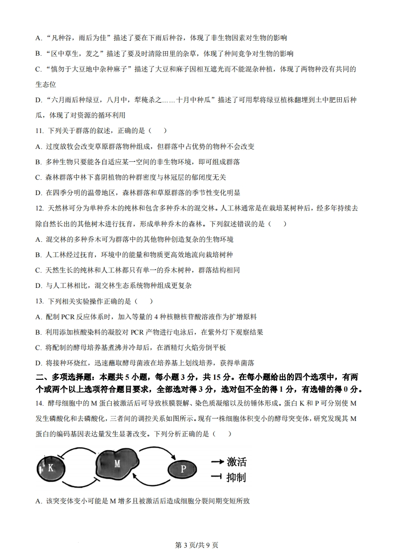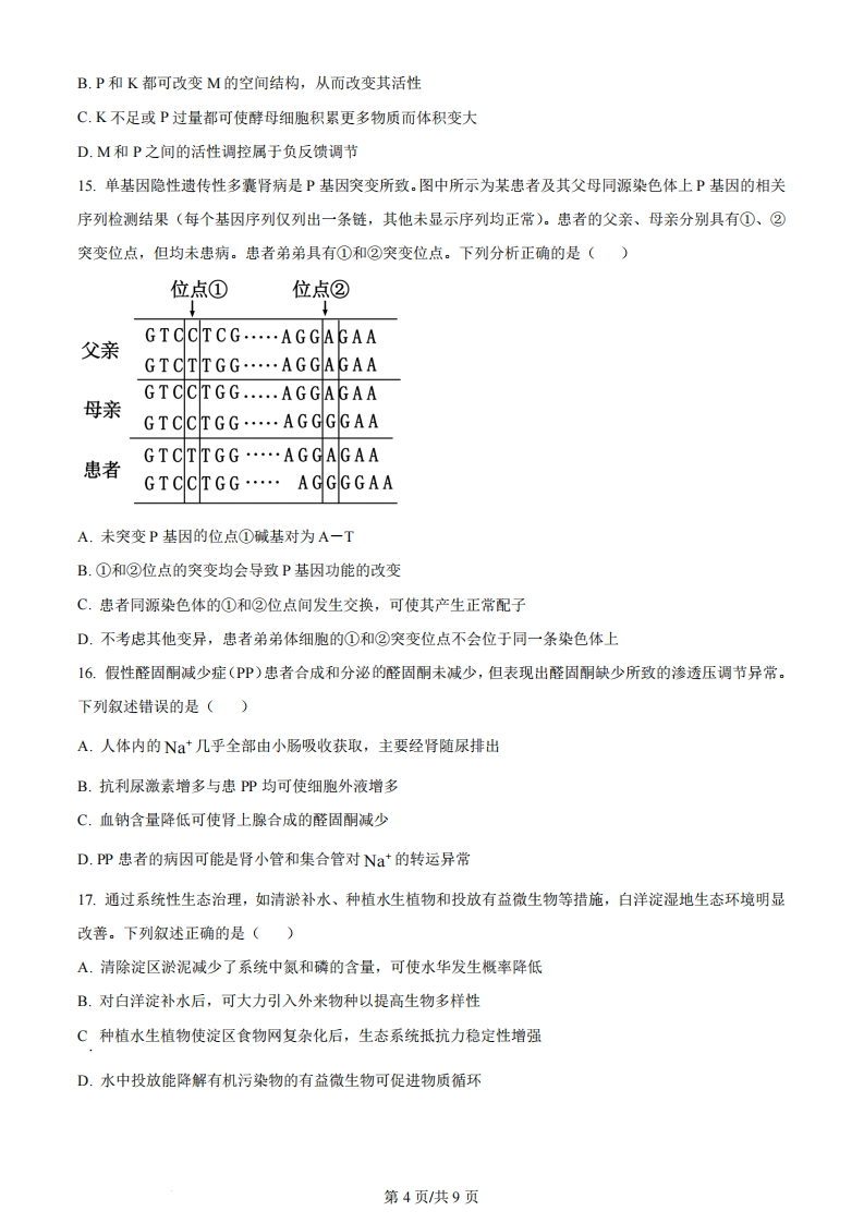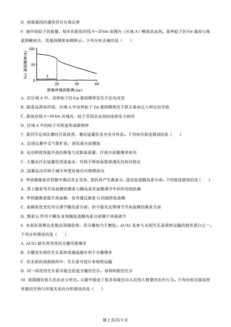2024年普通高中学业水平选择性考试(河北卷)生物学本试卷共100分,考试时间75分钟。一、单项选择题:本题共13小题,每小题2分,共26分。在每小题给出的四个选项中,只有一项是符合题目要求的。1.细胞内不具备运输功能的物质或结构是()A.结合水B.囊泡C.细胞骨架D.tRNA2.下列关于酶的叙述,正确的是()A.作为生物催化剂,酶作用的反应物都是有机物B.胃蛋白酶应在酸性、37℃条件下保存C.醋酸杆菌中与发酵产酸相关的酶,分布于其线粒体内膜上D.从成年牛、羊等草食类动物的肠道内容物中可获得纤维素酶3.核DNA受到损伤时ATM蛋白与受损部位结合,被激活后参与DNA修复,同时可诱导抗氧化酶基因H的表达。下列分析错误的是()A.细胞在修复受损的DNA时,抗氧化能力也会提高B.ATM在细胞质合成和加工后,经核孔进入细胞核发挥作用C.H蛋白可减缓氧化产生的自由基导致的细胞衰老D.ATM基因表达增强的个体受辐射后更易患癌4.下列关于DNA复制和转录的叙述,正确的是()A.DNA复制时,脱氧核苷酸通过氢键连接成子链B.复制时,解旋酶使DNA双链由5端向3'端解旋C.复制和转录时,在能量的驱动下解旋酶将DNA双链解开D.DNA复制合成的子链和转录合成的RNA延伸方向均为由5端向3端5.某病毒具有蛋白质外壳,其遗传物质的碱基含量如表所示,下列叙述正确的是()碱基种类ACG含量(%)31.220.828.0020.0A.该病毒复制合成的互补链中G十C含量为51.2%B.病毒的遗传物质可能会引起宿主DNA变异C.病毒增殖需要的蛋白质在自身核糖体合成第1页共9页D.病毒基因的遗传符合分离定律6.地中海蚊子的数量,每年在距海岸线0~20km范围内(区域A)喷洒杀虫剂。某种蚊子的Est基因与毒素降解相关,其基因频率如图所示。下列分析正确的是()1001500204060距海岸线的距离(km)A.在区域A中,该种蚊子的Es基因频率发生不定向改变B.随着远离海岸线,区域A中该种蚊子Es基因频率的下降主要由迁入和迁出导致C.距海岸线0~60km区域内,蚊子受到杀虫剂的选择压力相同D.区域A中的蚊子可快速形成新物种7.某同学足球比赛时汗流浃背,赛后适量饮水并充分休息。下列相关叙述错误的是()A.足球比赛中支气管扩张,消化液分泌增加B.运动所致体温升高的恢复与皮肤血流量、汗液分泌量增多相关C.大量出汗后适量饮用淡盐水,有助于维持血浆渗透压的相对稳定D.适量运动有助于减少和更好地应对情绪波动8.甲状腺激素在肝脏中激活其阝受体,使机体产生激素G,进而促进胰岛素分泌。下列叙述错误的是()A.肾上腺素等升高血糖的激素与胰岛素在血糖调节中的作用相抗衡B.甲状腺激素能升高血糖,也可通过激素G间接降低血糖C.血糖浓度变化可以调节胰岛素分泌,但不能负反馈调节升高血糖的激素分泌D.激素G作用于胰岛B细胞促进胰岛素分泌属于体液调节9.水稻在苗期会表现出顶端优势,其分蘖相当于侧枝。AUX1是参与水稻生长素极性运输的载体蛋白之一。下列分析错误的是()A.AUX1缺失突变体的分蘖可能增多B.分蘖发生部位生长素浓度越高越有利于分蘖增多C.在水稻的成熟组织中,生长素可进行非极性运输D.同一浓度的生长素可能会促进分蘖的生长,却抑制根的生长10.我国拥有悠久的农业文明史。古籍中描述了很多体现劳动人民伟大智慧的农作行为。下列对相关描述所体现的生物与环境关系的分析错误的是()第2页共9页A.“凡种谷,雨后为佳”描述了要在下雨后种谷,体现了非生物因素对生物的影响B.“区中草生,茇之”描述了要及时清除田里的杂草,体现了种间竞争对生物的影响C.“慎勿于大豆地中杂种麻子”描述了大豆和麻子因相互遮光而不能混杂种植,体现了两物种没有共同的生态位D.“六月雨后种绿豆,八月中,犁稹杀之..十月中种瓜”描述了可用犁将绿豆植株翻埋到土中肥田后种瓜,体现了对资源的循环利用11.下列关于群落的叙述,正确的是()A.过度放牧会改变草原群落物种组成,但群落中占优势的物种不会改变B.多种生物只要能各自适应某一空间的非生物环境,即可组成群落C.森林群落中林下喜阴植物的种群密度与林冠层的郁闭度无关D.在四季分明的温带地区,森林群落和草原群落的季节性变化明显12.天然林可分为单种乔木的纯林和包含多种乔木的混交林。人工林通常是在栽培某树种后,经多年持续去除自然长出的其他树木进行抚育,形成单种乔木的森林。下列叙述错误的是()A.混交林的多种乔木可为群落中的其他物种创造复杂的生物环境B.人工林经过抚育,环境中的能量和物质更高效地流向栽培树种C.天然生长的纯林和人工林都只有单一的乔木树种,群落结构相同D.与人工林相比,混交林生态系统物种组成更复杂13.下列相关实验操作正确的是()A.配制PCR反应体系时,加入等量的4种核糖核苷酸溶液作为扩增原料B.利用添加核酸染料的凝胶对P℃R产物进行电泳后,在紫外灯下观察结果C.将配制的酵母培养基煮沸并冷却后,在酒精灯火焰旁倒平板D.将接种环烧红,迅速蘸取酵母菌液在培养基上划线培养,获得单菌落二、多项选择题:本题共5小题,每小题3分,共15分。在每小题给出的四个选项中,有两个或两个以上选项符合题目要求,全部选对得3分,选对但不全的得1分,有选错的得0分。14.酵母细胞中的M蛋白被激活后可导致核膜裂解、染色质凝缩以及纺锤体形成。蛋白K和P可分别使M发生磷酸化和去磷酸化,三者间的调控关系如图所示。现有一株细胞体积变小的酵母突变体,研究发