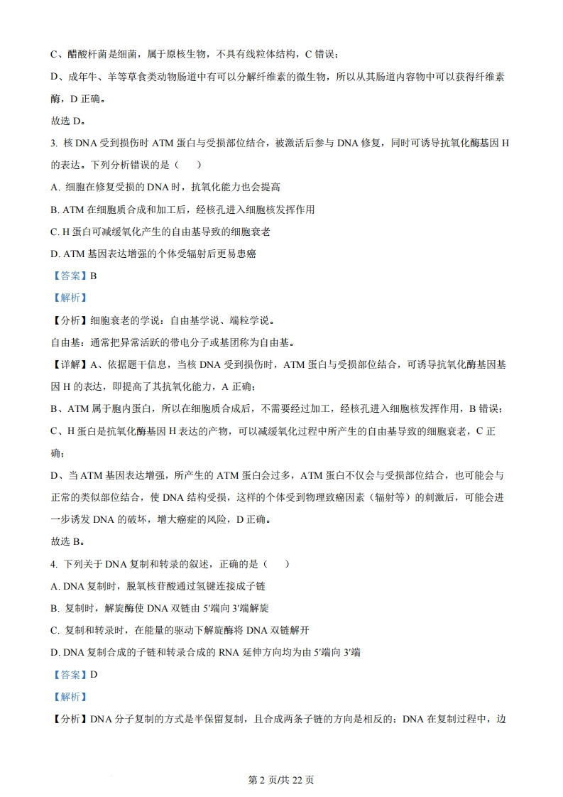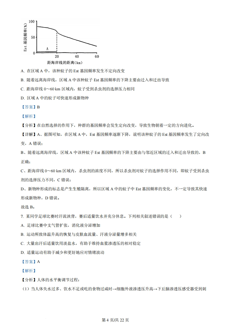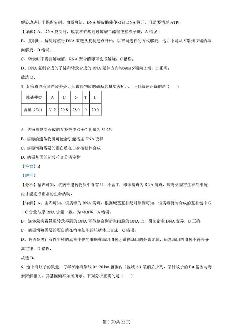 2024年普通高中学业水平选择性考试(河北卷)生物学本试卷共100分,考试时间75分钟。一、单项选择题:本题共13小题,每小题2分,共26分。在每小题给出的四个选项中,只有一项是符合题目要求的。1.细胞内不具备运输功能的物质或结构是()A.结合水B.囊泡C.细胞骨架D.tRNA【答案】A【解析】【分析】细胞中的水以自由水和结合水的形式存在,结合水是细胞结构的主要组成成分,自由水是细胞内良好的溶剂,是许多化学反应的介质,还参与细胞内的化学反应和物质运输。细胞骨架是由蛋白质纤维组成的网架结构,维持着细胞的形态,锚定并支撑着许多细胞器,与细胞运动、分裂、分化以及物质运输、能量转化、信息传递等生命活动密切相关。【详解】A、结合水是细胞结构的重要成分,不具备运输功能,A正确:B、囊泡可运输分泌蛋白等,B错误:C、细跑骨架与细胞运动、分裂、分化以及物质运输、能量转化、信息传递等生命活动密切相关,C错误:D、RNA可运输氨基酸,D错误.故选A。2.下列关于酶的叙述,正确的是()A.作为生物催化剂,酶作用的反应物都是有机物B.胃蛋白酶应在酸性、37℃条件下保存C.醋酸杆菌中与发酵产酸相关的酶,分布于其线粒体内膜上D.从成年牛、羊等草食类动物的肠道内容物中可获得纤维素酶【答案】D【解析】【分析】酶是活细胞产生的具有催化作用的有机物,应在最适H、低温条件下保存。原核生物只有唯一的细胞器核糖体,无细胞核和其他细胞器。【详解】A、一般来说,酶是活细胞产生的具有催化作用的有机物,但其作用的反应物不一定是有机物,如过氧化氢酶作用的反应物过氧化氢就是无机物,A错误:B、胃蛋白酶应在酸性、低温下保存,B错误:第1页供22页C、醋酸杆菌是细菌,属于原核生物,不具有线粒体结构,C错误:D、成年牛、羊等草食类动物肠道中有可以分解纤维素的微生物,所以从其肠道内容物中可以获得纤维素酶,D正确。故选D。3.核DNA受到损伤时ATM蛋白与受损部位结合,被激活后参与DNA修复,同时可诱导抗氧化酶基因H的表达。下列分析错误的是()A.细胞在修复受损的DNA时,抗氧化能力也会提高B.AM在细胞质合成和加工后,经核孔进入细胞核发挥作用C.H蛋白可减缓氧化产生的自由基导致的细胞衰老D.ATM基因表达增强的个体受辐射后更易患癌【答案】B【解析】【分析】细胞衰老的学说:自由基学说、端粒学说。自由基:通常把异常活跃的带电分子或基团称为自由基。【详解】A、依据题干信息,当核DNA受到损伤时,ATM蛋白与受损部位结合,可诱导抗氧化酶基因基因H的表达,即提高了其抗氧化能力,A正确:B、ATM属于胞内蛋白,所以在细胞质合成后,不需要经过加工,经核孔进入细胞核发挥作用,B错误:C、H蛋白是抗氧化酶基因H表达的产物,可以减缓氧化过程中所产生的自由基导致的细胞衰老,C正确:D、当ATM基因表达增强,所产生的ATM蛋白会过多,ATM蛋白不仅会与受损部位结合,也可能会与正常的类似部位结合,使DNA结构受损,这样的个体受到物理致癌因素(辐射等)的刺激后,可能会进一步诱发DNA的破坏,增大癌症的风险,D正确。故选B。4.下列关于DNA复制和转录的叙述,正确的是()A.DNA复制时,脱氧核苷酸通过氢键连接成子链B.复制时,解旋酶使DNA双链由5端向3'端解旋C.复制和转录时,在能量的驱动下解旋酶将DNA双链解开D.DNA复制合成的子链和转录合成的RNA延伸方向均为由5端向3端【答案】D【解析】【分析】DNA分子复制的方式是半保留复制,且合成两条子链的方向是相反的:DNA在复制过程中,边第2页共22页解旋边进行半保留复制。由图可知,DNA解旋酶能使双链DNA解开,且需要消耗ATP:【详解】A、DNA复制时,脱氧核苷酸通过磷酸二酯键连接成子链,A错误:B、复制时,解旋酶使得DNA双链从复制起点开始,以双向进行的方式解旋,这并不是从5端到3'端的单向解旋,B错误:C、转录时不需要解旋酶,RNA聚合酶即可完成解旋,C错误:D、DNA复制合成的子链和转录合成的RNA延伸方向均为由5'端向3'端,D正确:故选D。5.某病毒具有蛋白质外壳,其遗传物质的碱基含量如表所示,下列叙述正确的是()碱基种类ACG含量(%)31.220.828.0020.0A.该病毒复制合成的互补链中G+C含量为512%B.病毒的遗传物质可能会引起宿主DNA变异C.病毒增殖需要的蛋白质在自身核糖体合成D.病毒基因的遗传符合分离定律【答案】B【解析】【分析】据表可知,该病毒遗传物质中含有U,不含T,即该病毒为RNA病毒。病毒必需寄生在活细胞内才能完成正常的生命活动。【详解】A、由表可知,该病毒为RNA病毒,根据碱基互补配对原则可知,该病毒复制合成的互补链中G+C含量与原RNA含量一致,为48.8%,A错误:B、逆转录病毒经逆转录得到的DNA可能整合到宿主细胞的DNA上,引起宿主DNA变异,B正确:C、病毒增殖需要的蛋白质在宿主细胞的核糖体上合成,C错误:D、必需是进行有性生殖的真核生物的细胞核基因遗传才遵循基因的分离定律,病毒基因的遗传不符合分离定律,D错误。故选B。6.地中海蚊子的数量,每年在距海岸线0~20km范围内(区域A)喷洒杀虫剂。某种蚊子的Est基因与毒素降解相关,其基因频率如图所示。下列分析正确的是()第3页供22页
