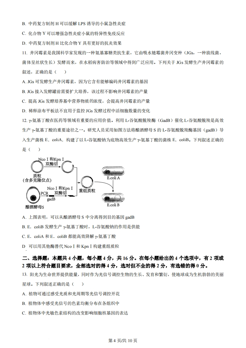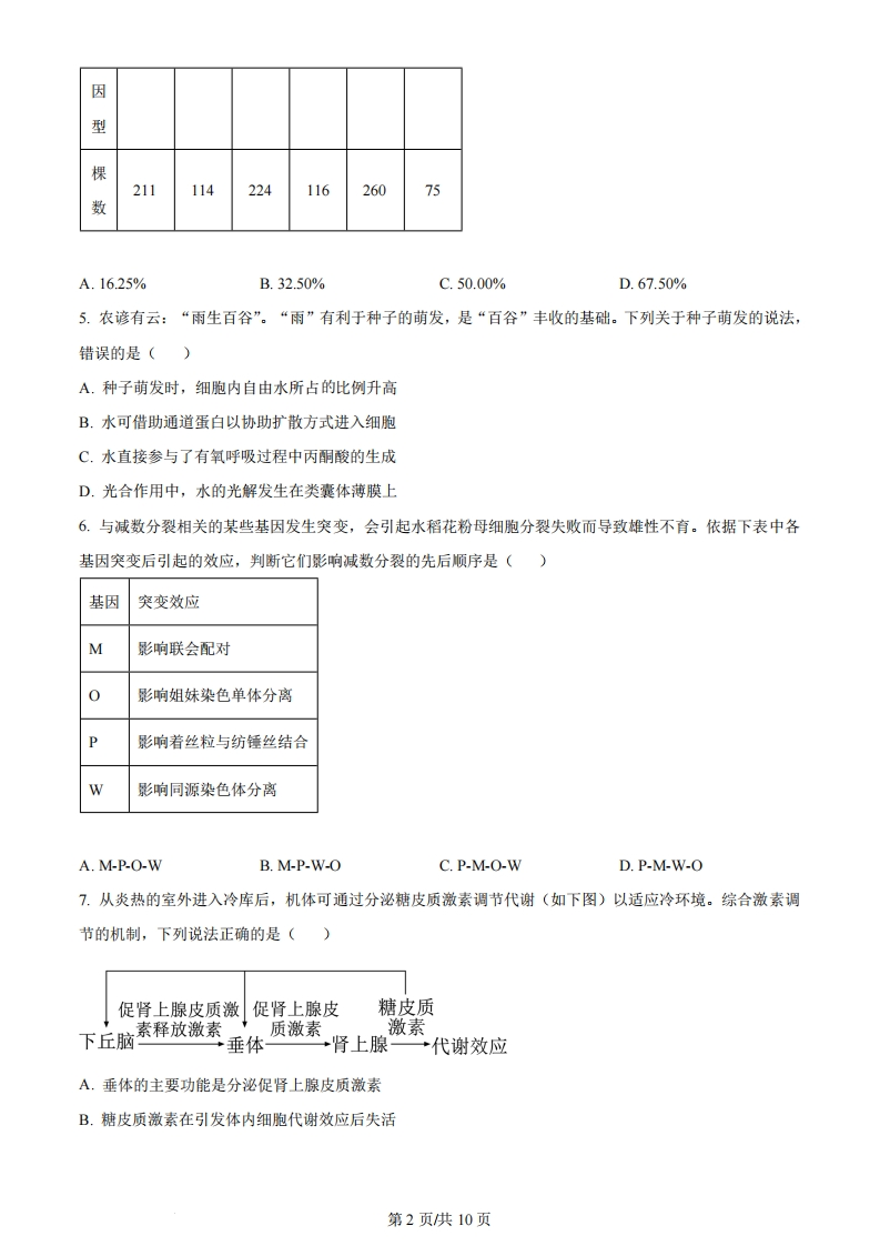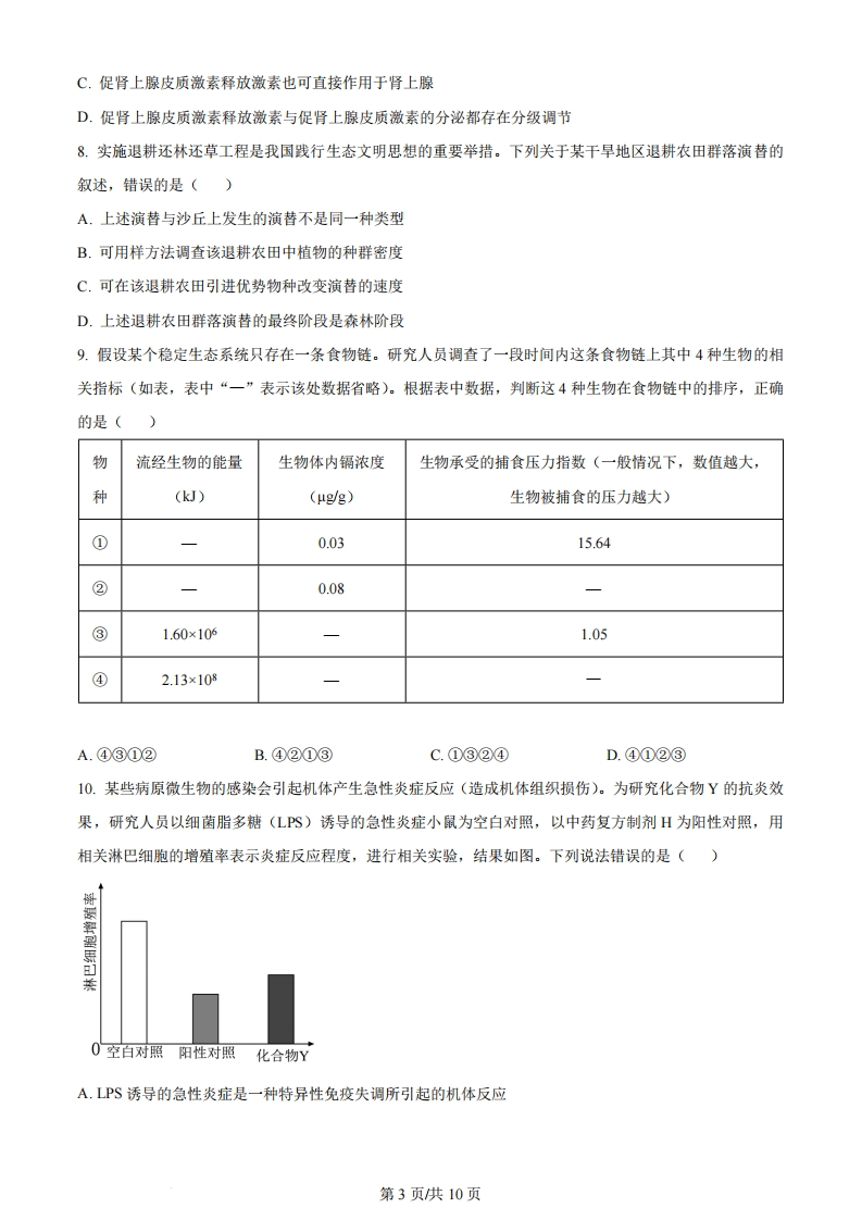 2024年普通高中学业水平选择性考试(江西卷)一、选择题:本题共12小题,每小题2分,共24分。在每小题给出的4个选项中,只有1项符合题目要求,答对得2分,答错得0分。1.溶酶体膜稳定性下降,可导致溶酶体中酶类物质外溢,引起机体异常,如类风湿性关节炎等。下列有关溶酶体的说法,错误的是()A.溶酶体的稳定性依赖其双层膜结构B.溶酶体中的蛋白酶在核糖体中合成C.从溶酶体外溢出的酶主要是水解酶D.从溶酶体外溢后,大多数酶的活性会降低2.营养物质是生物生长发育的基础。依据表中信息,下列有关小肠上皮细胞吸收营养物质方式的判断,错误的是()方式细胞外相对浓度细胞内相对浓度需要提供能量需要转运蛋白甲低高是是乙高低否是丙高低是是高低否否A.甲为主动运输B.乙为协助扩散C.丙为胞吞作用D.丁为自由扩散3.某植物中,T基因的突变会导致细胞有丝分裂后期纺锤体伸长的时间和长度都明显减少,从而影响细胞的增殖。下列推测错误的是()A.T基因突变的细胞在分裂期可形成一个梭形纺锤体B.T基因突变导致染色体着丝粒无法在赤道板上排列C.T基因突变的细胞在分裂后期染色体数能正常加倍D.T基因突变影响纺锤丝牵引染色体向细胞两极移动4.某水果的W基因(存在多种等位基因)影响果实甜度。研究人员收集到1000棵该水果的植株,它们的基因型及对应棵数如下表。据表分析,这1000棵植株中W,的基因频率是()基WW2W2W2W2W3W3WaWaWa第1页供10页因型棵21111422411626075数A.1625%B.32.50%C.50.00%D.67.50%5.农谚有云:“雨生百谷”。“雨”有利于种子的萌发,是“百谷”丰收的基础。下列关于种子萌发的说法,错误的是()A.种子萌发时,细胞内自由水所占的比例升高B.水可借助通道蛋白以协助扩散方式进入细胞C.水直接参与了有氧呼吸过程中丙酮酸的生成D.光合作用中,水的光解发生在类囊体薄膜上6.与减数分裂相关的某些基因发生突变,会引起水稻花粉母细胞分裂失败而导致雄性不育。依据下表中各基因突变后引起的效应,判断它们影响减数分裂的先后顺序是()基因突变效应M影响联会配对0影响姐妹染色单体分离P影响着丝粒与纺锤丝结合W影响同源染色体分离A.M-P-O-WB.M-P-W-OC.P-M-O-WD.P-M-W-O7.从炎热的室外进入冷库后,机体可通过分泌糖皮质激素调节代谢(如下图)以适应冷环境。综合激素调节的机制,下列说法正确的是()促肾上腺皮质激促肾上腺皮糖皮质下丘脑素释放激素质激素激素垂体→肾上腺→代谢效应A.垂体的主要功能是分泌促肾上腺皮质激素B.糖皮质激素在引发体内细胞代谢效应后失活第2页供10页C.促肾上腺皮质激素释放激素也可直接作用于肾上腺D.促肾上腺皮质激素释放激素与促肾上腺皮质激素的分泌都存在分级调节8.实施退耕还林还草工程是我国践行生态文明思想的重要举措。下列关于某干旱地区退耕农田群落演替的叙述,错误的是()A.上述演替与沙丘上发生的演替不是同一种类型B.可用样方法调查该退耕农田中植物的种群密度C.可在该退耕农田引进优势物种改变演替的速度D.上述退耕农田群落演替的最终阶段是森林阶段9.假设某个稳定生态系统只存在一条食物链。研究人员调查了一段时间内这条食物链上其中4种生物的相关指标(如表,表中“一”表示该处数据省略)。根据表中数据,判断这4种生物在食物链中的排序,正确的是(物流经生物的能量生物体内镉浓度生物承受的捕食压力指数(一般情况下,数值越大,种(kJ(μgg)生物被捕食的压力越大)①0.0315.64②0.08③1.60×1051.05④2.13×108A.④③①②B.④②①③C.①③②④D.④①②③10.某些病原微生物的感染会引起机体产生急性炎症反应(造成机体组织损伤)。为研究化合物Y的抗炎效果,研究人员以细菌脂多糖(LPS)诱导的急性炎症小鼠为空白对照,以中药复方制剂H为阳性对照,用相关淋巴细胞的增殖率表示炎症反应程度,进行相关实验,结果如图。下列说法错误的是()0空白对照阳性对照化合物YA.LPS诱导的急性炎症是一种特异性免疫失调所引起的机体反应第3页供10页