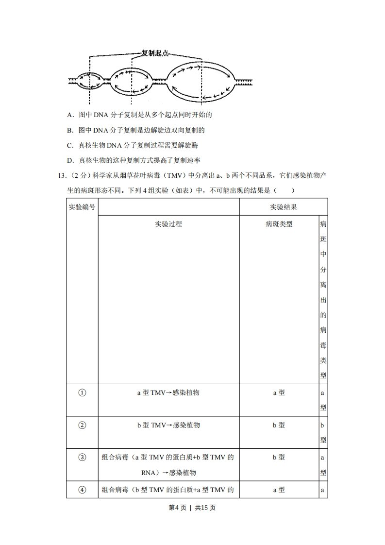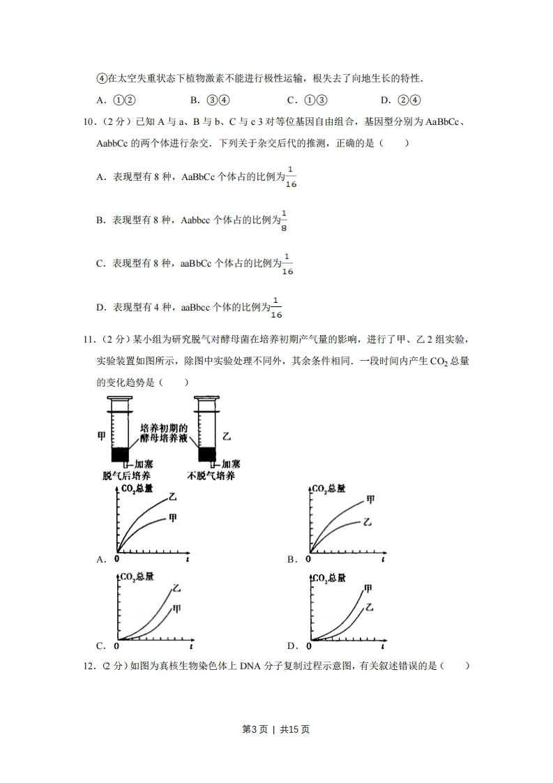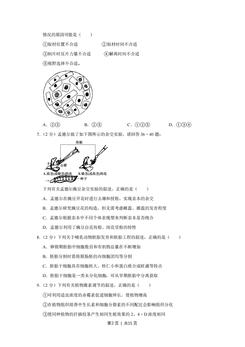 2009年江苏省高考生物试卷一、单项选挥题:本部分包括20题,每题2分,共计40.每题只有一个选项最符合题意,1.(2分)下列关于细胞内化合物的叙述,正确的是()A.ATP脱去2个磷酸基团后是RNA的基本组成单位之一B.糖原代谢的最终产物是葡萄糖C.蔗糖和乳糖水解的产物都是葡萄糖D.脂肪和生长激素是生物体内的能源物质2.(2分)下列有关神经兴奋的叙述,正确的是()A,静息状态时神经元的细胞膜内外没有离子进出B.组织液中Na+浓度增大,则神经元的静息电位减小C.突触间隙中的神经递质经主动运输穿过突触后膜而传递兴奋D.神经纤维接受刺激产生的兴奋以电信号的形式传导3.(2分)下列关于固定化酶和固定化细胞的叙述,正确的是()A.固定化细胞技术在多步连续催化反应方面优势明显B.固定化酶的应用中,要控制好pH、温度和溶解氧C.利用固定化酶降解水体中有机磷农药,需提供适宜的营养条件D.利用固定化酵母细胞进行发酵,糖类的作用只是作为反应底物4.(2分)下列有关细胞生命活动的叙述,正确的是()A.分裂期的细胞不进行DNA复制和蛋白质合成B.免疫系统中的记忆细胞既有分化潜能又有自我更新能力C.凋亡细胞内的基因表达都下降,酶活性减弱D.原癌基因突变促使细胞癌变,抑癌基因突变抑制细胞癌变5.(2分)下列有关生物体遗传物质的叙述,正确的是()A.豌豆的遗传物质主要是DNAB.酵母菌的遗传物质主要分布在染色体上C.T,噬菌体的遗传物质含有硫元素D.HV的遗传物质水解产生4种脱氧核苷酸6.(2分)有1位同学做根尖有丝分裂实验,在显微镜中观察到的图象如图所示。造成这种第1页|共15页情况的原因可能是()①取材位置不合适②取材时间不合适③制片时压片力量不合适④解离时间不合适⑤视野选择不合适。A.②③B.②⑤C.①②⑤D.①③④7.(2分)孟德尔做了如下图所示的杂交实验,请回答36-40题:传粉A高艺(或矮的花B矮茎(或高茎)的花→应y种子下列有关孟德尔豌豆杂交实验的叙述,正确的是()A.孟德尔在豌豆开花时进行去雄和授粉,实现亲本的杂交B.孟德尔研究豌豆花的构造,但无需考虑雌蕊、雄蕊的发育程度C.孟德尔根据亲本中不同个体表现型来判断亲本是否纯合D.孟德尔利用了豌豆自花传粉、闭花受粉的特性8.(2分)下列关于哺乳动物胚胎发育和胚胎工程的叙述,正确的是()A,卵裂期胚胎中细胞数目和有机物总量在不断增加B.胚胎分割时需将原肠胚的内细胞团均等分割C.胚胎干细胞具有细胞核大、核仁小和蛋白质合成旺盛等特点D.胚胎干细胞是一类未分化细胞,可从早期胚胎中分离获取9.(2分)下列有关植物激素调节的叙述,正确的是()①可利用适宜浓度的赤霉素促进细胞伸长,使植物增高②在植物组织培养中生长素和细胞分裂素的不同配比会影响组织分化③使同种植物的扦插枝条产生相同生根效果的2,4-D浓度相同第2页|共15页④在太空失重状态下植物激素不能进行极性运输,根失去了向地生长的特性,A.①②B.③④C.①③D.②④10.(2分)己知A与a、B与b、C与c3对等位基因自由组合,基因型分别为AaBbCc、AabbCc的两个体进行杂交.下列关于杂交后代的推测,正确的是()A.表现型有8种,AaBbCe个体占的比例为i6B.表现型有8种,Aabbec个体占的比例为8C.表现型有8种,aaBbCc个体占的比例为是16D.表现型有4种,aaBbcc个体的比例为1611.(2分)某小组为研究脱气对酵母菌在培养初期产气量的影响,进行了甲、乙2组实验,实验装置如图所示,除图中实验处理不同外,其余条件相同.一段时间内产生CO2总量的变化趋势是()培养初期的,酵母培养液加塞加寒脱气后培养不脱气培养4C0,总量C0,总量A.0B.0C0,总量C0,总盘甲C.0D.012.2分)如图为真核生物染色体上DNA分子复制过程示意图,有关叙述错误的是()第3页1共15页