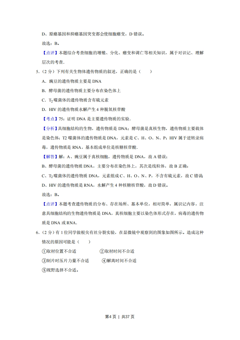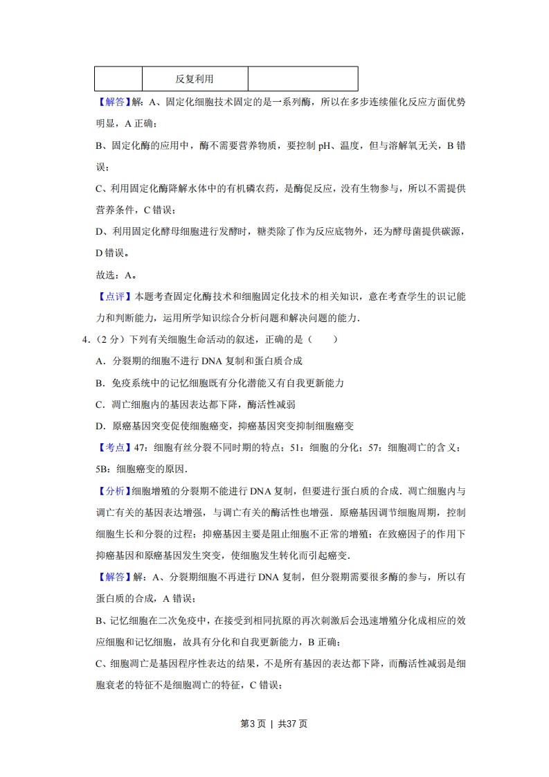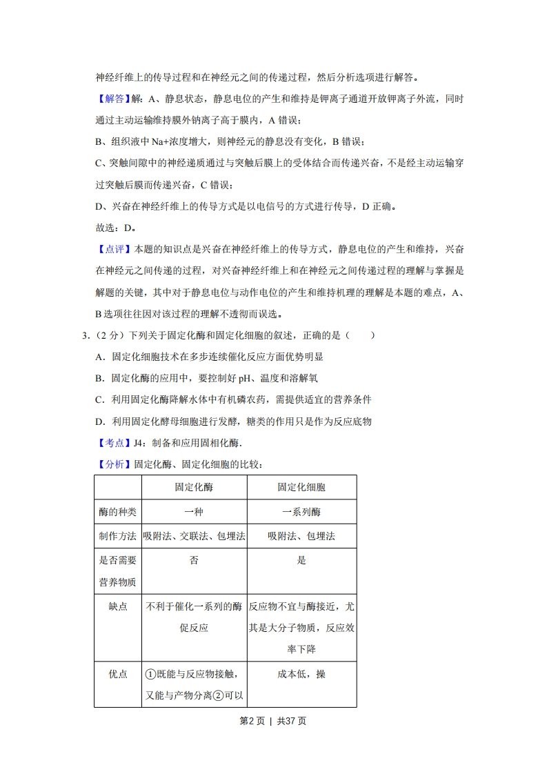 2009年江苏省高考生物试卷解析版◆考答案与试题解折一、单项选择题:本部分包括20题,每题2分,共计40,每题只有一个选项最符合题意1.(2分)下列关于细胞内化合物的叙述,正确的是()A.ATP脱去2个磷酸基团后是RNA的基本组成单位之一B.糖原代谢的最终产物是葡萄糖C.蔗糖和乳糖水解的产物都是葡萄糖D.脂肪和生长激素是生物体内的能源物质【考点】1L:糖类的种类及其分布和功能:3C:ATP的化学组成和特点.【分析】本题综合考查细胞中的物质ATP、糖类、脂肪等,需结合具体的选项进行分析。【解答】解:A、结构特点:ATP中文名称叫三磷酸腺苷,结构简式A-P~P~P,其中A代表腺苷,P代表磷酸基团,~代表高能磷酸键,腺苷是腺嘌呤和核糖的化合物,和磷酸基团构成的物质是腺嘌吟核糖核苷酸,是NA的基本组成单位之一,A正确:B、糖原代谢的最终产物是二氧化碳和水,B错误:C、蔗糖水解的产物是葡萄糖和果糖,乳糖水解的产物是葡萄糖和半乳糖,C错误:D、生长激素是一种激素在人体内含量不高,不是体内的能源物质,D错误。故选:A【点评】本题的知识点是糖原的水解产物、糖类的功能,腺苷、ATP、RNA在组成上的关系,主要考查学生对细胞化合物的综合掌握与运用能力,2.(2分)下列有关神经兴奋的叙述,正确的是()A.静息状态时神经元的细胞膜内外没有离子进出B.组织液中Na+浓度增大,则神经元的静息电位减小C.突触间隙中的神经递质经主动运输穿过突触后膜而传递兴奋D.神经纤维接受刺激产生的兴奋以电信号的形式传导【考点】D6:细胞膜内外在各种状态下的电位情况:D8:突触的结构:D9:神经冲动的产生和传导.【分析】本题是对于兴奋在神经纤维上的传导和在神经元之间传递的考查,回忆兴奋在第1页1共37页神经纤维上的传导过程和在神经元之间的传递过程,然后分析选项进行解答。【解答】解A、静息状态,静息电位的产生和维持是钾离子通道开放钾离子外流,同时通过主动运输维持膜外钠离子高于膜内,A错误:B、组织液中Na+浓度增大,则神经元的静息没有变化,B错误:C、突触间隙中的神经递质通过与突触后膜上的受体结合而传递兴奋,不是经主动运输穿过突触后膜而传递兴奋,C错误:D、兴奋在神经纤维上的传导方式是以电信号的方式进行传导,D正确。故选:D【点评】本题的知识点是兴奋在神经纤维上的传导方式,静息电位的产生和维持,兴奋在神经元之间传递的过程,对兴奋神经纤维上和在神经元之间传递过程的理解与掌握是解题的关键,其中对于静息电位与动作电位的产生和维持机理的理解是本题的难点,A、B选项往往因对该过程的理解不透彻而误选。3.(2分)下列关于固定化酶和固定化细胞的叙述,正确的是()A.固定化细胞技术在多步连续催化反应方面优势明显B.固定化酶的应用中,要控制好pH、温度和溶解氧C.利用固定化酶降解水体中有机磷农药,需提供适宜的营养条件D.利用固定化酵母细胞进行发酵,糖类的作用只是作为反应底物【考点】J4:制备和应用固相化酶【分析】固定化酶、固定化细胞的比较:固定化酶固定化细胞酶的种类一种一系列酶制作方法吸附法、交联法、包埋法吸附法、包埋法是否需要香是营养物质缺点不利于催化一系列的酶反应物不宜与酶接近,尤促反应其是大分子物质,反应效率下降优点①既能与反应物接触,成本低,操又能与产物分离②可以第2页|共37页反复利用【解答】解:A、固定化细胞技术固定的是一系列酶,所以在多步连续催化反应方面优势明显,A正确:B、固定化酶的应用中,酶不需要营养物质,要控制pH、温度,但与溶解氧无关,B错误:C、利用固定化酶降解水体中的有机磷农药,是酶促反应,没有生物参与,所以不需提供营养条件,C错误:D、利用固定化酵母细胞进行发酵时,糖类除了作为反应底物外,还为酵母菌提供碳源,D错误。故选:A。【点评】本题考查固定化酶技术和细胞固定化技术的相关知识,意在考查学生的识记能力和判断能力,运用所学知识综合分析问题和解决问题的能力,4.(2分)下列有关细胞生命活动的叙述,正确的是()A,分裂期的细胞不进行DNA复制和蛋白质合成B.免疫系统中的记忆细胞既有分化潜能又有自我更新能力C.调亡细胞内的基因表达都下降,酶活性减弱D.原癌基因突变促使细胞癌变,抑癌基因突变抑制细胞癌变【考点】47:细胞有丝分裂不同时期的特点:51:细胞的分化:57:细胞调亡的含义:5B:细胞癌变的原因【分析】细胞增殖的分裂期不能进行DNA复制,但要进行蛋白质的合成.调亡细胞内与调亡有关的基因表达增强,与调亡有关的酶活性也增强.原癌基因调节细胞周期,控制细胞生长和分裂的过程:抑癌基因主要是阻止细胞不正常的增殖:在致癌因子的作用下抑癌基因和原癌基因发生突变,使细胞发生转化而引起癌变】【解答】解:A、分裂期细胞不再进行DNA复制,但分裂期需要很多酶的参与,所以有蛋白质的合成,A错误:B、记忆细胞在二次免疫中,在接受到相同抗原的再次刺激后会迅速增殖分化成相应的效应细胞和记忆细胞,故具有分化和自我更新能力,B正确:C、细胞调亡是基因程序性表达的结果,不是所有基因的表达都下降,而酶活性减弱是细胞衰老的特征不是细胞调亡的特征,C错误:第3页1共37页