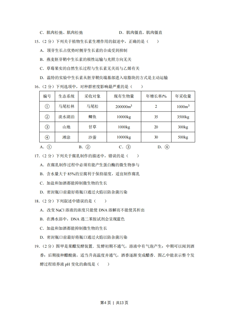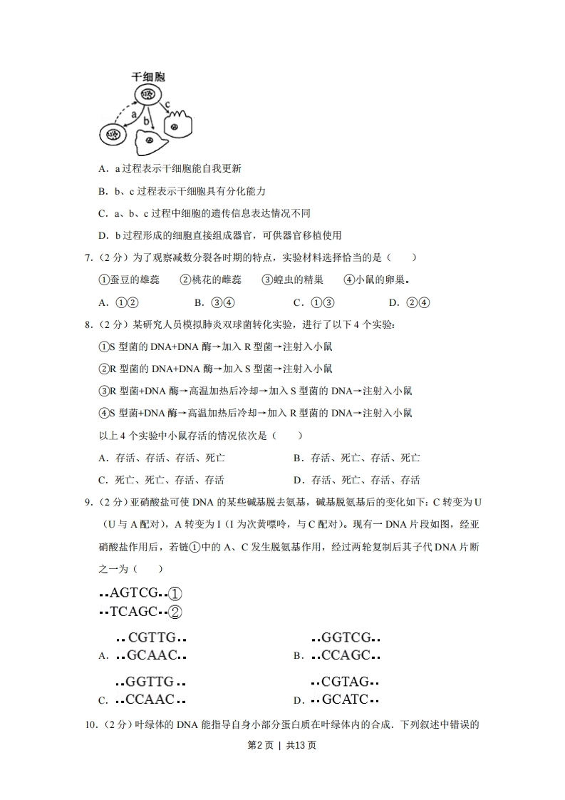 2008年江苏省高考生物试卷一、单项选择题:本部分包括20题,每题2分,共计40分.每题只有一个选项最符合题意.1.(2分)下列各组物质中,由相同种类元素组成的是()A.胆固醇、脂肪酸、脂肪酶B.淀粉、半乳糖、糖原C.氨基酸、核苷酸、丙酮酸D.性激素、生长激素、胰岛素2.(2分)线粒体DNA上的基因所表达的酶与线粒体功能有关.若线粒体DNA受损伤,则下列细胞的功能受影响最大的是()A.红细胞吸收葡萄糖B.小肠上皮细胞吸收水C.神经细胞吸收K+D.肺泡细胞吸收氧气3.(2分)下列细胞中,可能己发生癌变的是()A,细胞膜上糖蛋白减少的细胞B.细胞核增大的细胞C.自由水含量减少的细胞D.被细菌侵染的细胞4.(2分)下列对有关实验的描述中,错误的是()A.分离叶绿体中的色素时,不同色素随层析液在滤纸上的扩散速度不同B.用低倍镜观察不到紫色洋葱鳞片叶外表皮细胞的质壁分离和复原过程C.观察叶片细胞的叶绿体时,先在低倍镜下找到叶片细胞再换高倍镜观察D.甲基绿染色可使人口腔上皮细胞的细胞核呈绿色5.(2分)下列关于叶绿体和光合作用的描述中,正确的是()A.叶片反射绿光故呈绿色,因此日光中绿光透过叶绿体的比例最小B.叶绿体的类囊体膜上含有自身光合作用所需的各种色素C.光照下叶绿体中的ATP主要是由光合作用合成的糖经有氧呼吸产生的D.光合作用强烈时,暗反应过程直接将3个CO2分子合成一个三碳化合物6.(2分)动物和人体内具有分裂和分化能力的细胞称为干细胞。对图的相关叙述中,错误的是()第1页1共13页干细胞A.a过程表示干细胞能自我更新B.b、c过程表示干细胞具有分化能力C.a、b、c过程中细胞的遗传信息表达情况不同D.b过程形成的细胞直接组成器官,可供器官移植使用7.(2分)为了观察减数分裂各时期的特点,实验材料选择恰当的是()(①蚕豆的雄蕊②桃花的雌蕊③蝗虫的精巢④小鼠的卵巢。A.①②B.③④C.①③D.②④8.(2分)某研究人员模拟肺炎双球菌转化实验,进行了以下4个实验:①S型菌的DNA+DNA酶→加入R型菌→注射入小鼠②R型菌的DNA+DNA酶→加入S型菌→注射入小鼠③R型菌+DNA酶→高温加热后冷却→加入S型菌的DNA→注射入小鼠④S型菌+DNA酶→高温加热后冷却→加入R型菌的DNA→注射入小鼠以上4个实验中小鼠存活的情况依次是(A.存活、存活、存活、死亡B.存活、死亡、存活、死亡C.死亡、死亡、存活、存活D.存活、死亡、存活、存活9.(2分)亚硝酸盐可使DNA的某些碱基脱去氨基,碱基脱氨基后的变化如下:C转变为U(U与A配对),A转变为I(I为次黄嘌呤,与C配对)。现有一DNA片段如图,经亚硝酸盐作用后,若链①中的A、C发生脱氨基作用,经过两轮复制后其子代DNA片断之一为(.AGTCG.①.TCAGC.②..CGTTG....GGTCG..A...GCAAC.B...CCAGC....GGTTG...CGTAG-.C...CCAAC..D...GCATC..10.(2分)叶绿体的DNA能指导自身小部分蛋白质在叶绿体内的合成.下列叙述中错误的第2页|共13页是()A.叶绿体DNA能够转录B.叶绿体DNA是遗传物质C.叶绿体内存在核糖体D.叶绿体功能不受细胞核调控11.(2分)某植物种群中,AA个体点16%,a个体占36%,该种群随机交配产生的后代中AA个体百分比、A基因频率和自交产生的后代中AA个体百分比、A基因频率的变化依次为()A.增大,不变:不变,不变B.不变,增大:增大,不变C.不变,不变:增大,不变D.不变,不变:不变,增大12.(2分)如图表示人体内化学物质传输信息的3种方式.神经递质和甲状腺激素的传输方式依次是血管①②③A.①②B.②③C.①③D.②①13.(2分)人类Rh血型有h和h~两种,分别由常染色体上显性基因R和隐性基因r控制.Rh的人有Rh抗原,Rh~抗原,Rh~的人无Rh抗原.若Rh胎儿的Rh抗原进入Rh·母亲体内且使母体产生贴抗体,随后抗体进入胎儿体内则引起胎儿血液凝集和溶血:若这位R贴~母亲又怀一Rh*胎儿,下列对这两胎儿的相关基因型及血液凝集和溶血程度的分析中,正确的是()①相关基因型与父亲的一定相同②相关基因型与父亲的不一定相同③两胎儿血液凝集和溶血程度相同④第二胎儿血液凝集和溶血程度比第一胎儿严重.A.①③B.①④c.②③D.②④14.(2分)α~银环蛇毒能与突触后膜上的乙酰胆碱受体牢固结合:有机磷农药能抑制胆碱酯酶的活性,而乙酰胆碱酯酶的作用是清除与突触后膜上受体结合的乙酰胆碱.因此,α-银环蛇毒与有机磷农药中毒的症状分别是()A.肌肉松弛、肌肉僵直B.肌肉僵直、肌肉松弛第3页|共13页