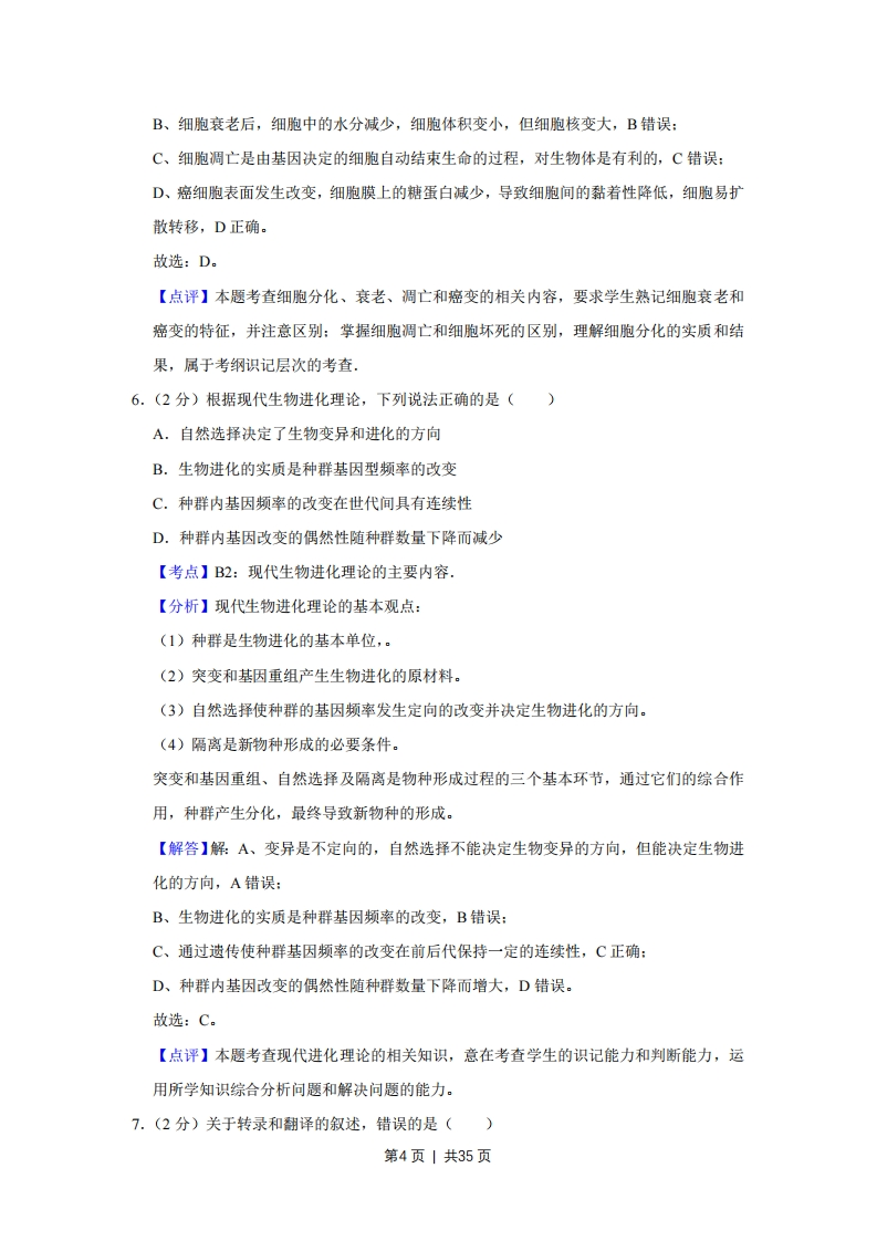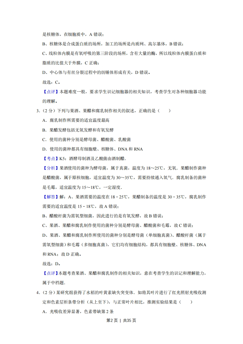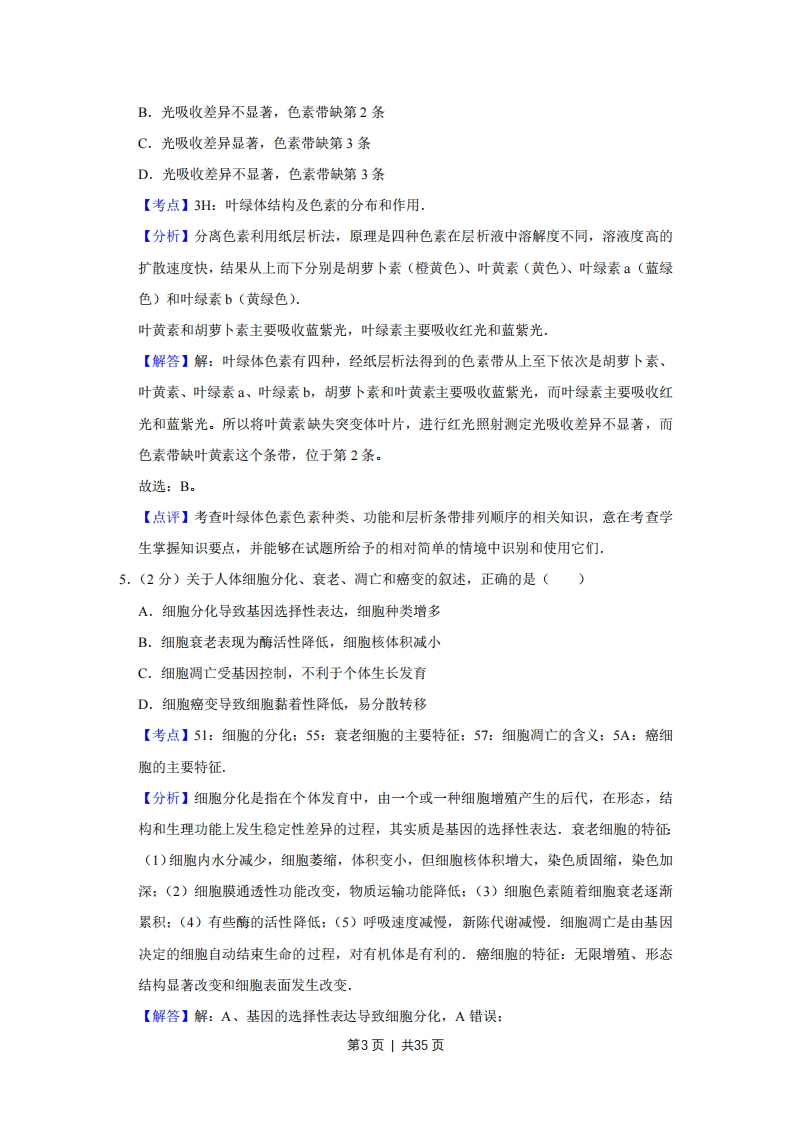 2011年江苏省高考生物试卷解析版◆考答案与试题解析一、单项选择题:本部分包括20愿,每题2分,共40分.每题只有一个选项最符合题意1.(2分)下列物质合成时,需要模板的是()A.磷脂和蛋白质B.DNA和酶C.性激素和胰岛素D.神经递质和受体【考点】7H:中心法则及其发展:E2:神经、体液调节在维持稳态中的作用.【分析】需要模板的过程有:复制、转录、翻译和逆转录,因此DNA和RNA的复制过程需要模板:转录和翻译合成蛋白质的过程需要模板,如胰岛素、酶和受体的合成:以RNA为模板逆转录合成DNA的过程,也需要模板,同时也需要逆转录酶。【解答】解:A、蛋白质的合成需要模板,但磷脂的合成不需要模板,A错误:B、DNA和酶(蛋白质或RNA)的合成都需要模板,B正确:C、性激素属于脂质,其合成不需要模板,C错误:D、神经递质的合成过程不需要模板,D错误。故选:B。【点评】本题考查DNA分子的复制、遗传信息的转录和翻译等过程,首先要求考生识记DNA分子复制的条件、遗传信息转录和翻译过程所需的条件:其次还要求考生能准确判断各选项中化合物的化学本质,最后再判断各种化合物的合成过程是否需要模板.2.(2分)关于人体细胞结构和功能的叙述,正确的是()A.在细胞核内RNA能够传递和表达遗传信息B.核糖体是蛋白质合成和加工的主要场所C.线粒体内膜蛋白质和脂质的比值大于外膜D.高尔基体与有丝分裂过程中纺锤体形成有关【考点】2D:线粒体、叶绿体的结构和功能:2E:细胞器中其他器官的主要功能:2G:细胞核的结构和功能【分析】本题考查的知识点有基因表达的场所、细胞器的作用、线粒体的结构和功能,需结合具体的选项进行分析。【解答】解:A、人体的细胞是真核细胞,真核细胞的转录的场所是细胞核,翻译的场所第1页1共35页是核糖体,在细胞质中,A错误:B、核糖体是合成蛋白质的场所,加工的场所是内质网、高尔基体,B错误:C、线粒体内膜是有氧呼吸的第三阶段的场所,含有大量的酶,所以线粒体内膜蛋白质和脂质的比值大于外膜,C正确:D、中心体与有丝分裂过程中的纺锤体形成有关,D错误。故选:C。【点评】本题难度一般,要求学生识记细胞器的相关知识,考查学生对各种细胞器功能的理解。3.(2分)下列与果酒、果醋和腐乳制作相关的叙述,正确的是()A.腐乳制作所需要的适宜温度最高B.果醋发酵包括无氧发酵和有氧发酵C.使用的菌种分别是酵母菌、醋酸菌、乳酸菌D.使用的菌种都具有细胞壁、核糖体、DNA和RNA【考点】K5:酒酵母制酒及乙酸菌由酒制醋.【分析】果酒使用的菌种为酵母菌,属于真菌,温度为18~25℃,无氧.果醋制作菌种是醋酸菌,属于原核细胞,适宜温度为30~35℃,需要持续通入氧气.腐乳制备的菌种是毛霉,适宜温度为15~18℃,一定湿度,【解答】解:A、果酒需要的温度在18-25℃,果醋制备的温度是30-35℃,腐乳制作需要的适宜温度是15-18℃,故A错误:B、醋酸杆菌为需氧型细菌,因此进行的是有氧发酵,故B错误:C、果酒、果醋和腐乳制作使用的菌种分别是酵母菌、醋酸菌和毛霉,故C错误:D、果酒、果醋和腐乳制作所使用的菌种分别是酵母菌(单细胞真菌)、醋酸杆菌(属于需氧型细菌)和毛霉(多细胞真菌),它们均有细胞结构,都具有细胞壁、核糖体、DNA和RNA:故D正确。故选:D。【点评】本题考查果酒、果醋和腐乳制作的相关知识,意在考查学生的识记和理解能力,属于中档题4.(2分)某研究组获得了水稻的叶黄素缺失突变体.如将其叶片进行了红光照射光吸收测定和色素层析条带分析(从上至下),与正常叶片相比,推测实验结果是()A.光吸收差异显著,色素带缺第2条第2页|共35页B.光吸收差异不显著,色素带缺第2条C.光吸收差异显著,色素带缺第3条D.光吸收差异不显著,色素带缺第3条【考点】3H:叶绿体结构及色素的分布和作用【分析】分离色素利用纸层析法,原理是四种色素在层析液中溶解度不同,溶液度高的扩散速度快,结果从上而下分别是胡萝卜素(橙黄色)、叶黄素(黄色)、叶绿素a(蓝绿色)和叶绿素b(黄绿色).叶黄素和胡萝卜素主要吸收蓝紫光,叶绿素主要吸收红光和蓝紫光,【解答】解:叶绿体色素有四种,经纸层析法得到的色素带从上至下依次是胡萝卜素、叶黄素、叶绿素a、叶绿素b,胡萝卜素和叶黄素主要吸收蓝紫光,而叶绿素主要吸收红光和蓝紫光。所以将叶黄素缺失突变体叶片,进行红光照射测定光吸收差异不显著,而色素带缺叶黄素这个条带,位于第2条。故选:B。【点评】考查叶绿体色素色素种类、功能和层析条带排列顺序的相关知识,意在考查学生掌握知识要点,并能够在试题所给予的相对简单的情境中识别和使用它们5.(2分)关于人体细胞分化、衰老、调亡和癌变的叙述,正确的是()A,细胞分化导致基因选择性表达,细胞种类增多B.细胞衰老表现为酶活性降低,细胞核体积减小C.细胞调亡受基因控制,不利于个体生长发育D.细胞癌变导致细胞黏着性降低,易分散转移【考点】51:细胞的分化:55:衰老细胞的主要特征:57:细胞调亡的含义:5A:癌细胞的主要特征【分析】细胞分化是指在个体发育中,由一个或一种细胞增殖产生的后代,在形态,结构和生理功能上发生稳定性差异的过程,其实质是基因的选择性表达,衰老细胞的特征(1)细胞内水分减少,细胞萎缩,体积变小,但细胞核体积增大,染色质固缩,染色加深:(2)细胞膜通透性功能改变,物质运输功能降低:(3)细胞色素随着细胞衰老逐渐累积:(4)有些酶