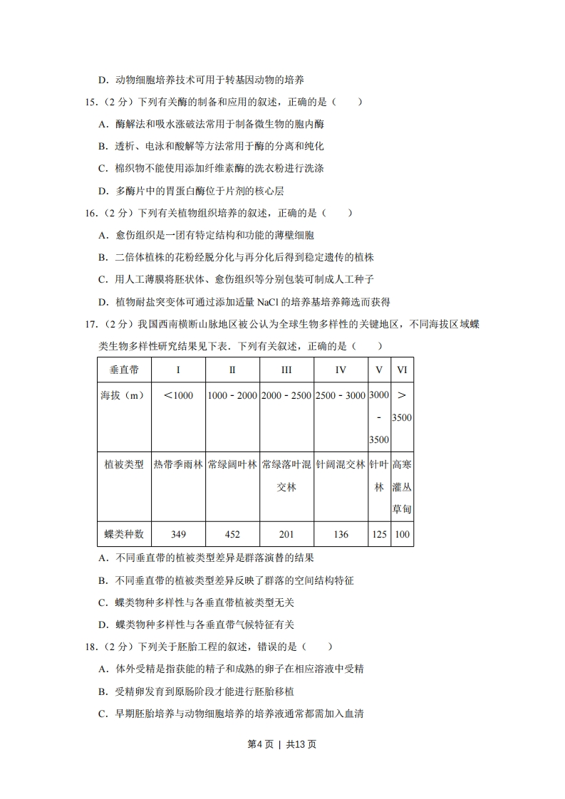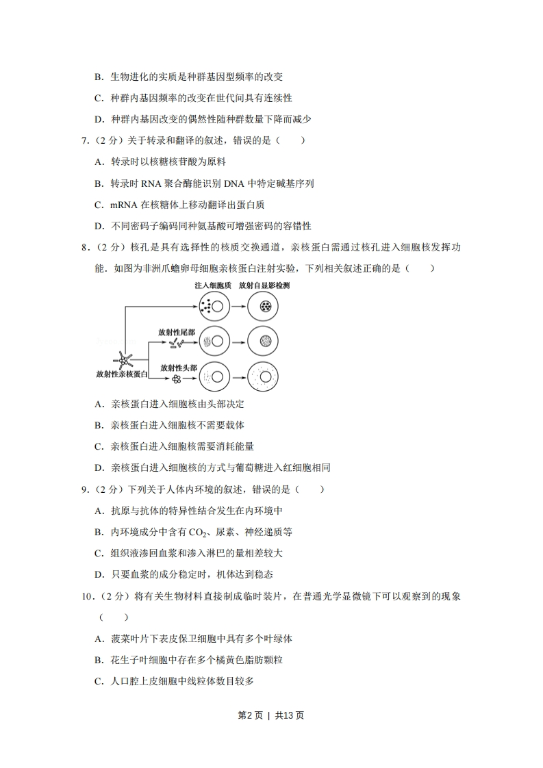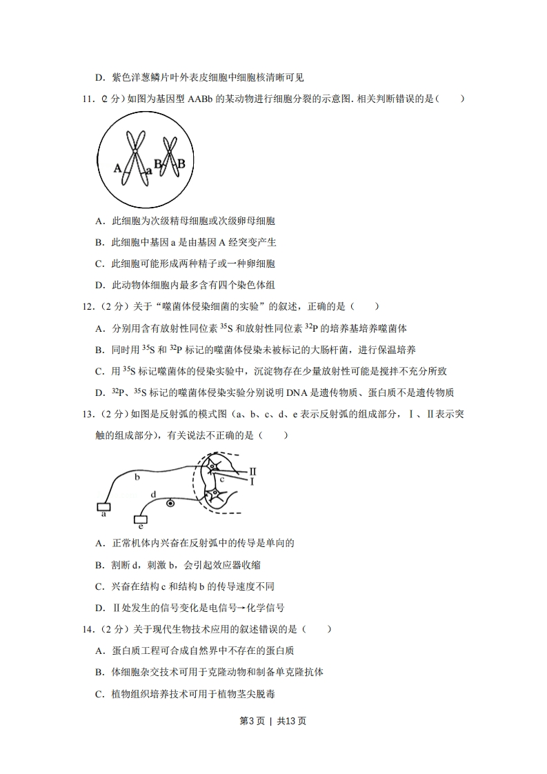 2011年江苏省高考生物试卷一、单项选择题:本部分包括20题,每题2分,共40分,每题只有一个选项最符合题意,1.(2分)下列物质合成时,需要模板的是()A.磷脂和蛋白质B.DNA和酶C.性激素和胰岛素D.神经递质和受体2.(2分)关于人体细胞结构和功能的叙述,正确的是()A.在细胞核内RNA能够传递和表达遗传信息B.核糖体是蛋白质合成和加工的主要场所C.线粒体内膜蛋白质和脂质的比值大于外膜D.高尔基体与有丝分裂过程中纺锤体形成有关3.(2分)下列与果酒、果醋和腐乳制作相关的叙述,正确的是()A.腐乳制作所需要的适宜温度最高B.果醋发酵包括无氧发酵和有氧发酵C.使用的菌种分别是酵母菌、醋酸菌、乳酸菌D.使用的菌种都具有细胞壁、核糖体、DNA和RNA4.(2分)某研究组获得了水稻的叶黄素缺失突变体.如将其叶片进行了红光照射光吸收测侧定和色素层析条带分析(从上至下),与正常叶片相比,推测实验结果是()A.光吸收差异显著,色素带缺第2条B.光吸收差异不显著,色素带缺第2条C.光吸收差异显著,色素带缺第3条D.光吸收差异不显著,色素带缺第3条5.(2分)关于人体细胞分化、衰老、调亡和癌变的叙述,正确的是()A,细胞分化导致基因选择性表达,细胞种类增多B.细胞衰老表现为酶活性降低,细胞核体积减小C.细胞调亡受基因控制,不利于个体生长发育D.细胞癌变导致细胞黏着性降低,易分散转移6.(2分)根据现代生物进化理论,下列说法正确的是()A.自然选择决定了生物变异和进化的方向第1页1共13页B.生物进化的实质是种群基因型频率的改变C.种群内基因频率的改变在世代间具有连续性D.种群内基因改变的偶然性随种群数量下降而减少7.(2分)关于转录和翻译的叙述,错误的是()A.转录时以核糖核苷酸为原料B.转录时RNA聚合酶能识别DNA中特定碱基序列C.mRNA在核糖体上移动翻译出蛋白质D.不同密码子编码同种氨基酸可增强密码的容错性8.(2分)核孔是具有选择性的核质交换通道,亲核蛋白需通过核孔进入细胞核发挥功能。如图为非洲爪蟾卵母细胞亲核蛋白注射实验,下列相关叙述正确的是()注人细胞质放射自显影检测國放射性尾部→一放射性头部放射性亲核蛋白→8·A,亲核蛋白进入细胞核由头部决定B.亲核蛋白进入细胞核不需要载体C.亲核蛋白进入细胞核需要消耗能量D.亲核蛋白进入细胞核的方式与葡萄糖进入红细胞相同9.(2分)下列关于人体内环境的叙述,错误的是()A.抗原与抗体的特异性结合发生在内环境中B.内环境成分中含有CO2、尿素、神经递质等C.组织液渗回血浆和渗入淋巴的量相差较大D.只要血浆的成分稳定时,机体达到稳态10.(2分)将有关生物材料直接制成临时装片,在普通光学显微镜下可以观察到的现象()A.菠菜叶片下表皮保卫细胞中具有多个叶绿体B.花生子叶细胞中存在多个橘黄色脂肪颗粒C.人口腔上皮细胞中线粒体数目较多第2页|共13页D.紫色洋葱鳞片叶外表皮细胞中细胞核清晰可见11.Q分)如图为基因型AABb的某动物进行细胞分裂的示意图.相关判断错误的是()A.此细胞为次级精母细胞或次级卵母细胞B.此细胞中基因a是由基因A经突变产生C.此细胞可能形成两种精子或一种卵细胞D.此动物体细胞内最多含有四个染色体组12.(2分)关于“噬菌体侵染细菌的实验”的叙述,正确的是()A.分别用含有放射性同位素35S和放射性同位素32P的培养基培养噬菌体B.同时用35S和2p标记的噬菌体侵染未被标记的大肠杆菌,进行保温培养C.用35S标记噬菌体的侵染实验中,沉淀物存在少量放射性可能是搅拌不充分所致D.2即、35S标记的噬菌体侵染实验分别说明DNA是遗传物质、蛋白质不是遗传物质l3.(2分)如图是反射弧的模式图(a、b、c、d、e表示反射弧的组成部分,I、Ⅱ表示突触的组成部分),有关说法不正确的是()A.正常机体内兴奋在反射弧中的传导是单向的B.割断d,刺激b,会引起效应器收缩C.兴奋在结构c和结构b的传导速度不同D.Ⅱ处发生的信号变化是电信号→化学信号14.(2分)关于现代生物技术应用的叙述错误的是()A,蛋白质工程可合成自然界中不存在的蛋白质B.体细胞杂交技术可用于克隆动物和制备单克隆抗体C.植物组织培养技术可用于植物茎尖脱毒第3页|共13页