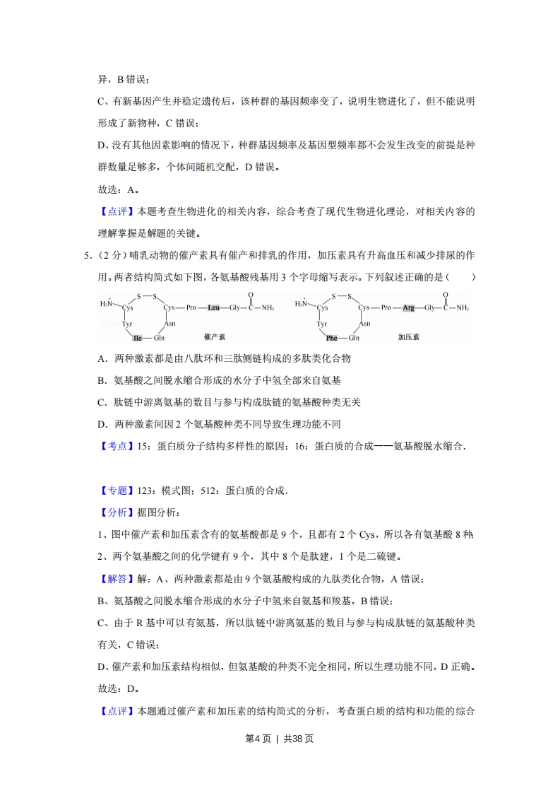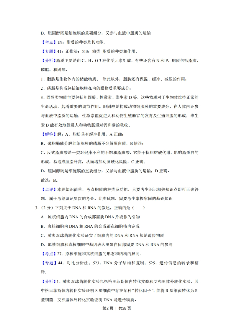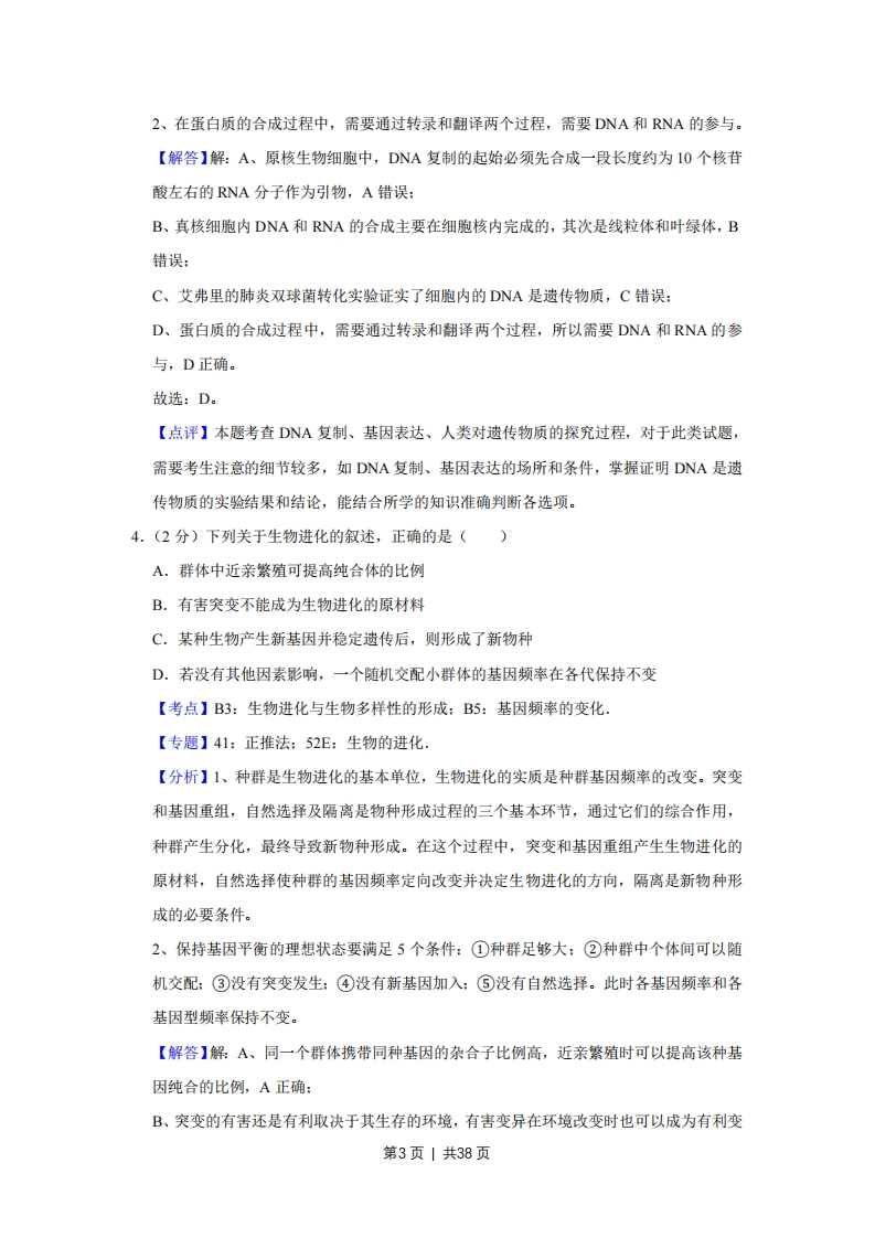 2018年江苏省高考生物试卷解析版◆考答案与试题解折一、单项选择题:本部分包括20题,每题2分,共计40分。每题只有一个选项最符合题意。1.(2分)下列关于糖类的叙述,正确的是()A.单糖可以被进一步水解为更简单的化合物B.构成淀粉、糖原和纤维素的单体均为果糖C.细胞识别与糖蛋白中蛋白质有关,与糖链无关D.糖类是大多数植物体干重中含量最多的化合物【考点】1:糖类的种类及其分布和功能【专题】41:正推法:513:糖类脂质的种类和作用.【分析】糖类是由C、H、O三种元素组成,分为:单糖、二糖、多糖。单糖中包括五碳糖和六碳糖,其中五碳糖中的核糖是RNA的组成部分,脱氧核糖是DNA的组成部分,而六碳糖中的葡萄糖被形容为“生命的燃料”,而核糖、脱氧核糖和葡萄糖是动植物细胞共有的糖:二糖包括麦芽糖、蔗糖和乳糖,其中麦芽糖和蔗糖是植物细胞中特有的,乳糖是动物体内特有的:多糖包括淀粉、纤维素和糖原,其中淀粉和纤维素是植物细胞特有的,糖原是动物细胞特有的。【解答】解:A、单糖是不能再被水解的糖,A错误:B、淀粉、糖原和纤维素都是由葡萄糖聚合形成的多聚体,B错误:C、细胞识别依赖于细胞表面的糖蛋白,糖蛋白是由蛋白质和糖类组成的,C错误:D、植物通过光合作用将二氧化碳和水合成糖类等有机物,并且植物细胞壁的结构成分也有糖类,因此大多数植物体干重中含量最多的化合物是糖类,D正确。故选:D。【点评】本题考查了糖类的分类、功能等相关知识,意在考查考生的识记能力,考生要识记和理解糖类的种类、功能以及动植物糖类的不同点等,这是解答此题的关键。2.(2分)脂质与人体健康息息相关,下列叙述错误的是()A.分布在内脏器官周围的脂肪具有缓冲作用B.蛇毒中的磷脂酶因水解红细胞膜蛋白而导致溶血C.摄入过多的反式脂肪酸会增加动脉硬化的风险第1页1共38页D.胆固醇既是细胞膜的重要组分,又参与血液中脂质的运输【考点】1N:脂质的种类及其功能,【专题】41:正推法:513:糖类脂质的种类和作用.【分析】脂质主要是由C、H、O3种化学元素组成,有些还含有N和P.脂质包括脂肪、磷脂、和固醇。1、脂肪是生物体内的储能物质。除此以外,脂肪还有保温、缓冲、减压的作用:2、磷脂是构成包括细胞膜在内的膜物质重要成分:3、固醇类物质主要包括胆固醇、性激素、维生素D等,这些物质对于生物体维持正常的生命活动,起着重要的调节作用。胆固醇是构成动物细胞膜的重要成分,在人体内还参与血液中脂质的运输:性激素能促进人和动物生殖器官的发育及生殖细胞的形成:维生素D能有效地促进人和动物肠道对钙和磷的吸收。【解答】解:A、脂肪具有缓冲作用,A正确:B、磷脂酶能分解红细胞膜的磷脂不分解蛋白质,B错误:C、反式脂肪酸是一类对健康不利的不饱和脂肪酸,它能干扰脂肪酸代谢,影响脂蛋白的形成,易造成血脂升高,从而增加动脉硬化风险,C正确:D、胆固醇既是细胞膜的重要组分,又参与血液中脂质的运输,D正确。故选:B。【点评】本题知识简单,考查脂质的种类及功能,只要考生识记相关知识点即可正确答题,属于考纲识记层次的考查。此类试题,需要考生掌握牢固的基础知识3.(2分)下列关于DNA和RNA的叙述,正确的是()A,原核细胞内DNA的合成都需要DNA片段作为引物B.真核细跑内DNA和RNA的合成都在细胞核内完成C.肺炎双球菌转化实验证实了细胞内的DNA和RNA都是遗传物质D.原核细胞和真核细胞中基因表达出蛋白质都需要DNA和RNA的参与【考点】27:原核细胞和真核细胞的形态和结构的异同.【专题】44:对比分析法:523:DNA分子结构和复制:525:遗传信息的转录和翻译【分析】1、肺炎双球菌转化实验包括格里菲斯体内转化实验和艾弗里体外转化实验,其中格里菲斯体内转化实验证明S型细菌中存在某种“转化因子”,能将R型细菌转化为S型细菌:艾弗里体外转化实验证明DNA是遗传物质。第2页|共38页2、在蛋白质的合成过程中,需要通过转录和翻译两个过程,需要DNA和RNA的参与。【解答】解:A、原核生物细胞中,DNA复制的起始必须先合成一段长度约为10个核苷酸左右的RNA分子作为引物,A错误:B、真核细胞内DNA和RNA的合成主要在细胞核内完成的,其次是线粒体和叶绿体,B错误:C、艾弗里的肺炎双球菌转化实验证实了细胞内的DNA是遗传物质,C错误:D、蛋白质的合成过程中,需要通过转录和翻译两个过程,所以需要DNA和RNA的参与,D正确。故选:D【点评】本题考查DNA复制、基因表达、人类对遗传物质的探究过程,对于此类试题,需要考生注意的细节较多,如DNA复制、基因表达的场所和条件,掌握证明DNA是遗传物质的实验结果和结论,能结合所学的知识准确判断各选项。4.(2分)下列关于生物进化的叙述,正确的是()A.群体中近亲繁殖可提高纯合体的比例B.有害突变不能成为生物进化的原材料C.某种生物产生新基因并稳定遗传后,则形成了新物种D.若没有其他因素影响,一个随机交配小群体的基因频率在各代保持不变【考点】B3:生物进化与生物多样性的形成:B5:基因频率的变化【专题】41:正推法:52E:生物的进化【分析】1、种群是生物进化的基本单位,生物进化的实质是种群基因频率的改变。突变和基因重组,自然选择及隔离是物种形成过程的三个基本环节,通过它们的综合作用,种群产生分化,最终导致新物种形成。在这个过程中,突变和基因重组产生生物进化的原材料,自
