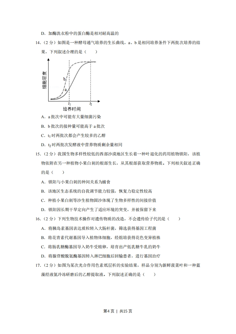 2019年江苏省高考生物试卷一、单项选择题:本部分包括20题,每题2分,共计40分。每题只有一个选项最符合题意。1.(2分)下列关于细胞内蛋白质和核酸的叙述,正确的是()A.核酸和蛋白质的组成元素相同B.核酸的合成需要相应蛋白质的参与C.蛋白质的分解都需要核酸的直接参与D.高温会破坏蛋白质和核酸分子中肽键2.(2分)下列关于细胞生命活动的叙述,错误的是()A,细胞分裂间期既有基因表达又有DNA复制B.细胞分化要通过基因的选择性表达来实现C.细胞调亡由程序性死亡相关基因的表达所启动D.细胞癌变由与癌有关基因的显性突变引起3.(2分)赫尔希和蔡斯的T2噬菌体侵染大肠杆菌实验证实了DNA是遗传物质,下列关于该实验的叙述正确的是()A.实验中可用15N代替2p标记DNAB.噬菌体外壳蛋白是大肠杆菌编码的C.噬菌体DNA的合成原料来自大肠杆菌D.实验证明了大肠杆菌的遗传物质是DNA4.(2分)下列关于生物变异与育种的叙述,正确的是()A.基因重组只是基因间的重新组合,不会导致生物性状变异B.基因突变使DNA序列发生的变化,都能引起生物性状变异C.弱小且高度不育的单倍体植株,进行加倍处理后可用于育种D.多倍体植株染色体组数加倍,产生的配子数加倍,有利于育种5.(2分)如图为燕麦胚芽鞘经过单侧光照射后,甲、乙两侧的生长情况,对照组未经单侧光处理。下列叙述正确的是()第1页|共15页1.2甲1.00.8对照0.6毋0.4乙0.2020406080100120时间(min)A,甲为背光侧,AA含量低于乙侧和对照组B.对照组的燕麦胚芽鞘既不生长也不弯曲C.若光照前去除尖端,甲、乙两侧的生长状况基本一致D.IAA先极性运输到尖端下部再横向运输6.(2分)下列关于种群和群落的叙述,正确的是()A.种群是生物进化的基本单位,种群内出现个体变异是普遍现象B.退耕还林、退塘还湖、布设人工鱼礁之后都会发生群落的初生演替C.习性相似物种的生活区域重叠得越多,对资源的利用越充分D.两只雄孔雀为吸引异性争相开屏,说明行为信息能够影响种间关系7.(2分)下列关于观察植物细胞有丝分裂实验的叙述,正确的是()A.只有从新生的根尖上取材,才能观察到有丝分裂B.解离时间要尽量长,以确保根尖组织细胞充分分离C.滴加清水、弄碎根尖以及压片都有利于细胞的分散D.临时装片镜检时,视野中最多的是处于分裂中期的细跑8.(2分)如图为突触传递示意图,下列叙述错误的是()轴突突触间隙①③离子通道树突A.①和(③都是神经元细胞膜的一部分B.②进入突触间隙需消耗能量C.②发挥作用后被快速清除第2页|共15页D.②与④结合使③的膜电位呈外负内正9.(2分)下列关于传统发酵技术应用的叙述,正确的是()A,利用乳酸菌制作酸奶过程中,先通气培养,后密封发酵B.家庭制作果酒、果醋和腐乳通常都不是纯种发酵C.果醋制作过程中发酵液pH逐渐降低,果酒制作过程中情况相反D.毛霉主要通过产生脂肪酶、蛋白酶和纤维素酶参与腐乳发酵10.(2分)下列关于DNA粗提取与鉴定的叙述,错误的是()A.用同样方法从等体积兔血和鸡血中提取的DNA量相近B.DNA析出过程中,搅拌操作要轻柔以防DNA断裂C.预冷的乙醇可用来进一步纯化粗提的DNAD.用二苯胺试剂鉴定DNA需要进行水浴加热11.2分)如图为初级精母细胞减数分裂时的一对同源染色体示意图,图中1一8表示基因。不考虑突变的情况下,下列叙述正确的是()A.1与2、3、4互为等位基因,与6、7、8互为非等位基因B.同一个体的精原细胞有丝分裂前期也应含有基因1一8C.1与3都在减数第一次分裂分离,1与2都在减数第二次分裂分离D.1分别与6、7、8组合都能形成重组型的配子12.(2分)下列关于微生物实验操作的叙述,错误的是()A.培养微生物的试剂和器具都要进行高压蒸汽灭菌B.接种前后,接种环都要在酒精灯火焰上进行灼烧C.接种后的培养皿要倒置,以防培养污染D.菌种分离和菌落计数都可以使用固体培养基13.(2分)下列关于加酶洗涤剂的叙述,错误的是()A.加酶洗衣粉中一般都含有酸性脂肪酶B.用加酶洗涤剂能减少洗涤时间并节约用水C.含纤维素酶洗涤剂可以洗涤印花棉织物第3页|共15页