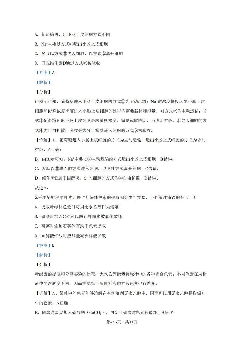 2020年江苏省高考生物试卷一、单项选择题1.下列关于细胞中无机化合物的叙述,正确的是()A.自由水是生化反应的介质,不直接参与生化反应B.结合水是细胞结构的重要组成成分,主要存在于液泡中C.无机盐参与维持细胞的酸碱平衡,不参与有机物的合成D.无机盐多以离子形式存在,对维持生命活动有重要作用【答案】D【解析】【分析】水在细胞中以两种形式存在:一部分水与细胞内的其他物质相结合,为结合水:绝大部分以游离的形式存在,可以流动,为自由水,参与细胞中各种代谢活动。细胞中的无机盐含量比较少,但具有重要的生理功能,如很多无机盐与蛋白质等物质结合成复杂的化合物,参与细胞中各种生命活动,当某些无机盐含量过多或过少时,生物体可能出现相应病症。【详解】A、自由水是生化反应的介质,有些水还直接作为反应物参与生物化学反应,如有氧呼吸,A错误:B、结合水是组成细胞结构的重要成分,主要存在形式是水与蛋白质、多糖等物质结合,成为生物体的构成成分,而液泡中的水属于自由水,B错误:C、D、细胞中大多数无机盐以离子的形式存在,对维持细胞和生物体的生命活动有重要作用,能参与维持细胞的酸碱平衡,也能参与有机物的合成,如Mg2+是合成叶绿素的原料,C错误、D正确。故选D。2.下列关于细胞中生物大分子的叙述,错误的是()A.碳链是各种生物大分子的结构基础B.糖类、脂质、蛋白质和核酸等有机物都是生物大分子C.细胞利用种类较少的小分子脱水合成种类繁多的生物大分子D.细胞中生物大分子的合成需要酶来催化【答案】B第-1-页1共32页【解析】【分析】在构成细胞的化合物中,多糖、蛋白质、核酸都是生物大分子,生物大分子是由许多单体连接成的多聚体,每一个单体都以若干个相连的碳原子构成的碳链为基本骨架。【详解】A、生物大分子都是以碳链为基本骨架,A正确:B、糖类中的单糖、二糖和脂质不属于生物大分子,B错误:C、细胞中利用种类较少的小分子(单体)脱水缩合成种类繁多的生物大分子(多聚体),如许多氨基酸分子脱水缩合后通过肽键相连形成蛋白质,C正确:D、生物大分子的合成过程一般需要酶催化,D正确。故选B。3.下列关于真核细胞的结构与功能的叙述,正确的是()A.根据细胞代谢需要,线粒体可在细胞质基质中移动和增殖B.细胞质基质、线粒体基质和叶绿体基质所含核酸的种类相同C.人体未分化的细胞中内质网非常发达,而胰腺外分泌细胞中则较少D.高尔基体与分泌蛋白的合成、加工、包装和膜泡运输紧密相关【答案】A【解析】【分析】细胞在生命活动中发生着物质和能量的复杂变化,细胞内含有多种细胞器,各种细胞器的形态、结构不同,在功能上也各有分工。解答本题需要掌握细胞内各种细胞器的结构和功能特性,然后分析选项中的关键点逐一判断。【详解】A、线粒体是细胞的“动力车间”,根据细胞代谢的需要,线粒体可以在细胞质基质中移动和增殖,A正确:B、细胞跑质基质中含有RNA,不含DNA,而线粒体基质和叶绿体基质中含有DNA和RNA,所含核酸种类不同,B错误:C、内质网是蛋白质等大分子物质合成、加工的场所和运输通道,在未分化的细胞中数量较少,而胰腺外分泌细胞由于能合成并分泌含消化酶的胰液,细胞中的内质网数量较多,C错误:D、分泌蛋白是在附着在内质网上的核糖体上合成的,高尔基体与分泌蛋白的加工、包装和膜泡运输紧密相关,D错误。第-2-页1共32页故选A。4.下列关于细胞生命活动的叙述,正确的是()A.高度分化的细胞执行特定的功能,不能再分裂增殖B.癌变细胞内发生变异的基因都不再表达C.正常组织细胞在体外长时间培养,一般会走向衰老D.调亡细胞内有活跃的基因表达,主动引导走向坏死【答案】C【解析】【分析】细胞分化是由一个或一种细胞增殖产生的后代,在形态、结构和生理功能上发生稳定性差异的过程。细胞中与癌有关的基因包括原癌基因和抑癌基因,原癌基因主要负责调节细胞周期,控制细胞生长和分裂的进程,抑癌基因主要阻止细胞的不正常增殖。细胞衰老是自然界的正常现象,其过程是细胞的形态结构和化学反应发生复杂变化的过程。细胞调亡是由基因决定的细胞自动结束生命的过程。【详解】A、高度分化的细胞能执行特定的功能,但也可能继续分裂增殖,如性原细胞能进行有丝分裂和减数分裂,A错误:B、癌变细胞是由原癌基因和抑癌基因发生突变,导致正常细胞的生长和分裂失控而形成,发生突变的基因仍能表达,B错误:C、正常组织细胞在体外长时间培养,细胞分裂达到一定次数后一般都会走向衰老,C正确:D、细胞调亡是由基因控制的程序性死亡,细胞坏死与细胞调亡不同,它是在种种不利因素影响下,由于细胞正常代谢活动受损或中断引起的细胞损伤和死亡,D错误。故选C。5.图①~⑤表示物质进、出小肠上皮细胞的几种方式,下列叙述正确的是()图例0葡萄糖。多肽水粗织液●第-3-页1共32页