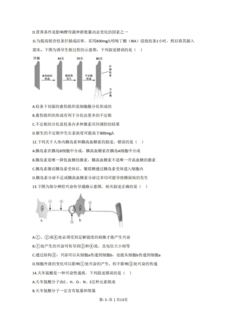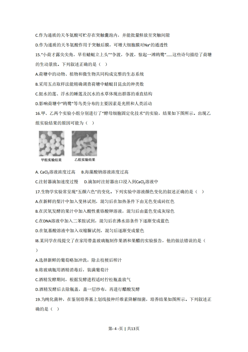 2020年江苏省高考生物试卷一、单项选择题:本部分包括20题,每题2分,共计40分。每题只有一个选项最符合题意。1.下列关于细胞中无机化合物的叙述,正确的是()A.自由水是生化反应的介质,不直接参与生化反应B.结合水是细胞结构的重要组成成分,主要存在于液泡中C无机盐参与维持细胞的酸碱平衡,不参与有机物的合成D.无机盐多以离子形式存在,对维持生命活动有重要作用2.下列关于细胞中生物大分子的叙述,错误的是()A.碳链是各种生物大分子的结构基础B糖类、脂质、蛋白质和核酸等有机物都是生物大分子C细胞利用种类较少的小分子脱水合成种类繁多的生物大分子D.细胞中生物大分子的合成需要酶来催化3.下列关于真核细胞的结构与功能的叙述,正确的是()A根据细胞代谢需要,线粒体可在细胞质基质中移动和增殖B.细胞质基质、线粒体基质和叶绿体基质所含核酸的种类相同C人体未分化的细胞中内质网非常发达,而胰腺外分泌细胞中则较少D.高尔基体与分泌蛋白的合成、加工、包装和膜泡运输紧密相关4.下列关于细胞生命活动的叙述,正确的是()A.高度分化的细胞执行特定的功能,不能再分裂增殖B.癌变细胞内发生变异的基因都不再表达C正常组织细胞在体外长时间培养,一般会走向衰老D.调亡细胞内有活跃的基因表达,主动引导走向坏死5.如图①⑤表示物质进、出小肠上皮细胞的几种方式,下列叙述正确的是()图例0葡萄糖上皮多肽②●00③第-1-页1共13页A葡萄糖进、出小肠上皮细胞方式不同B.Na+主要以方式③运出小肠上皮细胞C多肽以方式⑤进入细胞,以方式②离开细胞D.口服维生素D通过方式⑤被吸收6.采用新鲜菠菜叶片开展“叶绿体色素的提取和分离”实验,下列叙述错误的是()A提取叶绿体色素时可用无水乙醇作为溶剂B.研磨时加入CaO可以防止叶绿素被氧化破坏C研磨时添加石英砂有助于色素提取D.画滤液细线时应尽量减少样液扩散7有一观赏鱼品系体色为桔红带黑斑,野生型为橄榄绿带黄斑,该性状由一对等位基因控制。某养殖者在繁殖桔红带黑斑品系时发现,后代中23为桔红带黑斑,1/3为野生型性状,下列叙述错误的是()A桔红带黑斑品系的后代中出现性状分离,说明该品系为杂合子B.突变形成的桔红带黑斑基因具有纯合致死效应C自然繁育条件下,桔红带黑斑性状容易被淘汰D.通过多次回交,可获得性状不再分离的桔红带黑斑品系8.下列叙述中与染色体变异无关的是()A通过孕妇产前筛查,可降低21三体综合征的发病率B.通过连续自交,可获得纯合基因品系玉米C通过植物体细胞杂交,可获得白菜-甘蓝D.通过普通小麦和黑麦杂交,培育出了小黑麦9.某膜蛋白基因在其编码区的5端含有重复序列cTCT工CTCⅡCTCT工,下列叙述正确的是()A.CTCTT重复次数改变不会引起基因突变B.CTCT重复次数增加提高了该基因中嘧啶碱基的比例C若CTCTT重复6次,则重复序列之后编码的氨基酸序列不变D.CTCT重复次数越多,该基因编码的蛋白质相对分子质量越大10.下列关于“探究培养液中酵母菌种群数量的动态变化”实验的叙述,错误的是()A.将酵母菌接种到培养液中,并进行第一次计数B.从静置的培养液中取适量上清液,用血细胞计数板计数C每天定时取样,测定酵母菌细胞数量,绘制种群数量动态变化曲线第-2-页1共13页D.营养条件是影响酵母菌种群数量动态变化的因素之一1山.为提高银杏枝条扦插成活率,采用800mg/L吲哚丁酸(IBA)浸泡枝条1小时,然后将其插入苗床。下图为诱导生根过程的示意图,下列叙述错误的是()扦插40天50天80天托根原恭不定根形成发生形诚不A枝条下切面的愈伤组织是细胞脱分化形成的B.愈伤组织的形成有利于分化出更多的不定根C.不定根的分化是枝条内多种激素共同调控的结果D.新生的不定根中生长素浓度可能高于800mgL12.下列关于人体内胰岛素和胰高血糖素的叙述,错误的是()A胰岛素在胰岛B细胞中合成,胰高血糖素在胰岛A细胞中合成B.胰岛素是唯一降低血糖的激素,胰高血糖素不是唯一升高血糖的激素C胰岛素激活胰岛素受体后,葡萄糖通过胰岛素受体进入细胞内D.胰岛素分泌不足或胰高血糖素分泌过多均可能导致糖尿病的发生13.下图为部分神经兴奋传导通路示意图,相关叙述正确的是()A.①、②或④处必须受到足够强度的刺激才能产生兴奋B.①处产生的兴奋可传导到②和④处,且电位大小相等C通过结构③,兴奋可以从细胞a传递到细胞b,也能从细胞b传递到细胞aD.细胞外液的变化可以影响①处兴奋的产生,但不影响③处兴奋的传递14.天冬氨酸是一种兴奋性递质,下列叙述错误的是()A.天冬氨酸分子由C、H、O、N、S五种元素组成B.天冬氨酸分子一定含有氨基和羧基第-3-页1共13页