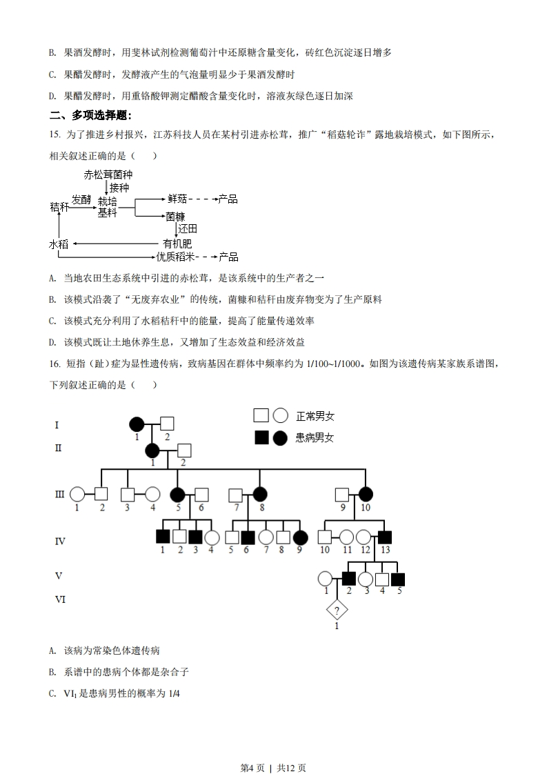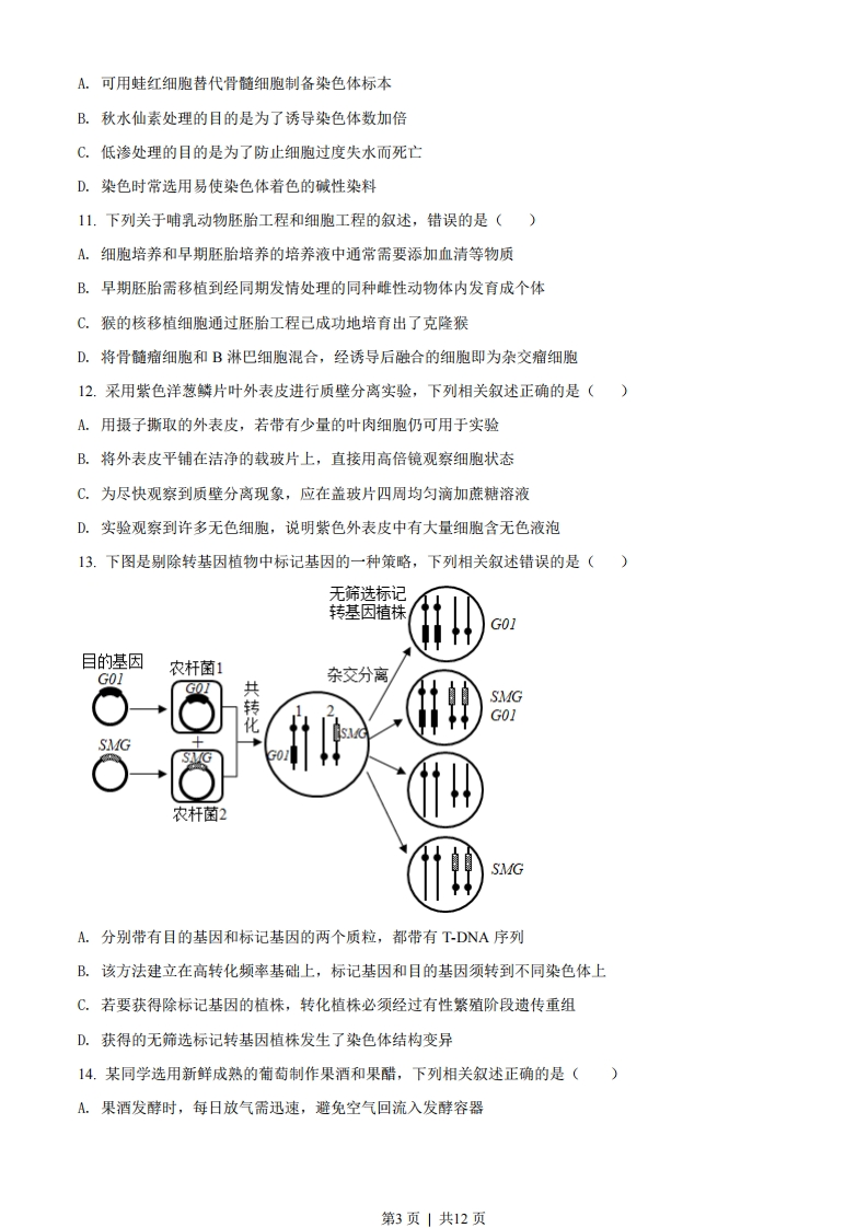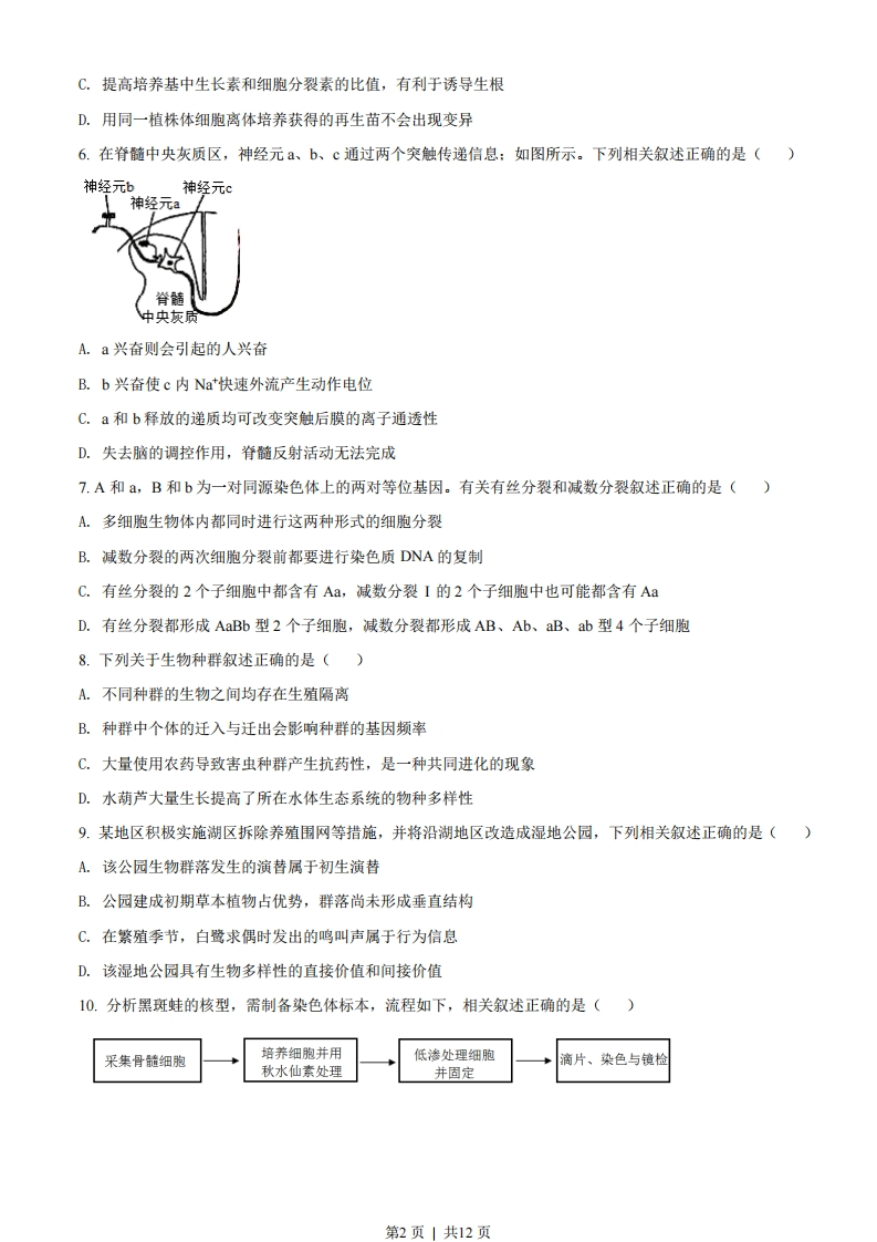 生物一、单项选择题:1.核酸和蛋白质都是重要的生物大分子,下列相关叙述错误的是()A.组成元素都有C、H、O、NB.细胞内合成新的分子时都需要模板C.在细胞质和细胞核中都有分布D.高温变性后降温都能缓慢复性2.下列关于人体细胞生命历程的叙述正确的是()A.组织细胞的更新包括细胞分裂、分化等过程B.造血干细胞是胚胎发育过程中未分化的细胞C.细胞分化使各种细胞的遗传物质发生改变D.调亡细胞被吞噬细胞清除属于细胞免疫3.细胞可运用不同的方式跨膜转运物质,下列相关叙述错误的是()A.物质自由扩散进出细胞的速度既与浓度梯度有关,也与分子大小有关B.小肠上皮细胞摄入和运出葡萄糖与细胞质中各种溶质分子的浓度有关C.神经细胞膜上运入K+的载体蛋白和运出K+的通道蛋白都具有特异性D.肾小管上皮细胞通过主动运输方式重吸收氨基酸4.如图表示人体胃肠激素的不同运输途径,相关叙述正确的是()A.胃肠激素都在内环境中发挥作用B.内分泌腺细胞不可能是自身激素作用的靶细胞C.图中组织液含有激素,淋巴因子、尿素等物质D.不同胃肠激素的作用特异性主要取决于不同的运输途径5.植物组织培养技术常用于商业化生产:其过程一般为:无菌培养物的建立→培养物增殖→生根培养→试管苗移栽及鉴定。下列相关叙述错误的是()A.为获得无菌培养物,外植体要消毒处理后才可接种培养B.组织培养过程中也可无明显愈伤组织形成,直接形成胚状体等结构第1页」共12页C.提高培养基中生长素和细胞分裂素的比值,有利于诱导生根D.用同一植株体细胞离体培养获得的再生苗不会出现变异6.在脊髓中央灰质区,神经元a、b、c通过两个突触传递信息:如图所示。下列相关叙述正确的是()神经元b神经元c神经元a脊髓中央灰质A.a兴奋则会引起的人兴奋B.b兴奋使c内Na快速外流产生动作电位C.a和b释放的递质均可改变突触后膜的离子通透性D.失去脑的调控作用,脊髓反射活动无法完成7.A和a,B和b为一对同源染色体上的两对等位基因。有关有丝分裂和减数分裂叙述正确的是()A.多细胞生物体内都同时进行这两种形式的细胞分裂B.减数分裂的两次细胞分裂前都要进行染色质DNA的复制C.有丝分裂的2个子细胞中都含有Aa,减数分裂I的2个子细胞中也可能都含有AaD.有丝分裂都形成AaBb型2个子细胞,减数分裂都形成AB、Ab、aB、ab型4个子细胞8.下列关于生物种群叙述正确的是()A.不同种群的生物之间均存在生殖隔离B.种群中个体的迁入与迁出会影响种群的基因频率C.大量使用农药导致害虫种群产生抗药性,是一种共同进化的现象D.水葫芦大量生长提高了所在水体生态系统的物种多样性9.某地区积极实施湖区拆除养殖围网等措施,并将沿湖地区改造成湿地公园,下列相关叙述正确的是()A.该公园生物群落发生的演替属于初生演替B.公园建成初期草本植物占优势,群落尚未形成垂直结构C.在繁殖季节,白鹭求偶时发出的鸣叫声属于行为信息D.该湿地公园具有生物多样性的直接价值和间接价值10.分析黑斑蛙的核型,需制备染色体标本,流程如下,相关叙述正确的是()采集骨髓细胞培养细胞并用低渗处理细胞滴片、染色与镜检秋水仙素处理并固定第2页|共12页A.可用蛙红细胞替代骨髓细胞制备染色体标本B.秋水仙素处理的目的是为了诱导染色体数加倍C.低渗处理的目的是为了防止细胞过度失水而死亡D.染色时常选用易使染色体着色的碱性染料11.下列关于哺乳动物胚胎工程和细胞工程的叙述,错误的是()A.细胞培养和早期胚胎培养的培养液中通常需要添加血清等物质B.早期胚胎需移植到经同期发情处理的同种雌性动物体内发育成个体C.猴的核移植细胞通过胚胎工程已成功地培育出了克隆猴D.将骨髓瘤细胞和B淋巴细胞混合,经诱导后融合的细胞即为杂交瘤细胞12.采用紫色洋葱鳞片叶外表皮进行质壁分离实验,下列相关叙述正确的是()A.用摄子撕取的外表皮,若带有少量的叶肉细胞仍可用于实验B.将外表皮平铺在洁净的载玻片上,直接用高倍镜观察细胞状态C.为尽快观察到质壁分离现象,应在盖玻片四周均匀滴加蔗糖溶液D.实验观察到许多无色细胞,说明紫色外表皮中有大量细胞含无色液泡13.下图是剔除转基因植物中标记基因的一种策略,下列相关叙述错误的是()无筛选标记转基因植株G01目的基因农杆菌1G01杂交分离GOI共SMGG01SMGG01农杆菌2SMGA.分别带有目的基因和标记基因的两个质粒,都带有TDNA序列B.该方法建立在高转化频率基础上,标记基因和目的基因须转到不同染色体上C.若要获得除标记基因的植株,转化植株必须经过有性繁殖阶段遗传重组D.获得的无筛选标记转基因植株发生了染色体结构变异14.某同学选用新鲜成熟的葡萄制作果酒和果醋,下列相关叙述正确的是()A.果酒发酵时,每日放气需迅速,避免空气回流入发酵容器第3页|共12页