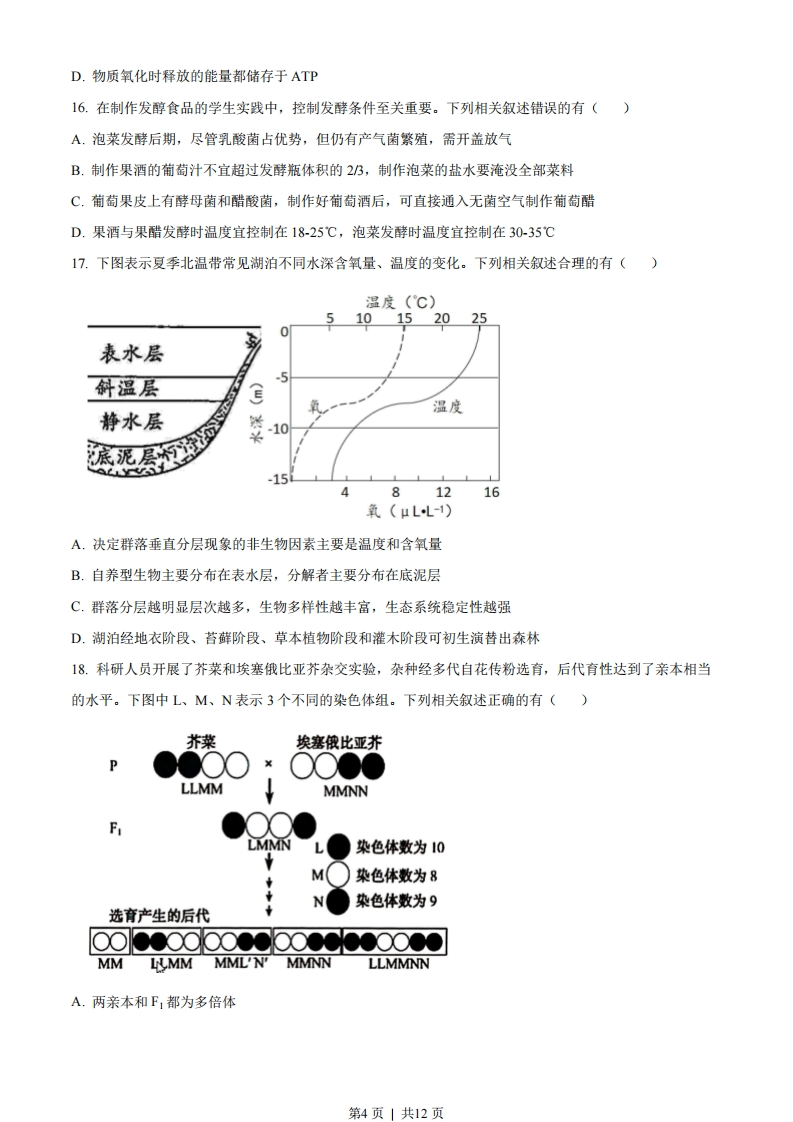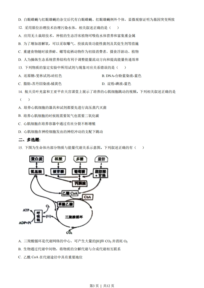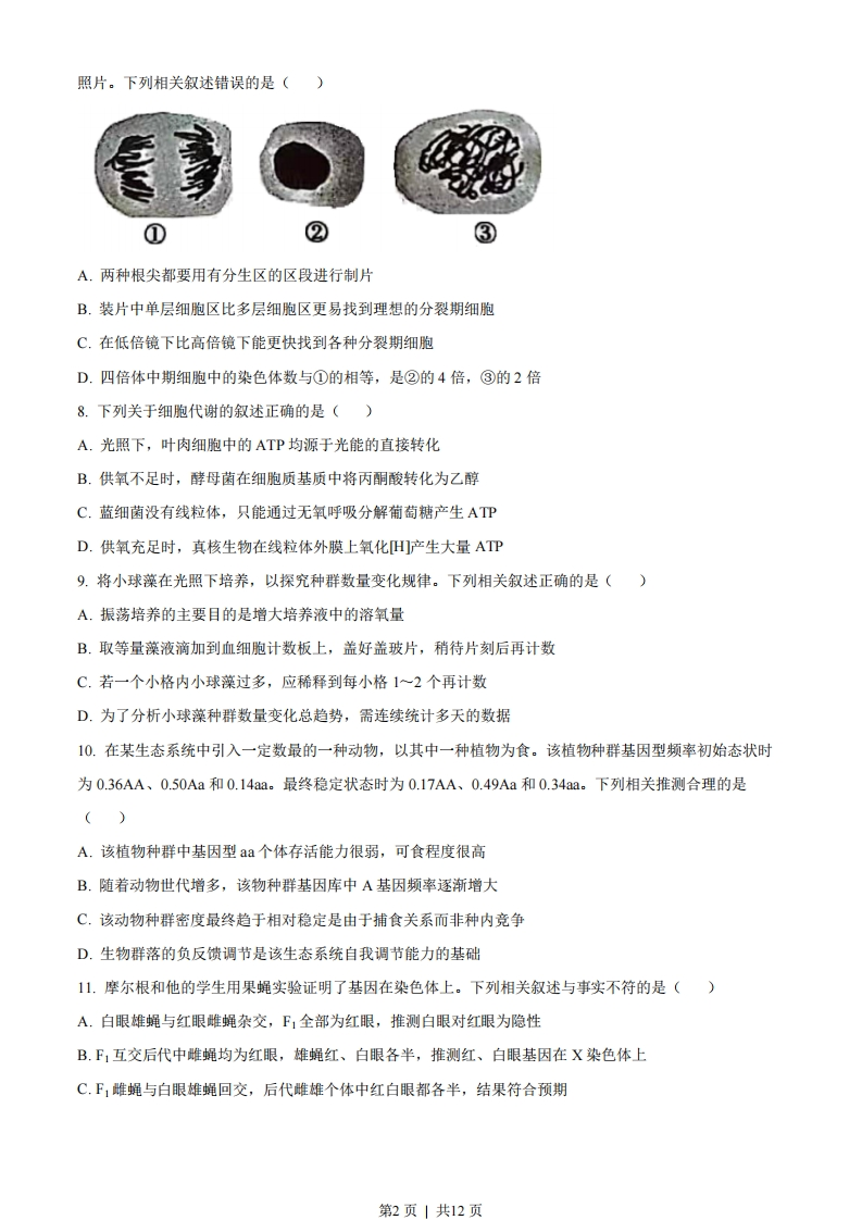 2022生物卷(江苏)一、单项选择题:1.下列各组元素中,大量参与组成线粒体内膜的是()A.O、P、NB.C、N、SiC.S、P、CaD.N、P、Na2.下列关于细胞生命历程的叙述正确的是()A.胚胎干细胞为未分化细胞,不进行基因选择性表达B.成人脑神经细胞衰老前后,代谢速率和增殖速率都由快变慢C.刚出生不久的婴儿体内也会有许多细胞发生调亡D.只有癌细胞中能同时发现突变的原癌基因和抑癌基因3.下列是某同学分离高产脲酶菌的实验设计,不合理的是()A.选择农田或公园土壤作为样品分离目的菌株B.在选择培养基中需添加尿素作为唯一氮源C.适当稀释样品是为了在平板上形成单菌落D.可分解酚红指示剂使其褪色的菌株是产脲酶菌4.下列关于动物细胞工程和胚胎工程的叙述正确的是()A.通常采用培养法或化学诱导法使精子获得能量后进行体外受精B.哺乳动物体外受精后的早期胚胎培养不需要额外提供营养物质C.克隆牛技术涉及体细胞核移植、动物细胞培养、胚胎移植等过程D.将小鼠桑葚胚分割成2等份获得同卵双胎的过程属于有性生殖5.下列有关实验方法的描述合理的是()A.将一定量胡萝卜切碎,加适量水、石英砂,充分研磨,过滤,获取胡萝卜素提取液B.适当浓度蔗糖溶液处理新鲜黑藻叶装片,可先后观察到细胞质流动与质壁分离现象C.检测侧样品中的蛋白质时,须加热使双缩脲试剂与蛋白质发生显色反应D.用溴麝香草酚蓝水溶液检测发酵液中酒精含量的多少,可判断酵母菌的呼吸方式6.采用基因工程技术调控植物激素代谢,可实现作物改良。下列相关叙述不合理的是()A.用特异启动子诱导表达iaaM(生长素合成基因)可获得无子果实B.大量表达p(细胞分裂素合成关键基因)可抑制芽的分化C.提高g2ox(氧化赤霉素的酶基因)的表达水平可获得矮化品种D.在果实中表达acs(乙烯合成关键酶基因)的反义基因可延迟果实成熟7.培养获得二倍体和四倍体洋葱根尖后,分别制作有丝分裂装片,镜检、观察。下图为二倍体根尖细胞的第1页|共12页照片。下列相关叙述错误的是()①②A.两种根尖都要用有分生区的区段进行制片B.装片中单层细胞区比多层细胞区更易找到理想的分裂期细胞C.在低倍镜下比高倍镜下能更快找到各种分裂期细胞D.四倍体中期细胞中的染色体数与①的相等,是②的4倍,③的2倍8.下列关于细胞代谢的叙述正确的是()A.光照下,叶肉细胞中的ATP均源于光能的直接转化B.供氧不足时,酵母菌在细胞质基质中将丙酮酸转化为乙醇C.蓝细菌没有线粒体,只能通过无氧呼吸分解葡萄糖产生ATPD.供氧充足时,真核生物在线粒体外膜上氧化H产生大量ATP9.将小球藻在光照下培养,以探究种群数量变化规律。下列相关叙述正确的是()A.振荡培养的主要目的是增大培养液中的溶氧量B.取等量藻液滴加到血细胞计数板上,盖好盖玻片,稍待片刻后再计数C.若一个小格内小球藻过多,应稀释到每小格1~2个再计数D.为了分析小球藻种群数量变化总趋势,需连续统计多天的数据10.在某生态系统中引入一定数最的一种动物,以其中一种植物为食。该植物种群基因型频率初始态状时为0.36AA、0.50Aa和0.14aa。最终稳定状态时为0.17AA、0.49Aa和0.34aa。下列相关推测合理的是()A.该植物种群中基因型aa个体存活能力很弱,可食程度很高B.随着动物世代增多,该物种群基因库中A基因频率逐渐增大C.该动物种群密度最终趋于相对稳定是由于捕食关系而非种内竞争D.生物群落的负反馈调节是该生态系统自我调节能力的基础11.摩尔根和他的学生用果蝇实验证明了基因在染色体上。下列相关叙述与事实不符的是()A.白眼雄蝇与红眼雌蝇杂交,F1全部为红眼,推测白眼对红眼为隐性B.F,互交后代中雌蝇均为红眼,雄蝇红、白眼各半,推测红、白眼基因在X染色体上C.F,雌蝇与白眼雄蝇回交,后代雌雄个体中红白眼都各半,结果符合预期第2页|共12页D.白眼雌蝇与红眼雄蝇的杂交后代有白眼雌蝇、红眼雄蝇例外个体,显微观察证明为基因突变所致12.采用原位治理技术治理污染水体,相关叙述正确的是()A.应用无土栽培技术,种植的生态浮床植物可吸收水体营养和富集重金属B.为了增加溶解氧,可以采取曝气、投放高效功能性菌剂及其促生剂等措施C.重建食物链时放养蚌、螺等底栖动物作为初级消费者,摄食浮游动、植物D.人为操纵生态系统营养结构有利于调整能量流动方向和提高能量传递效率13.下列物质的鉴定实验中所用试剂与现象对应关系错误的是()A.还原糖斐林试剂-砖红色B.DNA-台盼蓝染液-蓝色C.脂肪-苏丹Ⅲ染液橘黄色D.淀粉-碘液-蓝色14.航天员叶光富和王亚平在天宫课堂上展示了培养的心肌细胞跳动的视频。下列相关叙述正确的是()A.培养心肌细胞的器具和试剂都要先进行高压蒸汽灭菌B.培养心肌细胞的时候既需要氧气也需要二氧化碳C.心肌细胞在培养容器中通过有丝分裂不断增殖D.心肌细胞在神经细胞发出的神经冲动的支配下跳动二、多选题:15.下图为生命体内部分物质与能量代谢关系示意图。下列叙述正确的有()蛋白质三酸环A.三羧酸循环是代谢网络的中心,可产生大量的H和CO2并消耗O2B.生物通过代谢中间物,将物质的分解代谢与合成代谢相互联系C.乙酰CoA在代谢途径中具有重要地位第3页」共12页