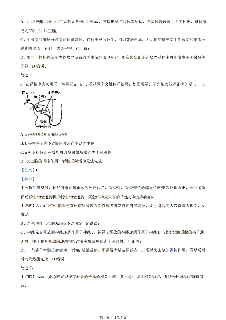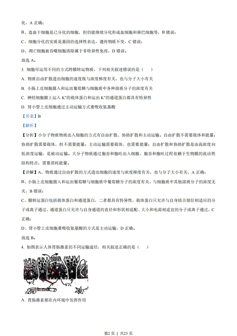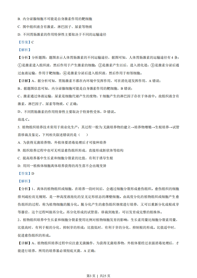 生物一、单项选择题:1.核酸和蛋白质都是重要的生物大分子,下列相关叙述错误的是()A.组成元素都有C、H、O、NB.细胞内合成新的分子时都需要模板C.在细胞质和细胞核中都有分布D.高温变性后降温都能缓慢复性【答案】D【解析】【分析】1、蛋白质是生命活动的主要承担者,构成蛋白质的基本单位是氨基酸,蛋白质的结构多样,在细胞中承担的功能也多样。2、核酸是遗传信总的携带者、其基本构成单位是核苷酸,核酸根据所含五碳糖的不同分为DNA和RNA,核酸对于生物的遗传变异和蛋白质在的生物合成中具有重要作用,不同生物的核酸中的遗传信息不同。【详解】A、核酸的组成元素为C、H、O、N、P,蛋白质的组成元素为C、H、O、N,故组成元素都有C、H、O、N,A正确:B、核酸和蛋白质的合成都需要模板。合成DNA以DNA分子的两条链为模板,合成RNA以DNA的一条链为模板,合成蛋白质以mRNA为模板,B正确:C、核酸和蛋白质在细胞质和细胞核中都有分布,DNA主要分布在细胞核中,RNA主要分布在细胞质中,C正确:D、DNA经高温变性后降温能缓慢复性,蛋白质经高温变性后,降温不能复性,D错误。故选D。2.下列关于人体细胞生命历程的叙述正确的是()A.组织细胞的更新包括细胞分裂、分化等过程B.造血干细胞是胚胎发育过程中未分化的细胞C.细胞分化使各种细胞的遗传物质发生改变D.凋亡细胞被吞噬细胞清除属于细胞免疫【答案】A【解析】【分析】细胞分化是指在个体发育中,由一个或一种细胞增殖产生的后代,在形态,结构和生理功能上发生稳定性差异的过程。细胞分化的实质:基因的选择性表达。细胞分化过程中遗传物质不变。【详解】A、人体内组织细胞的更新包括组织细胞的产生和调亡,新组织细胞的形成需要经过细胞分裂、分第1页1共25页化,A正确:B、造血干细胞是己分化的细胞,但仍能继续分化形成血细胞和淋巴细胞等,B错误:C、细胞分化的实质是基因的选择性表达,遗传物质不变,C错误:D、调亡细胞被吞噬细胞清除属于非特异性免疫,D错误。故选A。3.细胞可运用不同的方式跨膜转运物质,下列相关叙述错误的是()A.物质自由扩散进出细胞的速度既与浓度梯度有关,也与分子大小有关B.小肠上皮细胞摄入和运出葡萄糖与细胞质中各种溶质分子的浓度有关C.神经细胞膜上运入K的载体蛋白和运出K的通道蛋白都具有特异性D.肾小管上皮细胞通过主动运输方式重吸收氨基酸【答案】B【解析】【分析】小分子物质物质出入细胞的方式有自由扩散、协助扩散和主动运输。自由扩散不需要载体和能量:协助扩散需要载体,但不需要能量:主动运输需要载体,也需要能量:自由扩散和协助扩散是由高浓度向低浓度运输,是被动运输。大分子物质通过胞吞和胞吐出入细胞,胞吞和胞吐过程依赖于生物膜的流动性结构特点,需要消耗能量。【详解】A、物质通过自由扩散的方式进出细胞的速度与浓度梯度有关,也与分子大小有关,A正确:B、小肠上皮细胞摄入和运出葡萄糖与细胞质中葡萄糖分子的浓度有关,与细胞质中其他溶质分子的浓度无关,B错误:C、膜转运蛋白包括载体蛋白和通道蛋白,二者都具有特异性,载体蛋白只允许与自身结合部位相适应的分子或离子通过,通道蛋白只允许与自身通道的直径和形状相适配、大小和电荷相适宜的分子或离子通过,C正确:D、肾小管上皮细胞重吸收氨基酸的方式是主动运输,D正确。故选B。4.如图表示人体胃肠激素的不同运输途径,相关叙述正确的是()女A.胃肠激素都在内环境中发挥作用第2页」共25页B.内分泌腺细胞不可能是自身激素作用的靶细胞C.图中组织液含有激素,淋巴因子、尿素等物质D.不同胃肠激素的作用特异性主要取决于不同的运输途径【答案】C【解析】【分析】分析题图:题图表示人体胃肠激素的不同运输途径,据图可知,人体胃肠激素的运输途径有4条:①是激素进入组织液,然后作用于产生激素的细胞:②是激素产生以后,进入消化道:③是激素分泌后通过血液运输,作用于靶细胞:④是激素分泌后进入组织液,然后作用于相邻细胞。【详解】A、据分析可知,胃肠激素不都在内环境中发挥作用,可在消化道发挥作用,A错误:B、据题图信息可知,内分泌腺细胞可能是自身激素作用的靶细胞,B错误:C、激素通过体液运输,尿素是细胞代谢产生的废物,T细胞产生的淋巴因子存在于体液中。故组织液含有激素,淋巴因子、尿素等物质,C正确:D、不同胃肠激素的作用特异性主要取决于特异性受体,D错误。故选C。5.植物组织培养技术常用于商业化生产:其过程一般为:无菌培养物的建立→培养物增殖→生根培养→试管苗移栽及鉴定。下列相关叙述错误的是()A.为获得无菌培养物,外植体要消毒处理后才可接种培养B.组织培养过程中也可无明显愈伤组织形成,直接形成胚状体等结构C.提高培养基中生长素和细胞分裂素的比值,有利于诱导生根D.用同一植株体细胞离体培养获得的再生苗不会出现变异【答案】D【解析】【分析】1、离体的植物组织或细胞,在培养一段时间后,会通过细胞分裂形成愈伤组织。愈伤组织的细胞排列疏松而无规则,是一种高度液泡化的呈无定形状态的薄壁细胞。由高度分化的植物组织或细胞产生愈伤组织的过程,称为植物细胞的脱分化。脱分化产生的愈伤组织继续进行培养,又可以重新分化成根或芽等器官,这个过程叫做再分化。再分化形成的试管苗,移