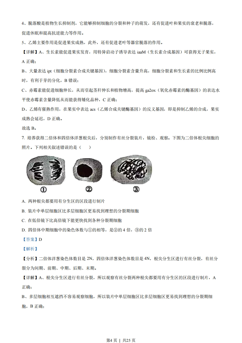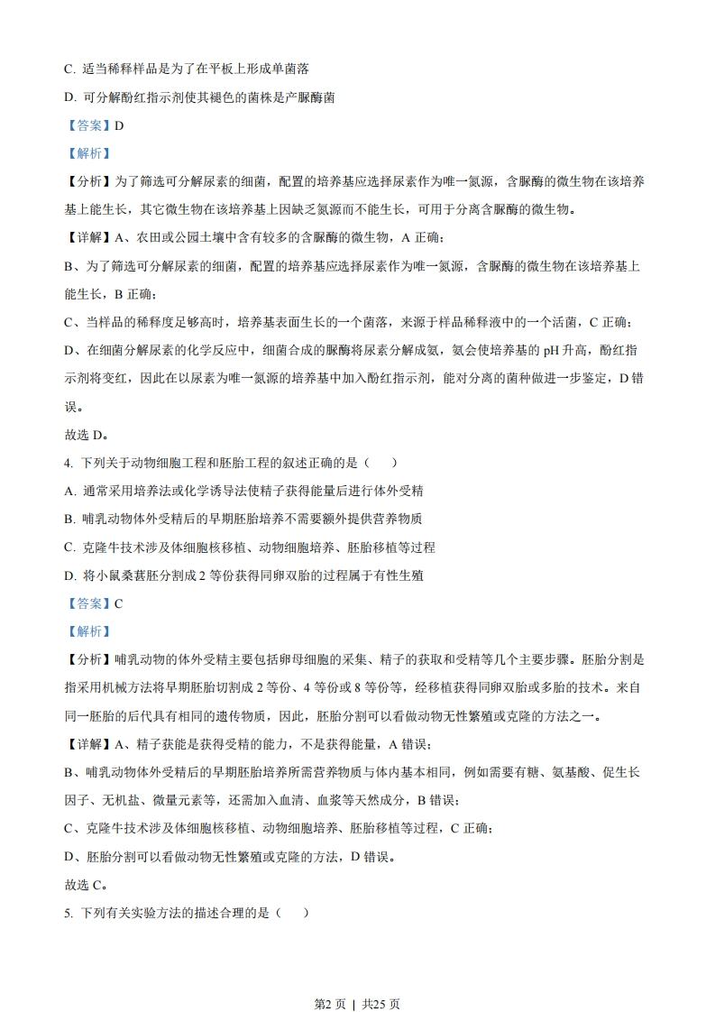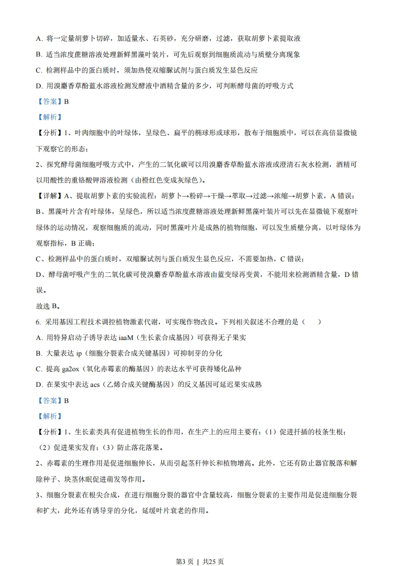2022生物卷(江苏)一、单项选择题:1.下列各组元素中,大量参与组成线粒体内膜的是()A.O、P、NB.C、N、SiC.S、P、CaD.N、P、Na【答案】A【解析】【分析】线粒体内膜属于生物膜,其主要成分是磷脂和蛋白质,蛋白质是由C、H、O、N等元素组成,磷脂的组成元素为C、H、O、N、P。【详解】线粒体内膜属于生物膜,生物膜主要由磷脂和蛋白质组成,蛋白质是由C、H、O、N等元素组成,磷脂的组成元素为C、H、O、N、P,二者均不含Si、Ca、Na,A正确,BCD错误。故选A。2.下列关于细胞生命历程的叙述正确的是()A.胚胎干细胞为未分化细胞,不进行基因选择性表达B.成人脑神经细胞衰老前后,代谢速率和增殖速率都由快变慢C.刚出生不久的婴儿体内也会有许多细胞发生调亡D.只有癌细胞中能同时发现突变的原癌基因和抑癌基因【答案】C【解析】【分析】细胞分化的实质是基因的选择性表达。细胞衰老,会引起代谢速率变慢。但是如果一个细胞不再进行细胞增值,但是还没有细胞衰老,那它的增值速率在衰老前后就不会发生变化。【详解】A、胚胎干细胞为未分化细胞,但是也会进行基因的选择性表达,A错误:B、细胞衰老,会引起代谢速率变慢。但是如果一个细胞不再进行细胞增值,但是还没有细胞衰老,那它的增殖速率在衰老前后就不会发生变化,B错误:C、细胞调亡是生物体正常的生理现象,有利于个体的发育,刚出生不久的婴儿体内也会有许多细胞发生调亡,C正确:D、原癌基因和抑癌基因同时发生突变,也不一定会发生细胞癌变,D错误。故选C。3.下列是某同学分离高产脲酶菌的实验设计,不合理的是()A.选择农田或公园土壤作为样品分离目的菌株B.在选择培养基中需添加尿素作为唯一氮源第1页」共25页C.适当稀释样品是为了在平板上形成单菌落D.可分解酚红指示剂使其褪色的菌株是产脲酶菌【答案】D【解析】【分析】为了筛选可分解尿素的细菌,配置的培养基应选择尿素作为唯一氮源,含脲酶的微生物在该培养基上能生长,其它微生物在该培养基上因缺乏氮源而不能生长,可用于分离含脲酶的微生物。【详解】A、农田或公园土壤中含有较多的含脲酶的微生物,A正确:B、为了筛选可分解尿素的细菌,配置的培养基应选择尿素作为唯一氨源,含脲酶的微生物在该培养基上能生长,B正确:C、当样品的稀释度足够高时,培养基表面生长的一个菌落,来源于样品稀释液中的一个活菌,C正确:D、在细菌分解尿素的化学反应中,细菌合成的脲酶将尿素分解成氨,氨会使培养基的pH升高,酚红指示剂将变红,因此在以尿素为唯一氮源的培养基中加入酚红指示剂,能对分离的菌种做进一步鉴定,D错误。故选D。4.下列关于动物细胞工程和胚胎工程的叙述正确的是()A.通常采用培养法或化学诱导法使精子获得能量后进行体外受精B.哺乳动物体外受精后的早期胚胎培养不需要额外提供营养物质C.克隆牛技术涉及体细胞核移植、动物细胞培养、胚胎移植等过程D.将小鼠桑葚胚分割成2等份获得同卵双胎的过程属于有性生殖【答案】C【解析】【分析】哺乳动物的体外受精主要包括卵母细胞的采集、精子的获取和受精等几个主要步骤。胚胎分割是指采用机械方法将早期胚胎切割成2等份、4等份或8等份等,经移植获得同卵双胎或多胎的技术。来自同一胚胎的后代具有相同的遗传物质,因此,胚胎分割可以看做动物无性繁殖或克隆的方法之一。【详解】A、精子获能是获得受精的能力,不是获得能量,A错误:B、哺乳动物体外受精后的早期胚胎培养所需营养物质与体内基本相同,例如需要有糖、氨基酸、促生长因子、无机盐、微量元素等,还需加入血清、血浆等天然成分,B错误:C、克隆牛技术涉及体细胞核移植、动物细胞培养、胚胎移植等过程,C正确:D、胚胎分割可以看做动物无性繁殖或克隆的方法,D错误。故选C。5.下列有关实验方法的描述合理的是()第2页|共25页A.将一定量胡萝卜切碎,加适量水、石英砂,充分研磨,过滤,获取胡萝卜素提取液B.适当浓度蔗糖溶液处理新鲜黑藻叶装片,可先后观察到细胞质流动与质壁分离现象C.检测样品中的蛋白质时,须加热使双缩脲试剂与蛋白质发生显色反应D.用溴麝香草酚蓝水溶液检测发酵液中酒精含量的多少,可判断酵母菌的呼吸方式【答案】B【解析】【分析】1、叶肉细胞中的叶绿体,呈绿色、扁平的椭球形或球形,散布于细胞质中,可以在高倍显微镜下观察它的形态:2、探究酵母菌细胞呼吸方式中,产生的二氧化碳可以用溴麝香草酚蓝水溶液或澄清石灰水检测,酒精可以用酸性的重铬酸钾溶液检测(由橙红色变成灰绿色)。【详解】A、提取胡萝卜素的实验流程:胡萝卜→粉碎→干燥→萃取→过滤→浓缩→胡萝卜素,A错误:B、黑藻叶片含有叶绿体,呈绿色,所以适当浓度蔗糖溶液处理新鲜黑藻叶装片可以先在显微镜下观察叶绿体的运动情况,观察细胞质的流动,同时黑藻叶片是成熟的植物细胞,可以发生质壁分离,以叶绿体为观察指标,B正确:C、检测样品中的蛋白质时,双缩脲试剂与蛋白质发生显色反应,不需要加热,C错误:D、酵母菌呼吸产生的二氧化碳可使溴麝香草酚蓝水溶液由蓝变绿再变黄,不能用来检测酒精含量,D错误。故选B。6.采用基因工程技术调控植物激素代谢,可实现作物改良。下列相关叙述不合理的是()A.用特异启动子诱导表达iaaM(生长素合成基因)可获得无子果实B.大量表达p(细胞分裂素合