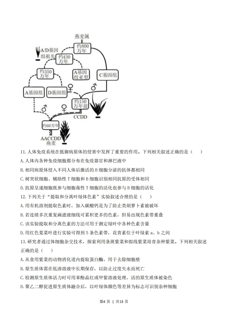 江苏省2023年普通高中学业水平选择性考试生物一、单项选择题:共14题,每题2分,共28分。每题只有一个选项最符合题意。1.下列关于细胞生命历程的叙述错误的是()A.细胞分裂和凋亡共同维持多细胞生物体的细胞数量B.抑制细胞端粒酶的活性有助于延缓细胞衰老C.细胞自噬降解细胞内自身物质,维持细胞内环境稳态D.DNA甲基化抑制抑癌基因的表达可诱发细胞癌变2.植物细胞及其部分结构如图所示。下列相关叙述错误的是()A.主要由DNA和蛋白质组成的①只存在于细胞核中B.核膜及各种细胞器膜的基本结构都与②相似C.③的主要成分是多糖,也含有多种蛋白质D.植物细胞必须具备①、②和③才能存活3.细胞色素C是一种线粒体内膜蛋白,参与呼吸链中的电子传递,在不同物种间具有高度保守性。下列关于细胞色素C的叙述正确的是()A.仅由C、H、O、N四种元素组成B.是一种能催化ATP合成的蛋白质C.是由多个氨基酸通过氢键连接而成的多聚体D.不同物种间氨基酸序列的相似性可作为生物进化的证据4.我国天然林保护工程等国家重点生态工程不仅在生态恢复、生物多样性保护等方面发挥着重要作用,还显著增加了生态系统的固碳能力。下列相关叙述正确的是()第1页|共13页A.天然林的抵抗力稳定性强,全球气候变化对其影响不大B.减少化石燃料的大量使用可消除温室效应的形成C.碳循环中无机碳通过光合作用和化能合成作用进入生物群落D.天然林保护是实现碳中和的重要措施,主要体现了生物多样性的直接价值5.为研究油菜素内酯(BL)和生长素(IAA)对植物侧根形成是否有协同效应,研究者进行了如下实验:在不含BL、含有1nmol/LBL的培养基中,分别加入不同浓度IAA,培养拟南芥8天,统计侧根数目,结果如图所示。下列相关叙述正确的是()250O有BL■无BL2001505000152050LAA浓度(nmol/L)A.0~1nmol/LIAA浓度范围内,BL对侧根形成无影响B.1~20nmo1/LIAA浓度范围内,BL与IAA对侧根形成的协同作用显著C.20~50nmol/LIAA浓度范围内,BL对侧根形成影响更显著D.0~50nmol/LIAA浓度范围内,BL与IAA协同作用表现为低浓度抑制、高浓度促进6.翻译过程如图所示,其中反密码子第1位碱基常为次黄嘌呤(),与密码子第3位碱基A、U、C皆可配对。下列相关叙述正确的是()5回G23第2页|共13页A.tRNA分子内部不发生碱基互补配对B.反密码子为5'-CAU-3'的tRNA可转运多种氨基酸C.mRNA的每个密码子都能结合相应的tRNAD.碱基I与密码子中碱基配对的特点,有利于保持物种遗传的稳定性7.下列关于细菌和酵母菌实验的叙述正确的是()A.通常酵母菌培养基比细菌培养基有更高的碳氮比B.通常细菌的生长速度比酵母菌快,菌落比酵母菌落大C.通常细菌培养基用高压蒸汽灭菌法灭菌,酵母菌培养基用过滤除菌法除菌D.血细胞计数板既可用于酵母菌的数量测定,也可用于细菌的数量测定8.由三条21号染色体引起的唐氏综合征是一种常见遗传病,患者常伴有自身免疫病。下列相关叙述错误的是()A.病因主要是母亲的卵母细胞减数分裂时染色体不分离B.通过分析有丝分裂中期细胞的染色体组型进行产前诊断C.患者性母细胞减数分裂时联会紊乱不能形成可育配子D.降低感染可减轻患者的自身免疫病症状9.某生物社团利用洋葱进行实验。下列相关叙述正确的是()A.洋葱鳞片叶内表皮可代替半透膜探究质膜的透性B.洋葱匀浆中加人新配制的斐林试剂,溶液即呈砖红色C.制作根尖有丝分裂装片时,解离、漂洗、按压盖玻片都能更好地将细胞分散开D.粗提取的DNA溶于2mol/LNaC1溶液中,加入二苯胺试剂后显蓝色10.2022年我国科学家发布燕麦基因组,揭示了燕麦的起源与进化,燕麦进化模式如图所示。下列相关叙述正确的是()A.燕麦是起源于同一祖先的同源六倍体B.燕麦是由AA和CCDD连续多代杂交形成的C.燕麦多倍化过程说明染色体数量的变异是可遗传的D.燕麦中A和D基因组同源性小,D和C同源性大第3页|共13页