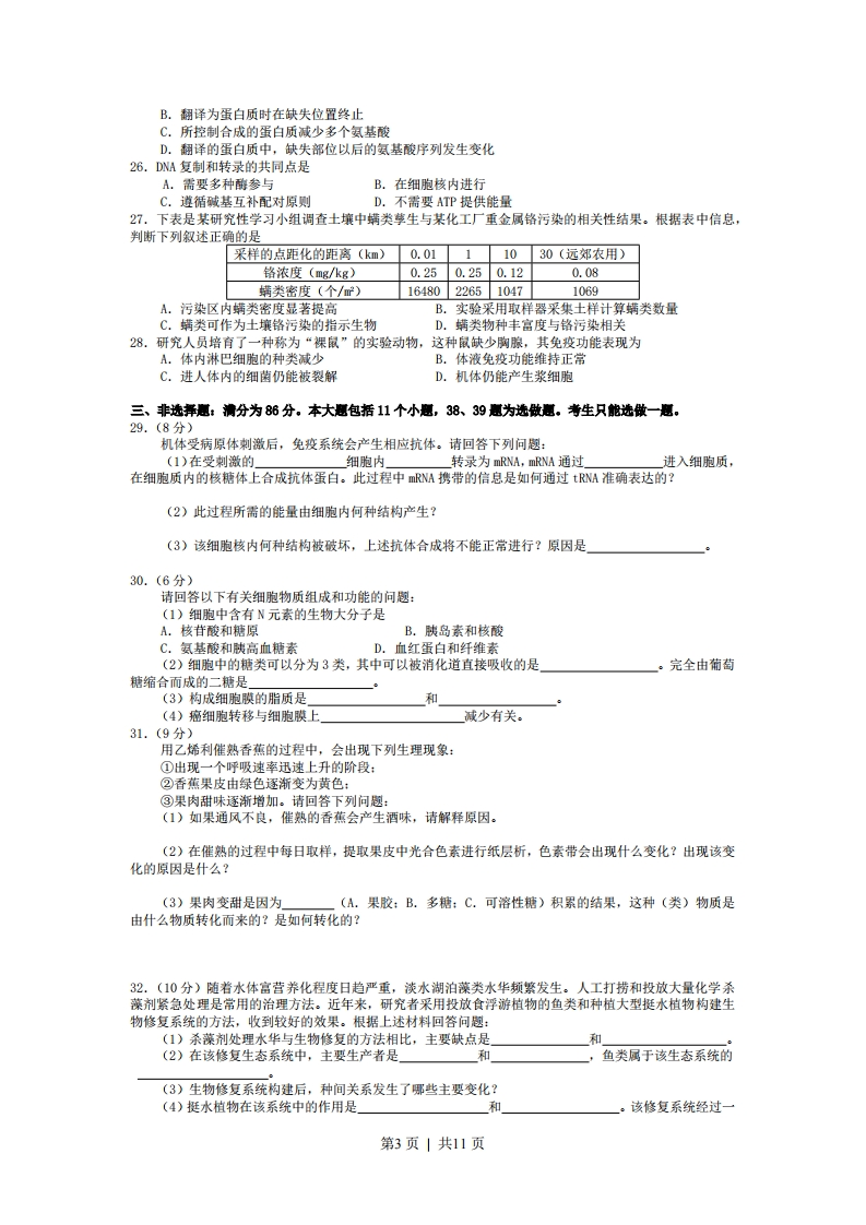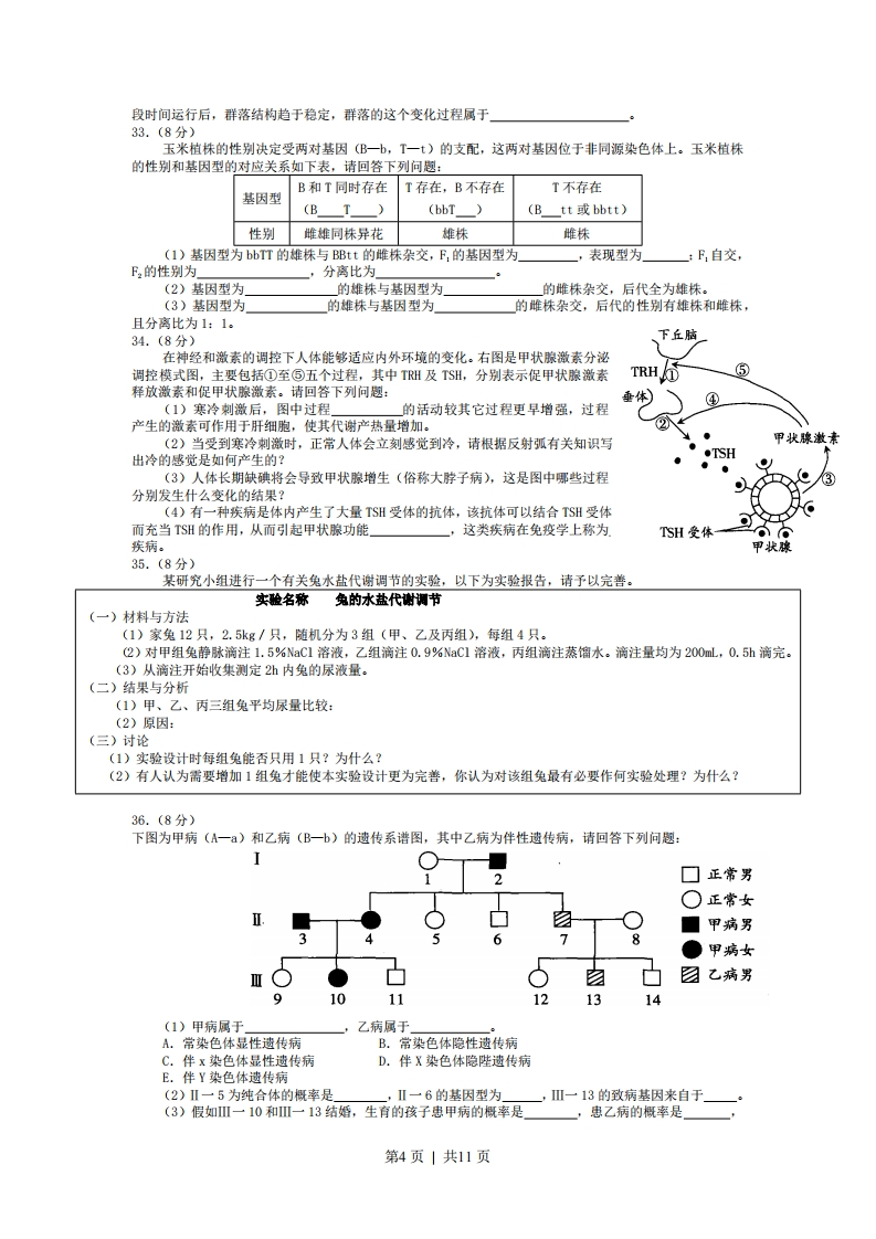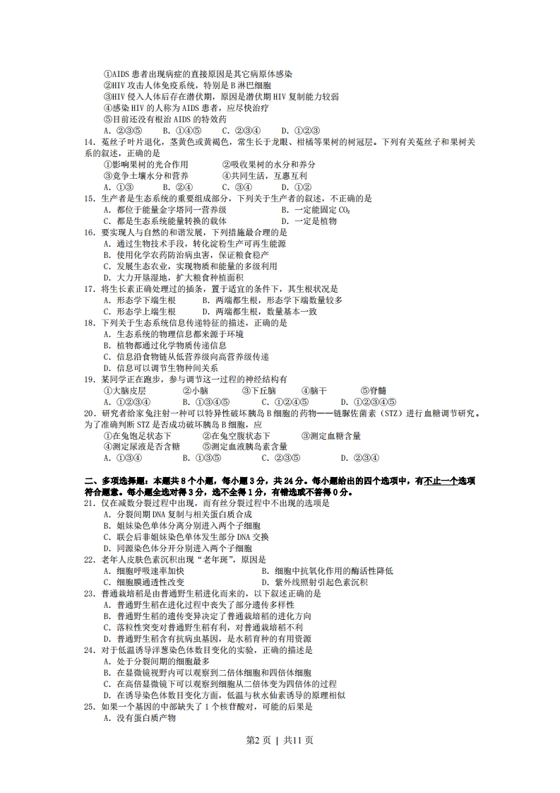 2008年高考广东卷-生物一、单项选择惠:本愿共20小惠。每小惠2分。共40分。每小惠给出的四个选项中。只有一个选项最符合惠目要求。1.具有细胞壁的选项是A.花粉B.红细胞C.胰岛A细胞D.流感病毒2.甲、乙两种物质分别依赖自由扩散(简单扩散)和协助扩散进入细胞,如果以人工合成的无蛋白磷脂双分子膜代替细胞膜,并维持其它条件不变,则A.甲运输被促进B.乙运输被促进C.甲运输被抑制D.乙运输被抑制3.观察在0.3g/mL蔗糖溶液中的洋葱表皮细胞,发现中央液泡逐渐变小,说明A.细胞壁相当于一层半透膜B.洋葱表皮细胞是活的C.此时蔗糖溶液浓度小于细胞液浓度D.细胞壁收缩导致中央液泡失水4.关于叶肉细胞在光照条件下产生ATP的描述,正确的是A.无氧条件下,光合作用是细胞ATP的唯一来源B.有氧条件下,线粒体、叶绿体和细胞质基质都能产生ATPC.线粒体和叶绿体合成ATP都依赖氧D.细胞质中消耗的ATP均来源于线粒体和叶绿体5.用高倍显微镜观察黑藻叶绿体时,可见叶绿体A.具有双层膜B.呈绿色带状C.内部有许多基粒D.呈绿色椭球形6。关于蛋白酶的叙述,不正确的是086A.蛋白酶是蛋白质B.蛋白酶可以作为药品治疗某些疾病C.蛋白酶可以水解所有的肽键D.利用酶工程可以提高蛋白酶的稳定性7.21三体综合征患儿的发病率与母亲年龄的关系如右图所示,预防该遗传病的主要措施是4①适龄生育②基因诊断③染色体分析④B超检查A.①③B.①②C.③④D.②③202530354045母帝的年龄(岁》8.改良缺乏某种抗病性的水稻品种,不宜采用的方法是A.诱变育种B.单倍体育种C.基因工程育种D.杂交育种9.以下为某植物生殖细胞形成过程中某些时期的示意图,正确的描述是①④A.①纺锤丝牵引着姐妹染色单体分开B.②纺锤丝牵引着同源染色体向细胞两极移动C.③同源染色体排列在赤道板上D.④减数第一次分裂染色体排列在赤道板上10.正常双亲产下一头矮生雄性牛犊,以下解释不可能的是A.雄犊营养不良B.雄犊携带了X染色体C.发生了基因突变D.双亲都是矮生基因的携带者11.水平放置在地面的植株,一段时间后,会发生的现象是A.靠近地面一侧较远离地面一侧生长素浓度高,根向下弯曲生长B.靠近地面一侧较远离地面一侧生长素浓度低,根向下弯曲生长C.远离地面一侧较靠近地面一侧生长素浓度高,茎向上弯曲生长动称烤D.远离地面一侧较靠近地面一侧生长素浓度高,茎向下弯曲生长12.根据右图判断,正确的描述是①对于组织细胞的正常生理活动,过程a较过程b和c更为重要毛细血管②组织液中的C0有害无益组织液③组织液中的物质是有变化的毛淋巴管④过程b或c受阻可导致组织水肿A.①③B.①②C.②④D.③④13.以下关于艾滋病(AIDS)的叙述,错误的是。第1页|共11页①AIDS患者出现病症的直接原因是其它病原体感染②HIV攻击人体免疫系统,特别是B淋巴细胞③HIV侵入人体后存在潜伏期,原因是潜伏期HIV复制能力较弱④感染HIV的人称为AIDS患者,应尽快治疗⑤目前还没有根治AIDS的特效药A.②③⑤B.①④⑤C.②③④D.①②③14.菟丝子叶片退化,茎黄色或黄褐色,常生长于龙眼、柑橘等果树的树冠层。下列有关菟丝子和果树关系的叙述,正确的是①影响果树的光合作用②吸收果树的水分和养分③竞争土壤水分和营养④共同生活,互惠互利A.①③B.②④C.③④D.①②15.生产者是生态系统的重要组成部分,下列关于生产者的叙述,不正确的是A.都位于能量金字塔同一营养级B.一定能固定00C.都是生态系统能量转换的载体D.一定是植物16.要实现人与自然的和谐发展,下列措施最合理的是A.通过生物技术手段,转化淀粉生产可再生能源B.使用化学农药防治病虫害,保证粮食稳产C.发展生态农业,实现物质和能量的多级利用D.大力开垦湿地,扩大粮食种植面积17.将生长素正确处理过的插条,置于适宜的条件下,其生根状况是A.形态学下端生根B.两端都生根,形态学下端数量较多C.形态学上端生根D.两端都生根,数量基本一致18.下列关于生态系统信息传递特征的描述,正确的是A,生态系统的物理信息都来源于环境B.植物都通过化学物质传递信息C.信息沿食物链从低营养级向高营养级传递D.信息可以调节生物种间关系19.某同学正在跑步,参与调节这一过程的神经结构有①大脑皮层②小脑③下丘脑④脑干⑤脊髓A.①②③④B.①③④⑤C.①②④⑤D.①②③④⑤20.研究者给家兔注射一种可以特异性破坏胰岛B细胞的药物一一链脲佐菌素(ST2)进行血糖调节研究。为了准确判断STZ是否成功破坏胰岛B细胞,应①在兔饱足状态下②在兔空腹状态下③测定血糖含量④测定尿液是否含糖⑤测定血液胰岛素含量A.①③④B.①③⑤C.②③⑤D.②③④二、多项选舞愿:本惠共8个小惠,每小厘3分,共24分。每小怎给出的四个选项中,有不止一个选项符合题意。每小惠全选对得3分,选不全得1分,有错选或不答得0分。21.仅在减数分裂过程中出现,而有丝分裂过程中不出现的选项是A.分裂间期DNA复制与相关蛋白质合成B.姐妹染色单体分离分别进入两个子细胞C.联会后非姐妹染色单体发生部分DNA交换D.同源染色体分开分别进入两个子细胞22.老年人皮肤色素沉积出现“老年斑”,原因是A.细胞呼吸速率加快B.细胞中抗氧化作用的酶活性降低C.细胞膜通透性改变D.紫外线照射引起色素沉积23.普通栽培稻是由普通野生稻进化而来的,以下叙述正确的是A.普通野生稻在进化过程中丧失了部分遗传多样性B.普通野生