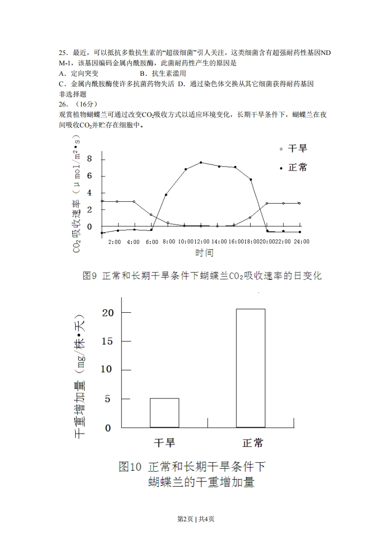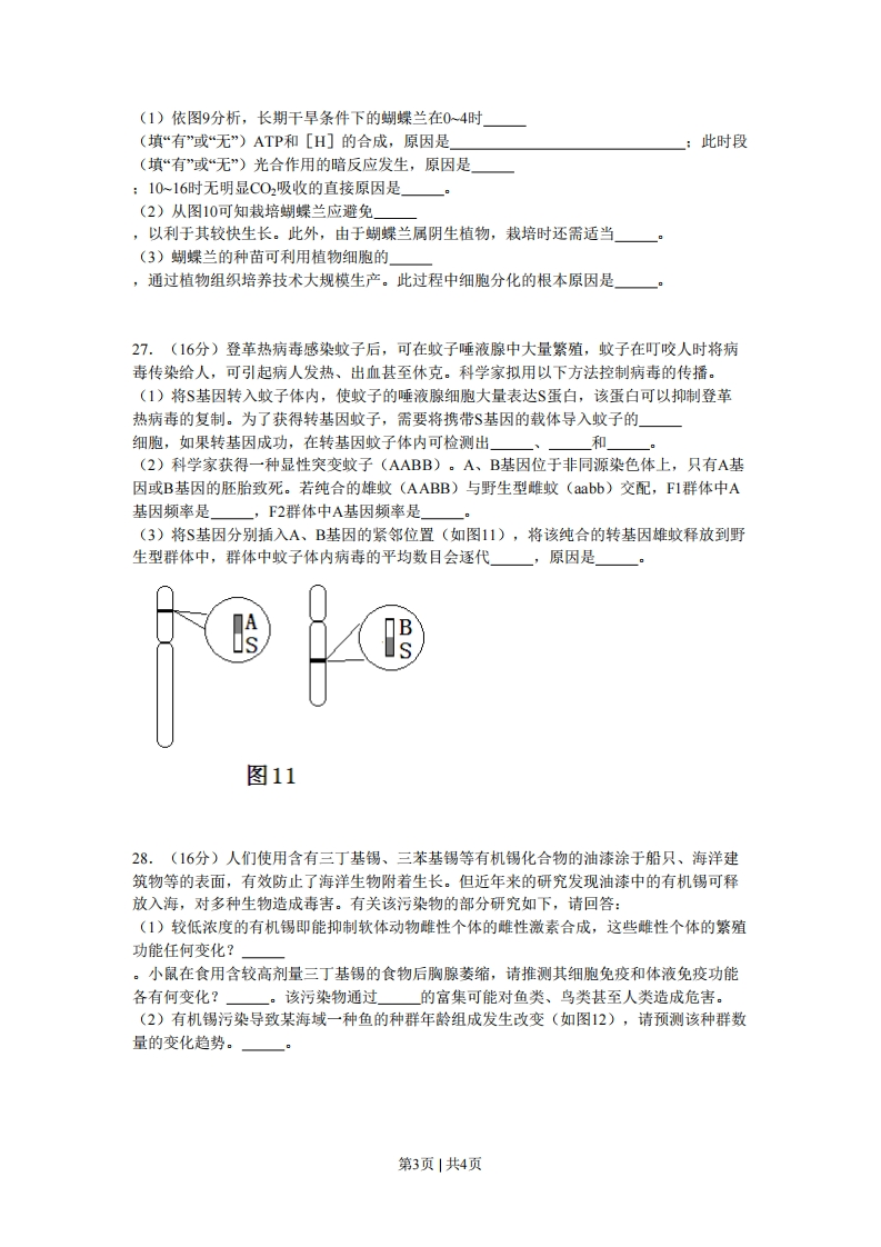 2011年广东高考理科综合生物部分单项选择题1.小陈在观察成熟叶肉细胞的亚显微结构照片后得出如下结论,不正确的是A.叶绿体和线粒体都有双层膜B.核糖体附着在高尔基体上C.内质网与核膜相连D.液泡是最大的细胞器2.艾弗里和同事用R型和S型肺炎双球菌进行实验,结果如下表,从表可知实验组号接种菌型加入S型菌物质培养皿长菌情况①R型蛋白质R型②R型荚膜多糖R型③R型DNAR型、S型④R型DNA(经DNA酶处理)R型A.①不能证明$型菌的蛋白质不是转化因子B.②说明S型菌的荚膜多糖有酶活性C.③和④说明S型菌的DNA是转化因子D.①②③④说明DNA是主要的遗传物质3.华南虎是国家一级保护动物,可采用试管动物技术进行人工繁殖,该技术包括的环节①转基因②核移植③体外受精④体细胞克隆⑤胚胎移栽A.①③B.①④C.②⑤D.③⑤短跑运动员听到法令枪声后迅速起跑,下列叙述正确的是A.起跑动作的产生是非条件反射的结果B.调节起跑动作的神经中枢是听觉中枢C.该反射有多个中间神经元先后兴奋D.起跑反应的快慢取决于小王脑兴奋程度5.以下关于猪血红蛋白提纯的描述,不正确的是A,洗涤红细胞时,使用生理盐水可防止红细胞破裂B.猪成熟红细胞中缺少细胞器和细胞核,提纯时杂蛋白较少C.血红蛋白的颜色可用于凝胶色谱法分离过程的监测D.在凝胶色谱法分离过程中,血红蛋白比分子量较小的杂蛋白移动慢6.某班同学对一种单基因遗传病进行调查,绘制并分析了其中一个家系的系谱图(如图1),下列说法正确的是A.该病为唱染色体显性遗传病B.是该病致病基因的携带者C.与再生患病男孩的概率为12D.与正常女性结婚,建议生女孩双项选择题图124.小杨同学将部分生物学知识归纳如下,其中正确的是淋巴液下丘脑葡萄糖、消费者物质流动激素分泌血糖调节能量流动调节血浆组织液垂体骨上除腺淀粉肝糖原、生产者分解者0第1页|共4页25.最近,可以抵抗多数抗生素的“超级细菌”引人关注,这类细菌含有超强耐药性基因NDM-1,该基因编码金属内酰胺酶,此菌耐药性产生的原因是A.定向突变B.抗生素滥用C.金属内酰胺酶使许多抗菌药物失活D.通过染色体交换从其它细菌获得耐药基因非选择题26.(16分)观赏植物蝴螺兰可通过改变C0吸收方式以适应环境变化,长期干旱条件下,蝴蝶兰在夜间吸收CO2并贮存在细跑中。(s.zu/Iow r。干旱·正常6202:004:006:008:0010:0012:0014:0016:0018:0020:0022:0024:00时间图9正常和长期干旱条件下蝴蝶兰C02吸收速率的日变化2015105千旱正常图10正常和长期干旱条件下蝴蝶兰的干重增加量第2页|共4页(1)依图9分析,长期干旱条件下的蝴螺兰在0~4时(填“有”或“无”)ATP和[H]的合成,原因是此时段(填“有”或“无”)光合作用的暗反应发生,原因是;10~16时无明显C02吸收的直接原因是一。(2)从图10可知栽培蝴螺兰应避免」,以利于其较快生长。此外,由于蝴蝶兰属阴生植物,栽培时还需适当一(3)蝴蝶兰的种苗可利用植物细胞的,通过植物组织培养技术大规模生产。此过程中细胞分化的根本原因是。27.(16分)登革热病毒感染蚊子后,可在蚊子睡液腺中大量繁殖,蚊子在叮咬人时将病毒传染给人,可引起病人发热、出血甚至休克。科学家拟用以下方法控制病毒的传播。(1)将S基因转入蚊子体内,使蚊子的睡液腺细胞大量表达S蛋白,该蛋白可以抑制登革热病毒的复制。为了获得转基因蚊子,需要将携带S基因的载体导入蚊子的」细胞,如果转基因成功,在转基因蚊子体内可检测出一、和·(2)科学家获得一种显性突变蚊子(AABB)。A、B基因位于非同源染色体上,只有A基因或B基因的胚胎致死。若纯合的雄蚊(AABB)与野生型雌蚊(aabb)交配,F1群体中A基因频率是,F2群体中A基因频率是(3)将S基因分别插入A、B基因的紧邻位置(如图11),将该纯合的转基因雄蚊释放到野生型群体中,群体中蚊子体内病毒的平均数目会逐代,原因是一。Bs图1128.(16分)人们使用含有三丁基锡、三苯基锡等有机锡化合物的油漆涂于船只、海洋建筑物等的表面,有效防止了海洋生物附着生长。但近年来的研究发现油漆中的有机锡可释放入海,对多种生物造成毒害。有关该污染物的部分研究如下,请回答:(1)较低浓度的有机锡即能抑制软体动物雌性个体的雌性激素合成,这些雌性个体的繁殖功能任何变化?。小鼠在食用含较高剂量三丁基锡的食物后胸腺萎缩,请推测其细胞免疫和体液免疫功能各有何变化?。该污染物通过的富集可能对鱼类、鸟类甚至人类造成危害。(2)有机锡污染导致某海域一种鱼的种群年龄组成发生改变(如图12),请预测该种群数量的变化趋势。一第3页|共4页