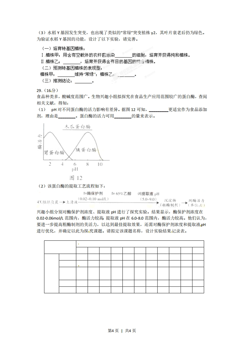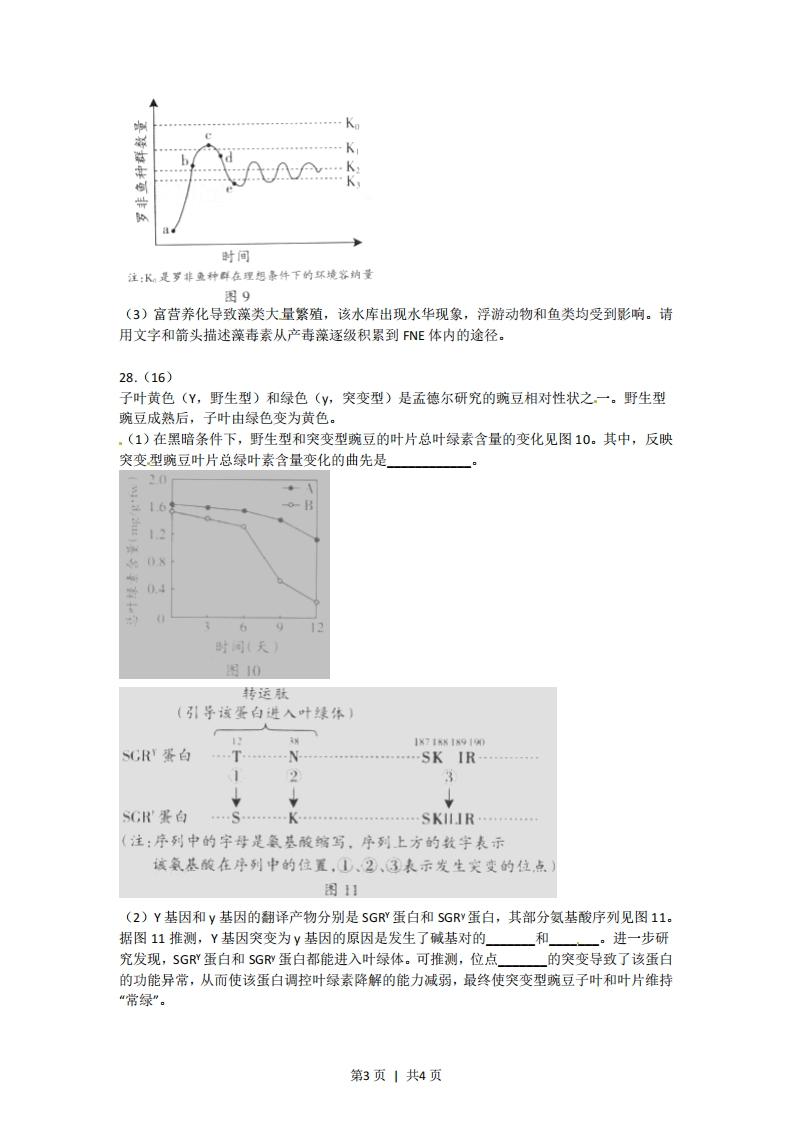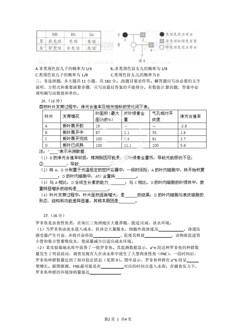 2012年普通高等学校招生全国统一考试(广东卷)理综生物部分1.有关生物膜结构与功能的叙述,正确的是A.膜载体蛋白的合成不需要ATPB.葡萄糖跨膜运输不需要载体蛋白C线粒体外膜与内膜的主要功能不同D.变形虫和草履虫的细胞膜基本组成成分不同2.培育草莓脱毒苗所采用的主要技术是A.组织培养B细胞杂交C.显微注射D核移植3分析下表,可推测溶液双缩脲试剂碘液斐林试剂甲+乙++甲、乙混合注:“+”显色,“+”显色更深:“”不显色A.甲溶液含有淀粉酶B.乙溶液含有还原糖C.混合溶液不含淀粉.D.混合溶液含有淀粉酶4有关土壤动物研究的叙述,正确的是A土壤动物群落不存在分层现象B.土壤动物中间关系主要是互利共生C土壤盐碱度不同,土动物群落结构有差异D.随机扫取表层士取样,可以调查士接小动物类群丰富度5、有关人体免疫的叙还,正确的是A机体主要依赖免疫调节雄特内环境稳态B病原微生物侵袭,可起机体产生特异性免疫C特异性免疫过程中,只有T细跑产生记忆细胞D如果神经中枢受损,机体的特异性免疫功能完全丧失6、科学家用人工合成的染色体片段,成功替代了酵母菌的第6号和第9号染色体的部分片段,得到的重组酵母菌能存活,未见明显异常,关于该重组酵母菌的叙述,错误的是A还可能发生变异B表现型仍受环境的影响C增加了酵母菌的遗传多样性D改变了酵母菌的进化方向24、小杨对4种实验材料的研究及观察记录见下表,正确的是:()选项实验材料观察到的结构或现系A胚胎干细胞同源染色体联会B紫色洋葱游片叶外表皮质壁分离及复原C黑藻叶片叶绿体移动D大肠杆菌有核日25、人类红绿色盲的基因位于X染色体上、秃顶的基因位于常染色体上,结合下表信息可预测,图8中一3和一4所生子女是()第1页1共4页BBBbbb●秃项色觉正常女男非秃顶秃顶秃顶□非秃顶红绿色官男女非秃顶非秃顶秃顶○非壳顶色觉正常女图8A.非秃顶色盲儿子的概率为1/4B.非秃顶色盲女儿的概率为1/8C.秃顶色盲儿子的概率为1/8C秃顶色盲女儿的概率为0三、非选择题:本大题共11小题,共182分。按题目要求作答。解答题应写出必要的文字说明、方程式和重要演算步骤,只写出最后答案的不能得分。有数值计算的题,答案中必须明确写出数值和单位。26.(16分)荔枝叶片发育过程中,净光合速率及相关指标的变化间下表。叶片发育情况叶面积(最大总叶绿素含气孔相对开净光合速率面积的%)放度A新叶展开前19一-2.8B新叶展开中871.1551.6新叶展开完成1002.9812.7D新叶已成熟10011.11005.8注:“”表示未测数据(1)B的净光合速率较低,推测原因可能是:①叶绿素含量低,导致光能吸收不足;②导致(2)将A、D分别置于光温恒定的密容器中,一段时间后,A的叶肉细胞中,将开始积累;D的叶肉细胞中,ATP含量将(3)与A相比,D合成生长素的能力与C相此,D的叶肉细胞的叶绿体中,数量明显增多的结构是(4)叶片发育过程中,叶片面积逐渐增大,是的结果;D的叶肉细胞与表皮细胞的形态、结构和功能差异显著,其根本原因是27.(16分)罗非鱼是杂食性鱼类,在珠江三角洲地区大量养殖,能适应咸、淡水环境。(1)当罗非鱼由淡水进入咸水,机体会大量脱水,细胞外液渗透压」渗透压感受器产生兴奋,并将兴奋传给」促使其释放该物质促进肾小管和集合管重吸收水,使尿量减少以适应咸水环境。(2)某实验基地水库中放养了一批罗非鱼。其监测数据显示,ae段这种罗非鱼的种群数量发生了明显波动,调查发现有人在该水库中放生了大型肉食性鱼(NE):一段时间后,罗非鱼种群数量达到了相对稳定状态(见图9)。图中显示,罗非鱼种群在ab段呈型增长。据图推测,FNE最可能是在」对应的时间点进入水库:在捕食压力下,罗非鱼种群的环境容纳量接近」第2页1共4页KoA…K时间注:K是罗非鱼种群在理想条件下的环境容纳量图9(3)富营养化导致藻类大量繁殖,该水库出现水华现象,浮游动物和鱼类均受到影响。请用文字和箭头描述藻毒素从产毒藻逐级积累到FWE体内的途径。28.(16)子叶黄色(Y,野生型)和绿色(y,突变型)是孟德尔研究的豌豆相对性状之一。野生型豌豆成熟后,子叶由绿色变为黄色。.(1)在黑暗条件下,野生型和突变型豌豆的叶片总叶绿素含量的变化见图10。其中,反映突变型豌豆叶片总绿叶素含量变化的曲先是20161.200.46912时可(天)图10转运肽(引导该蛋白进入叶绿体)121%718%1N919WSGR蛋白…T…NSK IR23↓SGR'蛋白SKIR...........(注:序列中的字母是氧基酸缩写,序列上方的数字表示该氨基酸在序列中的位置,①、2、③表示发生突变的位点】图11(2)Y基因和y基因的翻译产物分别是SGRY蛋白和SGRv蛋白,其部分氨基酸序列见图11。据图11推测,Y基因突变为y基因的原因是发生了碱基对的和一。进一步研究发现,SGRY蛋白和SG蛋白都能进入叶绿体。可推测,位点的突变导致了该蛋白的功能异常,从而使该蛋白调控叶绿素降解的能力减弱,最终使突变型豌豆子叶和叶片维持“常绿”。第3页1共4页