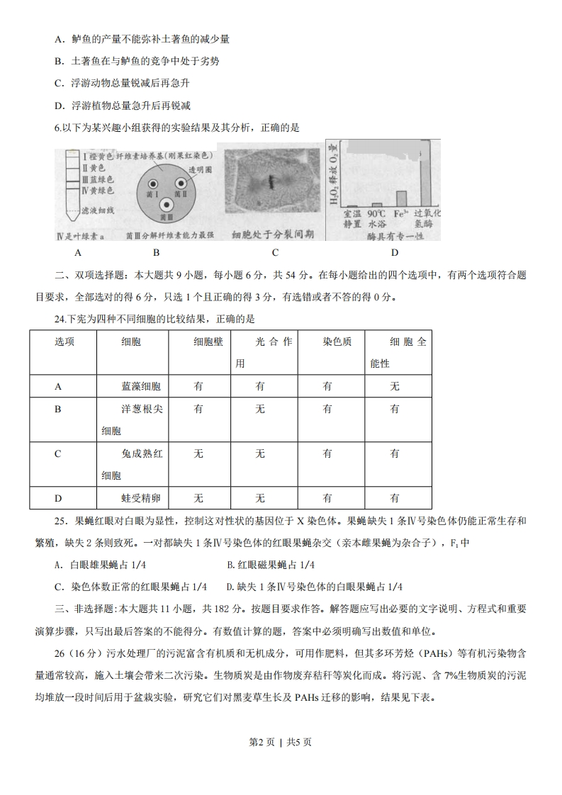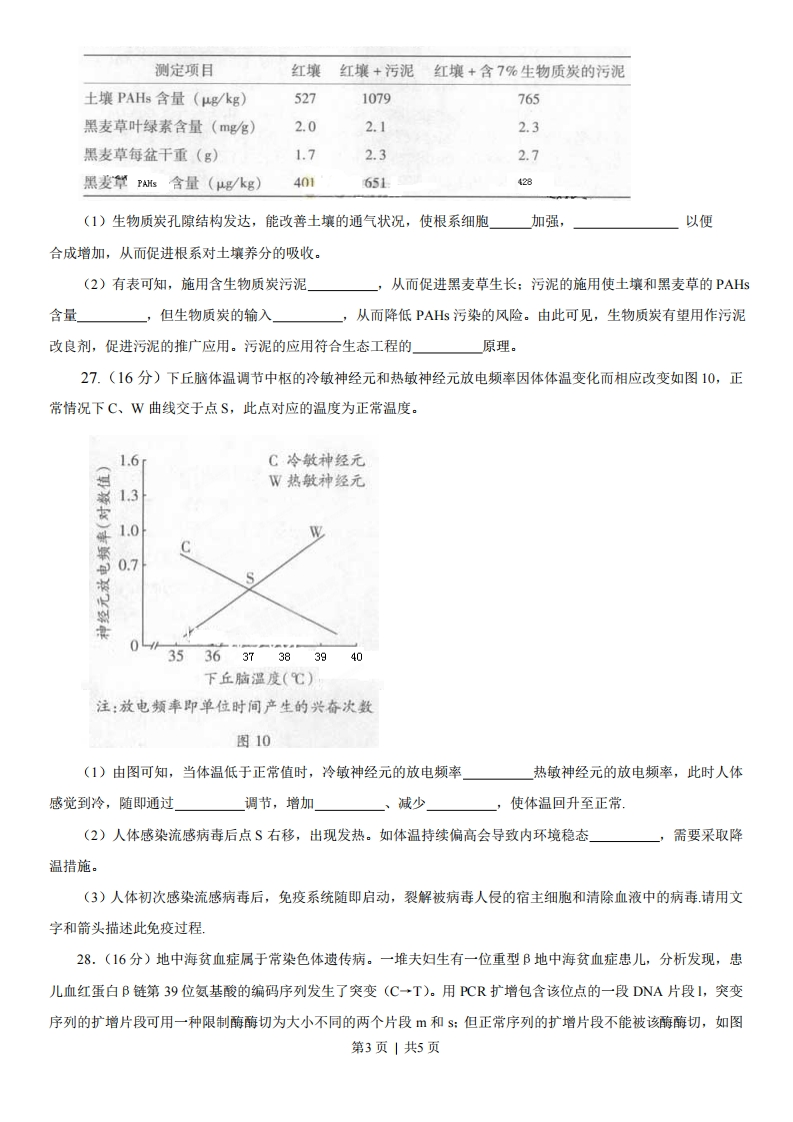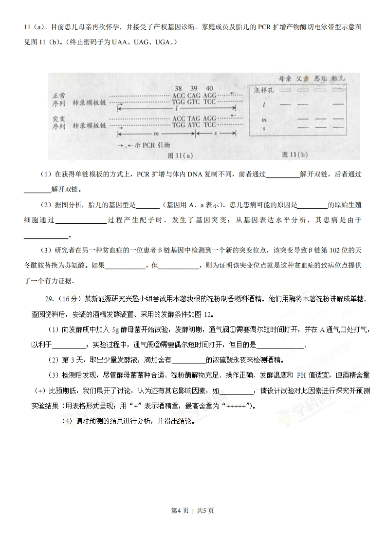 2013年高考广东卷理综生物一、单项选择题:本大题共16小题,每小题4分,满分64分.在每小题给出的四个选项中,只有一项是符合题目要求的.选对的得4分,选错或不答的得0分。1.有关糖的叙述,正确的是()A.葡萄糖在线粒体中合成B.葡萄糖遇碘变为蓝色C.纤维素由葡萄糖组成D.胰岛素促进糖原分解2.1953年atson和Crick构建了DNA双螺旋结构模型,其重要意义在于①证明DNA是主要的遗传物质②确定DNA是染色体的组成成分③发现DNA如何存储遗传信息④为DNA复制机构的阐明奠定基础A.①③B.②③C.②④D.③④3.从某海洋动物中获得一基因,其表达产物为一种抗菌体和溶血性均较强的多肽P1。目前在P1的基础上研发抗菌性强但溶血性弱的多肽药物,首先要做的是A.合成编码目的肽的DNA片段B.构建含目的肽DNA片段的表达载体C.依据P1氨基酸序列设计多条模拟肽D.筛选出具有优良活性的模拟肽作为目的肽4.图1为去顶芽对拟南芥主根生长影响的实验结果,分析正确的是()2015105正常去顶芽去顶芽枝桃植株植株+外源生长素图1A.去顶芽能促进主根生长B.去顶芽植株不能合成生长素C.生长素由顶芽向下非极性运输D.外源生长素能替代顶芽促进主根生长5.图2所示某湖泊的食物网,其中鱼、鱼b为两种小型土著鱼,若引入一种以中小型鱼类为食的鲈鱼,将出现的情况是鱼a鱼b第1页|共5页大型小型浮游动物浮游动物浮游植物A.鲈鱼的产量不能弥补土著鱼的减少量B.土著鱼在与鲈鱼的竞争中处于劣势C.浮游动物总量锐减后再急升D.浮游植物总量急升后再锐减6.以下为某兴趣小组获得的实验结果及其分析,正确的是I橙黄色纤维素培养基(刚果红染色)Ⅱ黄色透明圈Ⅲ蓝绿色N黄绿色滤液细线室温90℃Fe过氧化静置水浴氨酶V是叶绿素a菌Ⅲ分解纤维素能力最强细胞处于分裂间期酶具有专一性ABCD二、双项选择题:本大题共9小题,每小题6分,共54分。在每小题给出的四个选项中,有两个选项符合题目要求,全部选对的得6分,只选1个且正确的得3分,有选错或者不答的得0分。24.下宪为四种不同细胞的比较结果,正确的是选项细胞细胞壁光合作染色质细胞全用能性A蓝藻细胞有有有无B洋葱根尖有无有有细胞C兔成熟红无无有有细胞D蛙受精卵无无有有25.果蝇红眼对白眼为显性,控制这对性状的基因位于X染色体。果蝇缺失1条V号染色体仍能正常生存和繁殖,缺失2条则致死。一对都缺失1条Ⅳ号染色体的红眼果蝇杂交(亲本雌果蝇为杂合子),F,中A.白眼雄果蝇占1/4B.红眼磁果蝇占1/4C.染色体数正常的红眼果蝇占1/4D.缺失1条V号染色体的白眼果蝇占1/4三、非选择题:本大题共11小题,共182分。按题目要求作答。解答题应写出必要的文字说明、方程式和重要演算步骤,只写出最后答案的不能得分。有数值计算的题,答案中必须明确写出数值和单位。26(16分)污水处理厂的污泥富含有机质和无机成分,可用作肥料,但其多环芳烃(PAHs)等有机污染物含量通常较高,施入土壤会带来二次污染。生物质炭是由作物废弃秸秆等炭化而成。将污泥、含7%生物质炭的污泥均堆放一段时间后用于盆栽实验,研究它们对黑麦草生长及PAHs迁移的影响,结果见下表。第2页|共5页测定项目红壤红壤+污泥红壤+含7%生物质炭的污泥土壤PAHs含量(g/kg)5271079765黑麦草叶绿素含量(mg/g)2.02.12.3黑麦草每盆干重(g)1.72.32.7黑麦草As含量(g/kg)40165128(1)生物质炭孔隙结构发达,能改善土壤的通气状况,使根系细胞加强,以便合成增加,从而促进根系对土壤养分的吸收。(2)有表可知,施用含生物质炭污泥」从而促进黑麦草生长:污泥的施用使土壤和黑麦草的PAHs含量,但生物质炭的输入,从而降低PAHs污染的风险。由此可见,生物质炭有望用作污泥改良剂,促进污泥的推广应用。污泥的应用符合生态工程的原理。27.(16分)下丘脑体温调节中枢的冷敏神经元和热敏神经元放电频率因体体温变化而相应改变如图10,正常情况下C、W曲线交于点S,此点对应的温度为正常温度。1.6C冷敏神经元W热敏神经元1.31.0W0.70353637383940下丘脑温度(℃)注:放电频率即单位时间产生的兴奋次数图10(1)由图可知,当体温低于正常值时,冷敏神经元的放电频率热敏神经元的放电频率,此时人体感觉到冷,随即通过调节,增加、减少使体温回升至正常,(2)人体感染流感病毒后点S右移,出现发热。如体温持续偏高会导致内环境稳态需要采取降温措施。(3)人体初次感染流感病毒后,免疫系统随即启动,裂解被病毒人侵的宿主细胞和清除血液中的病毒请用文字和箭头描述此免疫过程,28.(16分)地中海贫血症属于常染色体遗传病。一堆夫妇生有一位重型B地中海贫血症患儿,分析发现,患儿血红蛋白B链第39位氨基酸的编码序列发生了突变(C→T)。用PCR扩增包含该位点的一段DNA片段I,突变序列的扩增片段可用一种限制酶酶切为大小不同的两个片段和s:但正常序列的扩增片段不能被该酶酶切,如图第3页|共5页