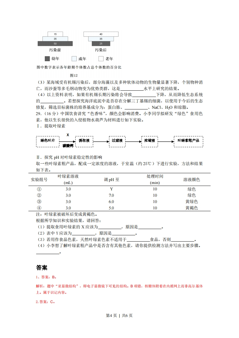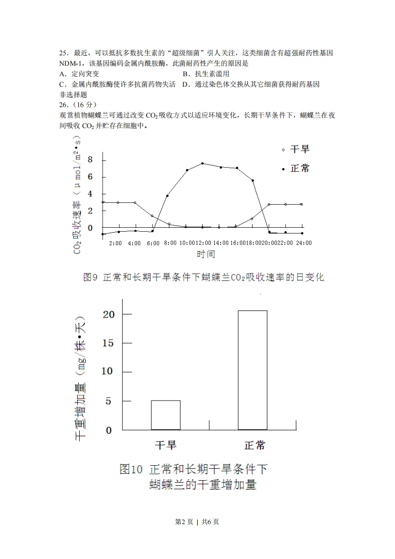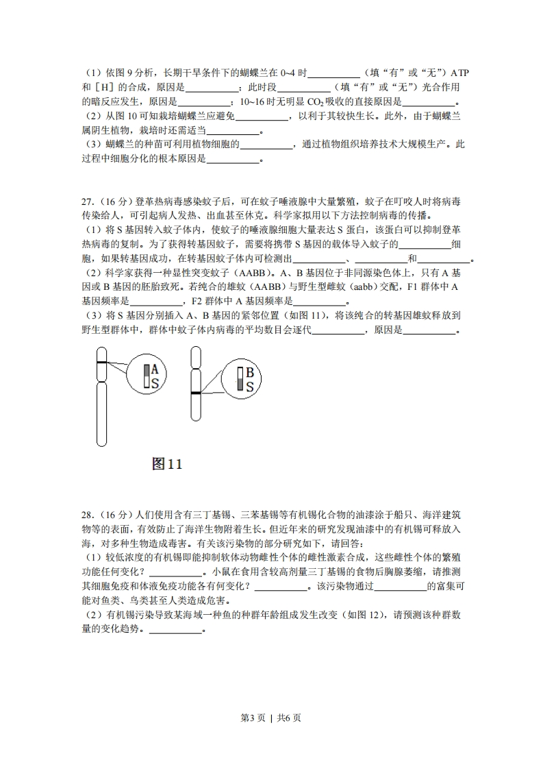 2011年广东高考理科综合生物部分单项选择题1.小陈在观察成熟叶肉细胞的亚显微结构照片后得出如下结论,不正确的是A.叶绿体和线粒体都有双层膜B.核糖体附着在高尔基体上C.内质网与核膜相连D.液泡是最大的细胞器2.艾弗里和同事用R型和S型肺炎双球菌进行实验,结果如下表,从表可知实验组号接种菌型加入S型菌物质培养皿长菌情况①R型蛋白质R型②R型荚膜多糖R型③R型DNAR型、S型④R型DNA(经DNA酶处理)R型A.①不能证明S型菌的蛋白质不是转化因子B.②说明S型菌的荚膜多糖有酶活性C.③和④说明S型菌的DNA是转化因子D.①②③④说明DNA是主要的遗传物质3.华南虎是国家一级保护动物,可采用试管动物技术进行人工繁殖,该技术包括的环节①转基因②核移植③体外受精④体细胞克隆⑤胚胎移栽A.①③B.①④C.②⑤D.③⑤短跑运动员听到法令枪声后迅速起跑,下列叙述正确的是A.起跑动作的产生是非条件反射的结果B.调节起跑动作的神经中枢是听觉中枢C.该反射有多个中间神经元先后兴奋D.起跑反应的快慢取决于小王脑兴奋程度5.以下关于猪血红蛋白提纯的描述,不正确的是A.洗涤红细胞时,使用生理盐水可防止红细胞破裂B.猪成熟红细胞中缺少细胞器和细胞核,提纯时杂蛋白较少C.血红蛋白的颜色可用于凝胶色谱法分离过程的监测D.在凝胶色谱法分离过程中,血红蛋白比分子量较小的杂蛋白移动慢6.某班同学对一种单基因遗传病进行调查,绘制并分析了其中一个家系的系谱图(如图1),下列说法正确的是A.该病为唱染色体显性遗传病B.是该病致病基因的携带者C.与再生患病男孩的概率为12D.与正常女性结婚,建议生女孩双项选择题图124.小杨同学将部分生物学知识归纳如下,其中正确的是淋巴液下丘脑葡萄糖、消费者物质流动激素分泌血糖调节能量流动调节血浆组织液垂体骨上除腺淀粉肝糖原、生产者分解者第1页|共6页25.最近,可以抵抗多数抗生素的“超级细菌”引人关注,这类细菌含有超强耐药性基因NDM1,该基因编码金属内酰胺酶,此菌耐药性产生的原因是A.定向突变B.抗生素滥用C.金属内酰胺酶使许多抗菌药物失活D.通过染色体交换从其它细菌获得耐药基因非选择题26.(16分)观赏植物蝴蝶兰可通过改变CO2吸收方式以适应环境变化,长期干旱条件下,蝴蝶兰在夜间吸收CO2并贮存在细胞中。(s.zu/Iow r。干旱8·正常6202:004:006:008:0010:0012:0014:0016:0018:0020:0022:0024:00时间图9正常和长期干旱条件下蝴蝶兰C02吸收速率的日变化2015105千旱正常图10正常和长期干旱条件下蝴蝶兰的干重增加量第2页|共6页(1)依图9分析,长期干旱条件下的蝴蝶兰在0~4时(填“有”或“无”)ATP和[H]的合成,原因是此时段(填“有”或“无”)光合作用的暗反应发生,原因是10~16时无明显C02吸收的直接原因是(2)从图10可知栽培蝴蝶兰应避免以利于其较快生长。此外,由于蝴蝶兰属阴生植物,栽培时还需适当,(3)蝴螺兰的种苗可利用植物细胞的通过植物组织培养技术大规模生产。此过程中细胞分化的根本原因是27.(16分)登革热病毒感染蚊子后,可在蚊子唾液腺中大量繁殖,蚊子在叮咬人时将病毒传染给人,可引起病人发热、出血甚至休克。科学家拟用以下方法控制病毒的传播。(1)将S基因转入蚊子体内,使蚊子的唾液腺细胞大量表达S蛋白,该蛋白可以抑制登革热病毒的复制。为了获得转基因蚊子,需要将携带S基因的载体导入蚊子的细胞,如果转基因成功,在转基因蚊子体内可检测出和(2)科学家获得一种显性突变蚊子(AABB)。A、B基因位于非同源染色体上,只有A基因或B基因的胚胎致死。若纯合的雄蚊(AABB)与野生型雌蚊(aabb)交配,F1群体中A基因频率是,F2群体中A基因频率是(3)将S基因分别插入A、B基因的紧邻位置(如图11),将该纯合的转基因雄蚊释放到野生型群体中,群体中蚊子体内病毒的平均数目会逐代,原因是图1128.(16分)人们使用含有三丁基锡、三苯基锡等有机锡化合物的油漆涂于船只、海洋建筑物等的表面,有效防止了海洋生物附着生长。但近年来的研究发现油漆中的有机锡可释放入海,对多种生物造成毒害。有关该污染物的部分研究如下,请回答:(1)较低浓度的有机锡即能抑制软体动物雌性个体的雌性激素合成,这些雌性个体的繁殖功能任何变化?。小鼠在食用含较高剂量三丁基锡的食物后胸腺萎缩,请推测其细胞免疫和体液免疫功能各有何变化?。该污染物通过的富集可能对鱼类、鸟类甚至人类造成危害。(2)有机锡污染导致某海域一种鱼的种群年龄组成发生改变(如图12),请预测该种群数量的变化趋势。第3页|共6页