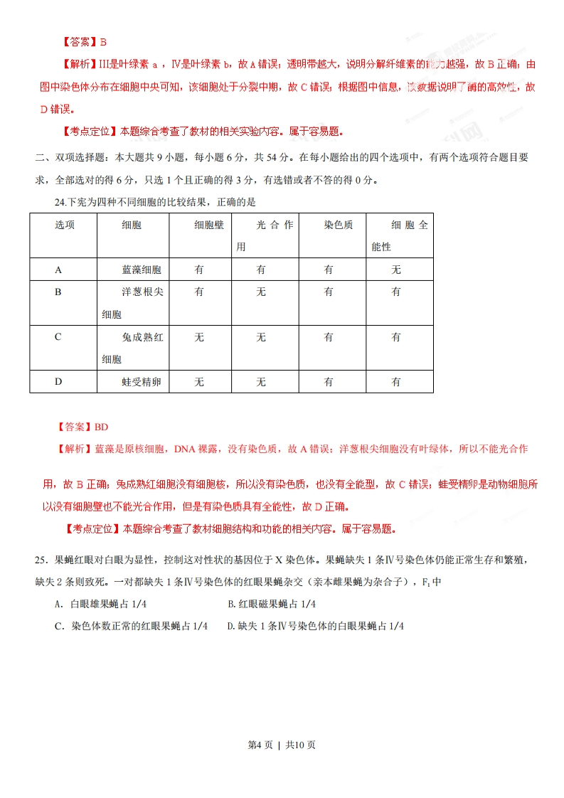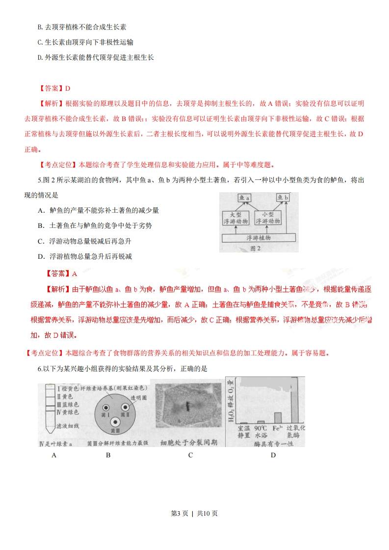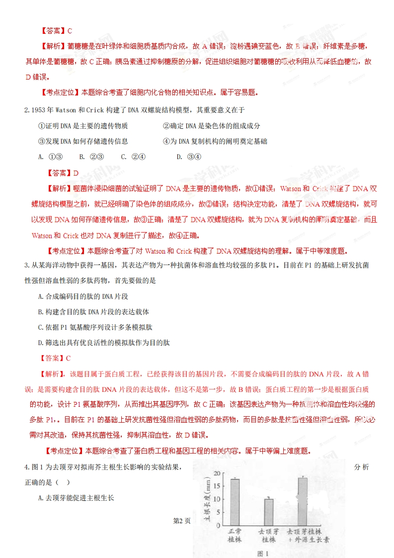 2013年高考广东卷理综生物【学科网试卷总评】较广东实施新课改后的理科综合以来,今年的生物试题难度比往年有所增加,据学生反应为今年广东高考理科难度最大。今年的理科综合科生物试题延续了多年来的以能力立意、理论联系实际、体现地域特色、关注社会热点等广东风格,今年最突出的特点是在非选择题设置一些开放性问题,以考查考生从多个角度来解决问题的综合能力。与往年相比,选择题更具情境化,提高了考生对信息的获取和分析能力的要求,难度稍有加大,区分度相应提高。如第25题,考生能否灵活运用遗传规律和独立事件的乘法定律来分析问题,将直接影响其解题效率。非选择题在素材选取、设问方式、难度设置、能力考查等方面各具特点。具体来讲,今年广东理综生物具有以下特点:1.是着重考察综合运用所学知识的能力。如第26题,着重考查考生获取表中信息、综合运用所学知识来解释农业生产相关问题的能力,市场上很多炭包出售,用来吸附有害物质,所以很多同学应该有炭具有吸附能力的生活常识,一定意义上考察理论联系实际的能力。2.是突出对创新能力的考查。如第28题以我省较常见的“地中海贫血症”为素材,涉及其遗传传递规律和致病分子机制等内容,其中第(3)问的难度较大,只有那些较好严谨逻辑思维、创造性思维与创新意识的考生脱颖而出,体现了命题的适度开放和选拔性。3.是加大了对实验设计与探究能力的考查力度。如第29题以教材中的实验为背景,延续了去年采用表格呈现解题思路的考查方法,考生首先要找出需要探究的影响因素(发酵时间或菌种接种量等),才能进行后续的实验设计,让能敏锐发现问题或平时注重探究思维培养的考生有机会展现各自特长。另外,试题注重过程与方法,要求呈现“设计实验、预测结果、分析原因、得出结论”完整的探究过程,对思维能力考查层层递进。能够很好地将中高能力层次的学生区分开米。说明这样的命题有利于选出思维清晰、推理能力强的人才。总体来说,这份试题紧扣考纲,体现了新课程理念,对中学生物教学具有良好导向作用,能够引导中学教师立足教材开展教学。该试题注重能力和科学素养的考查,注重考查运用所学知识分析、解决具体问题的能力:强调知识之间的内在联系:注重理论联系实际:注重时代性和实践性。突出了对信息的提炼加工能力以及实验与探究能力的考查。整套试题有一定的难度梯度,灵活性较强,能较好的体现高考的选拔功能。一、单项选择题:本大题共16小题,每小题4分,满分64分.在每小题给出的四个选项中,只有一项是符合题目要求的.选对的得4分,选错或不答的得0分。1.有关糖的叙述,正确的是()A.葡萄糖在线粒体中合成B.葡萄糖遇碘变为蓝色C.纤维素由葡萄糖组成D.胰岛素促进糖原分解第1页|共10页【答案】C【解析】葡糖糖是在叶绿体和细胞质基质内合成,故A错误;淀粉遇碘变蓝色,故E请误;纤维素是多糖,其单体是葡糖糖,故C正确:胰岛素通过抑制糖原的分解,促进组织细胞对葡糖糖的吸收利用从而降低血糖的,故D错误。【考点定位】本题综合考查了细胞内化合物的相关知识点。属于容易题。2.1953年Watson和Crick构建了DNA双螺旋结构模型,其重要意义在于①证明DNA是主要的遗传物质②确定DNA是染色体的组成成分③发现DNA如何存储遗传信息④为DNA复制机构的阐明奠定基础A.①③B.②③C.②④D.③④【答案】D【解析】噬菌体浸染细菌的试验证明了DNA是主要的遗传物质,故①错误,Watson和Crick构建了DNA双螺旋结构模型之前,就已经明确了染色体的组成成分,故②错误,结构决定功能,清楚了D、A双螺旋结构,就可以发现DNA如何存储遗传信息,故③正确;清楚了DNA双螺旋结构,就为DNA复制机构的阐明奠定基础,而且Watson和Crick也对DNA复制进行了描述,故④正确。【考点定位】本题综合考查了对Watson和Crick构建了DNA双螺旋结构的理解。属于中等难度题。3.从某海洋动物中获得一基因,其表达产物为一种抗菌体和溶血性均较强的多肽P1。目前在P1的基础上研发抗菌性强但溶血性弱的多肽药物,首先要做的是A.合成编码目的肽的DNA片段B.构建含目的肽DNA片段的表达载体C.依据P1氨基酸序列设计多条模拟肽D.筛选出具有优良活性的模拟肽作为目的肽【答案】C【解析】,该题目属于蛋白质工程,己经获得该目的基因片段,不需要合成编码目的肽的DNA片段,故A错误:是需要构建含目的肽DNA片段的表达载体,但这不是第一步,故B错误:蛋白质工程的第一步是根据蛋白质的功能,设计P1氨基酸序列,从而推出其基因序列,故C正确;该基因表达产物为一种抗菌体和溶血性均较强的多肽P1,。目前在P1的基础上研发抗菌性强但溶血性弱的多肽药物,而目的多肽是抗菌性强但溶血性弱,所必需对其改造,保持其抗菌性强,抑制其溶血性,故D错误。【考点定位】本题综合考查了蛋白质工程和基因工程的相关内容。属于中等偏上难度题。4.图1为去顶芽对拟南芥主根生长影响的实验结果,分析20正确的是()15A.去顶芽能促进主根生长10第2页正常去顶芽去顶芽植林植株植株+外源生长素图1B.去顶芽植株不能合成生长素C.生长素由顶芽向下非极性运输D.外源生长素能替代顶芽促进主根生长【答案】D【解析】根据实验的原理以及题目中的信息,去顶芽是抑制主根生长的,故A错误:实验没有信息可以证明去顶芽植株不能合成生
