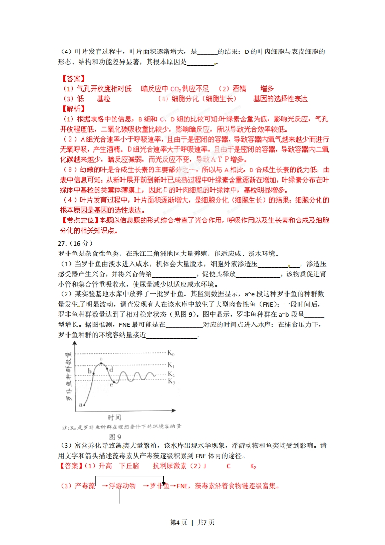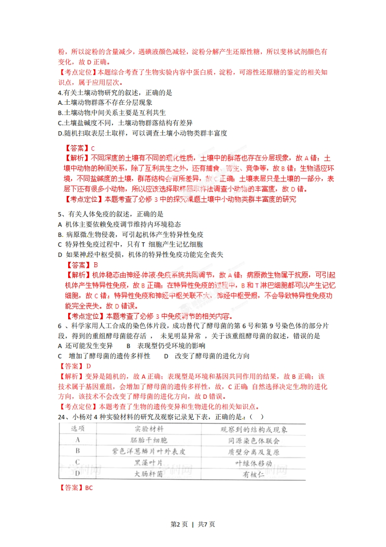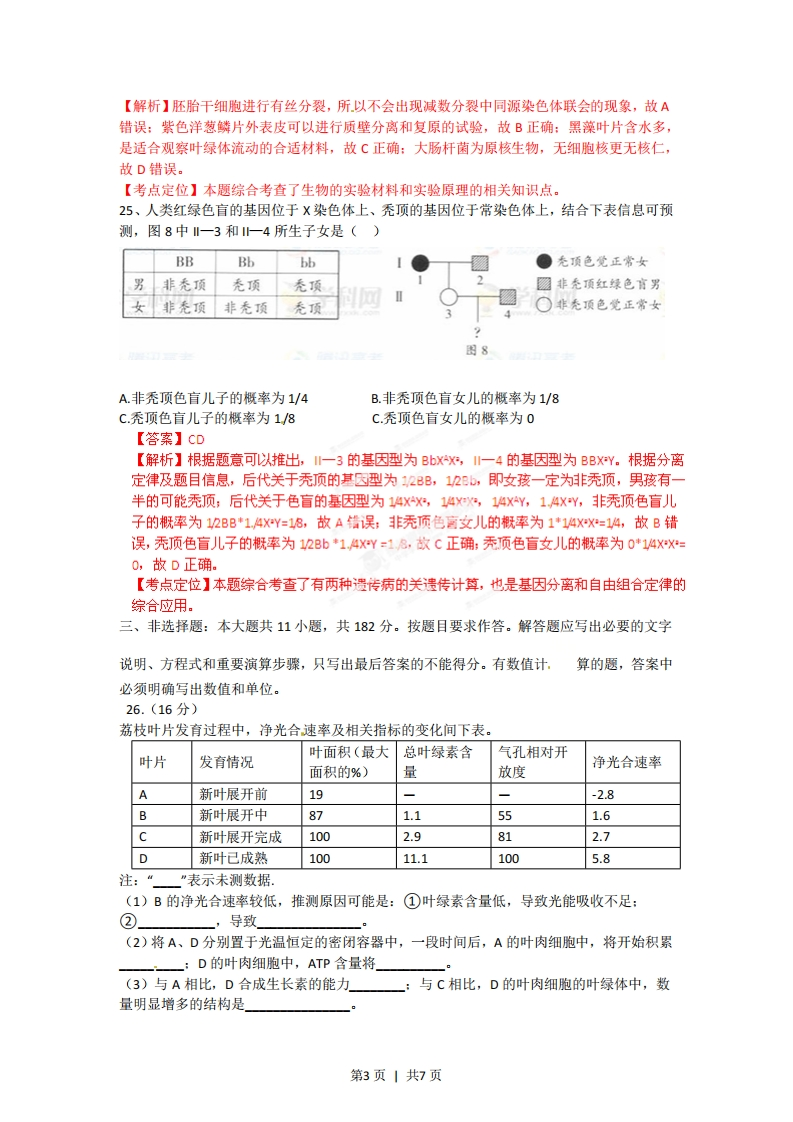【试卷总评】总体来看,该试题难度适中,主要对生物学基础知识和基本技能和对应用生物学知识解决间题的考查,突出了对信息的提炼加工能力以及实验与探究能力的考查。较以往试题,更为重视教材实验,实拉探究,较好地考查了考生的实验分析和探究的能力。整套试题有一定的难度梯度,灵活性较强,能梳好的体现高考的选拔功能。2012年普通高等学校招生全国统一考试(广东卷)理综生物部分解析1.有关生物膜结构与功能的叙述,正确的是A.膜载体蛋白的合成不需要ATPB.葡萄糖跨膜运输不需要载体蛋白C线粒体外膜与内膜的主要功能不同D.变形虫和草履虫的细胞膜基本组成成分不同【答案】c【解析】生物体内大分子物质的合成都需要TP转化为化学能,故A错误;葡萄糖的跨膜运输方式不论是主动运输或是协助扩散,都需要载体蛋白,故B错误,线粒体的内膜是有氧呼吸第三阶段的主要场所,所以外模与内膜的主要功能不同,故C正确:生物膜的基本组成成分主要是蛋白质和磷脂,故D错误。【考点定位】本题综合考查了细胞结构和功能的相关知识点。2.培育草莓脱毒苗所采用的主要技术是A组织培养B细胞杂交C显微注射D.核移植【答案】A【解析】植物分生组织(根尖和茎尖)的细胞很少含有病毒,可通过植物组织培养技术获得悦毒幼苗。故答案A正确。细胞杂交用来培育杂种植物,显微注射是用于动物细胞工程或基因工程,核移植主要用于克隆动物,故B、C、D都错误。【考点定位】本题考察了选修3植物细胞培养的买际应用以及其它现代生物科技的相关知识点。3.分析下表,可推测溶液双缩脲试剂碘液斐林试剂甲乙++甲、乙混合+注:“+”显色,“+”显色更深:“”不显色A.甲溶液含有淀粉酶B.乙溶液含有还原糖C.混合溶液不含淀粉。D.混合溶液含有淀粉酶【答案】D【解析】双缩脲试剂使蛋白质呈紫色,淀粉遇碘液变蓝、斐林试剂使还原性糖产生砖红色沉淀。由表中的信息可知:,甲含有蛋白质,仅仅根据甲不能确定该蛋白质就是淀粉酶,故A错误:乙含有淀粉,淀粉是非还原性糖,故B错误:甲和乙混合溶液能使碘液变蓝,说明含有淀粉,故C错误:甲和乙混合溶液含有淀粉酶,所以双缩脲试剂颜色变化,能够分解淀第1页1共7页粉,所以淀粉的含量减少,遇碘液颜色减轻,淀粉分解产生还原性糖,所以斐林试剂颜色有变化,故D正确。【考点定位】本题综合考查了生物实验内容中蛋白质,淀粉,可溶性还原糖的鉴定的相关知识点,属于应用层次。4.有关土壤动物研究的叙述,正确的是A.土壤动物群落不存在分层现象B.土壤动物中间关系主要是互利共生C土壤盐碱度不同,土壤动物群落结构有差异D.随机扫取表层土取样,可以调查土壤小动物类群丰富度【答案】c【解析】不同深度的土壤有不同的理化性质,土壤中的群落也存在分层现象,故A错;土壤中动物的种间关系,除了互利供生之外,还有捕食、寄生、竞争等,故B错;生物适应环境,不同盐碱度的土壤,群落结构会有所差异,故C正确土壤表层只是土壤的一部分,表层下还有很多小动物,所以应该选择取样器取样法调查小动物的丰富度,故D错。【考点定位】本题考查了必修3中的探沉果题土壤中小动物类群丰富度的研究5、有关人体免疫的叙述,正确的是A机体主要依赖免疫调节维持内环境稳态B.病原微生物侵袭,可引起机体产生特异性免疫C特异性免疫过程中,只有T细胞产生记忆细跑D如果神经中枢受损,机体的特异性免疫功能完全丧失【答案】B【解析】机体稳态由神经体液免疫系统共同调节,故A错:病原微生物属于抗原,可引起机体产生特异性免疫,故B正确,在特异性免疫的过程中,B和T淋巴细胞都可以产生记忆细胞,故C错;特异性免疫和神经中枢关联不大,经中枢受损,不会导致特异性免疫功能完全丧失。故D错误。【考点定位】本题考查了必修3中免疫调节的相关内容。6、科学家用人工合成的染色体片段,成功替代了酵母菌的第6号和第9号染色体的部分片段,得到的重组酵母菌能存活,未见明显异常,关于该重组酵母菌的叙述,错误的是A还可能发生变异B表现型仍受环境的影响C增加了酵母菌的遗传多样性D改变了酵母菌的进化方向【答案】D【解析】变异是随机的,故A正确:表现型是环境和基因共同作用的结果,故B正确:该技术属于基因重组,会增加了酵母菌的遗传多样性,故,C正确自然选择决定生物的进化方向,该技术不会改变了酵母菌的进化方向,故D错误。【考点定位】本题考查了生物的遗传变异和生物进化的相关知识点。24、小杨对4种实验材料的研究及观察记录见下表,正确的是:()选项实验材料观察到的结构或现象A胚胎干细胞同源染色体联会B紫色洋葱蝣片叶外表皮质壁分离及复原C黑藻叶片叶绿体移动D大肠杆茵有核仁【答案】BC第2页1共7页【解析】胚胎干细胞进行有丝分裂,所以不会出现减数分裂中同源染色体联会的现象,故A错误:紫色洋葱鳞片外表皮可以进行质壁分离和复原的试验,故B正确:黑藻叶片含水多,是适合观察叶绿体流动的合适材料,故C正确:大肠杆菌为原核生物,无细胞核更无核仁,故D错误。【考点定位】本题综合考查了生物的实验材料和实验原理的相关知识点。25、人类红绿色盲的基因位于X染色体上、秃顶的基因位于常染色体上,结合下表信息可预测,图8中一3和一4所生子女是()BBBbbb●无顶色觉正常女男非秃顶秃顶秃顶☑非秃顶红绿色育男女非秃顶非秃