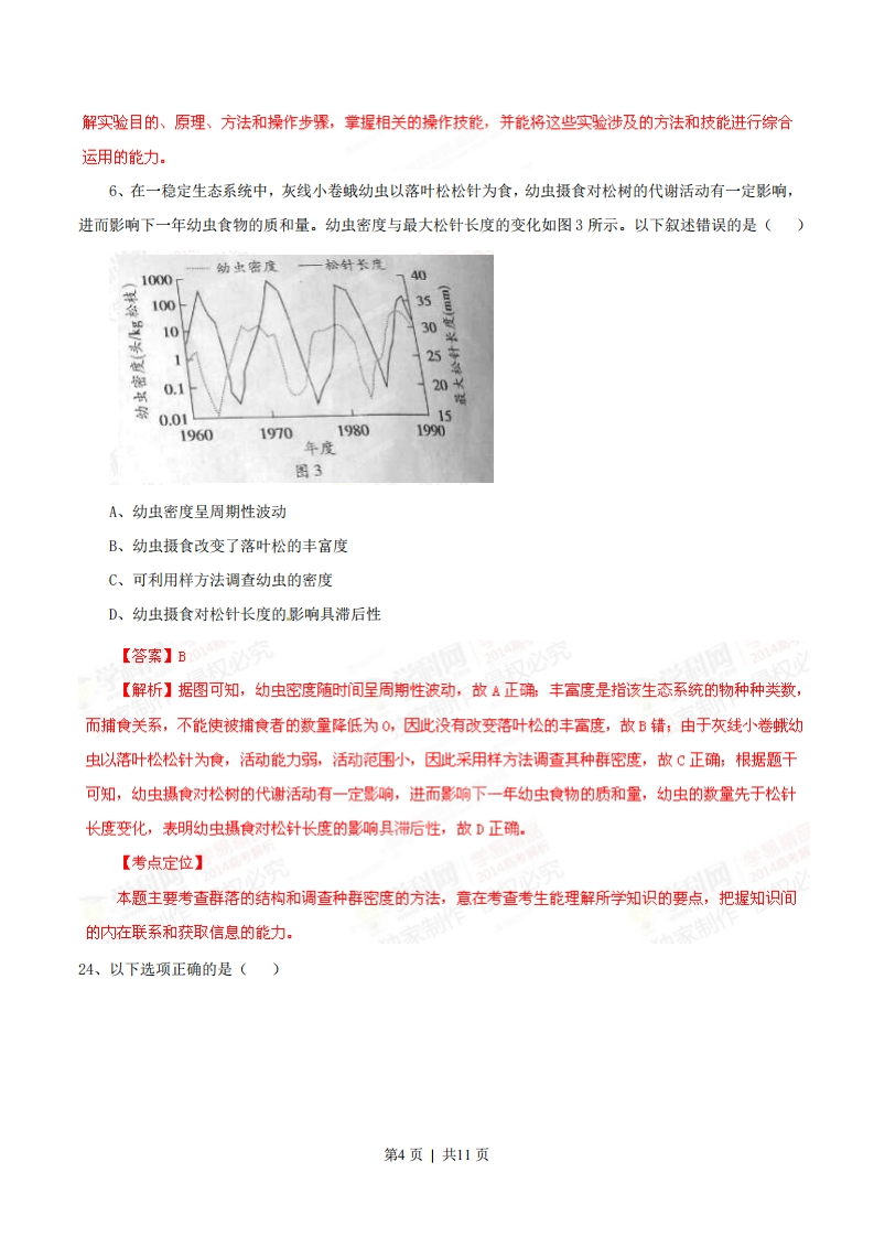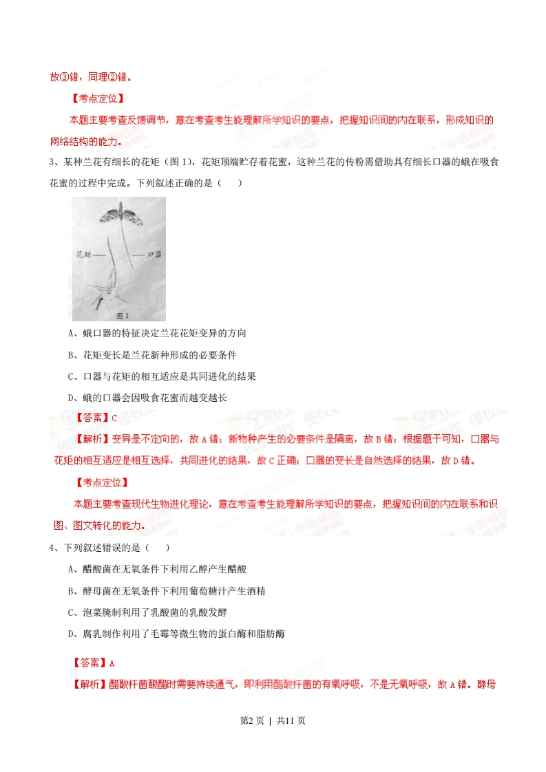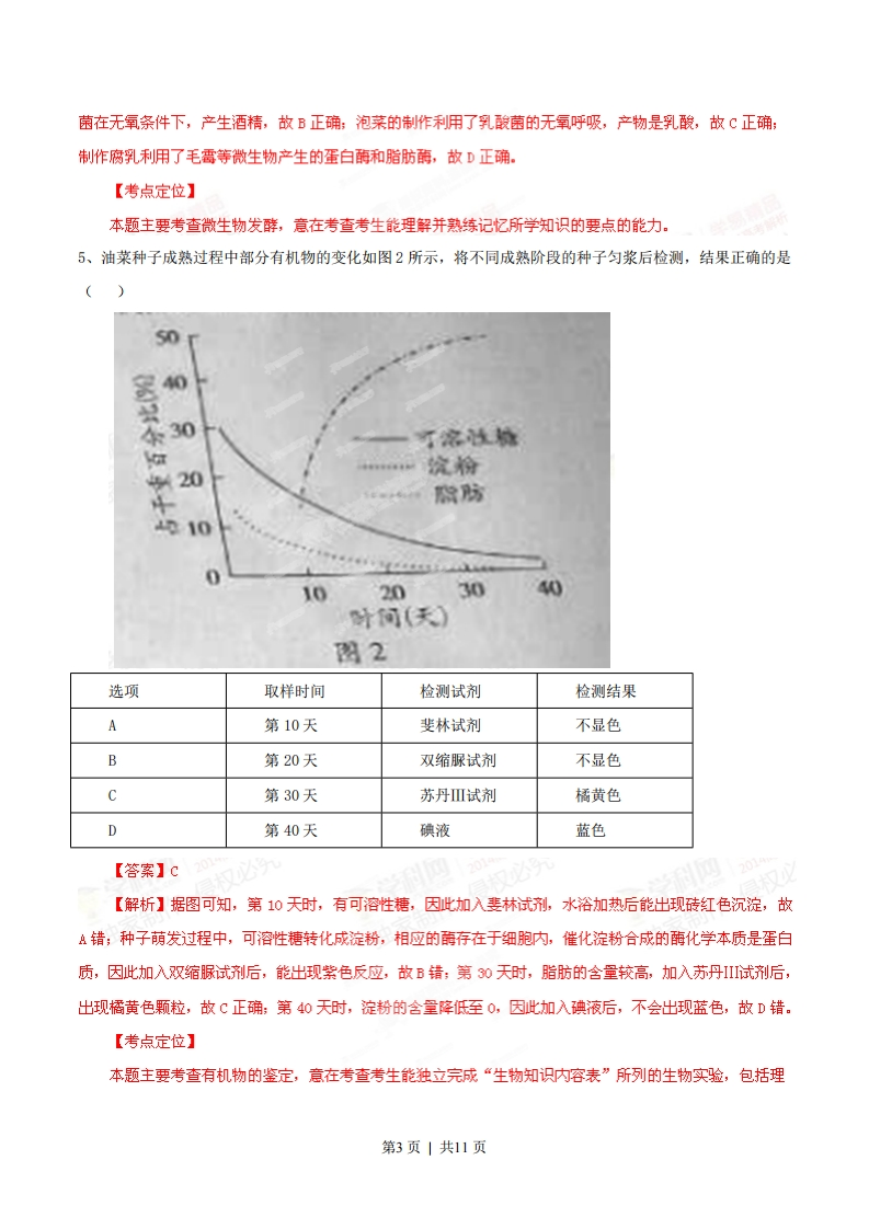 2014年普通高校招生考试广东遂试题解析(精编版》【命题特点】与(12年、13年)相比,今年广东高考理综试墅选用的是5卷,试题的数量没有变化,还是6十2十4。必修1(26分)、必修2(16分)、必修3(29分)、选修(10分、实验(20分)试卷整体上突出对主干知识的考查,但是遗传题具有一定的难度,区分度较高,整体难度较去年稍低;同时对学生能力的考查是各地高考试题的重心,广东B卷也体现了思想.此外,图表题的比重进一步提高,今年的12个试题中,有9个题目属于图表题,可以看出命题人更顺可于在图表零中衫查学生的知识迁移能力,图表题是今后高考试题的主阵地。【试题亮点】倾向于分析推理和说理描述,如27题(2)、28题(2):侧重对表格信息的获取及逻辑分析能力,如26题、29题;对实验的考查既有教材中的实验,如5题,又有实验设计题,如29题(3)。1、以下细胞结构中,NA是其结构组成的是()A、液泡B、核糖体C、高尔基体D、溶酶体【答案】B【解析】核糖体的组成是xRNA和蛋白质,故B正确液泡、高尔基体和溶酶体,都不含有NA,故ACD均错.【考点定位】本题主要考查细胞器的结构,意在考查考生能理解所学知识的要点,把握知识间的内在联系的能力。2、以下过程一定存在反馈调节的是()①胰岛素分泌量对血糖浓度的影响②运动强度对汗腺分泌的影响③降雨量对土壤动物存活率的影响④害虫数量对其天敌鸟类数量的影响A、①②B、②③C、③④D、①④【答案】D【解析】胰岛素对血糖浓度的调节属于激素调节,激素调节存在反馈调节,故①正确,捕食之间存在反馈调节,即当捕食者数量增多时,被捕食者数量减少,而被捕食者数量的减少,会导致捕食者数量减少,即④正确,故D正确,降雨量的多少对土壤动物的存活率有影响,但土壤动物的存活率对降雨量没有影响,第1页|共11页故③错,同理②错。【考点定位】本题主要考查反馈调节,意在考查考生能理解所学知识的要点,把握知识间的内在联系,形成知识的网络结构的能力。3、某种兰花有细长的花矩(图1),花矩顶端贮存着花蜜,这种兰花的传粉需借助具有细长口器的蛾在吸食花蜜的过程中完成。下列叙述正确的是()A、蛾口器的特征决定兰花花矩变异的方向B、花矩变长是兰花新种形成的必要条件C、口器与花矩的相互适应是共同进化的结果D、蛾的口器会因吸食花蜜而越变越长【答案】c【解析】变异是不定向的,故A错:新物种产生的必要条件是隔离,故B错:根据题干可知,口器与花矩的相互适应是相互选择,共同进化的结果,故C正确:口器的变长是自然选择的结果,故D错。【考点定位】本题主要考查现代生物进化理论,意在考查考生能理解所学知识的要点,把握知识间的内在联系和识图、图文转化的能力。4、下列叙述错误的是()A、醋酸菌在无氧条件下利用乙醇产生醋酸B、酵母菌在无氧条件下利用葡萄糖汁产生酒精C、泡菜腌制利用了乳酸菌的乳酸发酵D、腐乳制作利用了毛霉等微生物的蛋白酶和脂肪酶【答案】A【解析】醋酸杆菌酿醋时需要持续通气,即利用醋酸杆菌的有氧呼吸,不是无氧呼吸,故A错。酵母第2页|共11页菌在无氧条件下,产生酒精,故B正确:泡菜的制作利用了乳酸菌的无氧呼吸,产物是乳酸,故C正确:制作腐乳利用了毛需等微生物产生的蛋白酶和脂肪酶,故D正确。【考点定位】本题主要考查微生物发酵,意在考查考生能理解并熟练记忆所学知识的要点的能力。5、油菜种子成熟过程中部分有机物的变化如图2所示,将不同成熟阶段的种子匀浆后检测,结果正确的是504030可院社精a44院粉20胎防100102030叶何(天图2选项取样时间检测试剂检测结果A第10天斐林试剂不显色B第20天双缩脲试剂不显色第30天苏丹Ⅲ试剂橘黄色D第40天碘液蓝色【答案】c20【解析】据图可知,第10天时,有可溶性糖,因此加入斐林试剂,水浴加热后能出现砖红色沉淀,故A错;种子萌发过程中,可溶性糖转化成淀粉,相应的酶存在于细胞内,催化淀粉合成的酶化学本质是蛋白质,因此加入双缩脲试剂后,能出现紫色反应,故B错:第30天时,脂肪的含量较高,加入苏丹III试剂后,出现橘黄色颗粒,故C正确:第40天时,淀粉的含量降低至0,因此加入碘液后,不会出现蓝色,故D错。【考点定位】本题主要考查有机物的鉴定,意在考查考生能独立完成“生物知识内容表”所列的生物实验,包括理第3页|共11页