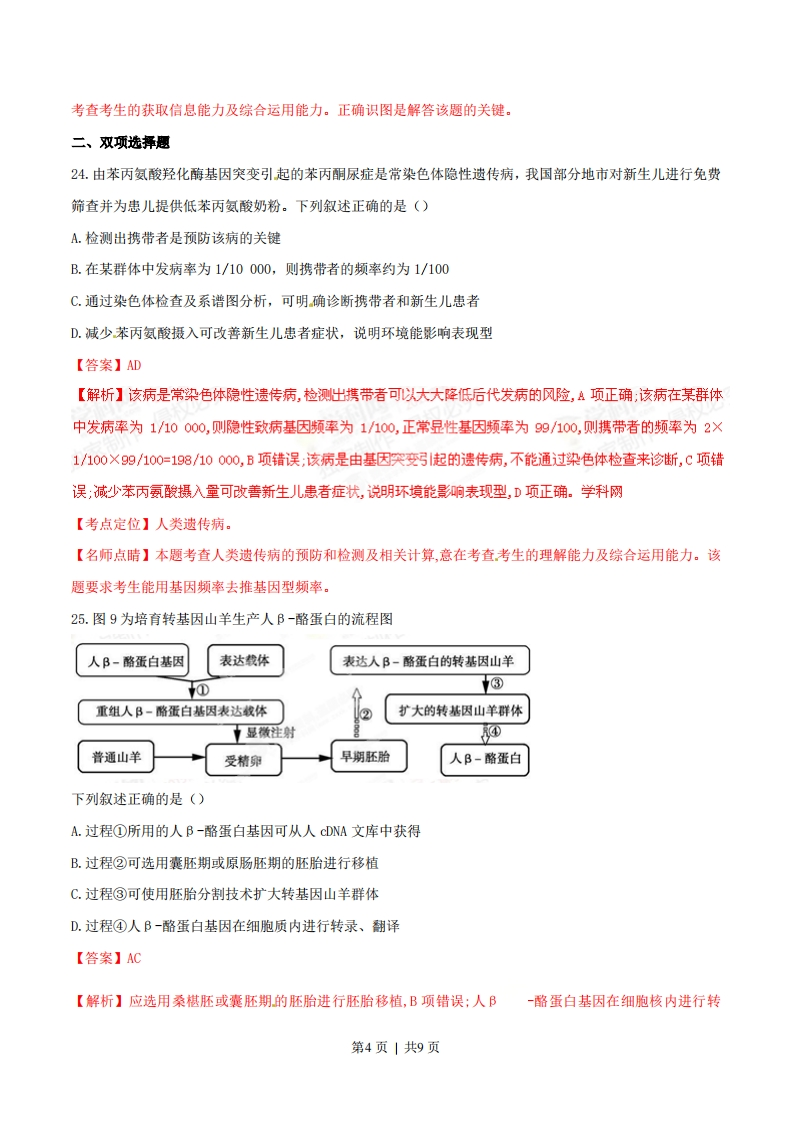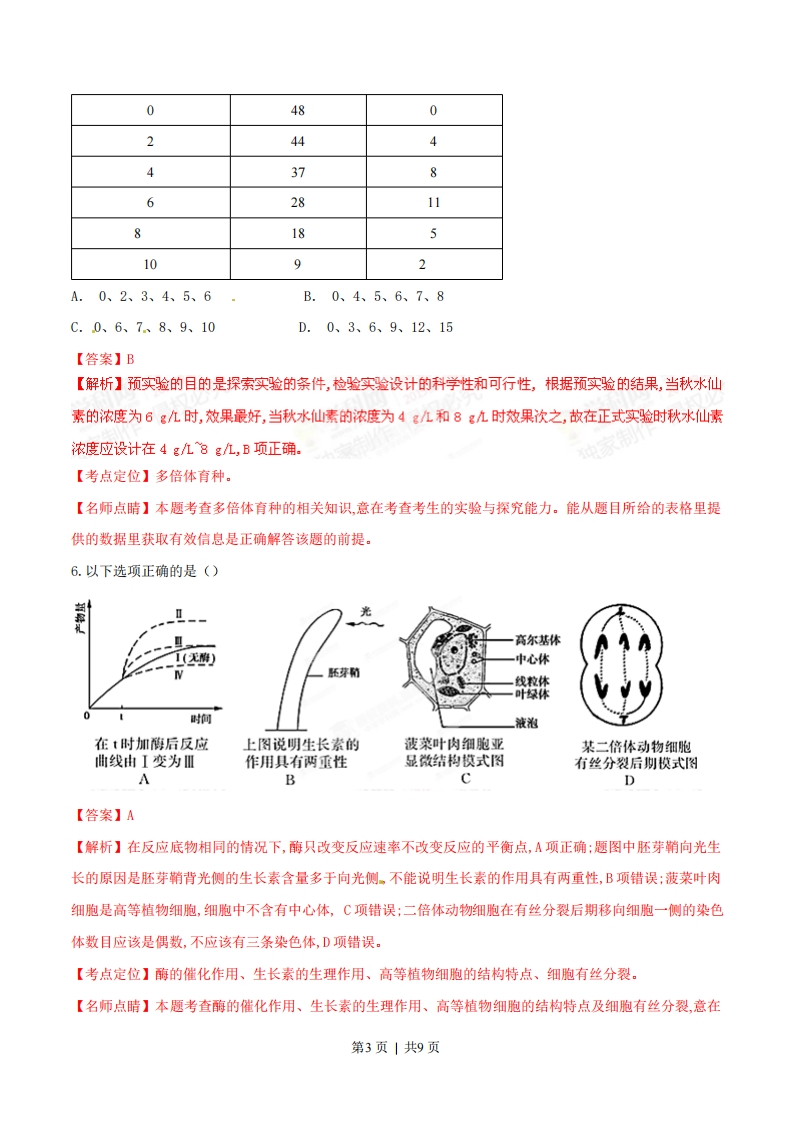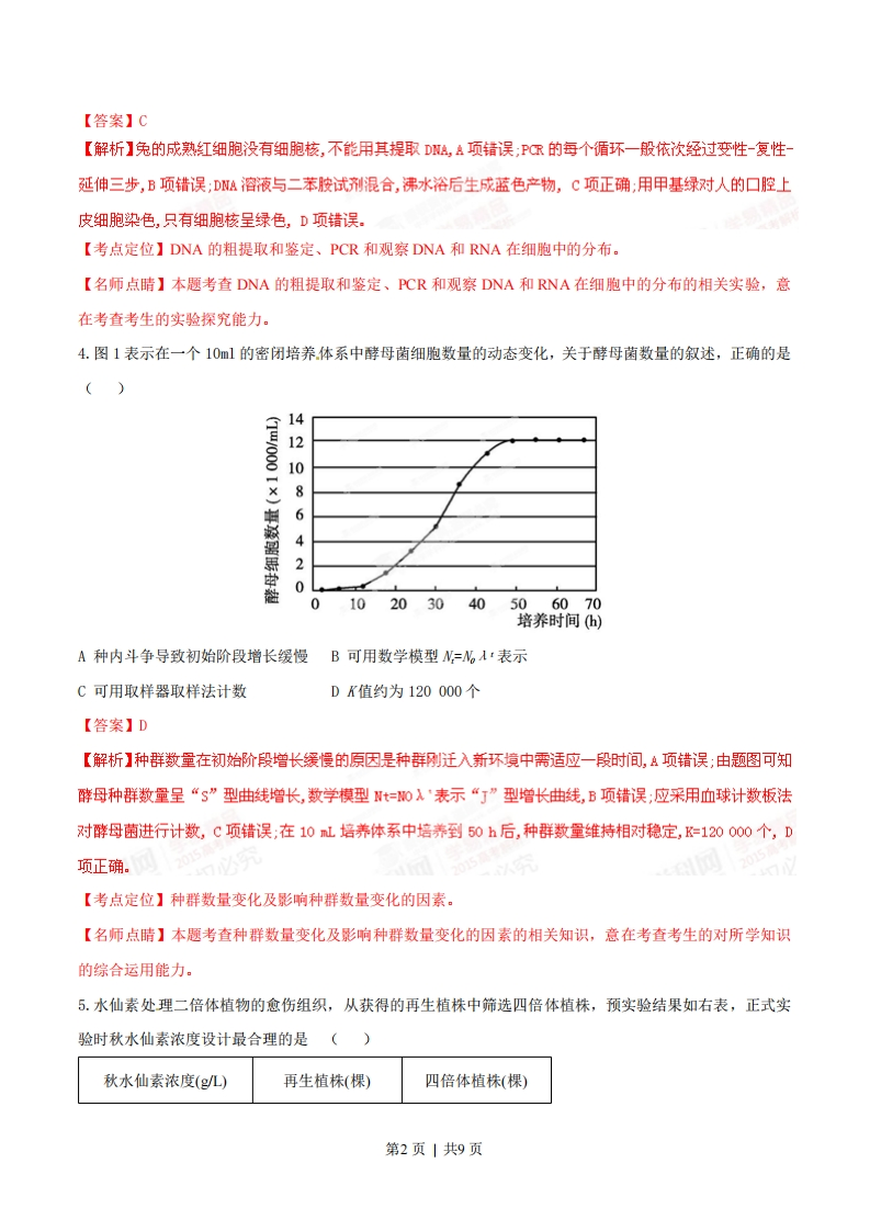 2015年高考理科综合能力测试广东卷试题生物部分解析一、单项选择题1.下列各组细胞器均具单层膜的是()A液泡和核糖体B中心体和叶绿体C溶酶体和高尔基体D内质网和线粒体【答案】C【解析】核糖体由A和蛋白质组成,不具有生物膜结构,A错误。中心体不具有生物膜结构,B错误。溶酶体和高尔基体都具有单层生物膜结构,C正确。内质网具有单层生物膜,但线粒体具有双层生物膜,D错误。学科网【考点定位】细胞器的结构。【名师点睛】本题通过简单的题干信息考查细胞器的结构,旨在检测学生对相关知识的识记能力。解决本题关键在于看考生能否熟知细胞器的膜结构。2.关于人胰岛素的叙述,正确的是()①以碳链为基本骨架②与双缩脲试剂反应呈蓝色③促进肝糖原分解④由胰岛B细胞合成、分泌A①③.B①④C②③D③④【答案】B【解析】胰岛素的本质是蛋白质,以氨基酸为单位通过脱水缩合连接而成,以碳链为基本骨架,①正确:蛋白质与双缩脲试剂反应呈紫色,②错误:胰岛素的作用是促进组织细胞加速摄取、利用和储存葡萄糖,促进肝糖原合成,③错误:胰岛素由胰岛B细胞合成、分泌,④正确。【考点定位】蛋白质、血糖调节。【名师点睛】本题考查胰岛素的相关知识,意在考查考生的理解能力和分析能力。解决本题关键在于看考生是否掌握了蛋白质的结构和功能、血糖调节过程等相关知识。3.关于DNA的实验,叙述正确的是()A用兔的成熟红细胞可提取DNABPCR的每个循环一般依次经过变性-延伸-复性三步CDNA溶液与二苯胺试剂混合,沸水浴后生成蓝色产物D用甲基绿对人的口腔上皮细胞染色,细胞核呈绿色,细胞质呈红色第1页|共9页【答案】C【解析】兔的成熟红细胞没有细胞核,不能用其提取DA,A项错误:P欧的每个循环一般依次经过变性-复性延伸三步,B项错误:DNA溶液与二苯胺试剂混合,沸水浴后生成蓝色产物,C项正确:用甲基绿对人的口腔上皮细胞染色,只有细胞核呈绿色,D项错误。【考点定位】DNA的粗提取和鉴定、PCR和观察DNA和RNA在细胞中的分布。【名师点睛】本题考查DNA的粗提取和鉴定、PCR和观察DNA和RNA在细胞中的分布的相关实验,意在考查考生的实验探究能力。4.图1表示在一个10m1的密闭培养体系中酵母菌细胞数量的动态变化,关于酵母菌数量的叙述,正确的是)14121086420010203040506070培养时间(6)A种内斗争导致初始阶段增长缓慢B可用数学模型N=。At表示C可用取样器取样法计数DK值约为120000个【答案】D【解析】种群数量在初始阶段增长缓慢的原因是种群钢刚迁入新环境中需适应一段时间,A项错误;由题图可知酵母种群数量呈“s”型曲线增长,数学模型t=0入'表示“J”型增长曲线,B项错误:应采用血球计数板法对酵母菌进行计数,C项错误;在10mL培养体系中培养到50h后,种群数量维持相对稳定,K=120000个,D项正确。【考点定位】种群数量变化及影响种群数量变化的因素。【名师点睛】本题考查种群数量变化及影响种群数量变化的因素的相关知识,意在考查考生的对所学知识的综合运用能力。5.水仙素处理二倍体植物的愈伤组织,从获得的再生植株中筛选四倍体植株,预实验结果如右表,正式实验时秋水仙素浓度设计最合理的是()秋水仙素浓度(gL)再生植株(棵)四倍体植株(棵)第2页|共9页048024443786281181851092A.0、2、3、4、5、6B.0、4、5、6、7、8C.0、6、7、8、9、10D.0、3、6、9、12、15【答案】B【解析】预实验的目的是探索实验的条件,检验实验设计的科学性和可行性,根据预实验的结果,当秋水仙素的浓度为6g九时,效果最好,当秋水仙素的浓度为4gL和8gL时效果次之,故在正式实验时秋水仙素浓度应设计在4gL8gL,B项正确。【考点定位】多倍体育种。【名师点睛】本题考查多倍体育种的相关知识,意在考查考生的实验与探究能力。能从题目所给的表格里提供的数据里获取有效信息是正确解答该题的前提。6.以下选项正确的是()高尔基体(无中心休胚球精线粒体叶绿体0时间液泡在t时加酶后反应上图说明生长素的菠菜叶肉细胞亚某二倍体动物细胞曲线由I变为Ⅲ作用具有两重性显微结构模式图有丝分裂后期模式图ABCD【答案】A【解析】在反应底物相同的情况下,酶只改变反应速率不改变反应的平衡点,A项正确:题图中胚芽鞘向光生长的原因是胚芽鞘背光侧的生长素含量多于向光侧。不能说明生长素的作用具有两重性,B项错误:菠菜叶肉细胞是高等植物细胞,细胞中不含有中心体,C项错误:二倍体动物细胞在有丝分裂后期移向细胞一侧的染色体数目应该是偶数,不应该有三条染色体,D项错误。【考点定位】酶的催化作用、生长素的生理作用、高等植物细胞的结构特点、细胞有丝分裂。【名师点睛】本题考查酶的催化作用、生长素的生理作用、高等植物细胞的结构特点及细胞有丝分裂,意在第3页|共9页