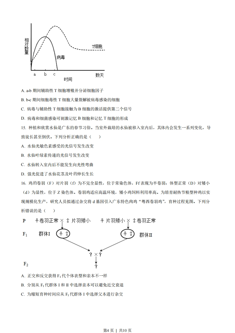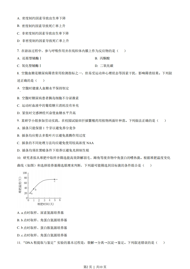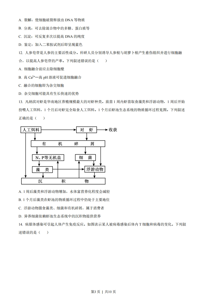 2023年普通高等学校招生全国统一考试高考真题广东生物试题一、选择题:1.中国制茶工艺源远流长。红茶制作包括萎调、揉捻、发酵、高温干燥等工序,其间多酚氧化酶催化茶多酚生成适量茶黄素是红茶风味形成的关键。下列叙述错误的是()A.揉捻能破坏细胞结构使多酚氧化酶与茶多酚接触B.发酵时保持适宜的温度以维持多酚氧化酶的活性C发酵时有机酸含量增加不会影响多酚氧化酶活性D.高温灭活多酚氧化酶以防止过度氧化影响茶品质2.中外科学家经多年合作研究,发现cireDNMT1(一种RNA分子)通过与抑癌基因p53表达的蛋白结合诱发乳腺癌,为解决乳腺癌这一威胁全球女性健康的重大问题提供了新思路。下列叙述错误的是()A.p53基因突变可能引起细胞癌变B.p53蛋白能够调控细胞的生长和增殖C.cireDNMT1高表达会使乳腺癌细胞增殖变慢D.circDNMT1的基因编辑可用于乳腺癌的基础研究3.科学家采用体外受精技术获得紫羚羊胚胎,并将其移植到长角羚羊体内,使后者成功妊娠并产仔,该工作有助于恢复濒危紫羚羊的种群数量。此过程不涉及的操作是()A.超数排卵B.精子获能处理C.细胞核移植D.胚胎培养4.下列叙述中,能支持将线粒体用于生物进化研究的是()A.线粒体基因遗传时遵循孟德尔定律B.线粒体DNA复制时可能发生突变C.线粒体存在于各地质年代生物细胞中D.线粒体通过有丝分裂的方式进行增殖5.科学理论随人类认知的深入会不断被修正和补充,下列叙述错误的是()A.新细胞产生方式的发现是对细胞学说的修正B.自然选择学说的提出是对共同由来学说的修正C.RNA逆转录现象的发现是对中心法则的补充D.具催化功能RNA的发现是对酶化学本质认识的补充6.某地区蝗虫在秋季产卵后死亡,以卵越冬。某年秋季降温提前,大量蝗虫在产卵前死亡,次年该地区蝗虫的种群密度明显下降。对蝗虫种群密度下降的合理解释是()第1页|共10页A.密度制约因素导致出生率下降B.密度制约因素导致死亡率上升C.非密度制约因素导致出生率下降D非密度制约因素导致死亡率上升7.在游泳过程中,参与呼吸作用并在线粒体内膜上作为反应物的是()A.还原型辅酶IB.丙酮酸C.氧化型辅酶ID.二氧化碳8.空腹血糖是糖尿病筛查常用检测指标之一,但易受运动和心理状态等因素干扰,影响筛查结果。下列叙述正确的是()A空腹时健康人血糖水平保持恒定B.空腹时糖尿病患者胰岛细胞不分泌激素C.运动时血液中的葡萄糖只消耗没有补充D.紧张时交感神经兴奋使血糖水平升高9.某研学小组参加劳动实践,在校园试验田扦插繁殖药用植物两面针种苗。下列做法正确的是()A.插条只能保留1个芽以避免养分竞争B.插条均应剪去多数叶片以避免蒸腾作用过度C.插条的不同处理方法均应避免使用较高浓度NAAD.插条均须在黑暗条件下培养以避免光抑制生根10.研究者拟从堆肥中取样并筛选能高效降解羽毛、蹄角等废弃物中角蛋白的嗜热菌。根据堆肥温度变化曲线(如图)和选择培养基筛选原理来判断,下列最可能筛选到目标菌的条件组合是()100806040b20a0123456堆肥时间(天)A.a点时取样、尿素氮源培养基B.b点时取样、角蛋白氮源培养基C.b点时取样、蛋白胨氮源培养基D.c点时取样、角蛋白氮源培养基11.“DNA粗提取与鉴定”实验的基本过程是:裂解→分离→沉淀→鉴定。下列叙述错误的是()第2页|共10页A.裂解:使细胞破裂释放出DNA等物质B.分离:可去除混合物中的多糖、蛋白质等C.沉淀:可反复多次以提高DNA的纯度D.鉴定:加入二苯胺试剂后即呈现蓝色12.人参皂苷是人参的主要活性成分。科研人员分别诱导人参根与胡萝卜根产生愈伤组织并进行细胞融合,以提高人参皂苷的产率。下列叙述错误的是()A.细胞融合前应去除细胞壁B.高Ca2+一高pH溶液可促进细胞融合C.融合的细胞即为杂交细胞D.杂交细胞可能具有生长快速的优势13.凡纳滨对虾是华南地区养殖规模最大的对虾种类。放苗1周内虾苗取食藻类和浮游动物,1周后开始投喂人工饵料,1个月后对虾完全取食人工饵料。1个月后虾池生态系统的物质循环过程见图。下列叙述正确的是()人工饵料对虾→收获有机碎屑N、P等无机盐细菌藻类浮游动物沉积物A.1周后藻类和浮游动物增加,水体富营养化程度会减轻B.1个月后藻类在虾池的物质循环过程中仍处于主要地位C.浮游动物摄食藻类、细菌和有机碎屑,属于消费者D.异养细菌依赖虾池生态系统中的沉积物提供营养14.病原体感染可引起人体产生免疫反应。如图表示某人被病毒感染后体内T细胞和病毒的变化。下列叙述错误的是()第3页」共10页